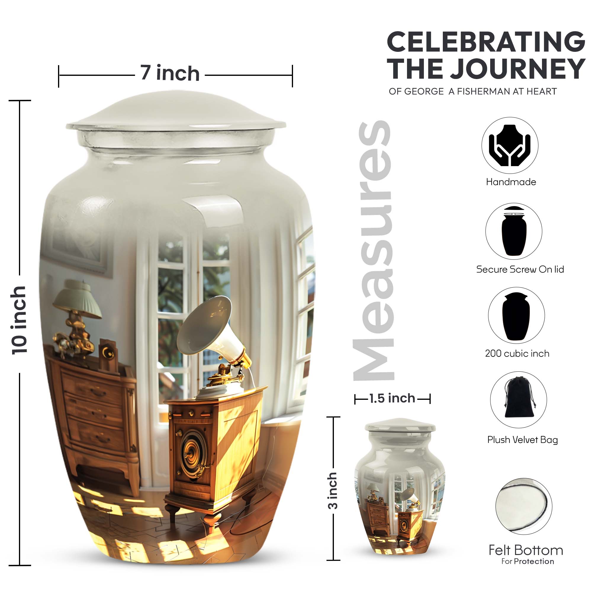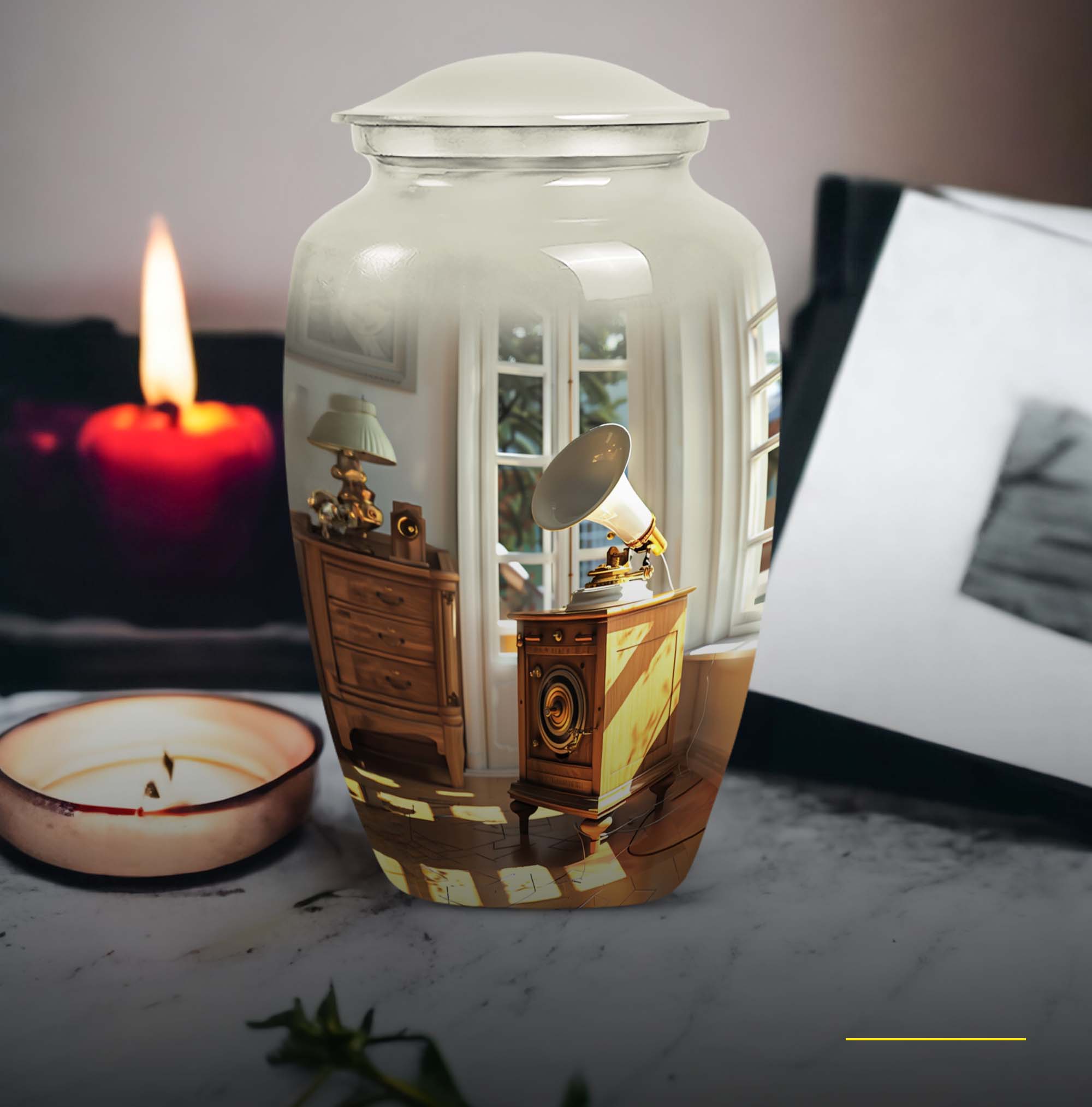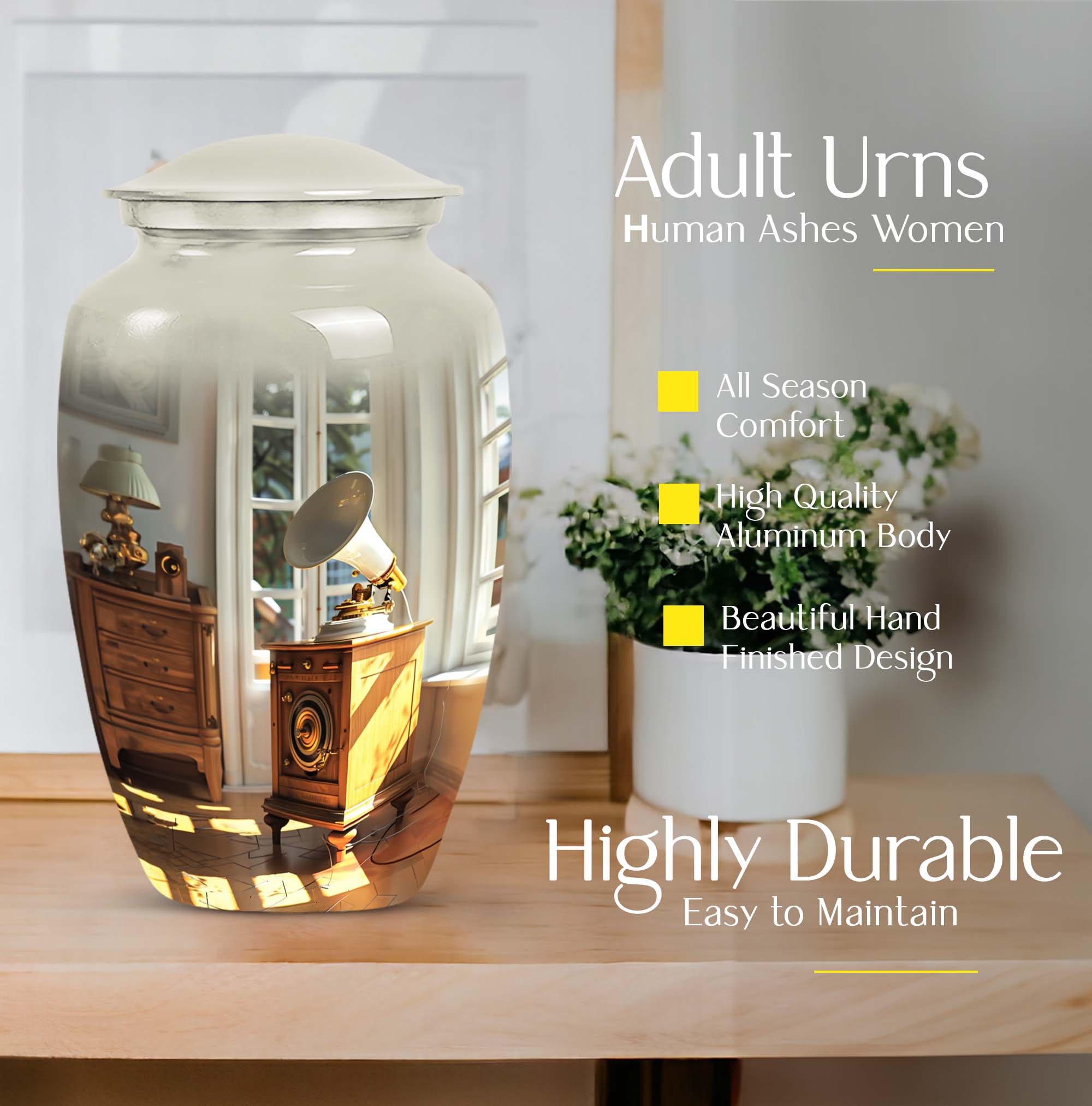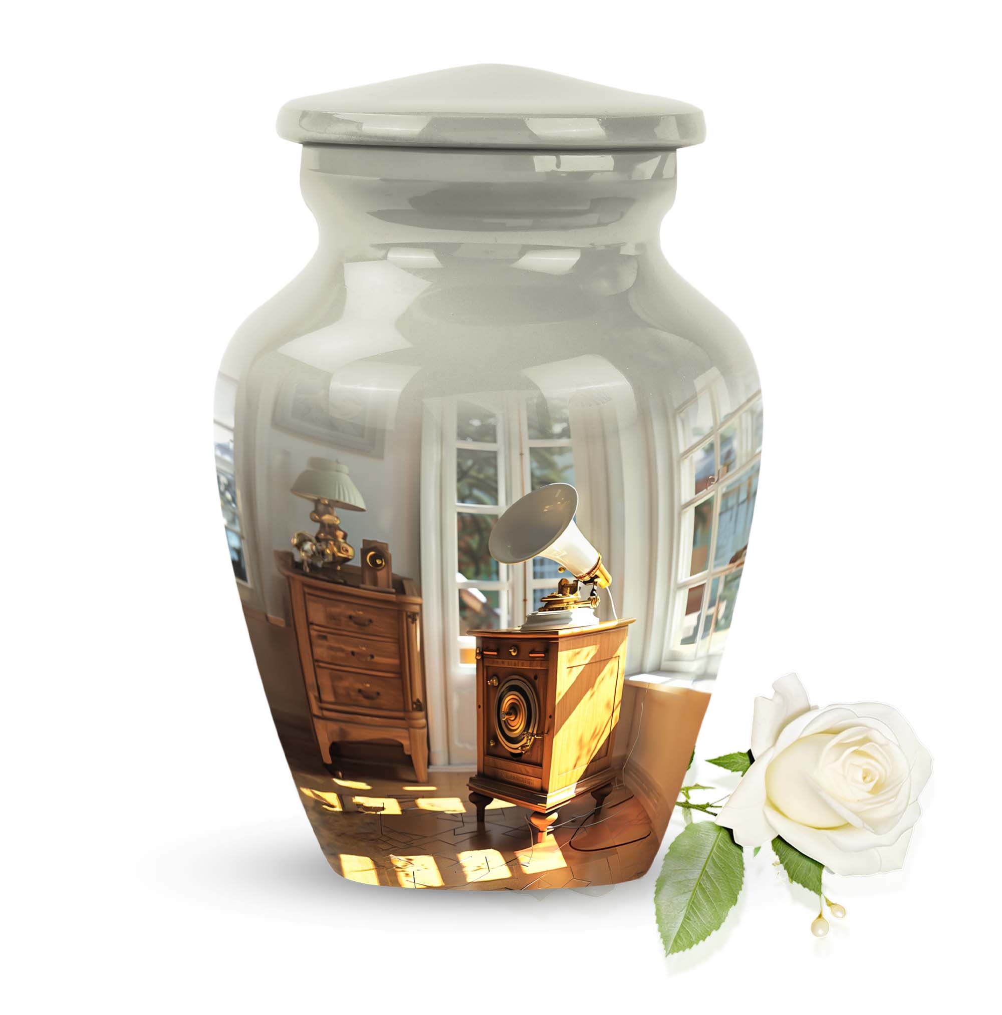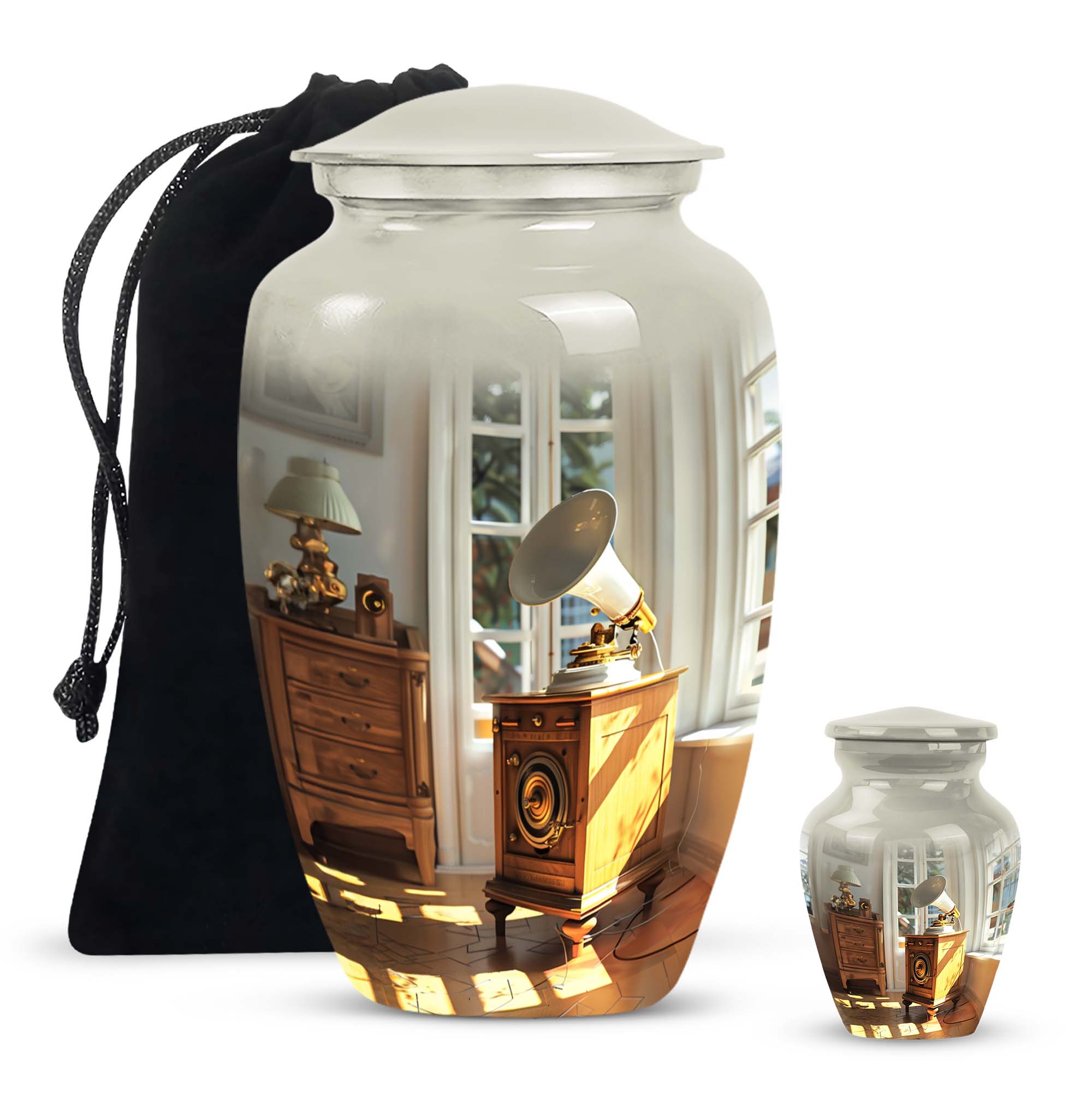 Curate a unique and reverential remembrance with our Gramophone Urn, an extraordinary option in our range of memorial urns. A must-have Memorial Ceremony Supply, this urn is perfect for the preservation of the ashes of a beloved adult male. Fashioned from high-grade aluminium, this large urn provides a significant capacity of 200 cubic inches and weighs 3.3 pounds. Measuring 10 inches in height, it's an optimal fit for numerous traditional placements. The urn comes with a velvet pouch for respectful and dignified containment of your loved one’s ashes. As a meaningful feature, you can personalize this classic urn with engraved names, making it a truly unique memorial piece. Excellently sized, it comfortably classifies as a cremation urn, funeral medium size urns for human ashes or as companion cremation urns for 2 adults. Its gramophone theme adds an antiquated charm to the remembrance of the departed soul and can be found by searching 'human urn adult' or 'urns for human ashes adult' on the search engine.