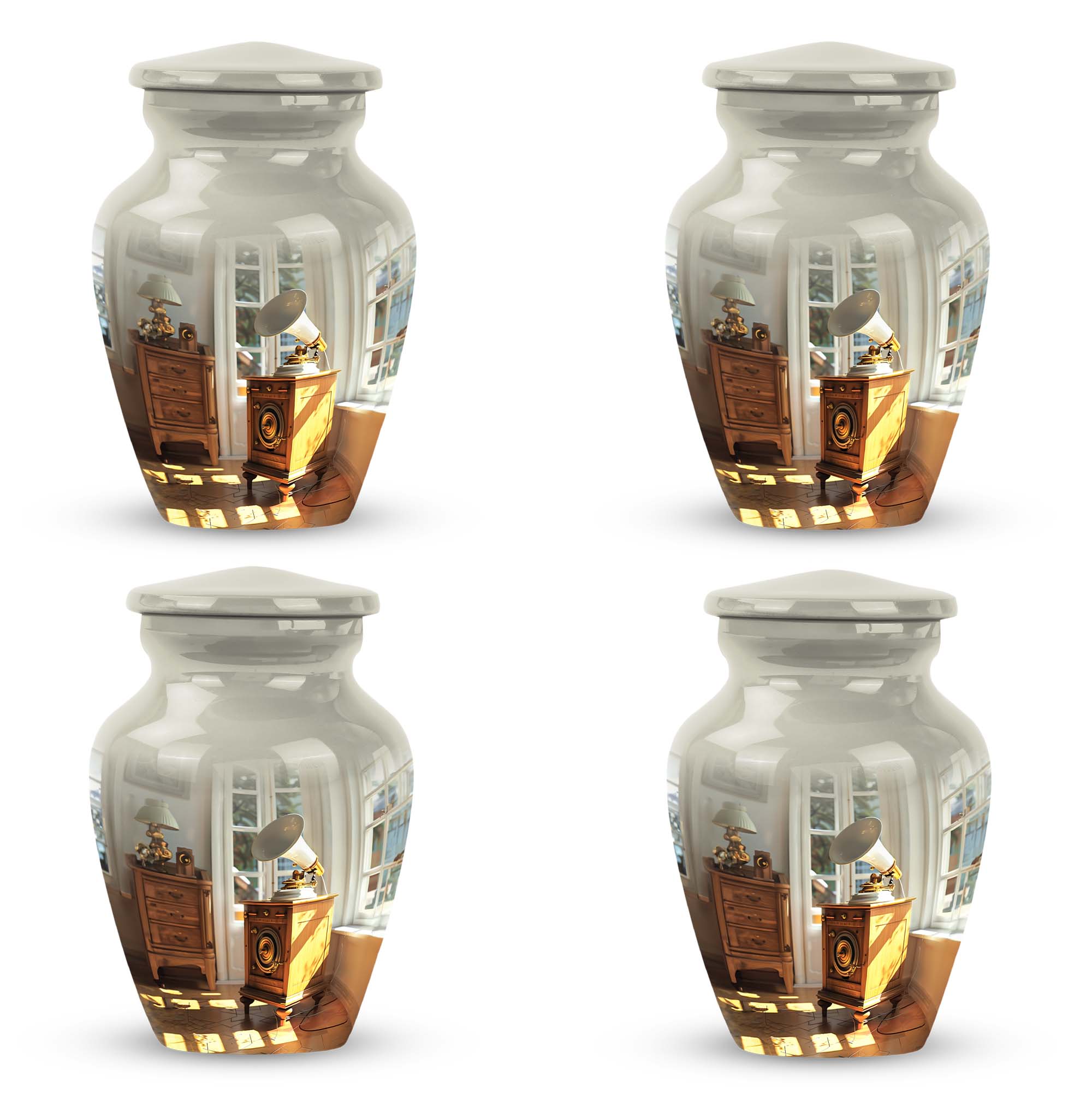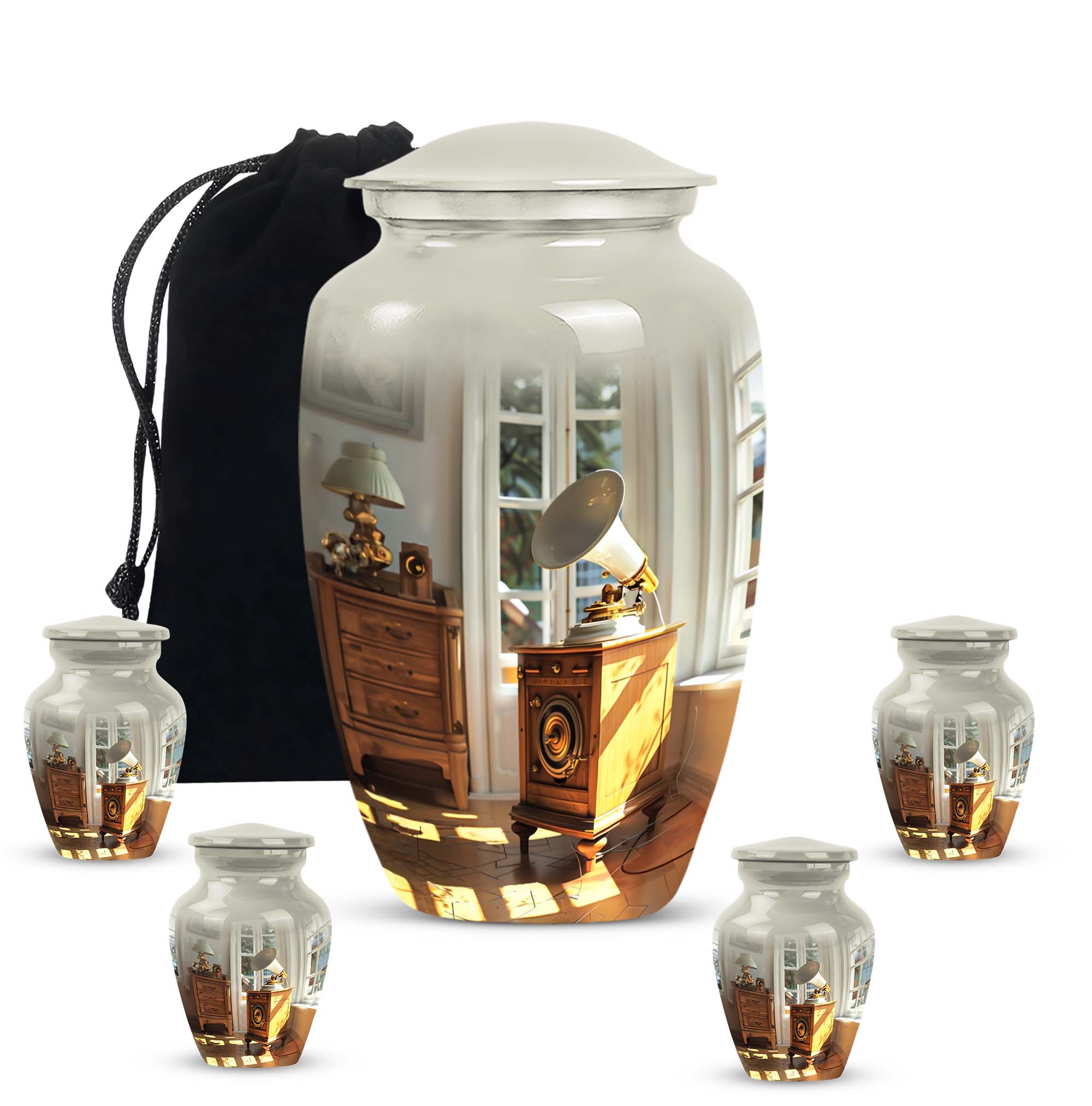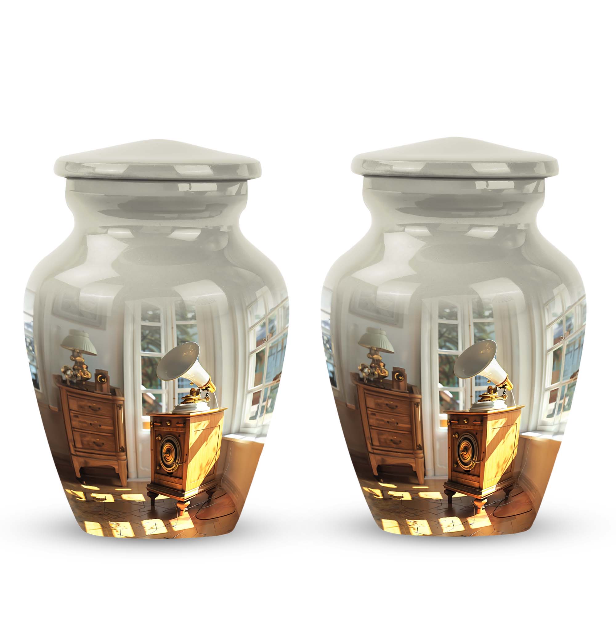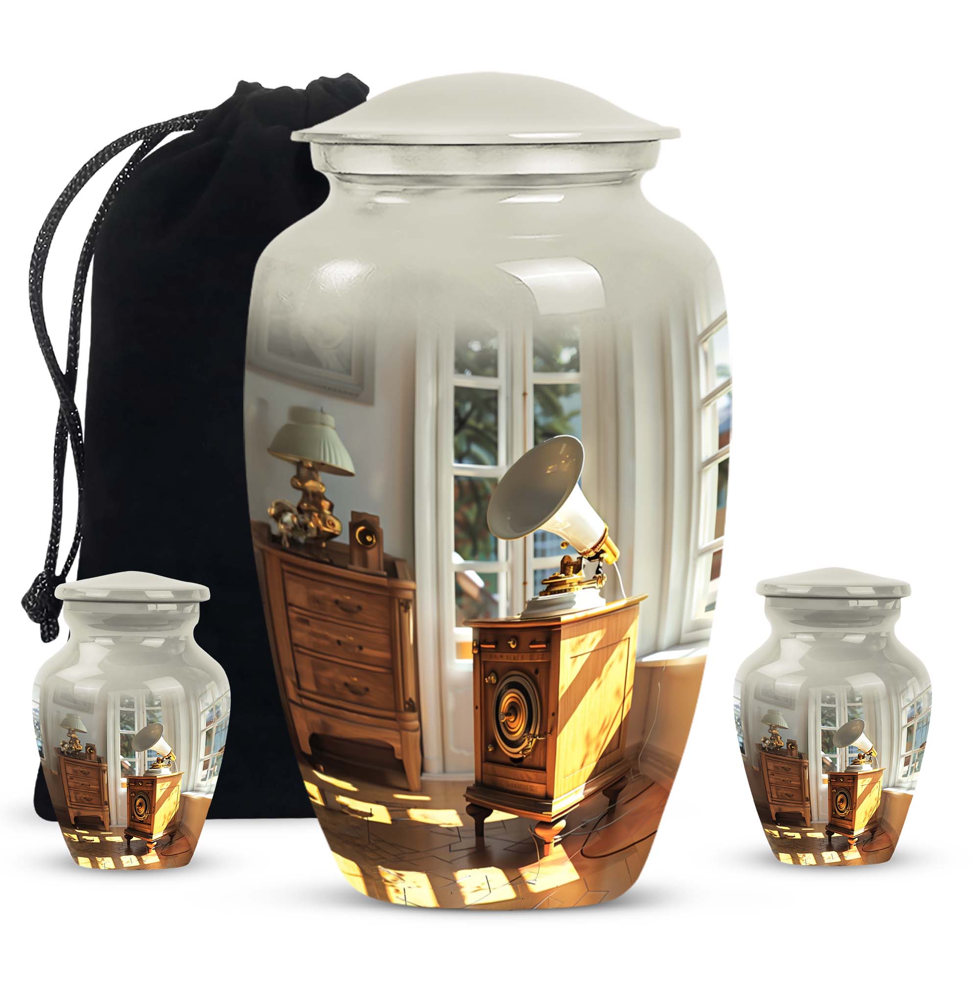 Curate a unique and reverential remembrance with our Gramophone Urn, an extraordinary option in our range of memorial urns. A must-have Memorial Ceremony Supply, this urn is perfect for the preservation of the ashes of a beloved adult male. Fashioned from high-grade aluminium, this large urn provides a significant capacity of 200 cubic inches and weighs 3.3 pounds. Measuring 10 inches in height, it's an optimal fit for numerous traditional placements. The urn comes with a velvet pouch for respectful and dignified containment of your loved one’s ashes. As a meaningful feature, you can personalize this classic urn with engraved names, making it a truly unique memorial piece. Excellently sized, it comfortably classifies as a cremation urn, funeral medium size urns for human ashes or as companion cremation urns for 2 adults. Its gramophone theme adds an antiquated charm to the remembrance of the departed soul and can be found by searching 'human urn adult' or 'urns for human ashes adult' on the search engine.