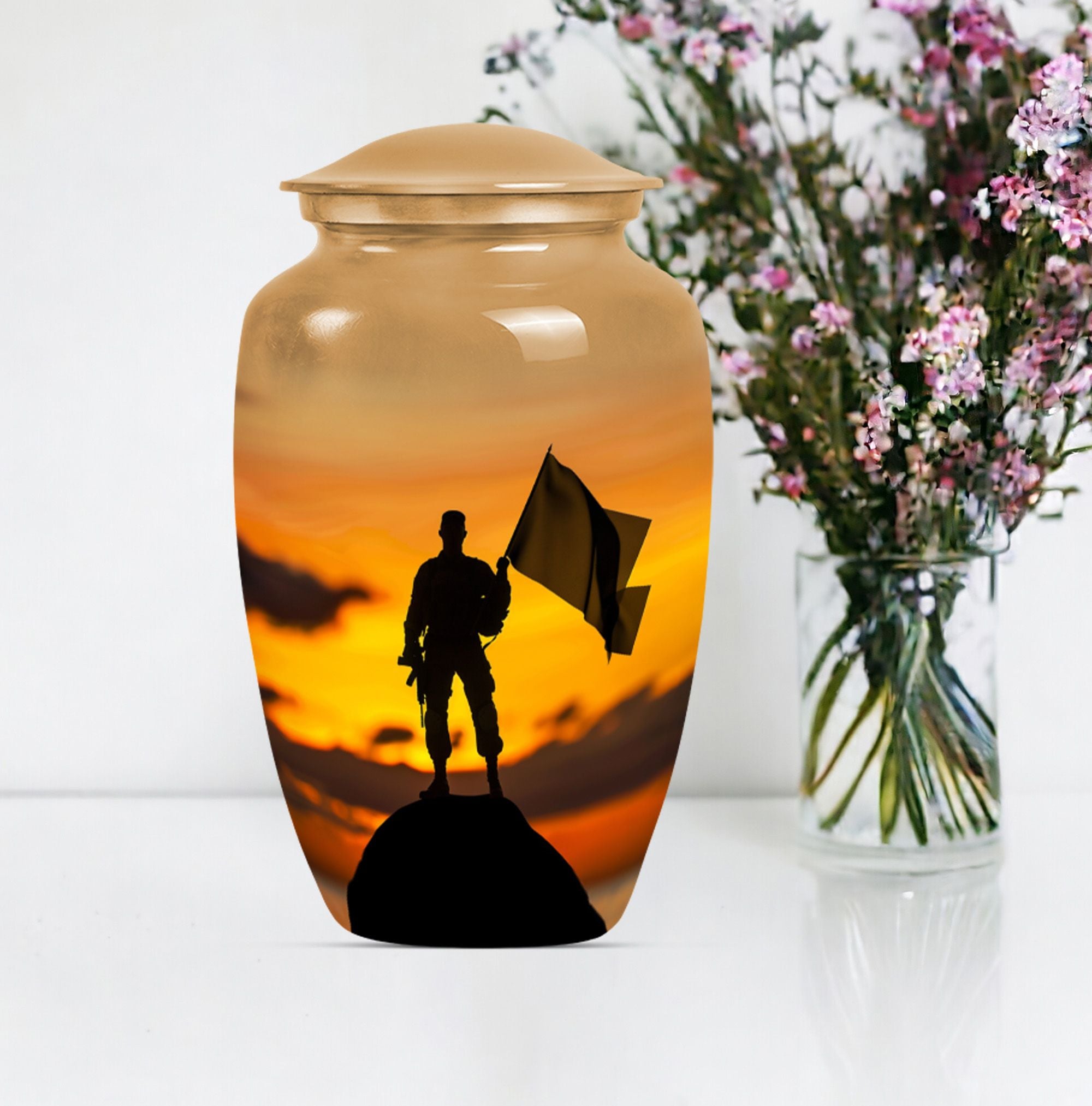 This large urn for ashes adult male is built with durable aluminum, featuring a soldier and flag design that reflects respect for service and devotion to country. Its craftsmanship ensures strength, while the elegant artwork conveys dignity and remembrance. Perfect for families searching for adult large urns or a symbolic urn for ashes for men, this piece combines functionality with heartfelt design.