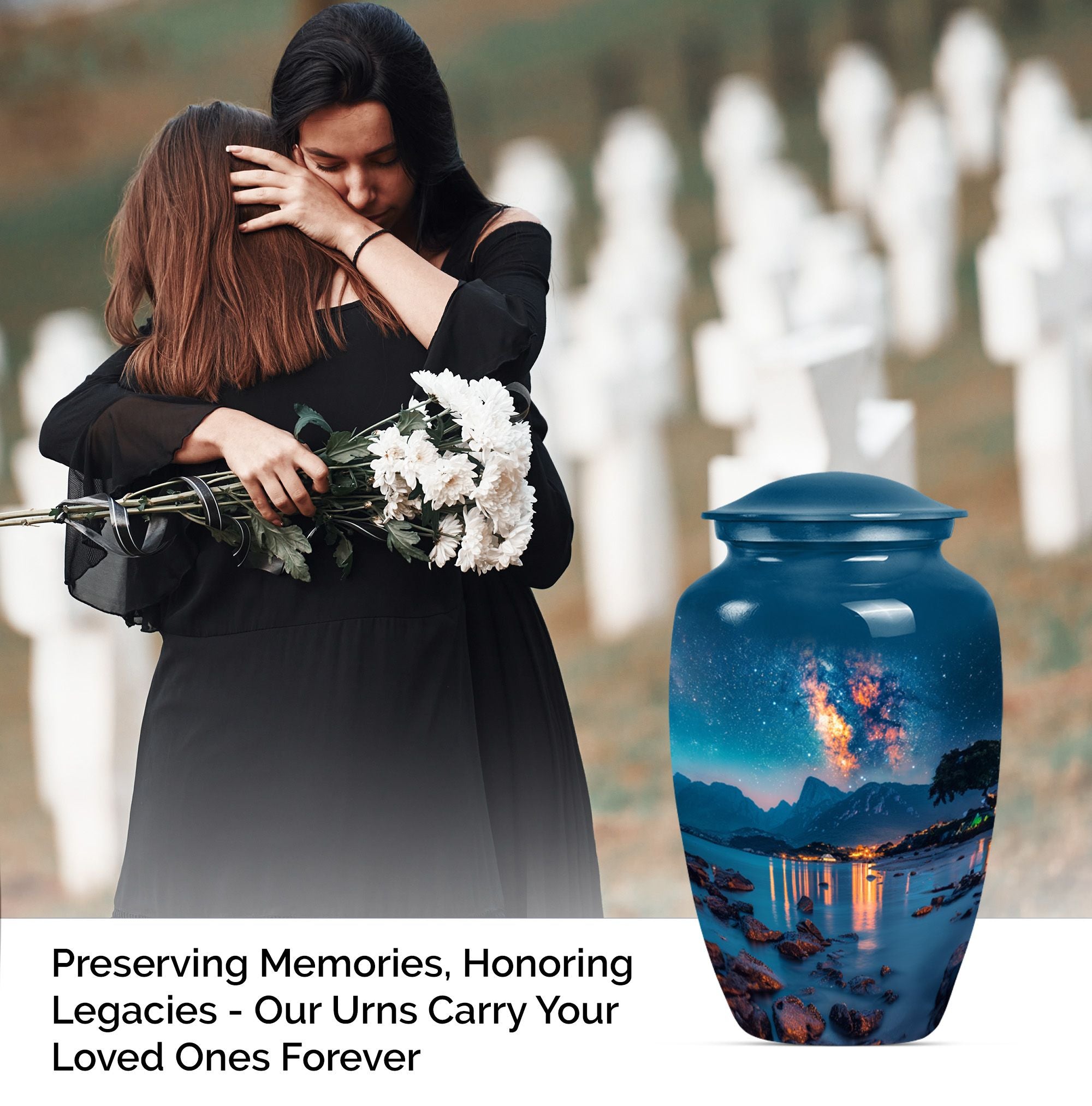 Immerse yourself in an enduring remembrance with our milkyway Urn, a timeless piece that encapsulates the spiritual essence of your loved ones. Fashioned from resilient aluminium, this large urn with an abstract theme evokes a sense of eternal serenity. Measuring at 10 inches with a fitting weight of 3.3 pounds, it has the capacity to house up to 200 cubic inches of ashes, perfect for an adult burial ceremony. This cremation urn provides a gentle resting place for your beloved, personalized with engraved names for a unique touch. It not only serves as a sacred memorial object but also a tangible remembrance that transcends time. The package includes a refined velvet pouch for secure containment of ashes, emphasizing careful preservation of cherished memories. Whether for men or women, this urn ensures a dignified farewell with its classic elegance and worth. Choosing this urn is more than just a decision - it's an act of love. Note: Cremation large urn for ashes and the like can be buried in the ground as required.