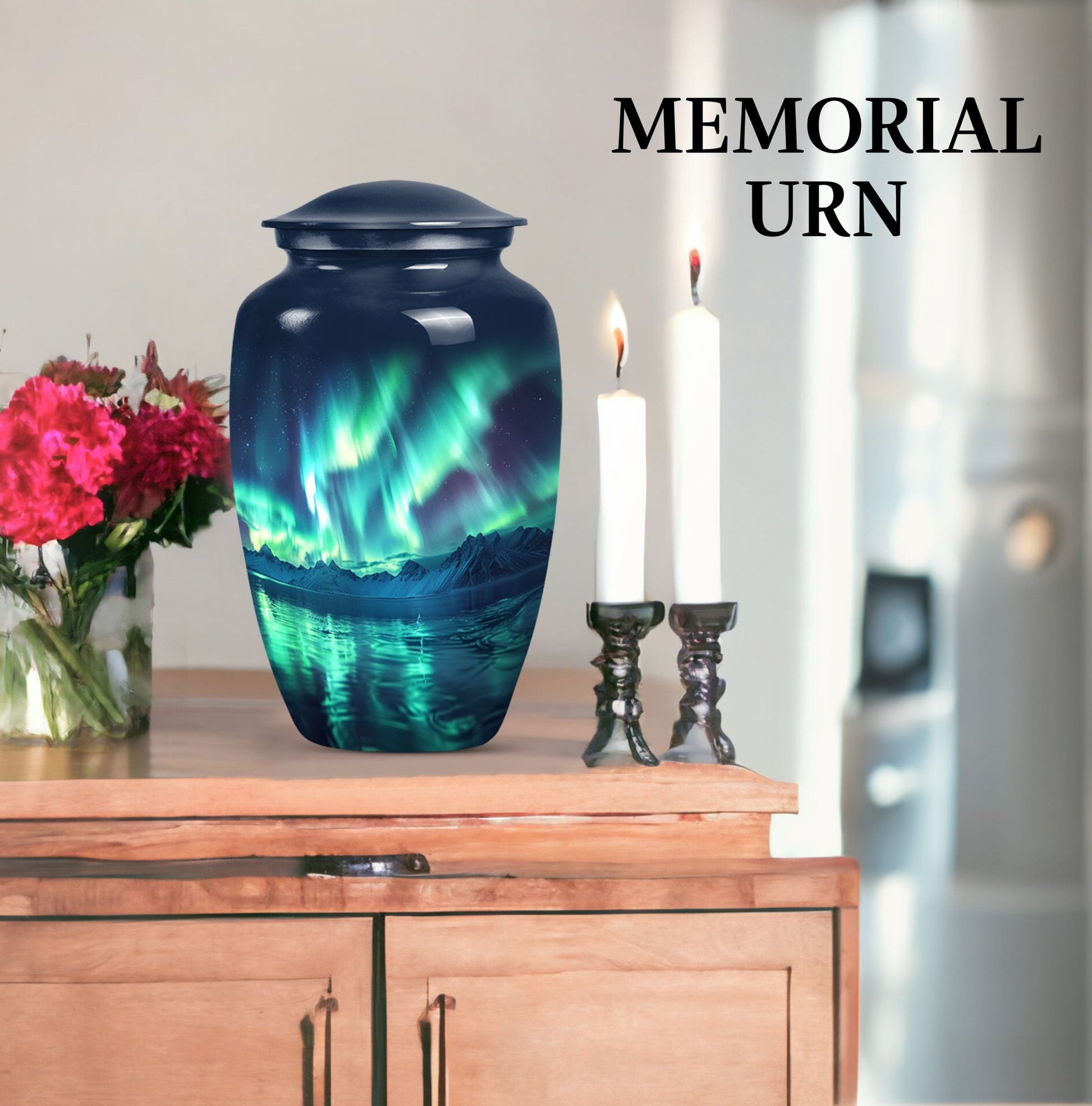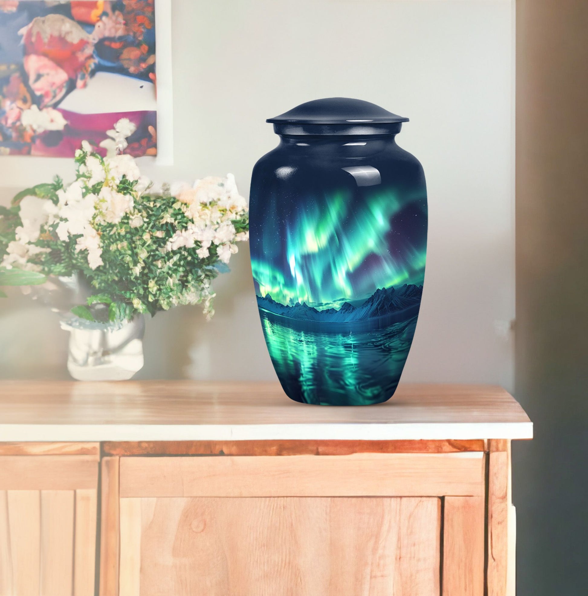 Experience the solace of the Northern Lights with our 10-inch Classic Urn, a touching tribute and thoughtful funeral urn for mom. This large cremation urn, beautifully adorned with a butterfly theme, offers more than just a storage place for the beloved. Crafted from aluminium, it delivers durability and high quality. Weighing at 3.3 pounds, it stands at 10 inches in height and can contain up to 200 cubic inches of ashes, making it an ample choice among urns for females. The package comes complete with a velvet pouch for dignified containment of ashes and to ensure careful preservation. You can also make this unique urn for ashes even more special by personalizing it with engraved names, an added layer of remembrance. Choose our metal urn for burial in ground as a meaningful way to honor and celebrate the life lived. We’re confident our Personalized Memorial urn serves as a comforting symbol of love, providing peace in your time of sorrow.