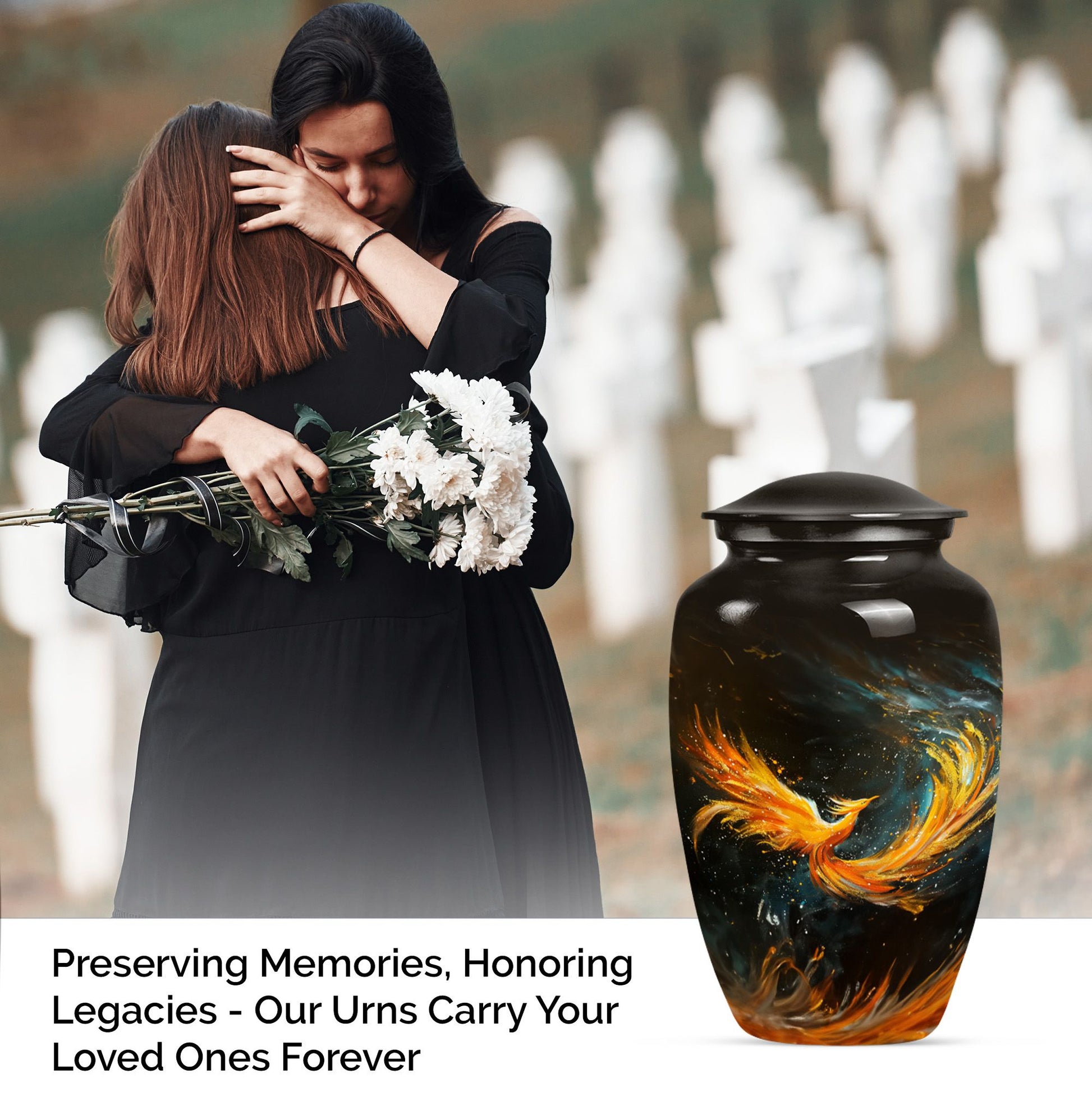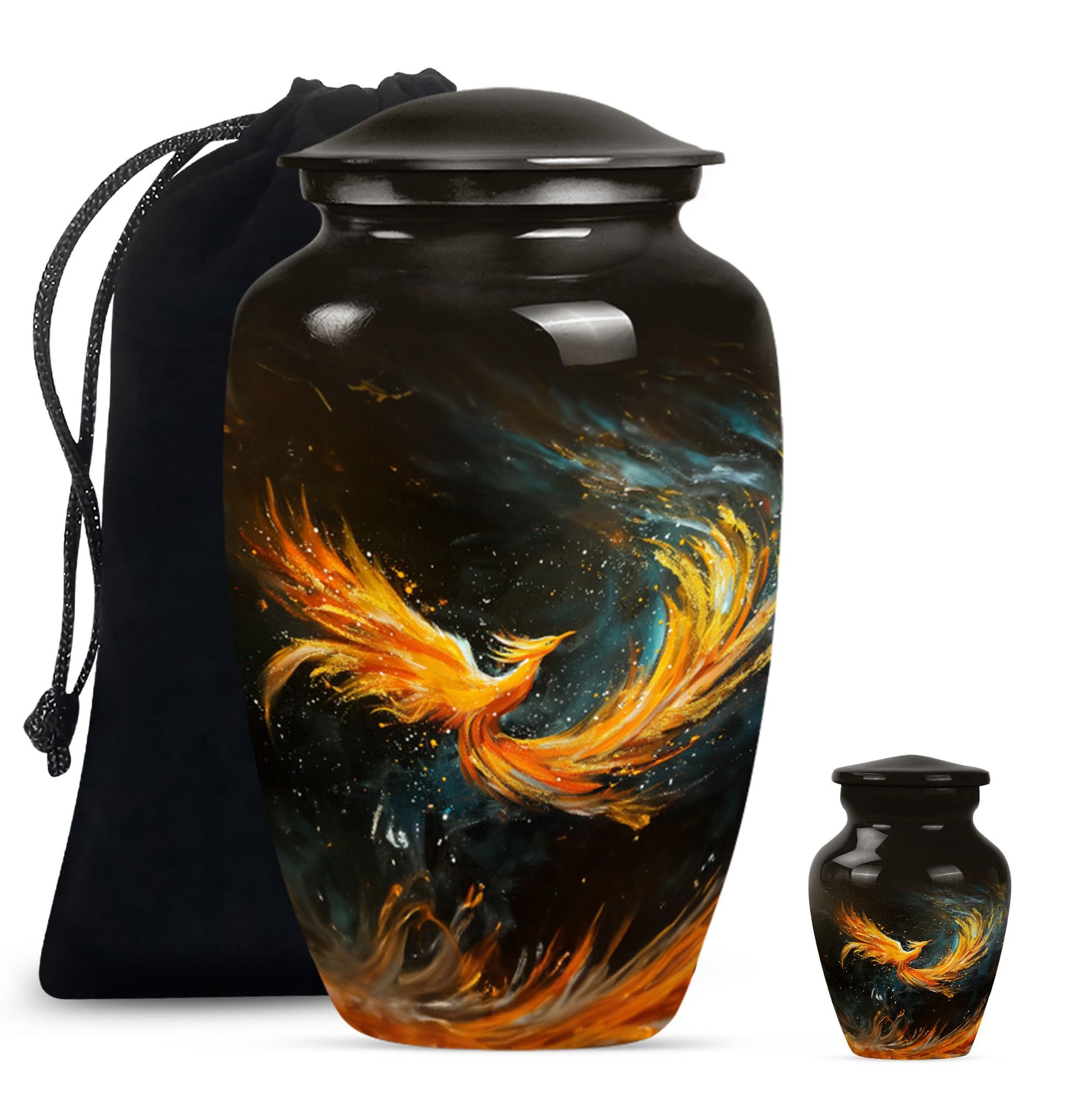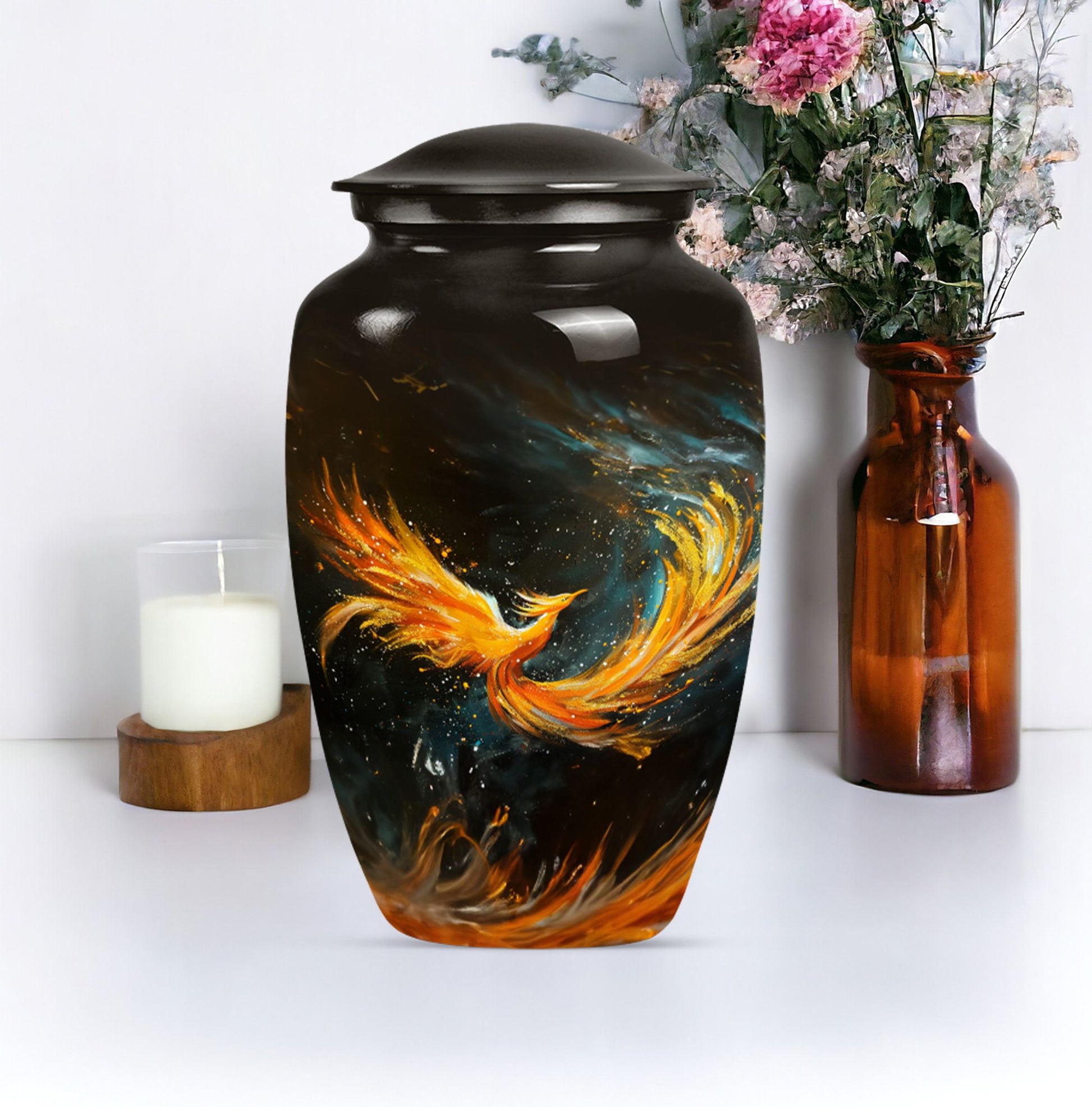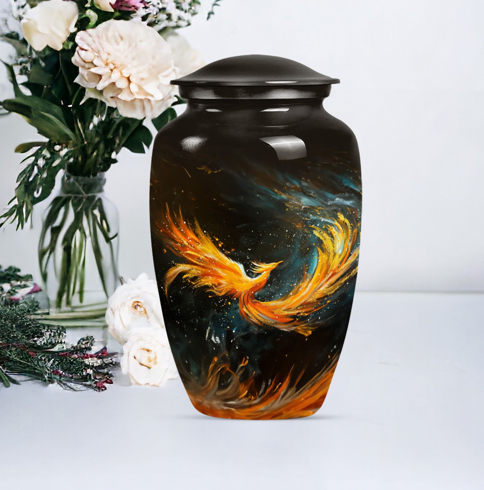 Celebrate the memory of your loved ones with our meticulously crafted Phoenix Urn, a perfect addition to your memorial adult urns collection. Introducing an abstract theme with an ageless Aluminium-made classic urn design, this cremation urn stands tall at 10 inches. Weighing a substantial 3.3 pounds, its quality is undeniable and it's capable of holding up to 200 cubic inches of remains. It's more than an urn - it's a tangible memory of your cherished one. Not only does it shine in aesthetic appeal, but the practicality is also unmatched. The Phoenix urn comes with a velvet pouch, expressly designed for safe containment of ashes, adding a sophisticated touch to an already exquisite piece. Personalize your purchase by engraving names on it, making this urn truly unique and intimate. The Phoenix urn is rated highly among large urns and is perfect for adults. It's indeed the ideal cremation urn for burial in the ground or for those seeking memorial adult urns for human ashes for women and men alike. Own this sensational expression of devotion today!