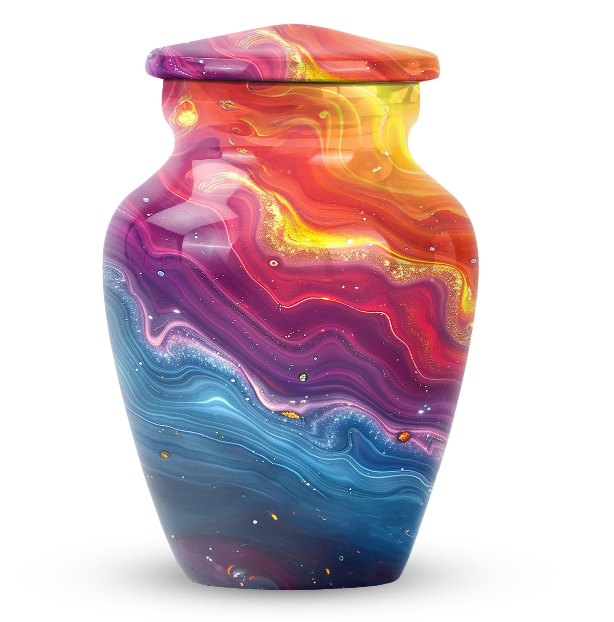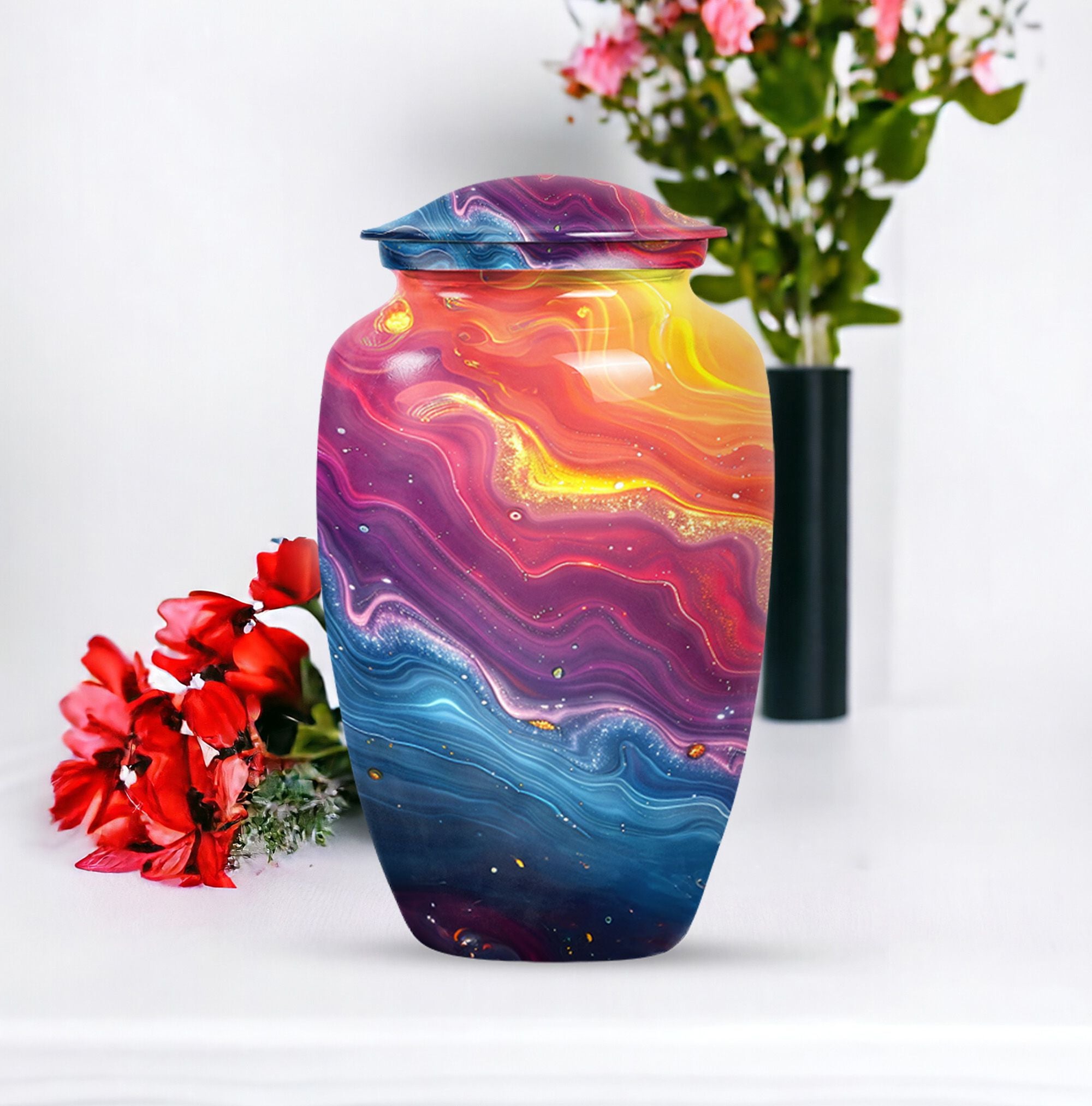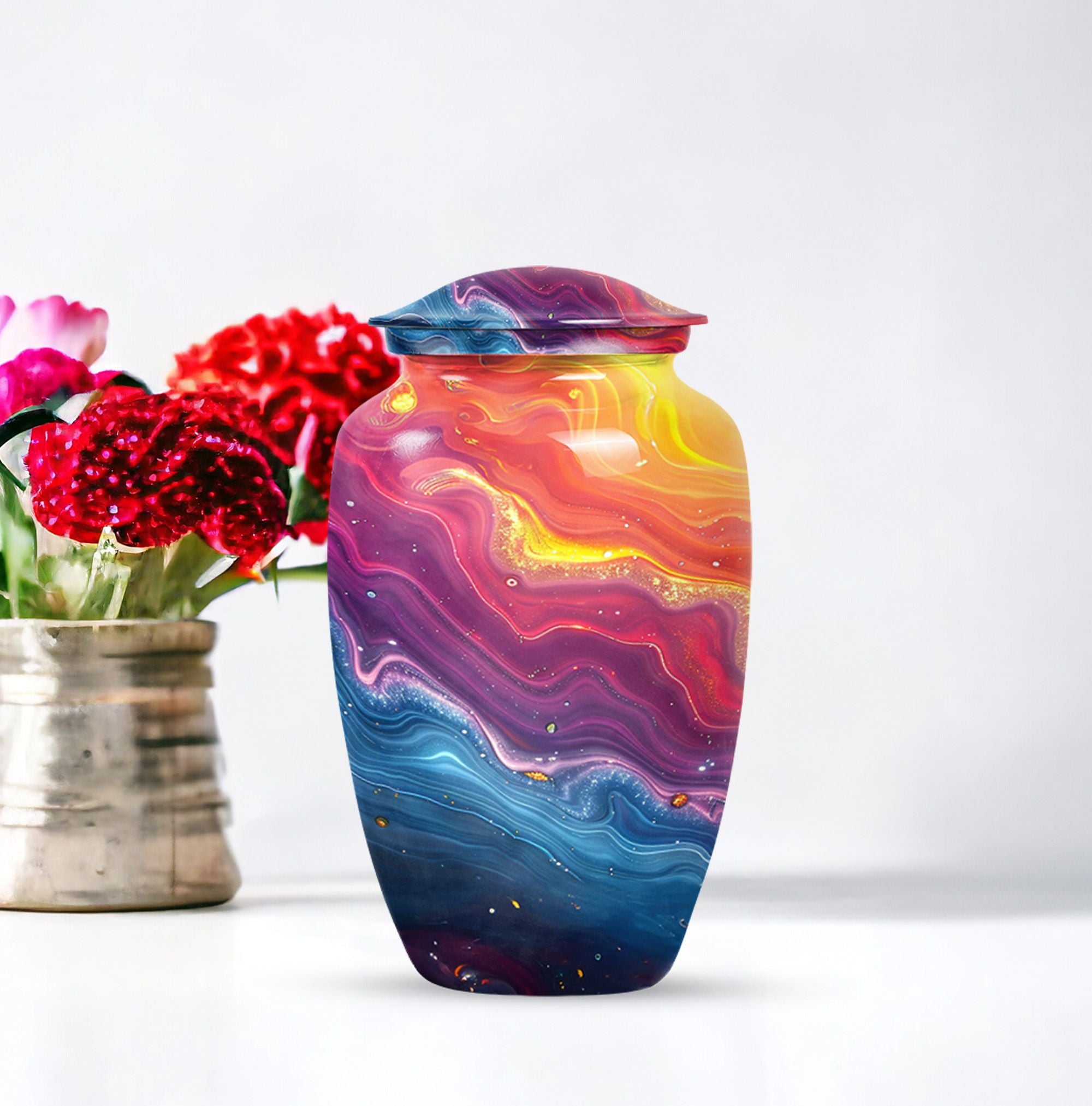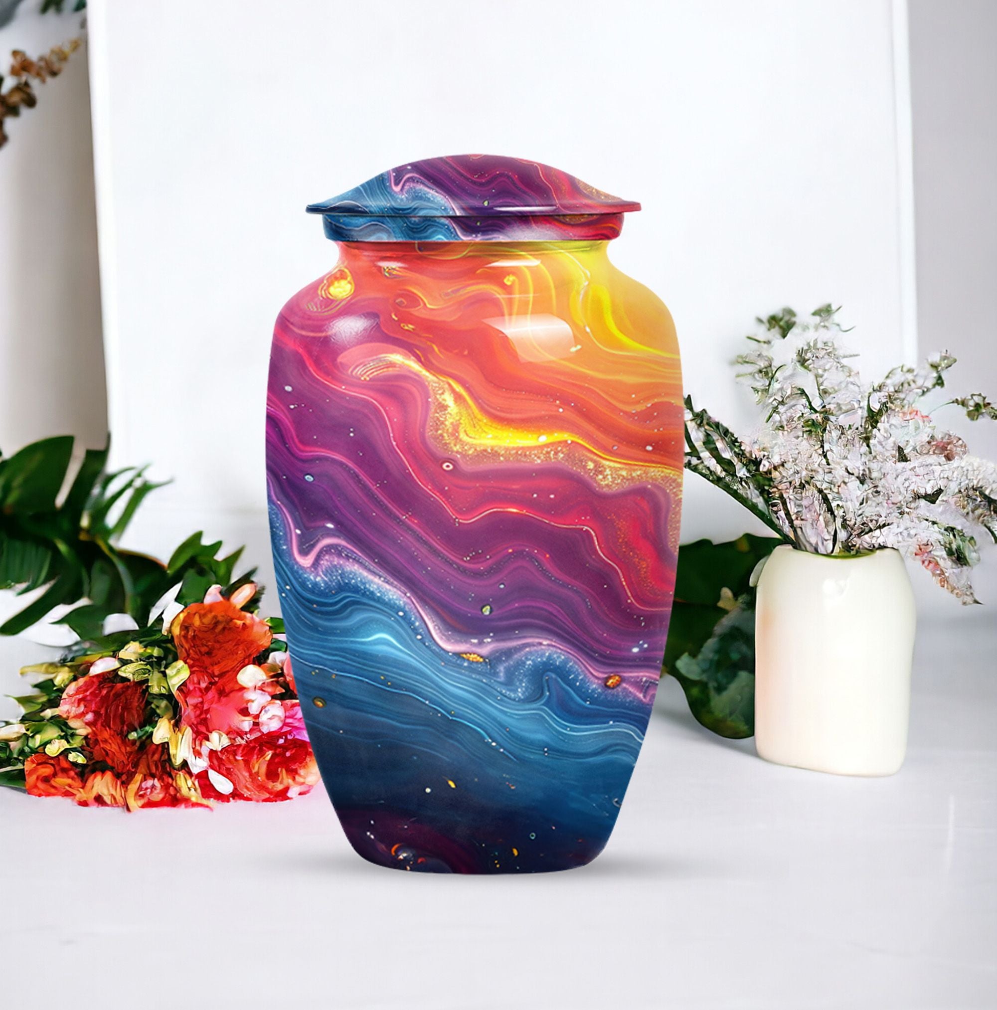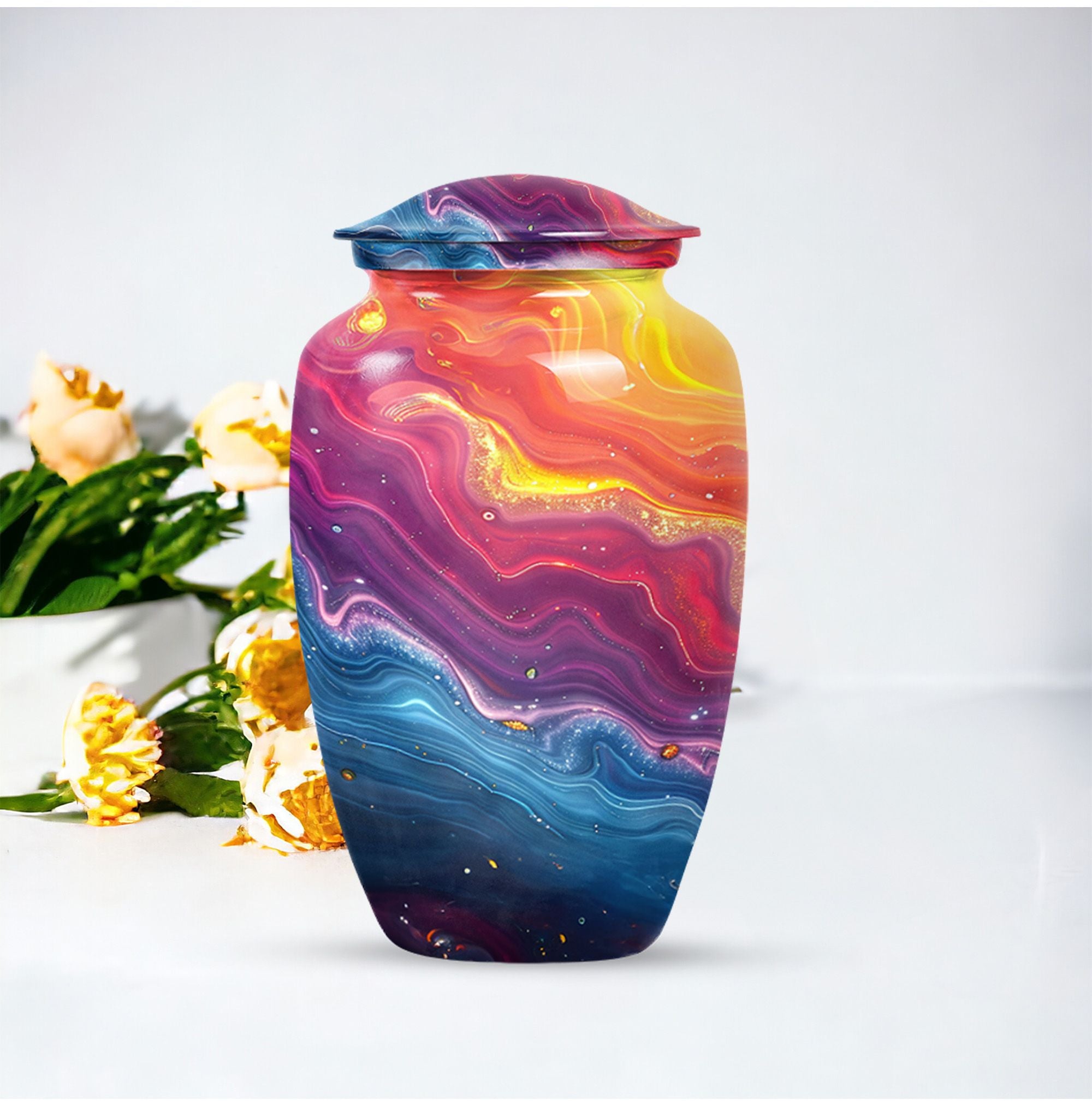 Experience comfort during your times of reflection with the Vibrant Swirl Urn, an exceptional, abstract-themed memorial funeral urn for ashes. Standing proudly at 10 inches, this large urn embodies both substance and style, with its vibrant swirl pattern chaptering not just your loved one’s final physical repository, but also their irreproachable uniqueness. Each 200-cubic inch memorial urn is hewn deftly from sturdy, aluminium, ensuring lasting durability and a weight of 3.3 pounds that brings a well-placed solidity in your hands - a gentle reminder of their abiding presence in your life. The package also includes a plush, velvet pouch as an elegant means for containment of ashes. Personal touches make every difference; hence, customization is available for engraved names. Cast away typical choices with these attractively patterned, unique urns for human ashes—a comforting ode to both mother and father alike. Rediscover ceremony supplies that are thoughtful, inviting, and Aggregating deeper layers of meaning to memorial rituals.