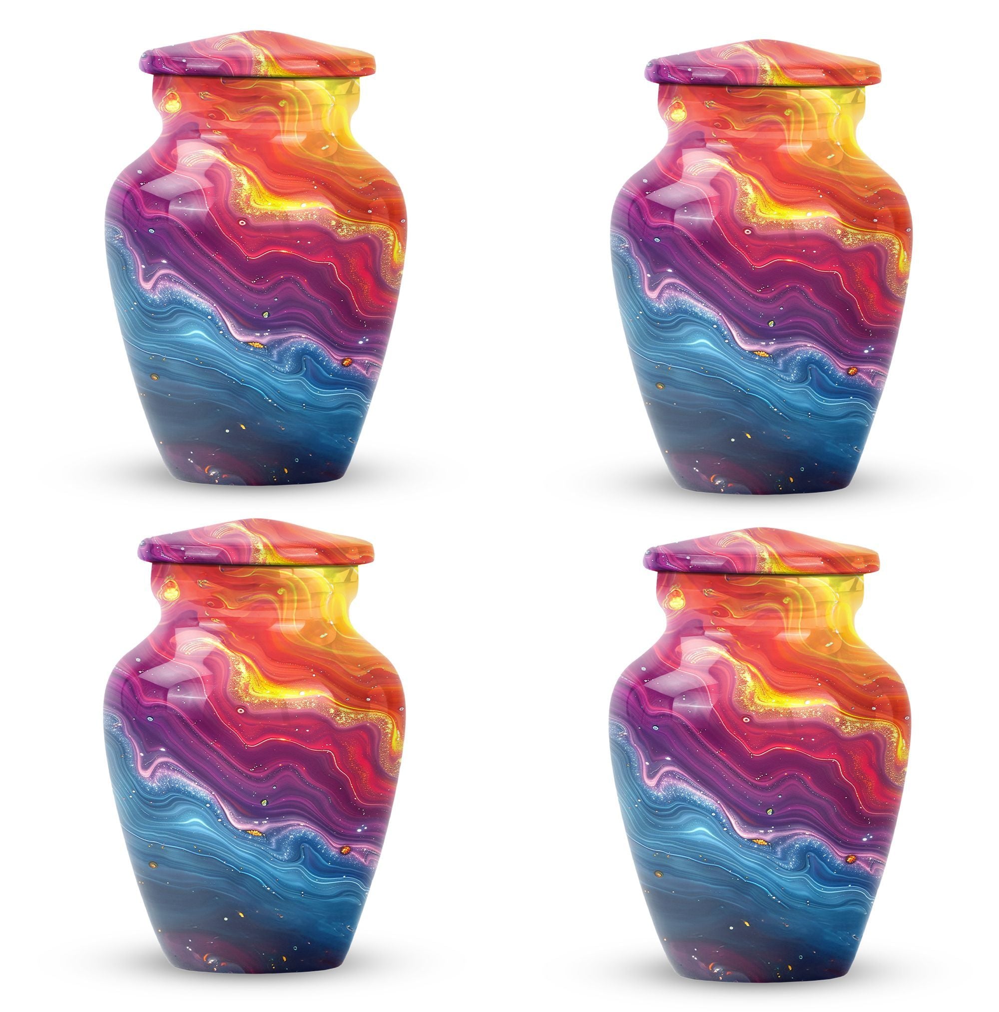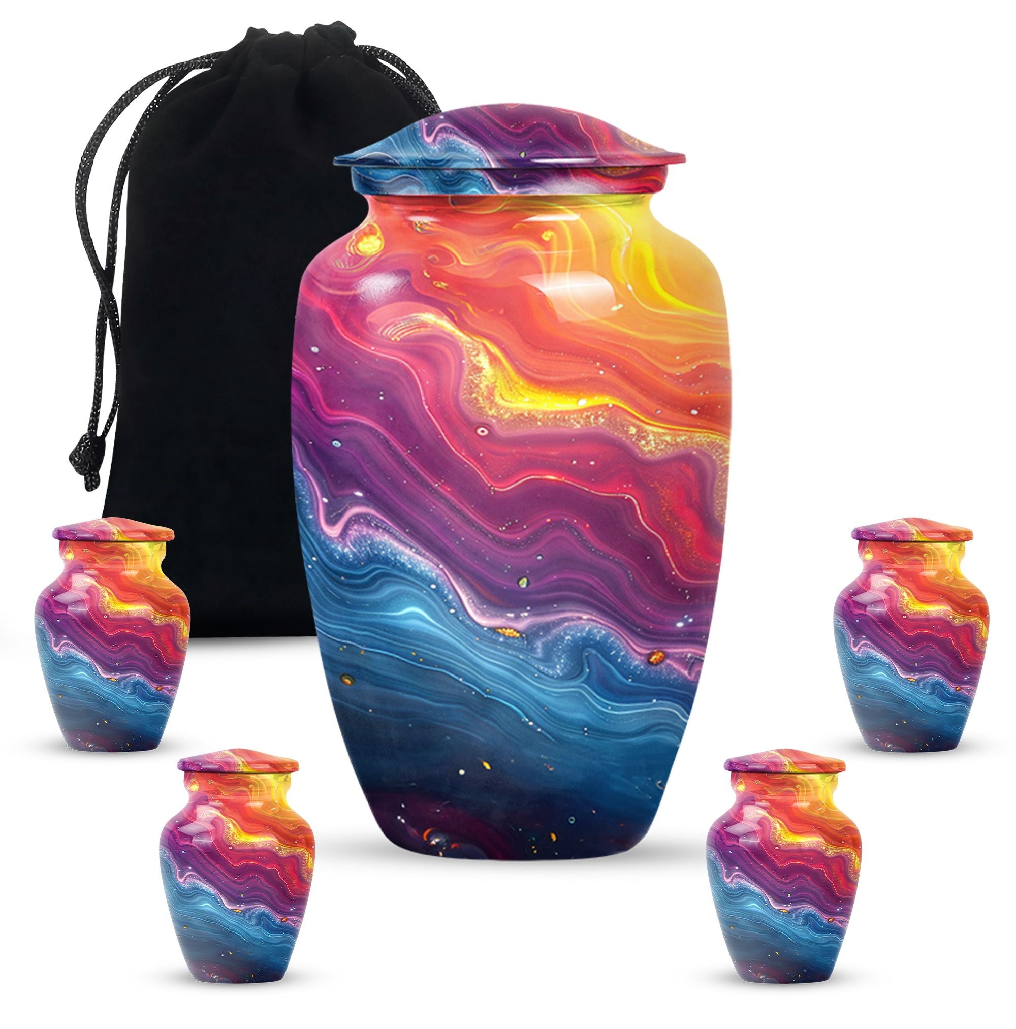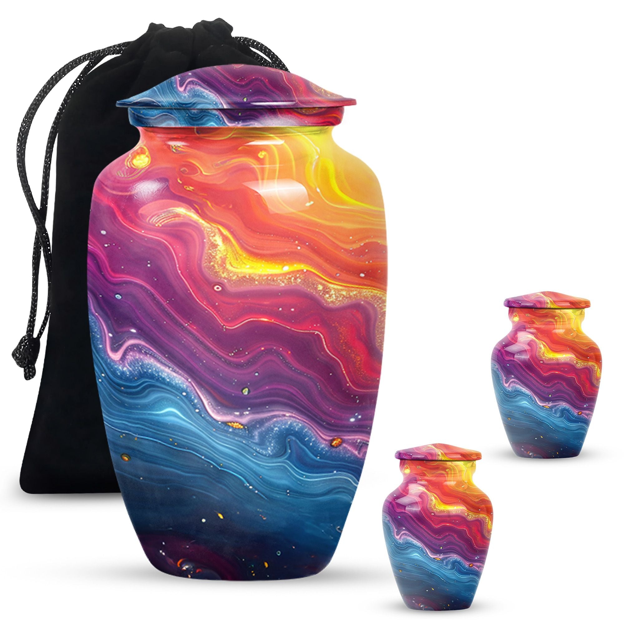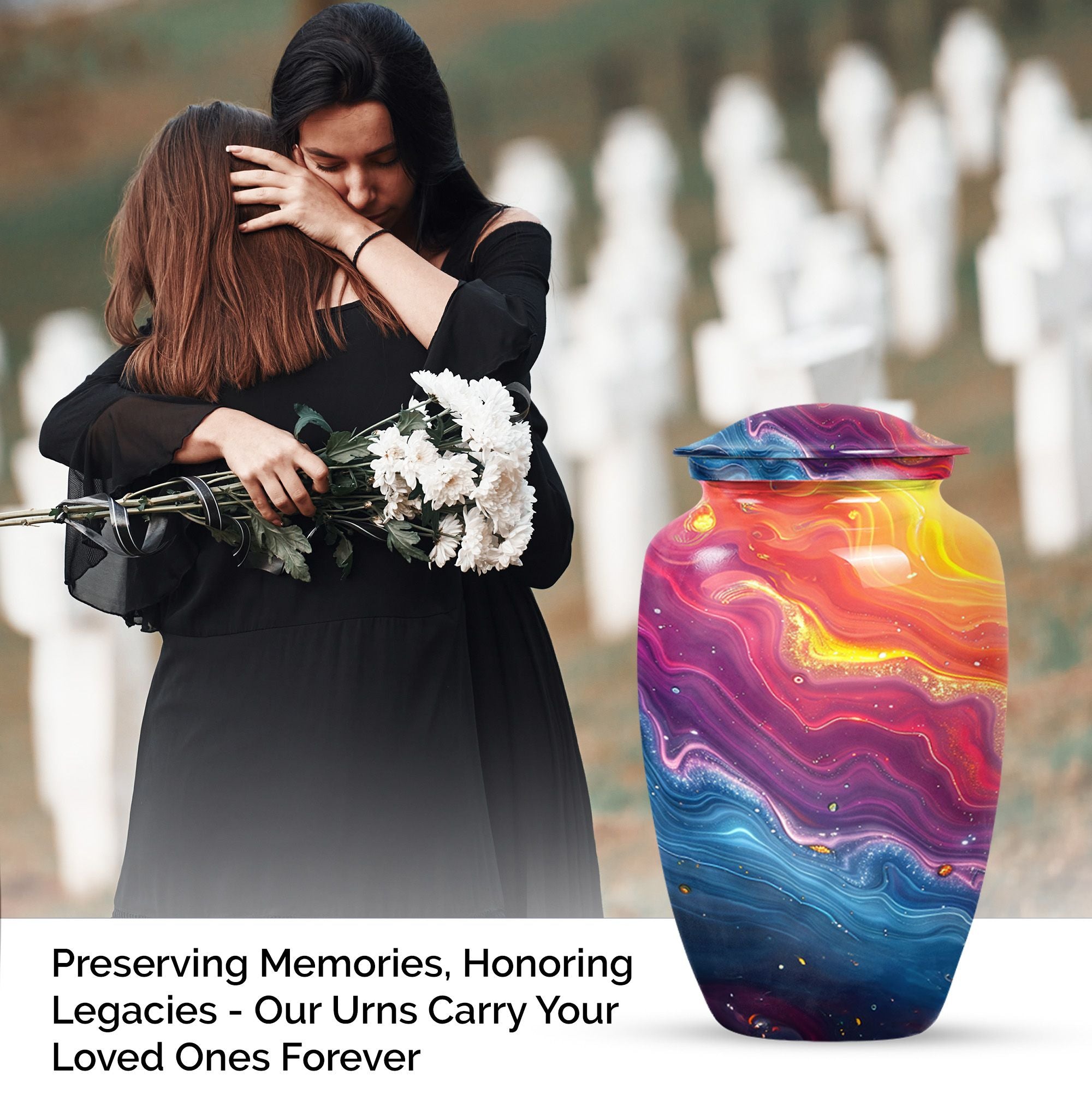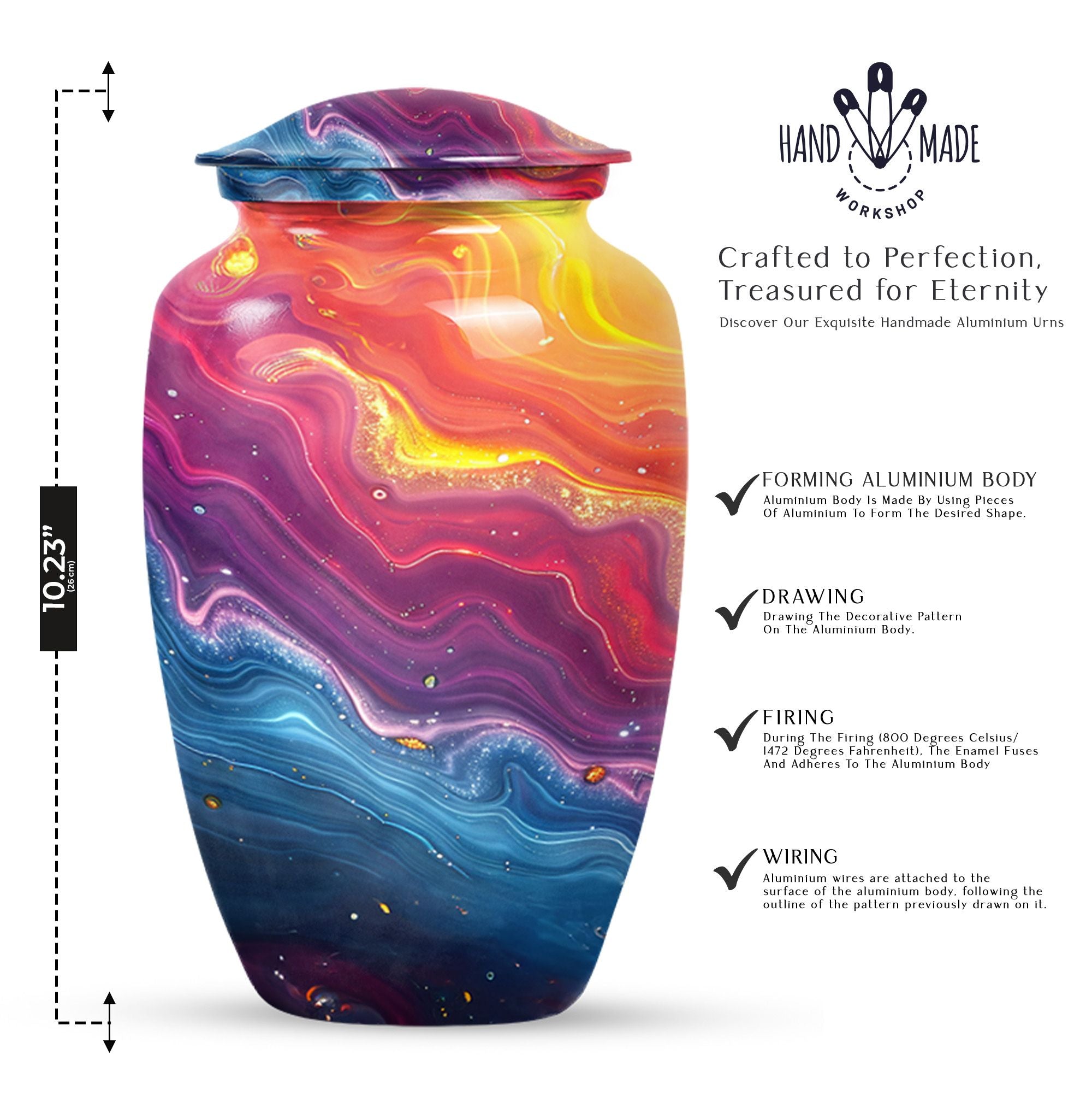 Experience comfort during your times of reflection with the Vibrant Swirl Urn, an exceptional, abstract-themed memorial funeral urn for ashes. Standing proudly at 10 inches, this large urn embodies both substance and style, with its vibrant swirl pattern chaptering not just your loved one’s final physical repository, but also their irreproachable uniqueness. Each 200-cubic inch memorial urn is hewn deftly from sturdy, aluminium, ensuring lasting durability and a weight of 3.3 pounds that brings a well-placed solidity in your hands - a gentle reminder of their abiding presence in your life. The package also includes a plush, velvet pouch as an elegant means for containment of ashes. Personal touches make every difference; hence, customization is available for engraved names. Cast away typical choices with these attractively patterned, unique urns for human ashes—a comforting ode to both mother and father alike. Rediscover ceremony supplies that are thoughtful, inviting, and Aggregating deeper layers of meaning to memorial rituals.
