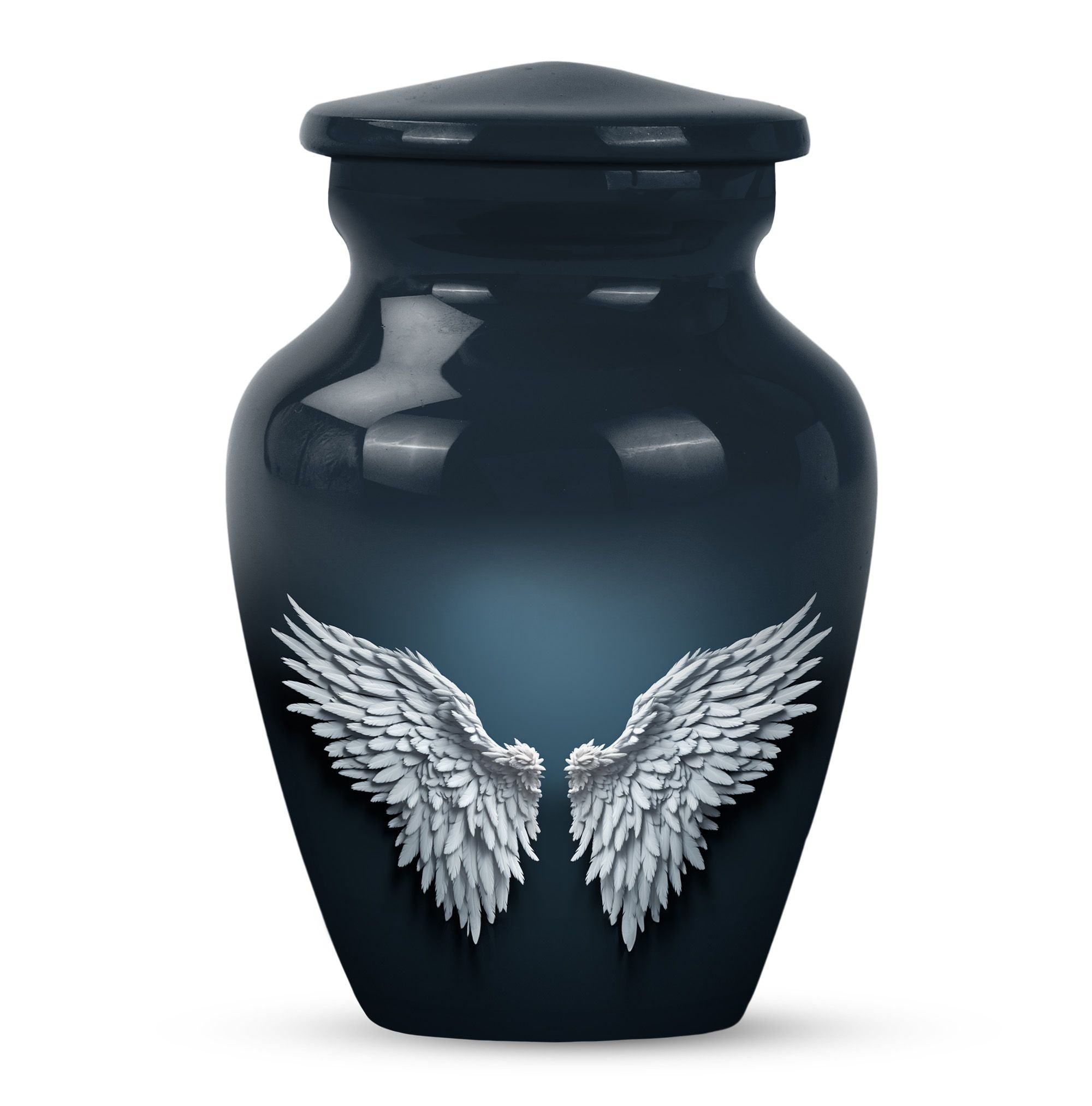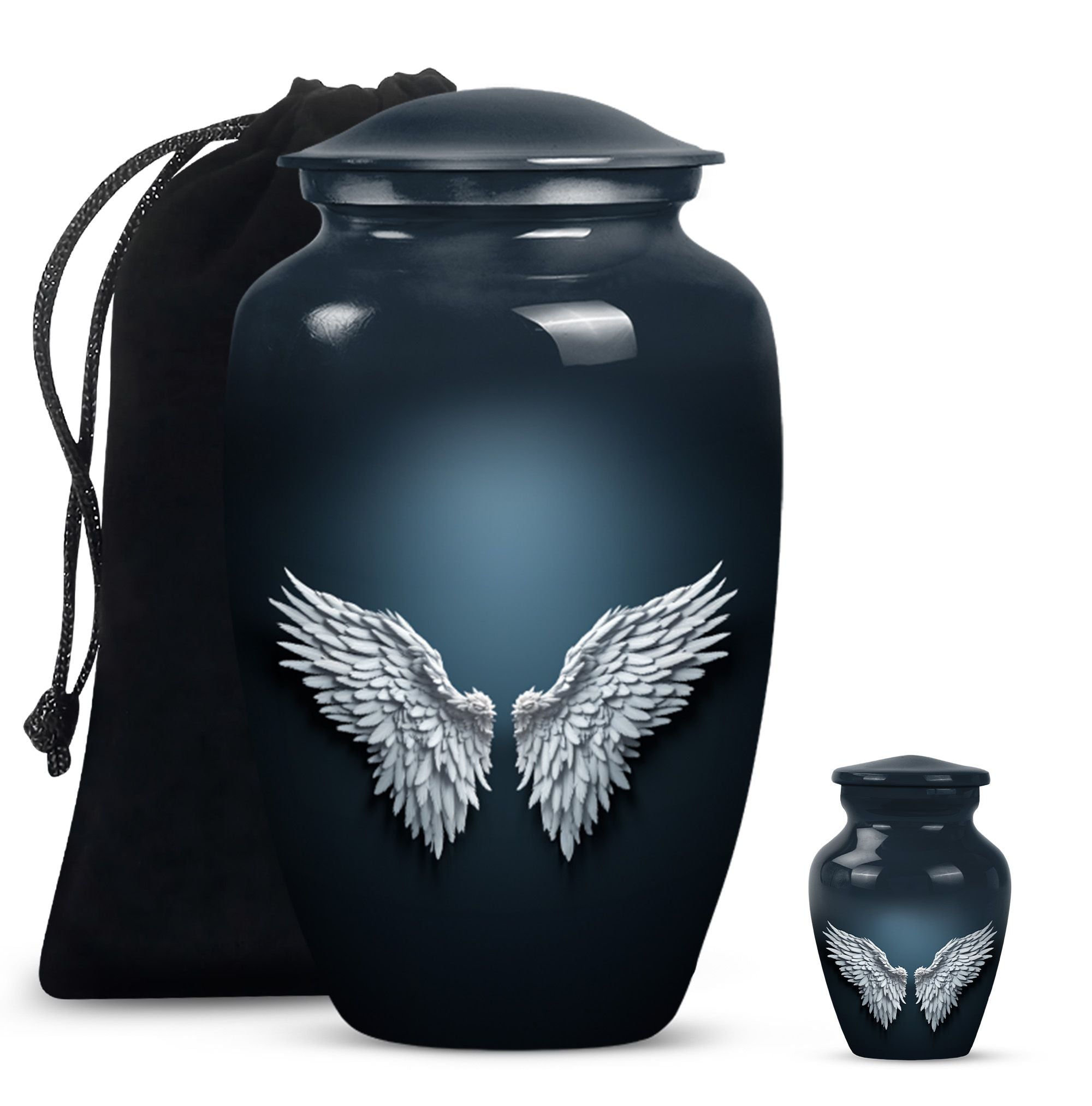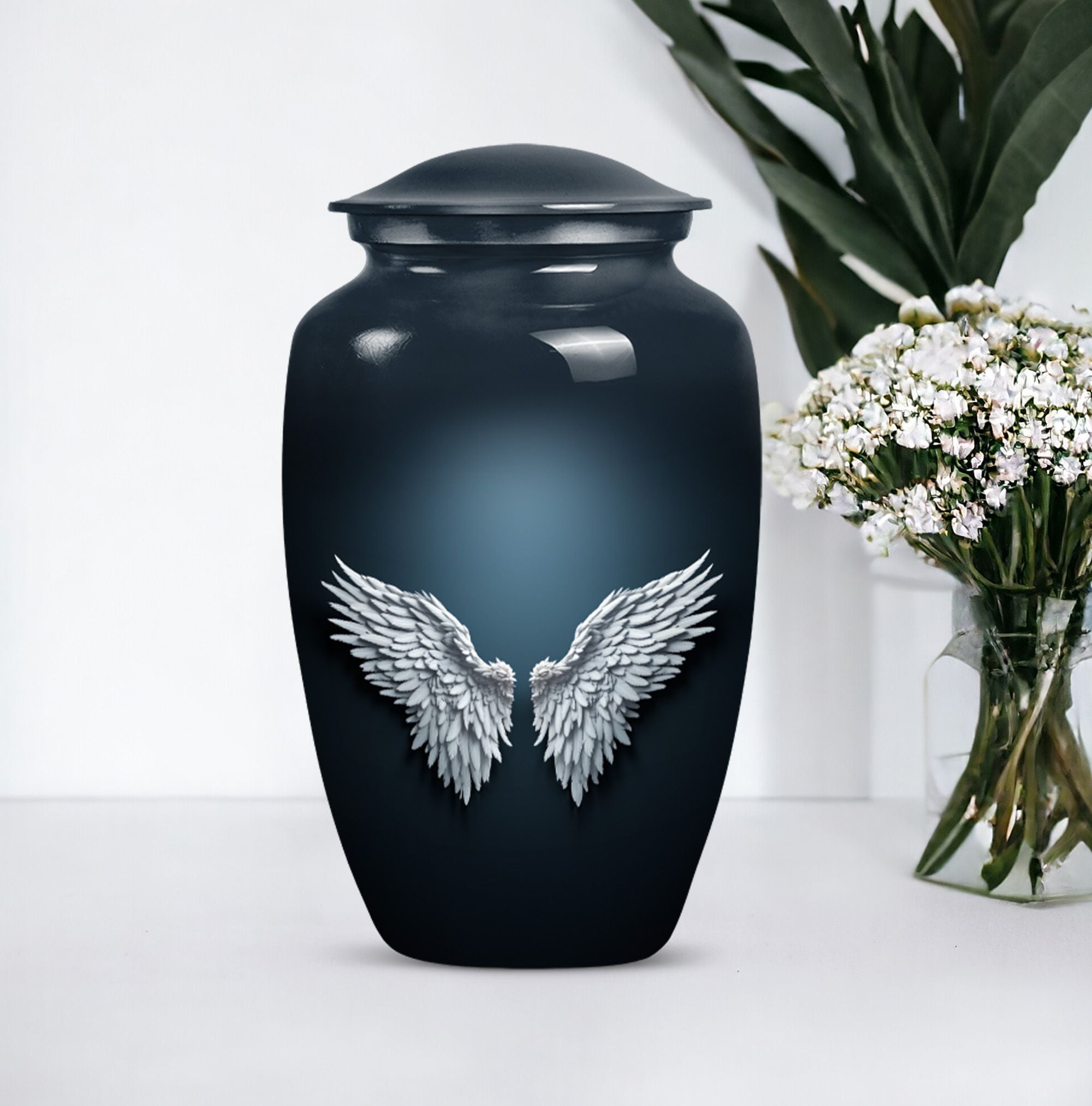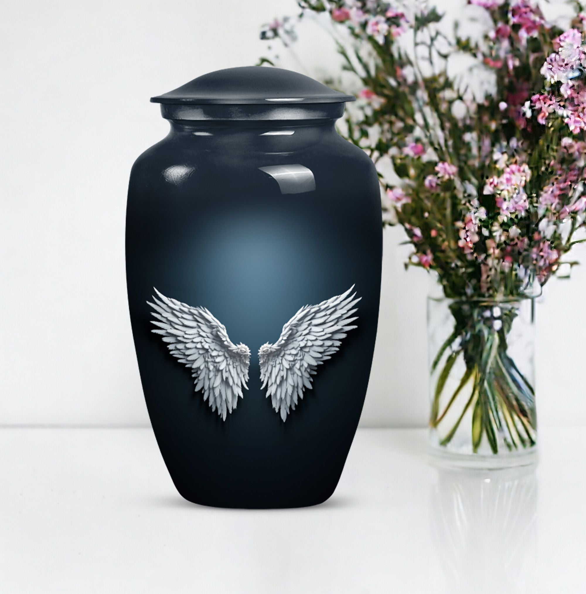 Cherish and commemorate your loved one's memory with the Wings Blue Urn, a timeless touch of reverence to your memorial ceremony. This large urn measures 10 inches in height, evoking an anchored capacity of 200 cubic inches, perfectly corresponding to an adult human. Crafted to last in aluminium, this urn weighs a sturdy 3.3 pounds. The elegant 'Classic Urn' design cradles a gentle butterfly theme symbolizing transformation and resurrection. It comes with a soft velvet pouch, preserving the containment of ashes with utmost respect. A memento of your loved one can be engraved on the urn, enabling you a uniquely personal touch. This product is found under the category of memorial adult urns, cremation urns for burial in-ground, and urns for human ashes. The Wings Blue Urn, an emblem of perpetual love and honor, stands a stoic guard for your everlasting memories.