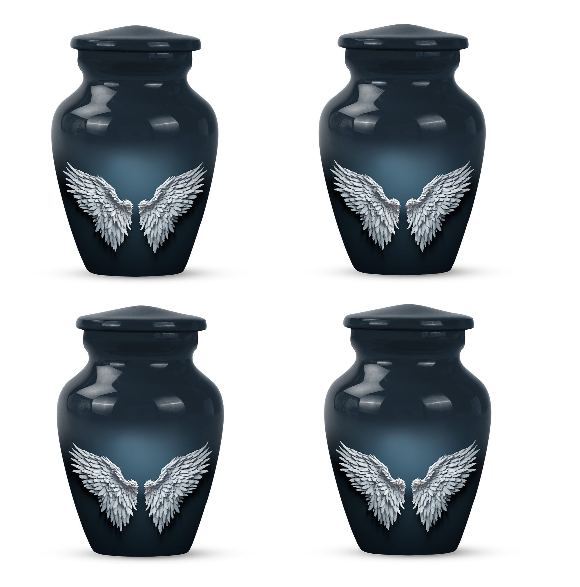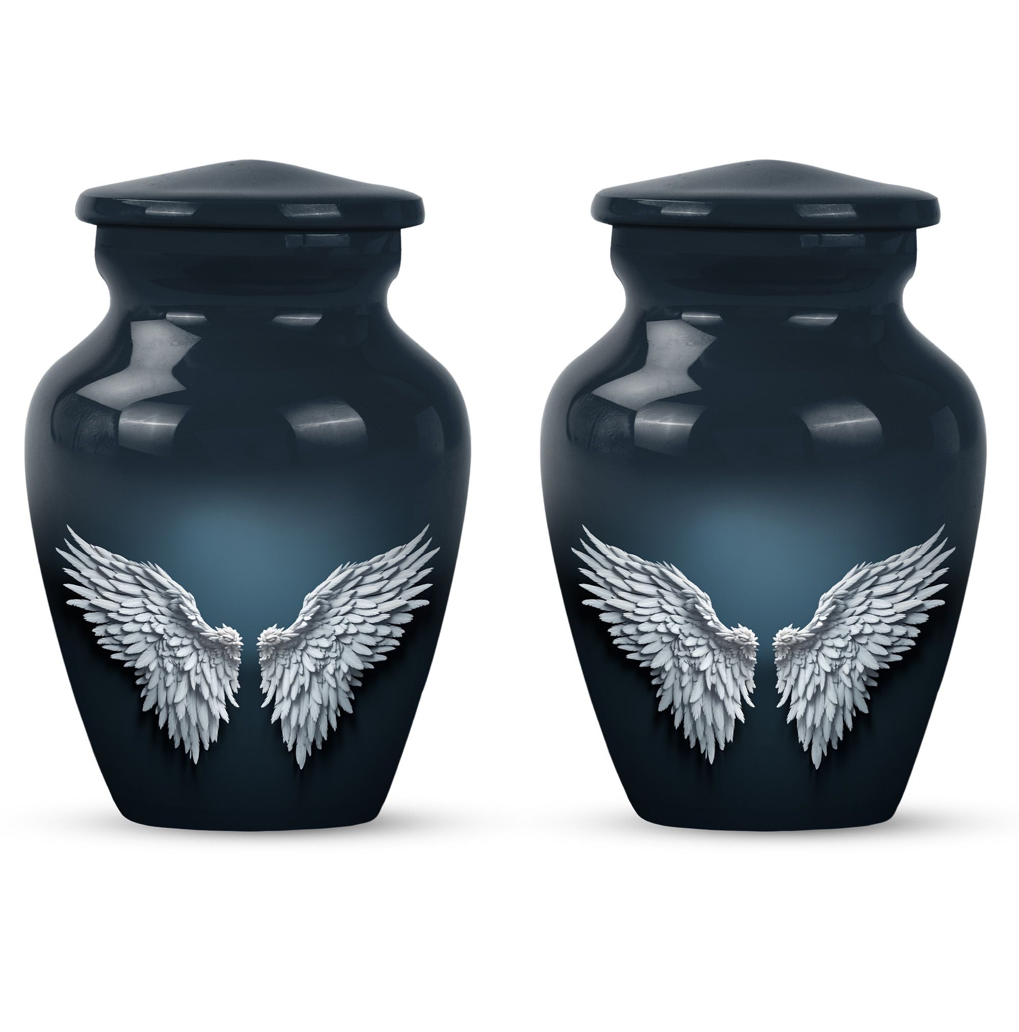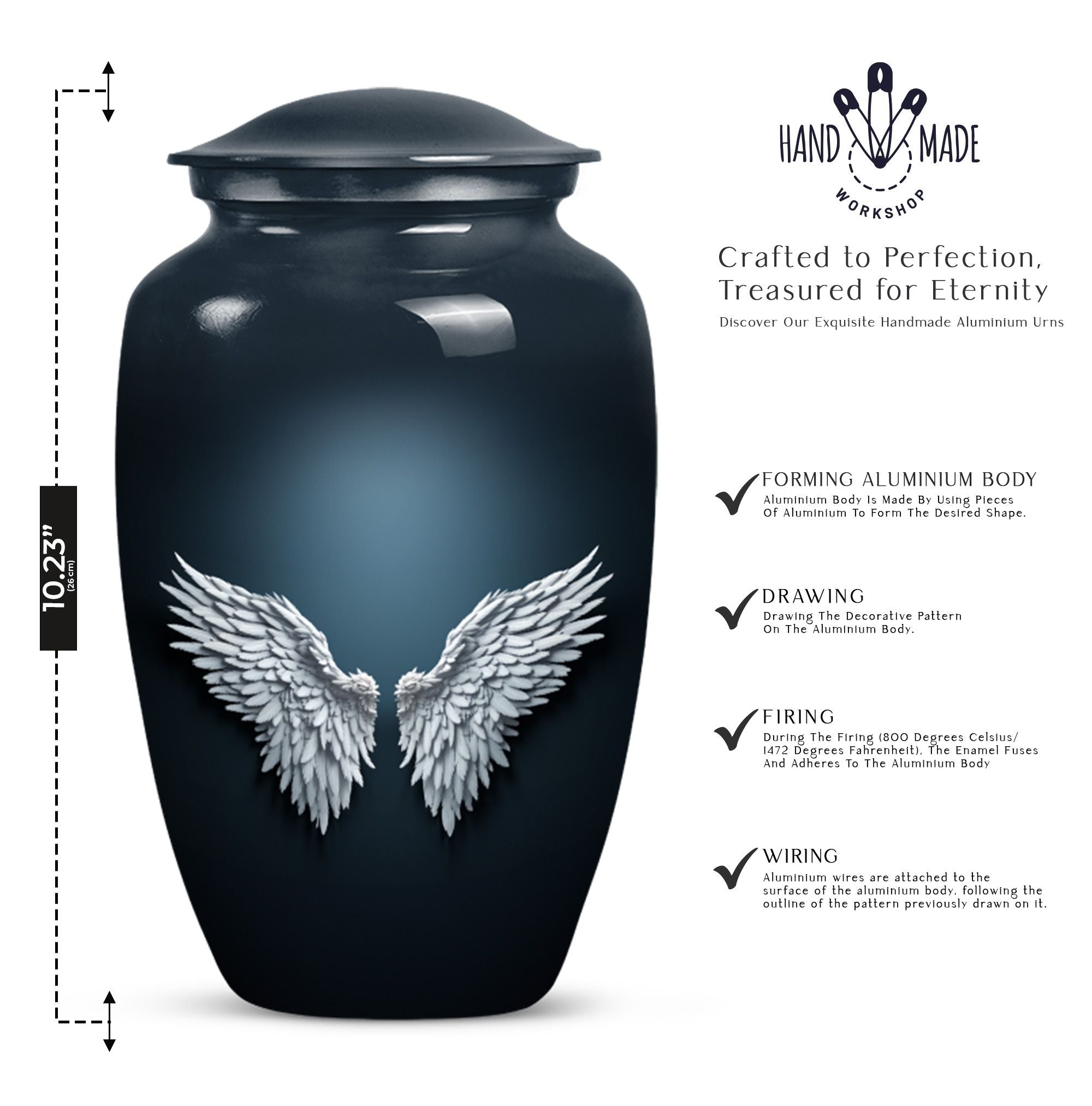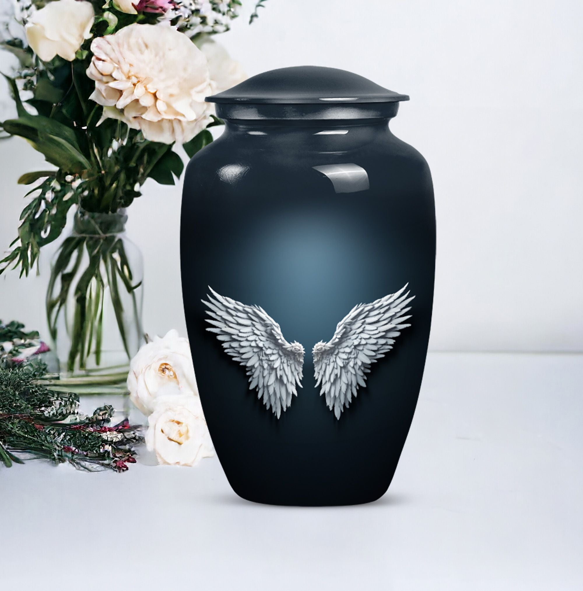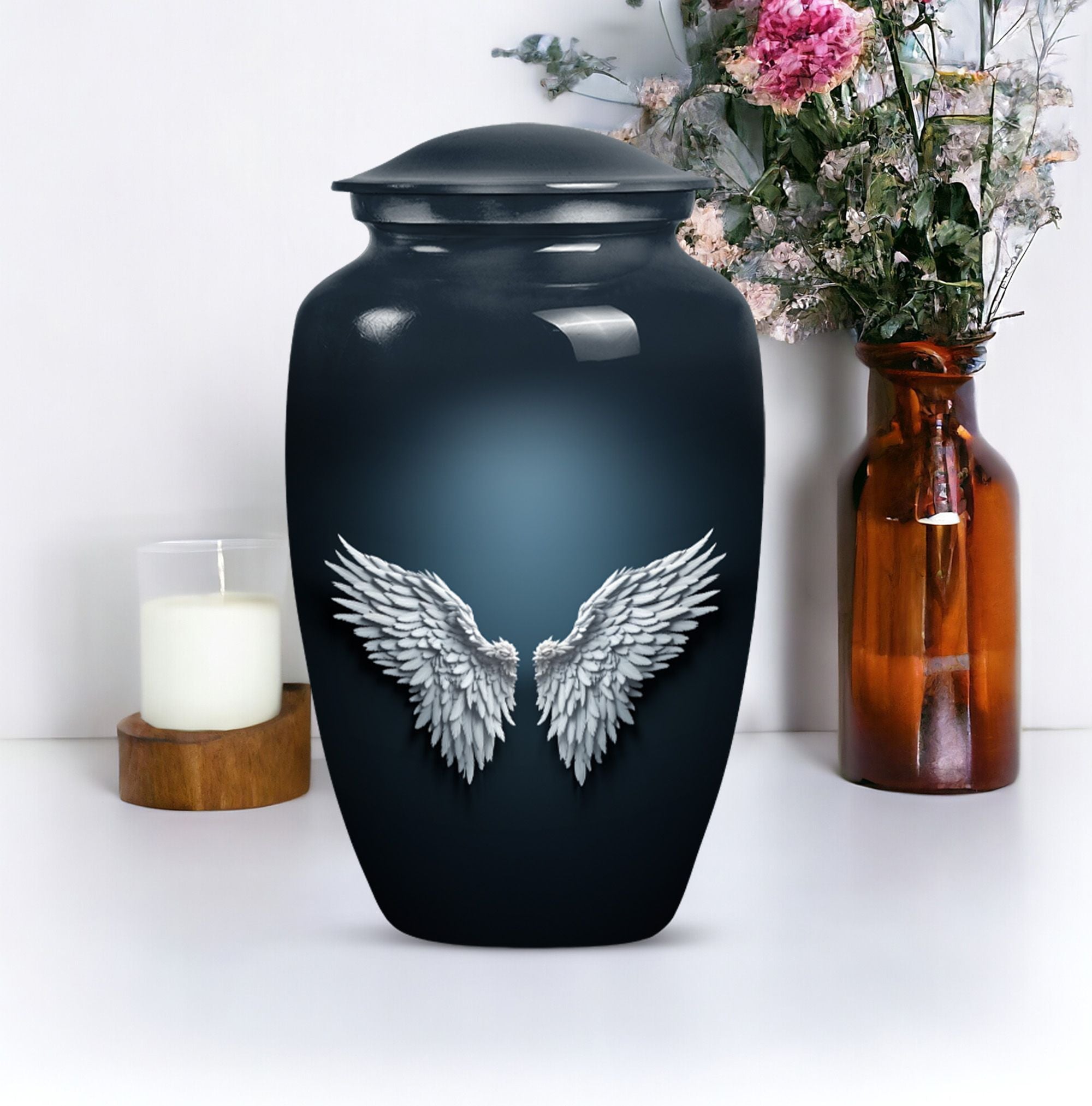 Cherish and commemorate your loved one's memory with the Wings Blue Urn, a timeless touch of reverence to your memorial ceremony. This large urn measures 10 inches in height, evoking an anchored capacity of 200 cubic inches, perfectly corresponding to an adult human. Crafted to last in aluminium, this urn weighs a sturdy 3.3 pounds. The elegant 'Classic Urn' design cradles a gentle butterfly theme symbolizing transformation and resurrection. It comes with a soft velvet pouch, preserving the containment of ashes with utmost respect. A memento of your loved one can be engraved on the urn, enabling you a uniquely personal touch. This product is found under the category of memorial adult urns, cremation urns for burial in-ground, and urns for human ashes. The Wings Blue Urn, an emblem of perpetual love and honor, stands a stoic guard for your everlasting memories.
