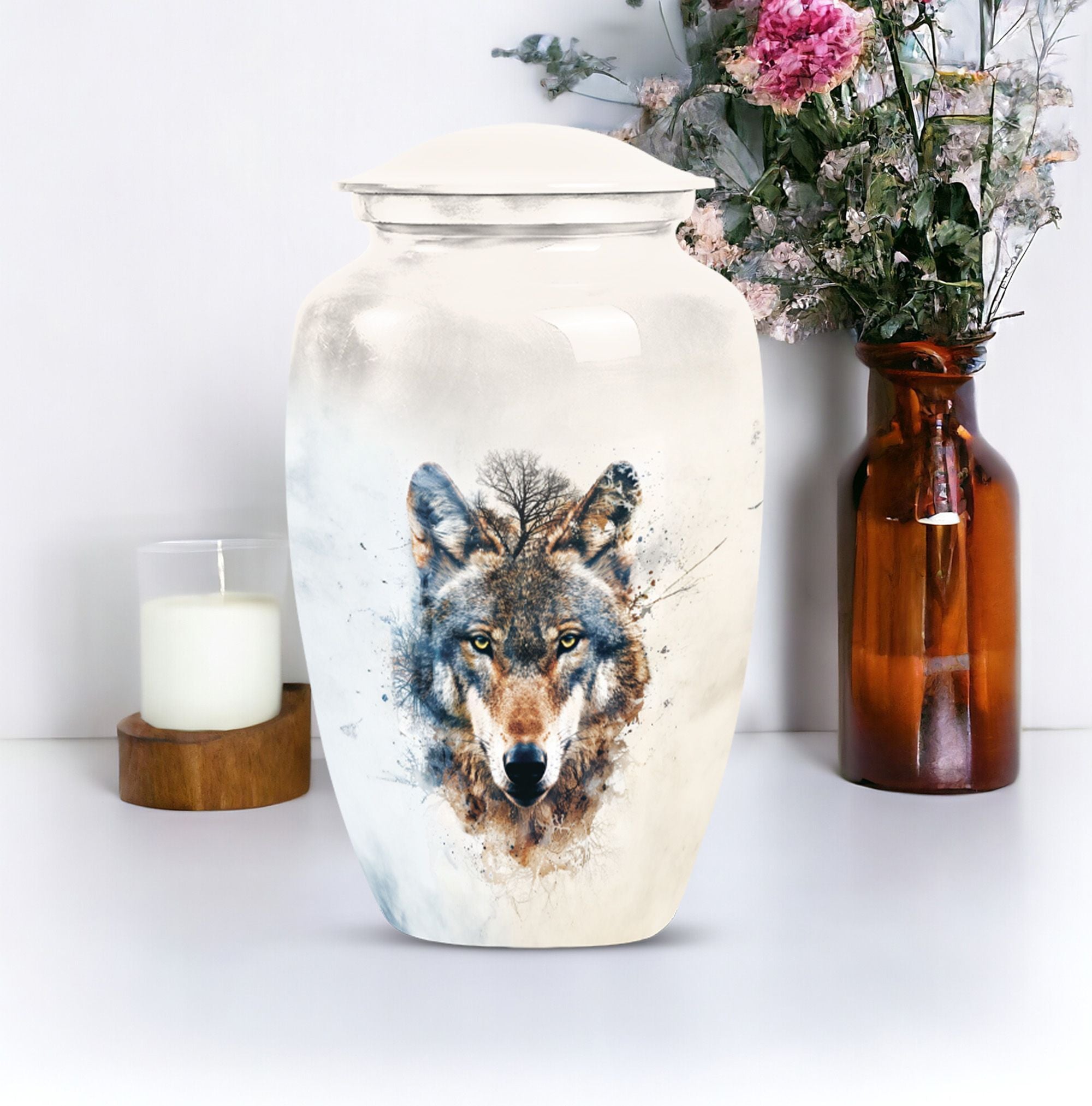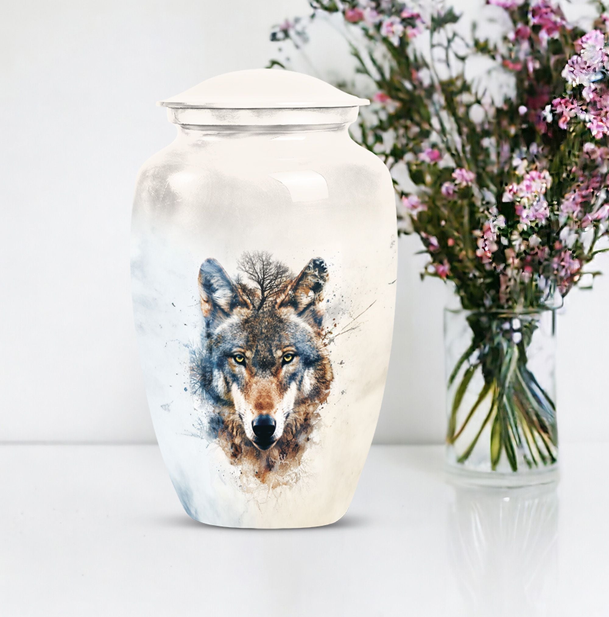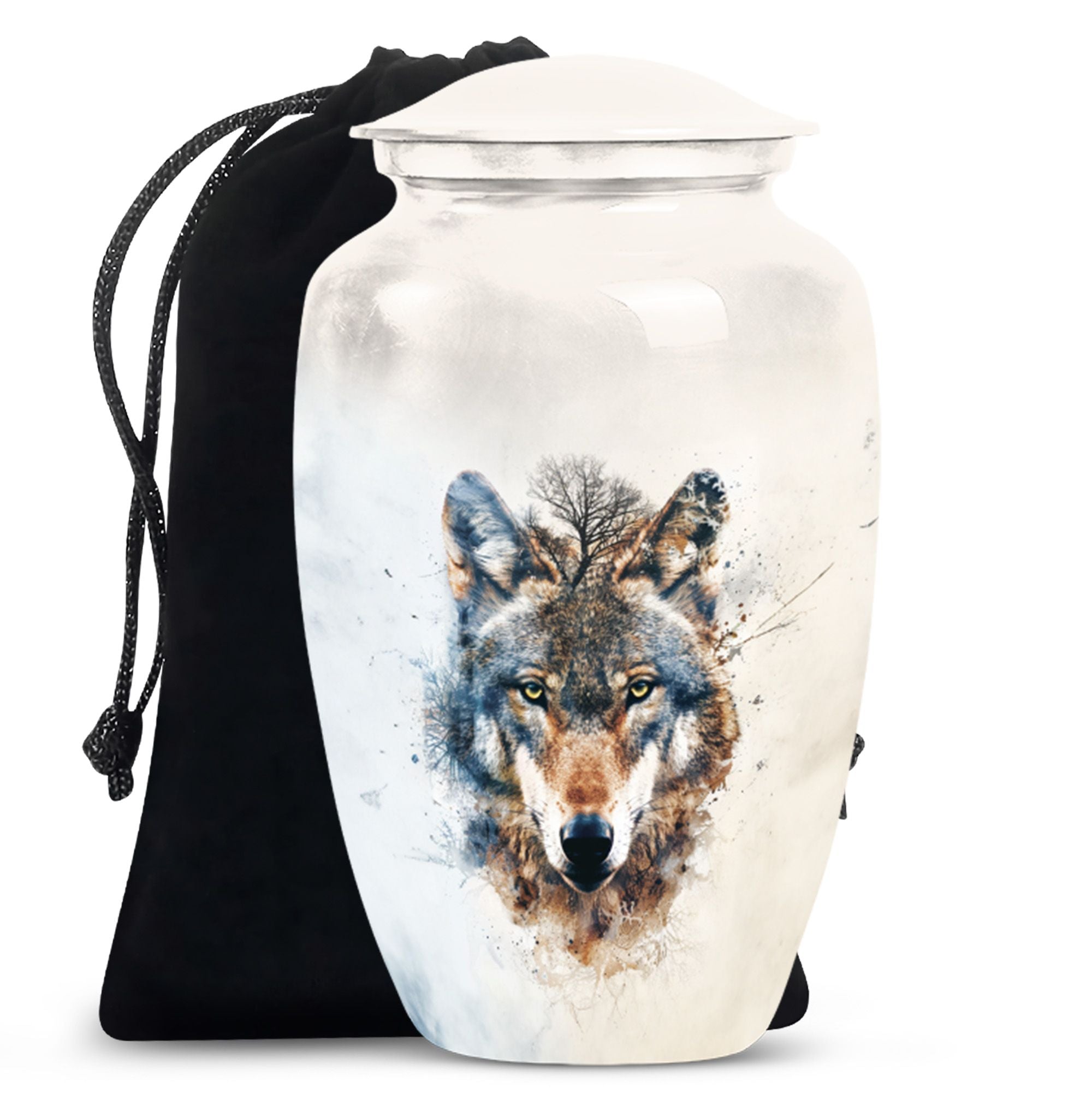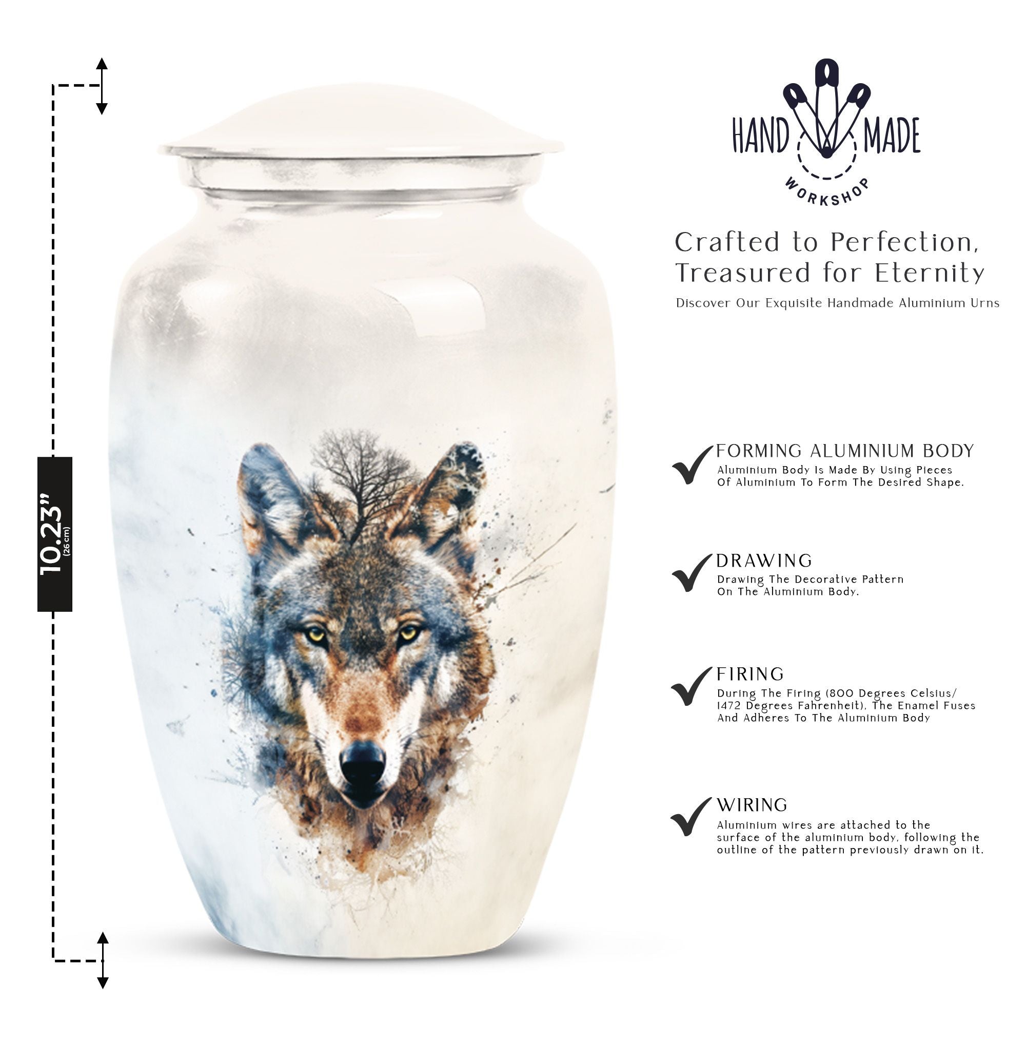 Safely store your loved one's earthly remains in dignity and respect with the Large Wolf Howling Urn. Sized at 10 inches, this memorial urn captures a timeless elegance with its classic urn design, beautifully engraved with a majestic, howling wolf theme. Handcrafted from top-grade aluminium, it is designed to withstand many years as a lasting tribute. The urn weights 3.3 pounds, indicating its superb quality and firmness, its stature speaks volumes about its capacity, holding up to 200 cubic inches of ashes. Moreover, the urn can be personalized with engraved names, making it a unique commemoration of your loved one. Every purchase includes a plush velvet pouch for the mindful containment of ashes. Perfect for both indoor and outdoor placement, this cremation urn serves as a heartfelt symbol of life's fleeting nature. As our way of honoring those who have passed, we provide more than just funeral urns for adult ashes; we offer a beacon of remembrance illuminated by the essence of their spirit. Related to 'burial urns metal', 'outdoor urns' and 'ash urn ashes adult', the Wolf Howling Urn is an epitome of comfort and peace in taxing times.