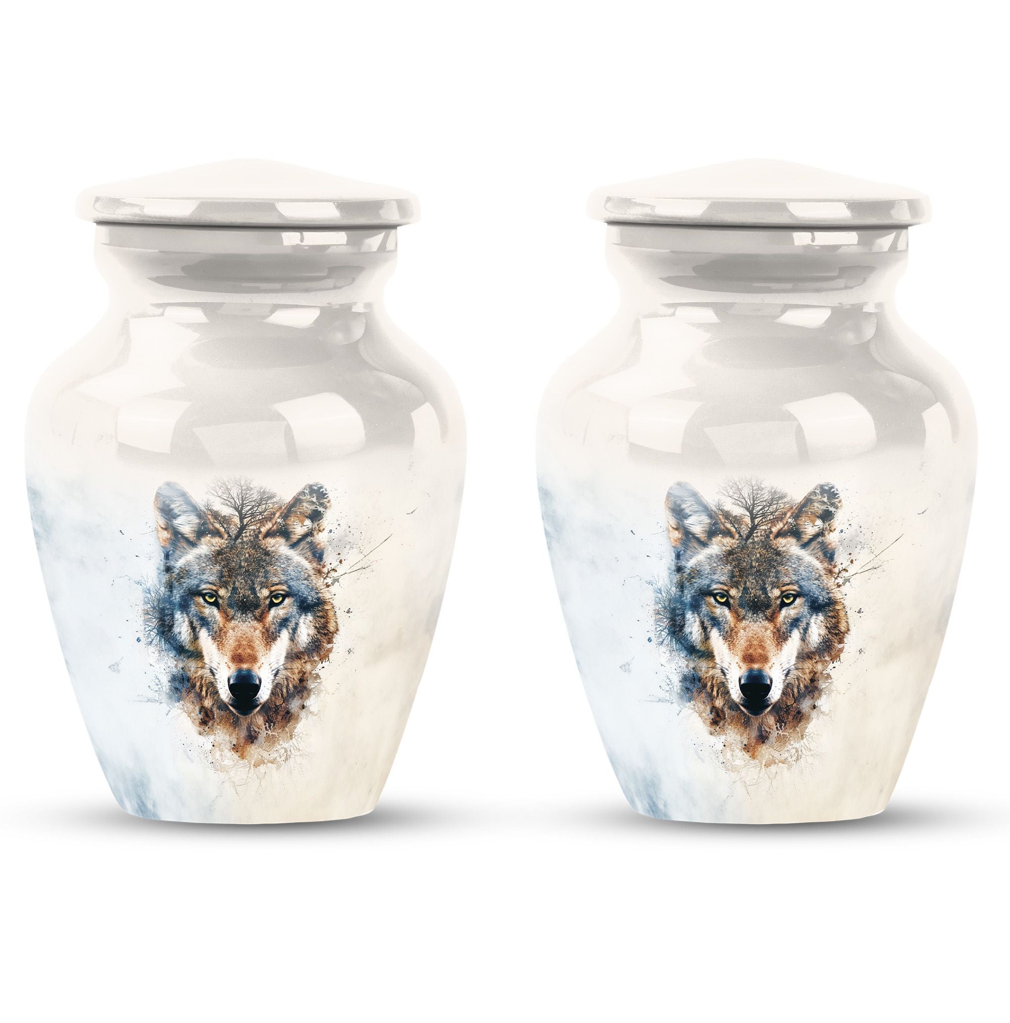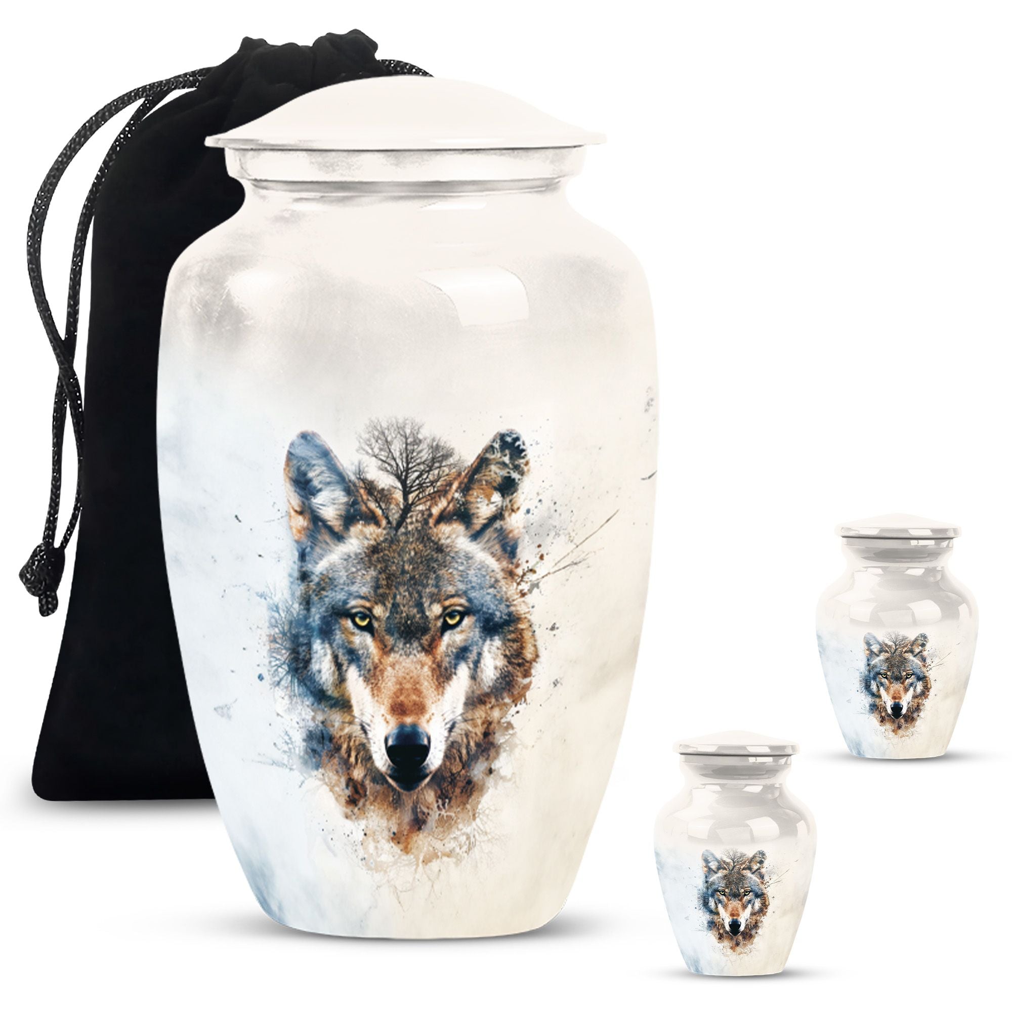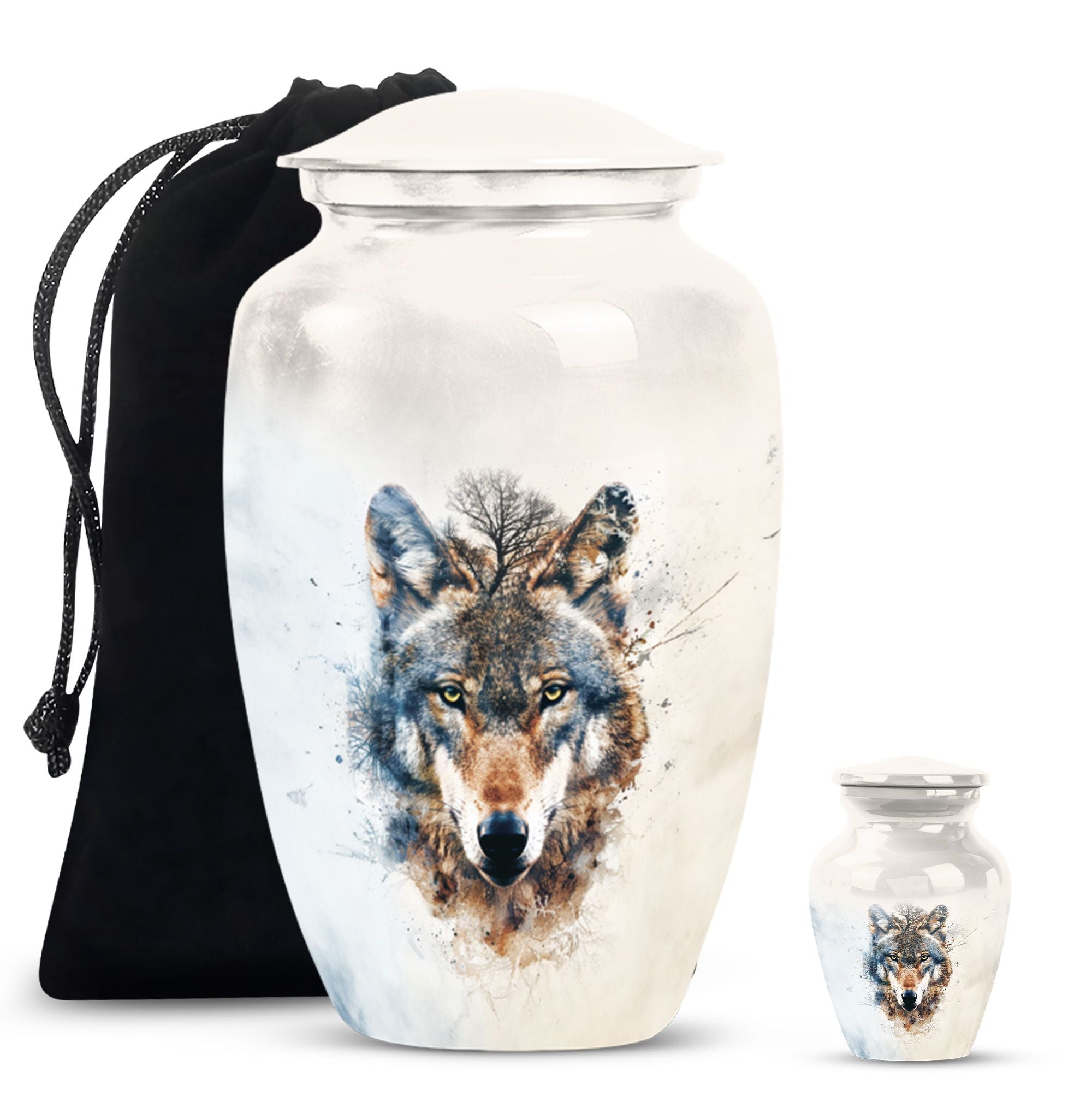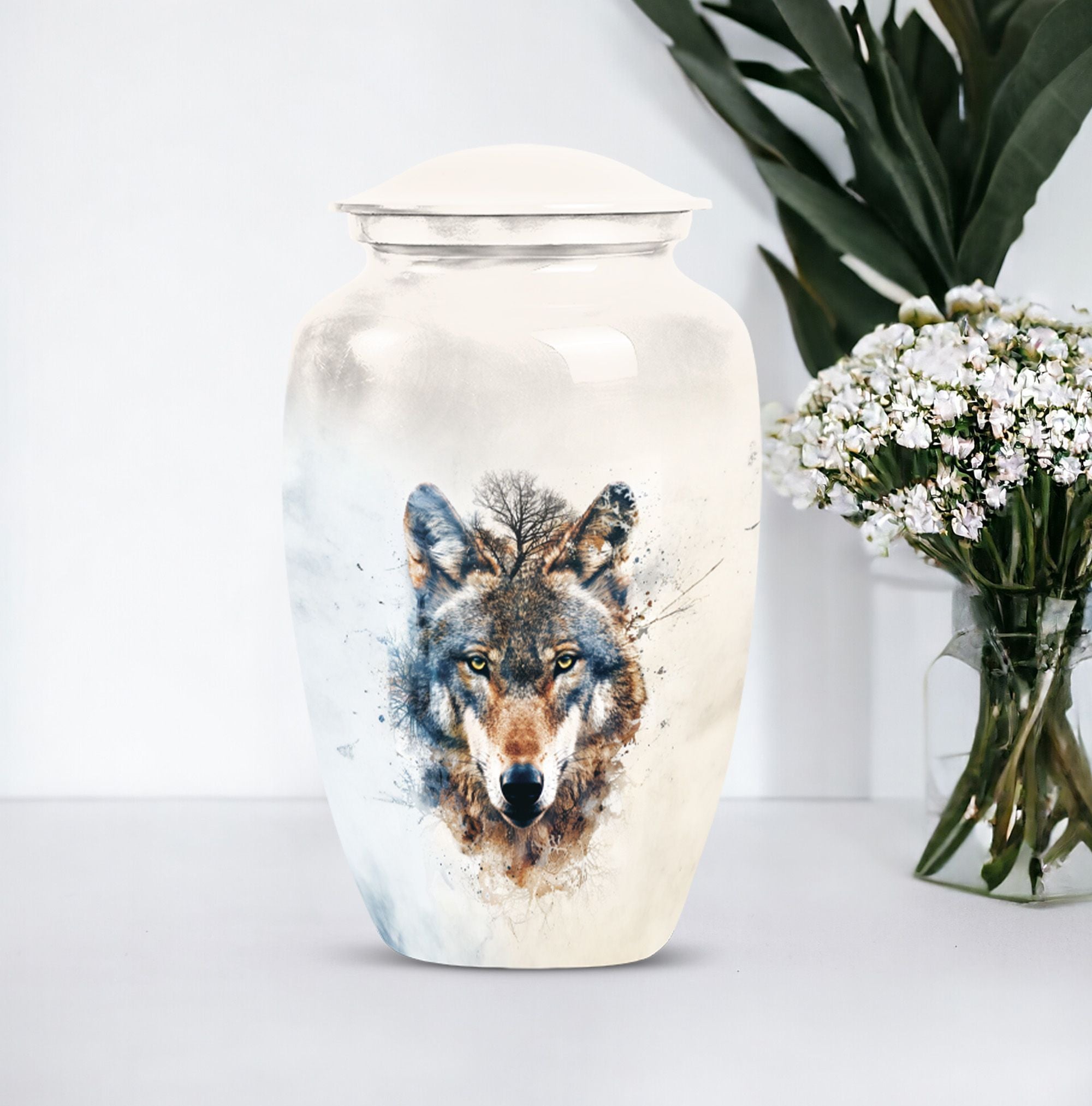 Safely store your loved one's earthly remains in dignity and respect with the Large Wolf Howling Urn. Sized at 10 inches, this memorial urn captures a timeless elegance with its classic urn design, beautifully engraved with a majestic, howling wolf theme. Handcrafted from top-grade aluminium, it is designed to withstand many years as a lasting tribute. The urn weights 3.3 pounds, indicating its superb quality and firmness, its stature speaks volumes about its capacity, holding up to 200 cubic inches of ashes. Moreover, the urn can be personalized with engraved names, making it a unique commemoration of your loved one. Every purchase includes a plush velvet pouch for the mindful containment of ashes. Perfect for both indoor and outdoor placement, this cremation urn serves as a heartfelt symbol of life's fleeting nature. As our way of honoring those who have passed, we provide more than just funeral urns for adult ashes; we offer a beacon of remembrance illuminated by the essence of their spirit. Related to 'burial urns metal', 'outdoor urns' and 'ash urn ashes adult', the Wolf Howling Urn is an epitome of comfort and peace in taxing times.
