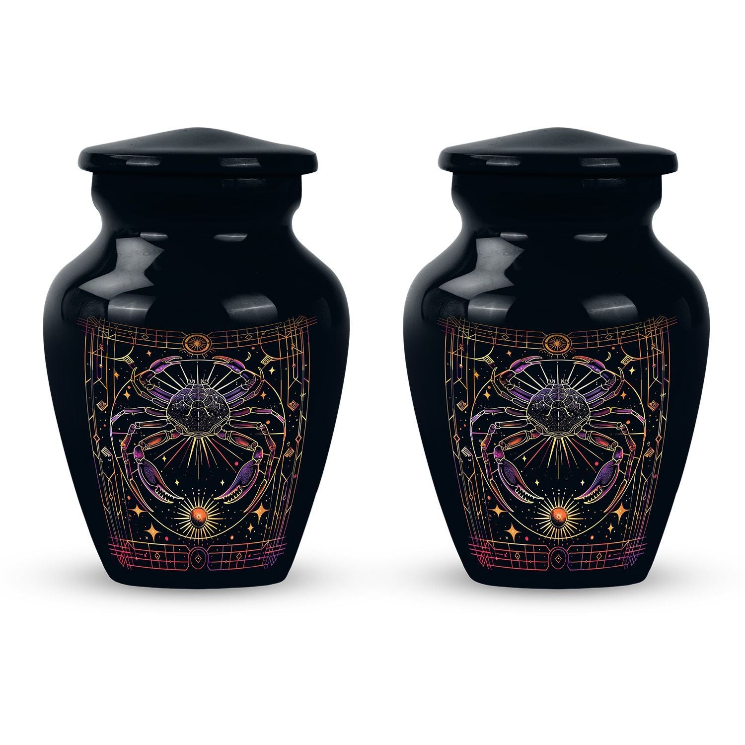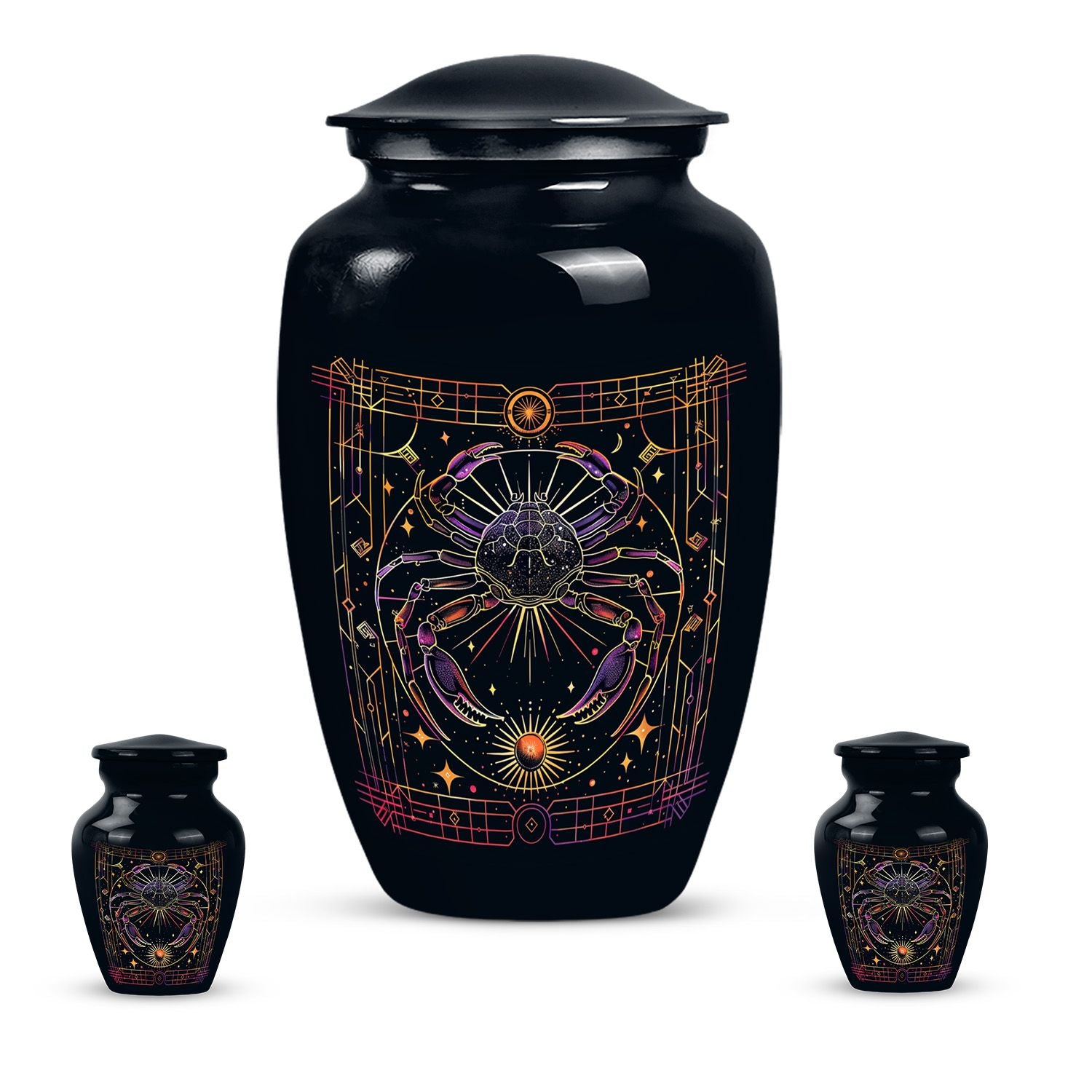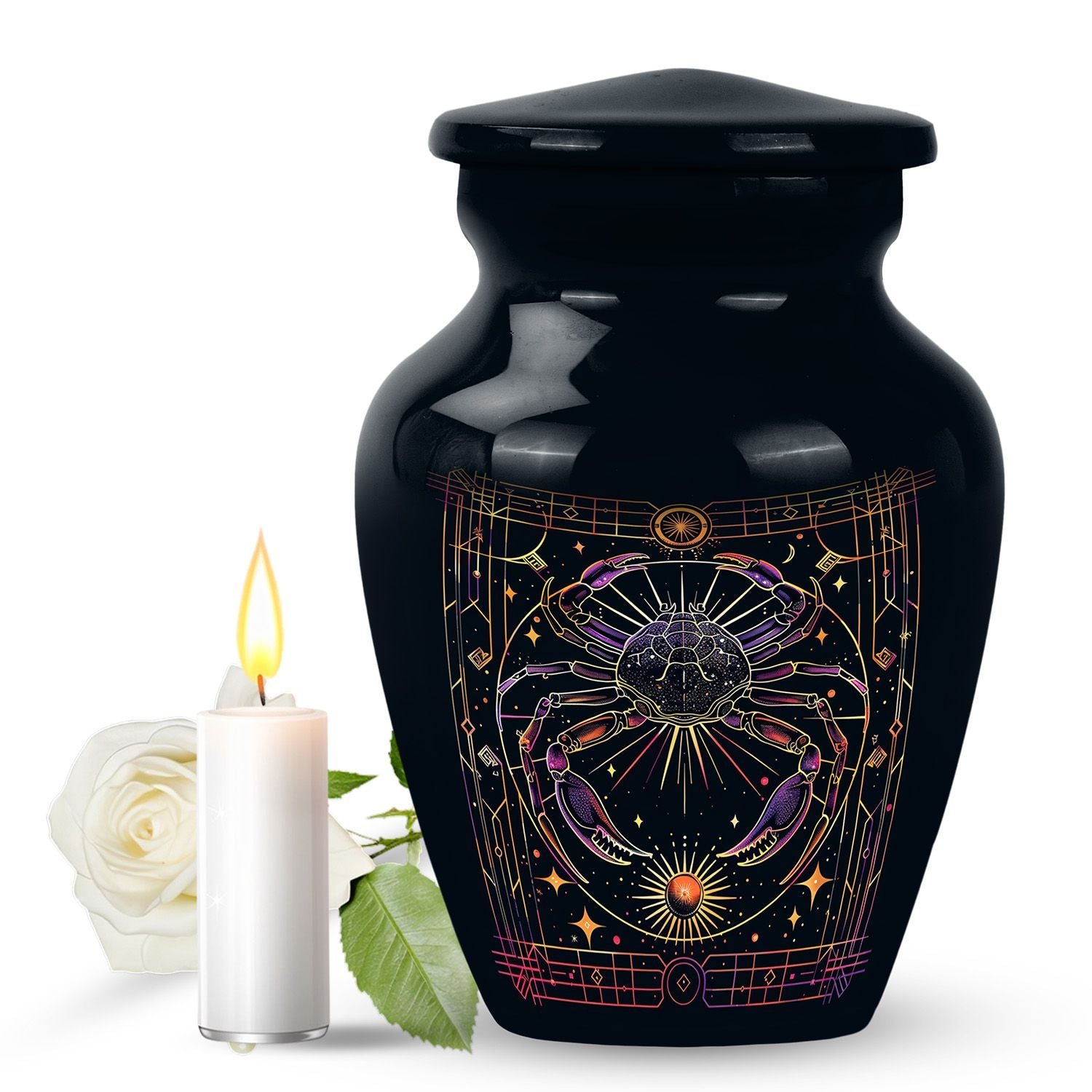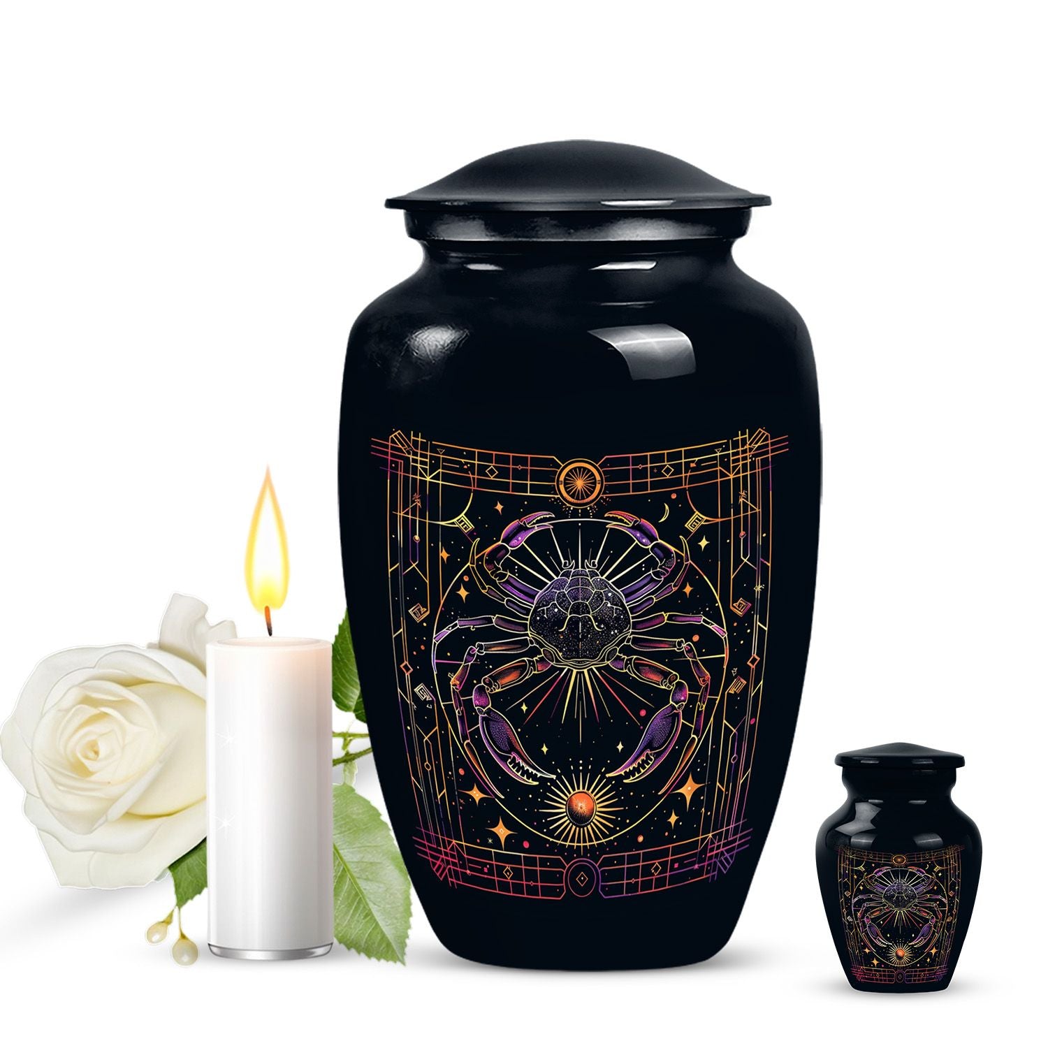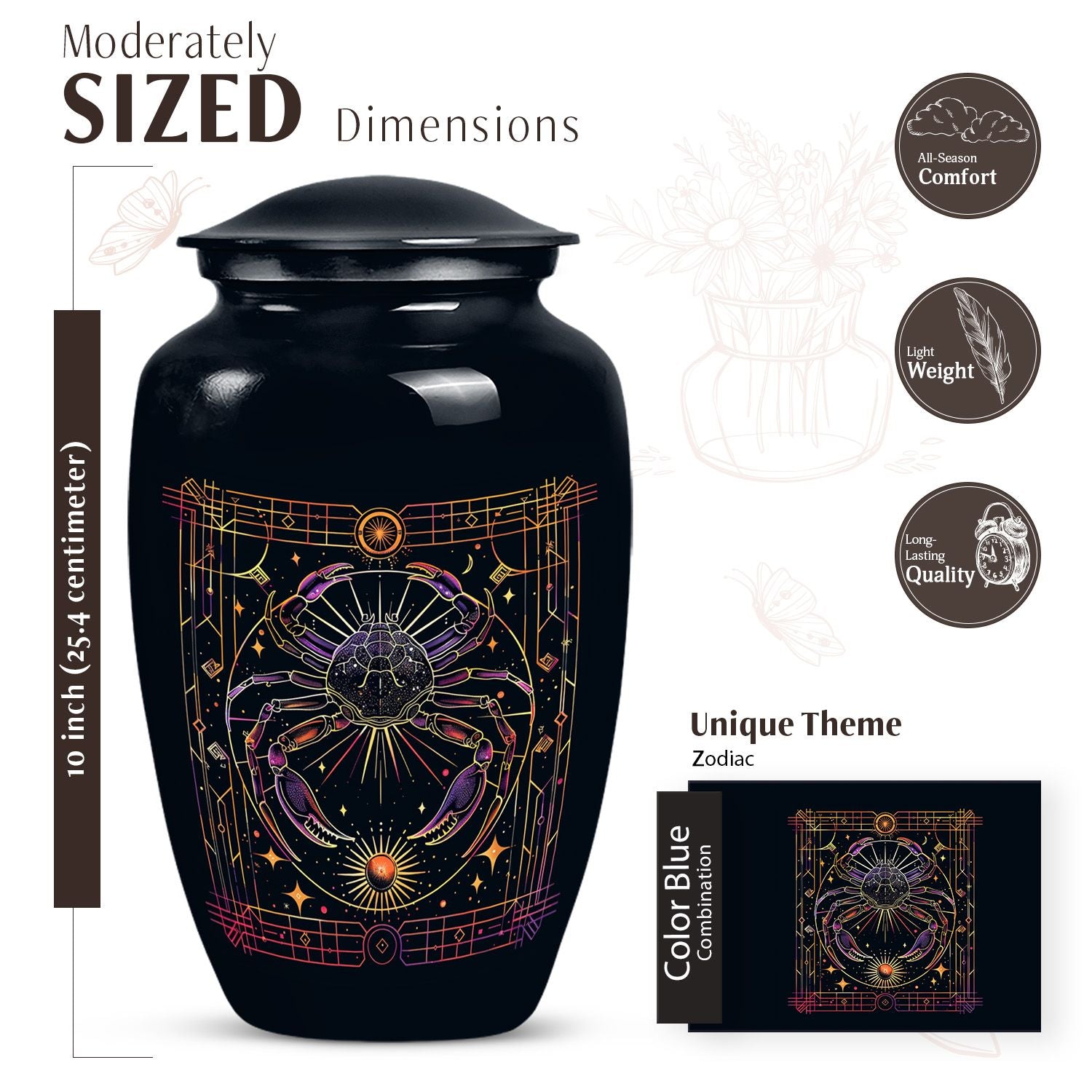 Cherish the memory of your loved ones with this elegantly crafted zodiac urn. As a part of our religious and ceremonial memorial ceremony supplies, this 10-inch abstract-themed urn has been designed diligently with a timeless classical silhouette that transcends fleeting trends, making it a unique choice amongst burial cremation urns. Made from robust aluminium, this large urn measures 10 inches in height, weighs 3.3 pounds and can comfortably hold up to 200 cubic inches of ashes. To further make this memorial urn personal and more poignant, there is an option for customization by engraving names. It comes with a soft velvet pouch, offering a respectful and dedicated containment for the ashes. While it's hard to bid adieu, our zodiac urn gracefully blends style and functionality, ensuring your dear ones rest in peace. Whether it's an adult female elegant urn in porcelain or a metal s urn for burial, this funeral urn for human ashes is a perfect choice for remembrance. Remember, the love, laughter, and life lived are what makes them unforgettable, and our quality urn secures and honours those memories.
