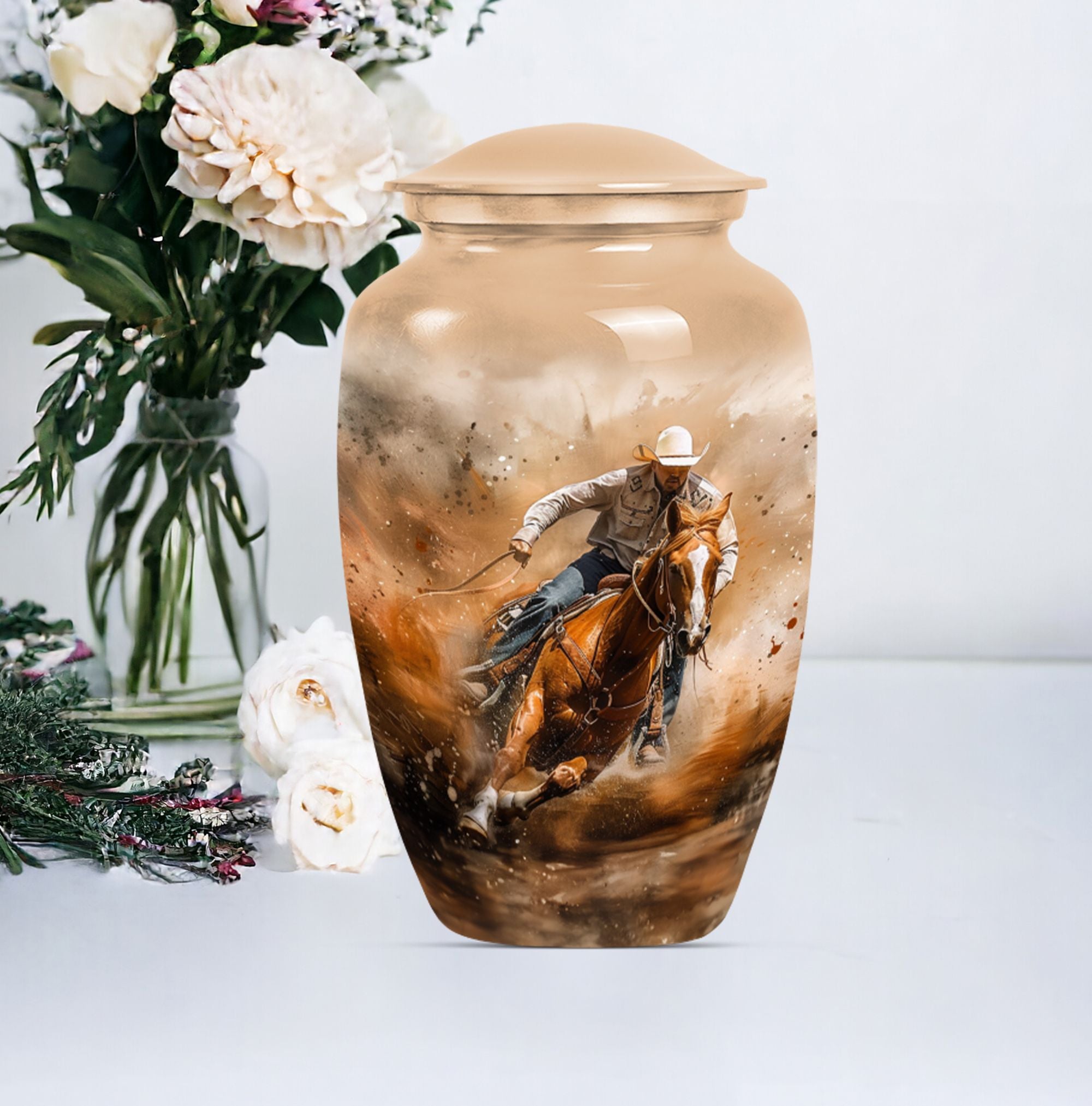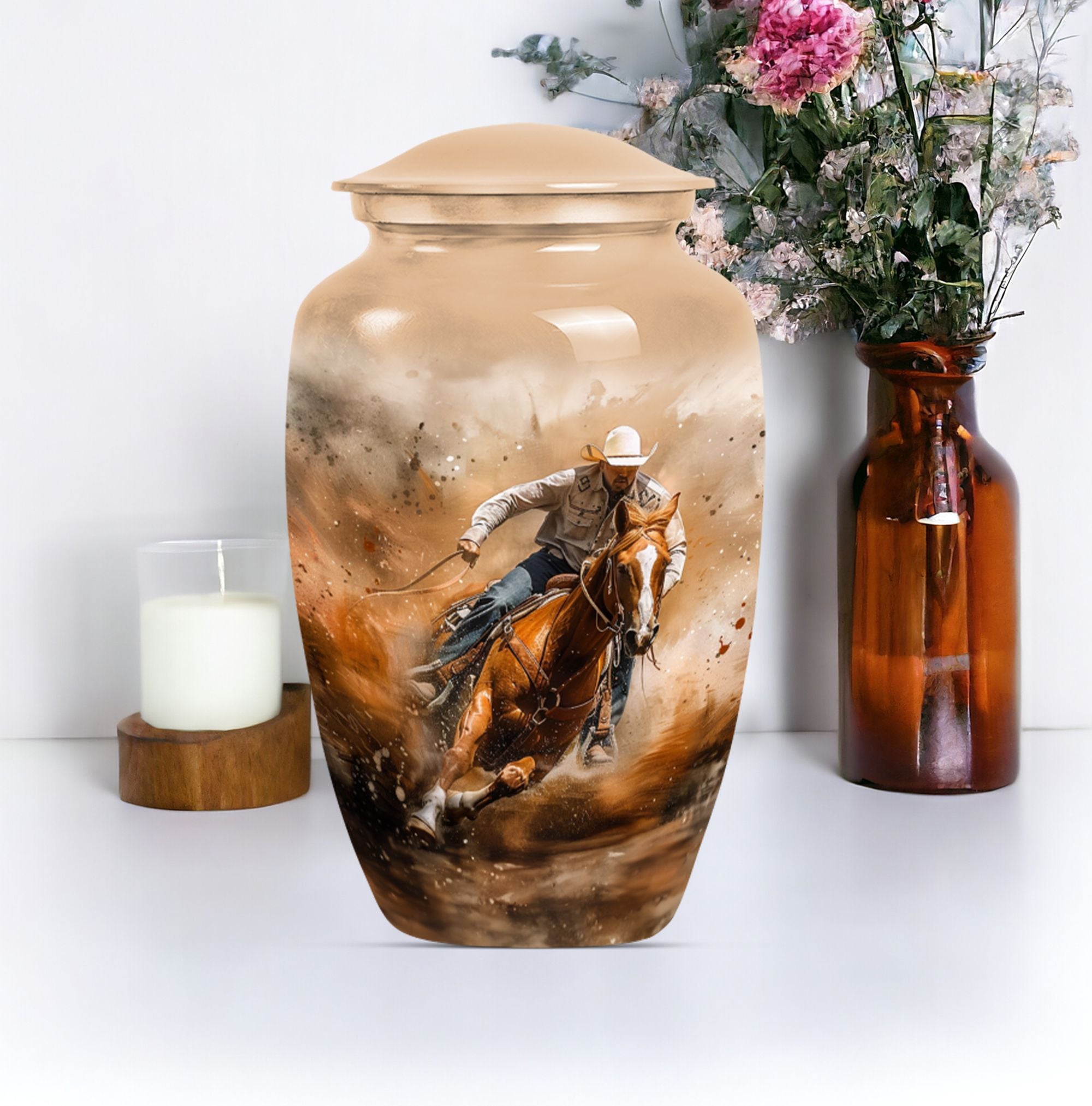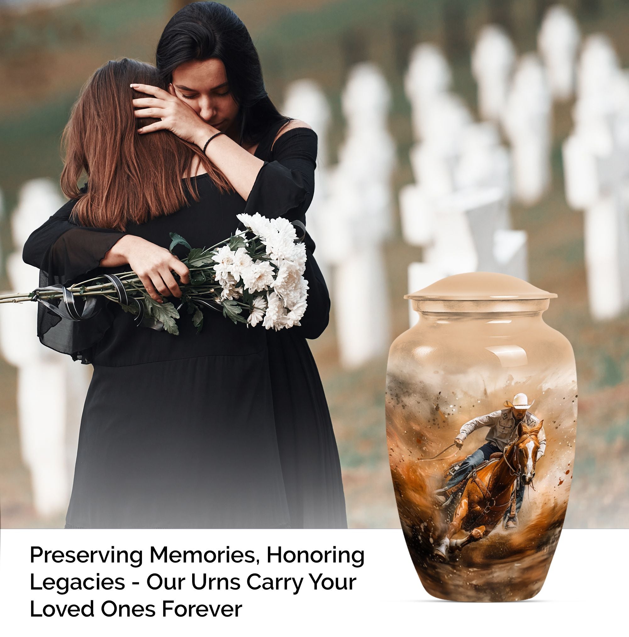 Immerse in the serenity of bid farewell to your beloved one with this sturdy 'Classic Cowboy Urn.' A large urn exquisitely crafted from strong Aluminium and weighing a comfortable 3.3 pounds, its design conveys a sense of solemn respect and peace. Our 10-inch cremation urn is perfect for adult males, with the capacity to house up to 200 cubic inches of ashes. Adding a personalized touch to this solemn remembrance, we offer the option to have names engraved, making it uniquely yours. Wrapped securely in a plush velvet pouch, the Classic Cowboy Urn ensures a dignified home for the keepsake of your loved one. This urn stands out not just as a memorial urn for adult male ashes but also as an urn for human ashes for two adults. Adorned with a delicate butterfly theme, it serves as an enduring symbol of the soul's transformation and continuation of the journey beyond. Our cremation urn is an elegant tribute and a comforting reminder of your love. Perfect for those in search of cremation urns for men.