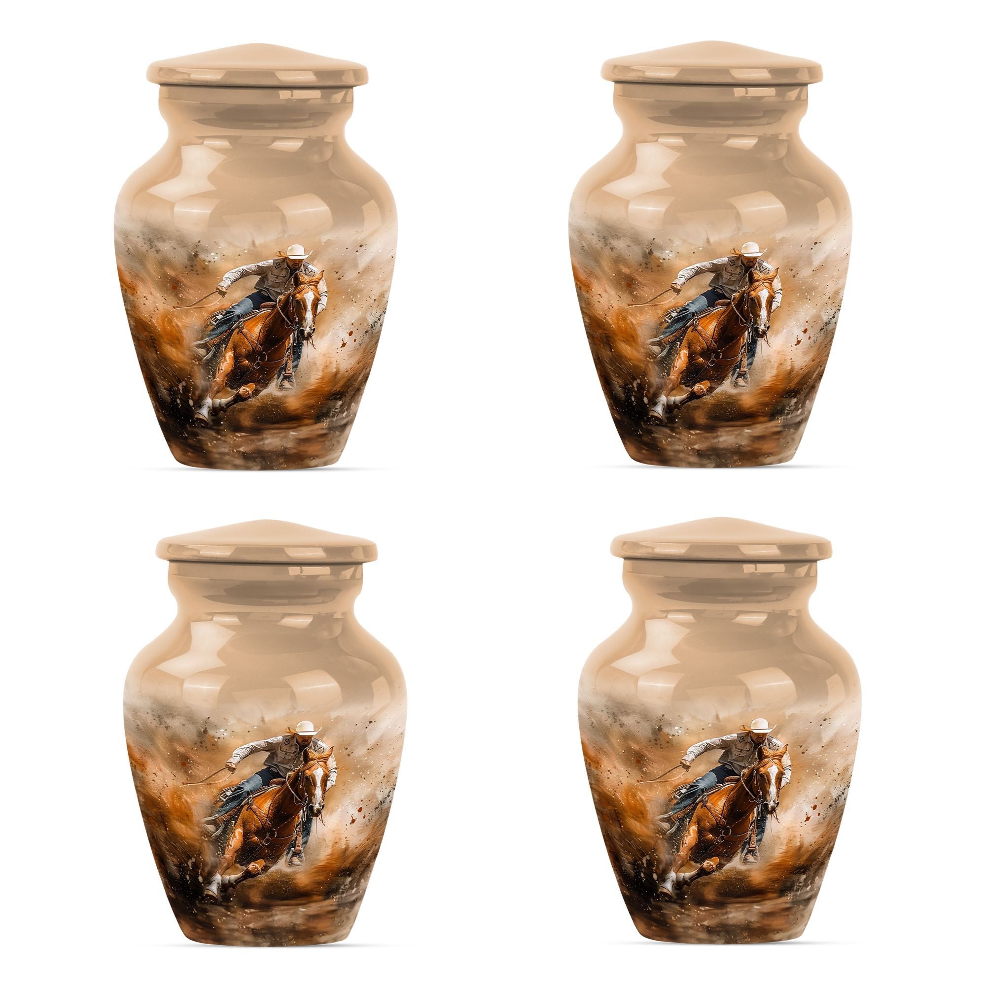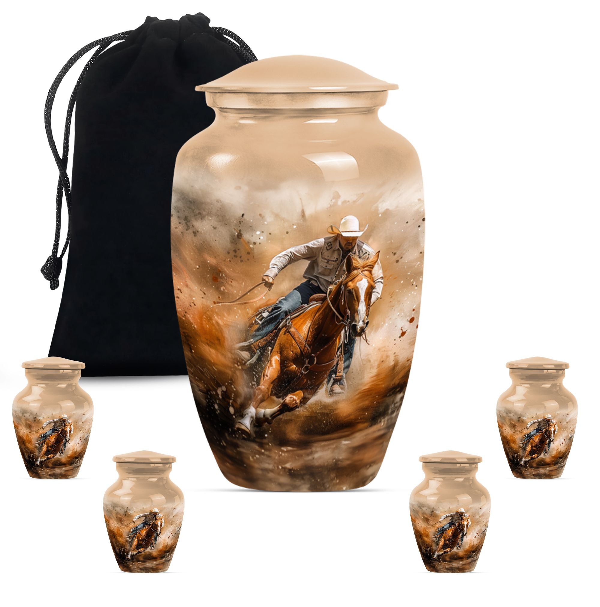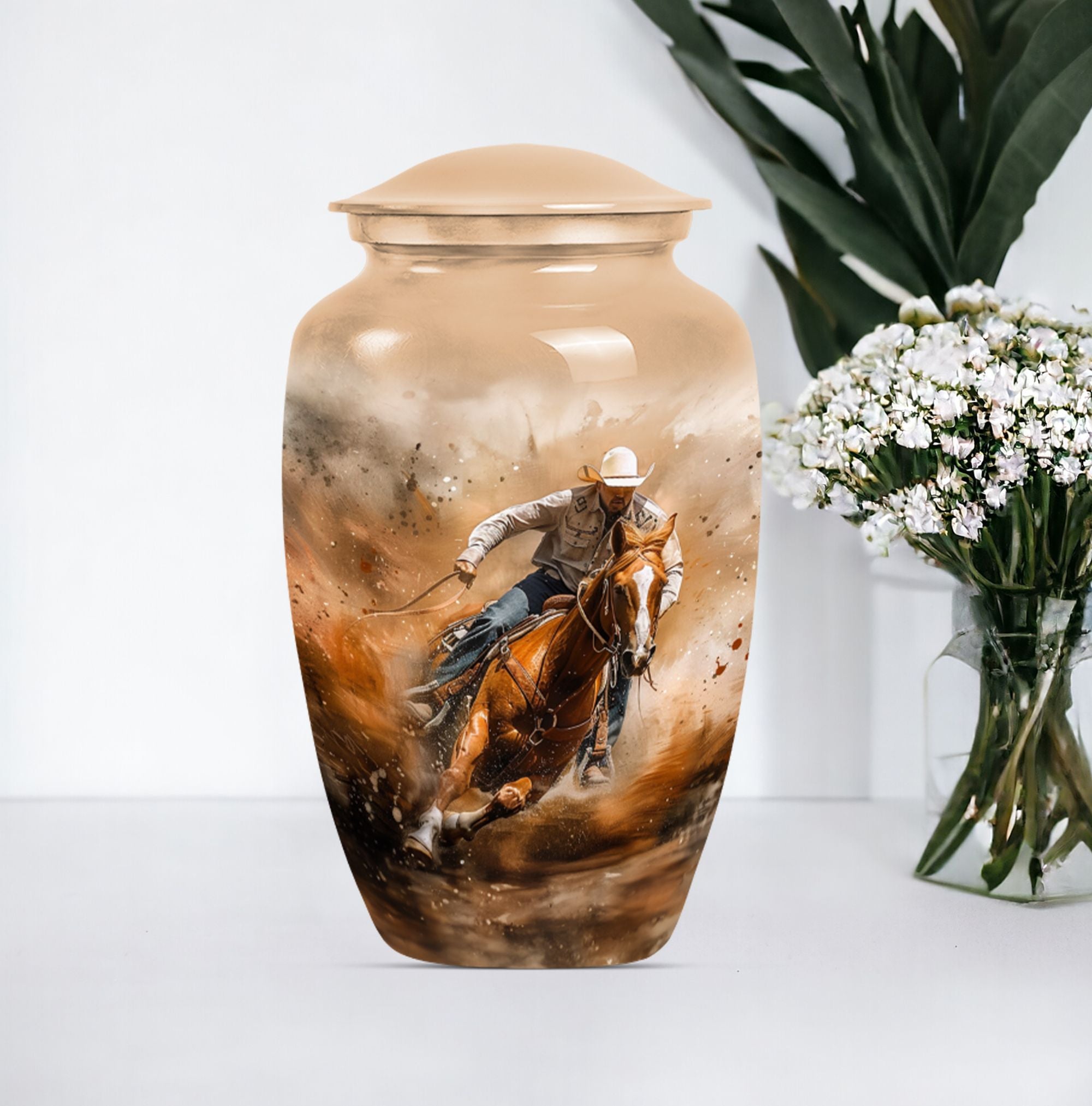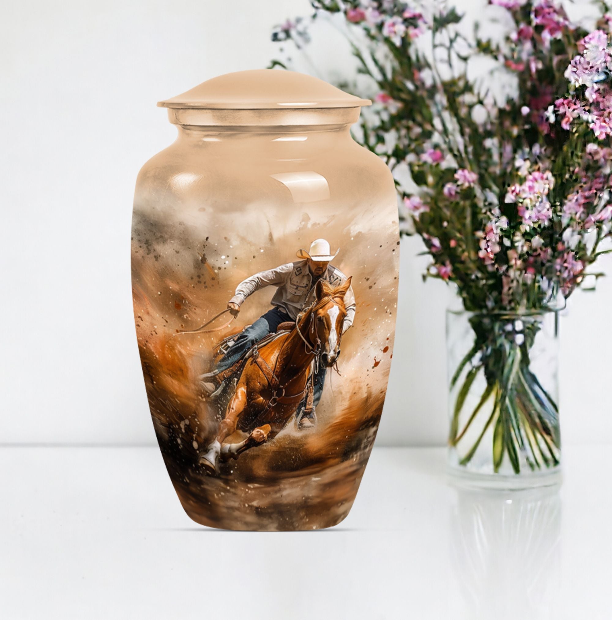 Immerse in the serenity of bid farewell to your beloved one with this sturdy 'Classic Cowboy Urn.' A large urn exquisitely crafted from strong Aluminium and weighing a comfortable 3.3 pounds, its design conveys a sense of solemn respect and peace. Our 10-inch cremation urn is perfect for adult males, with the capacity to house up to 200 cubic inches of ashes. Adding a personalized touch to this solemn remembrance, we offer the option to have names engraved, making it uniquely yours. Wrapped securely in a plush velvet pouch, the Classic Cowboy Urn ensures a dignified home for the keepsake of your loved one. This urn stands out not just as a memorial urn for adult male ashes but also as an urn for human ashes for two adults. Adorned with a delicate butterfly theme, it serves as an enduring symbol of the soul's transformation and continuation of the journey beyond. Our cremation urn is an elegant tribute and a comforting reminder of your love. Perfect for those in search of cremation urns for men.
