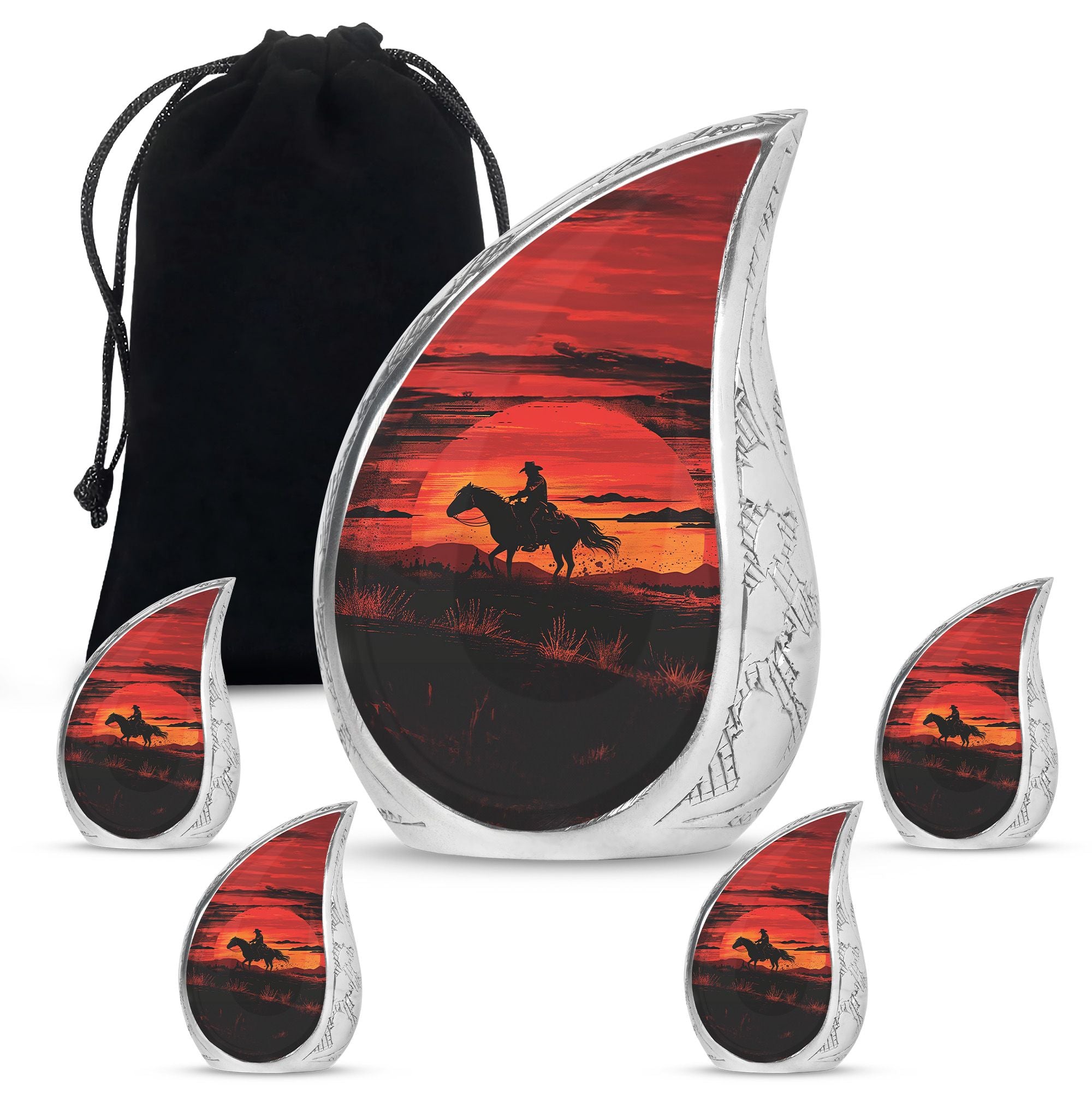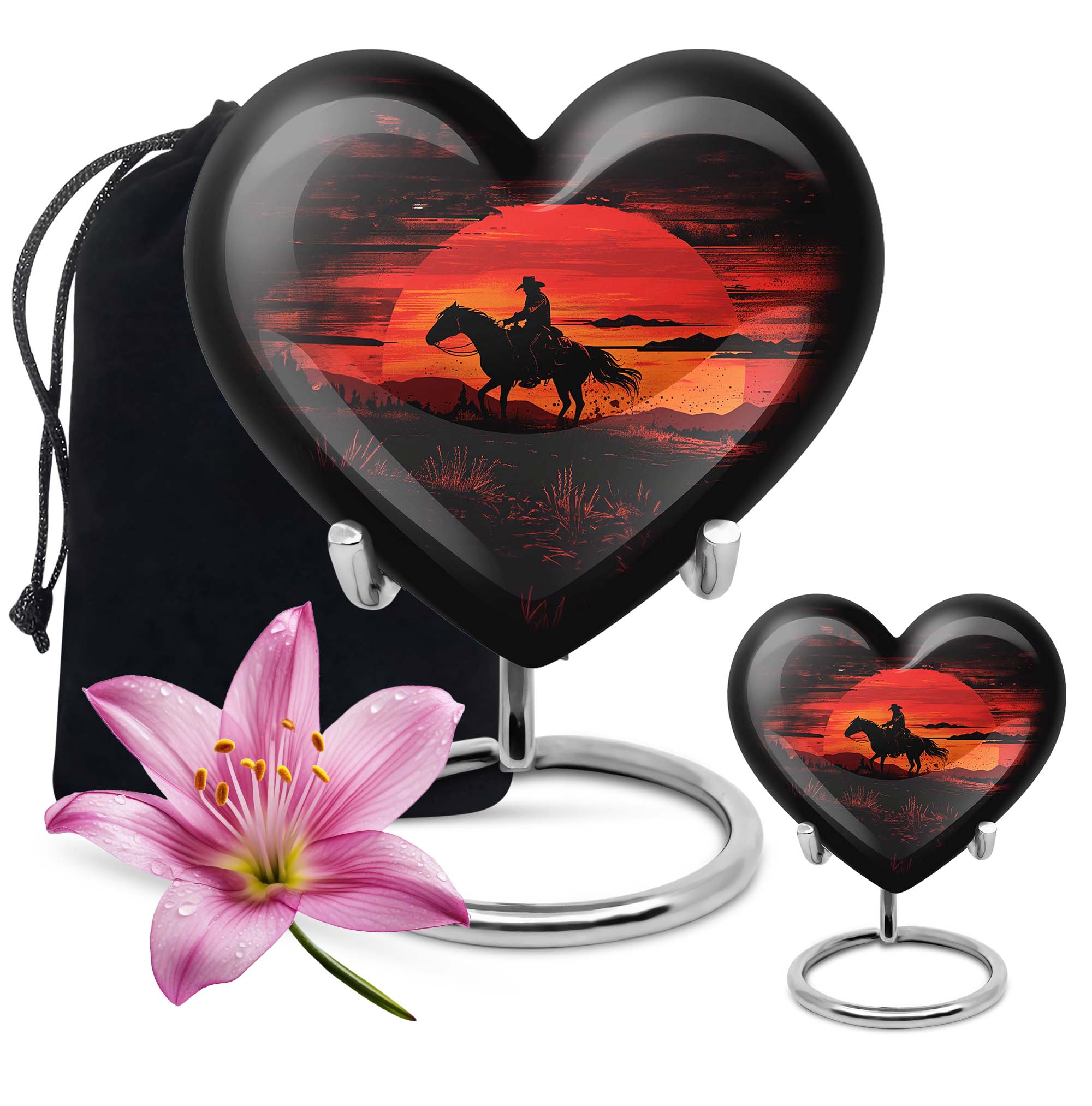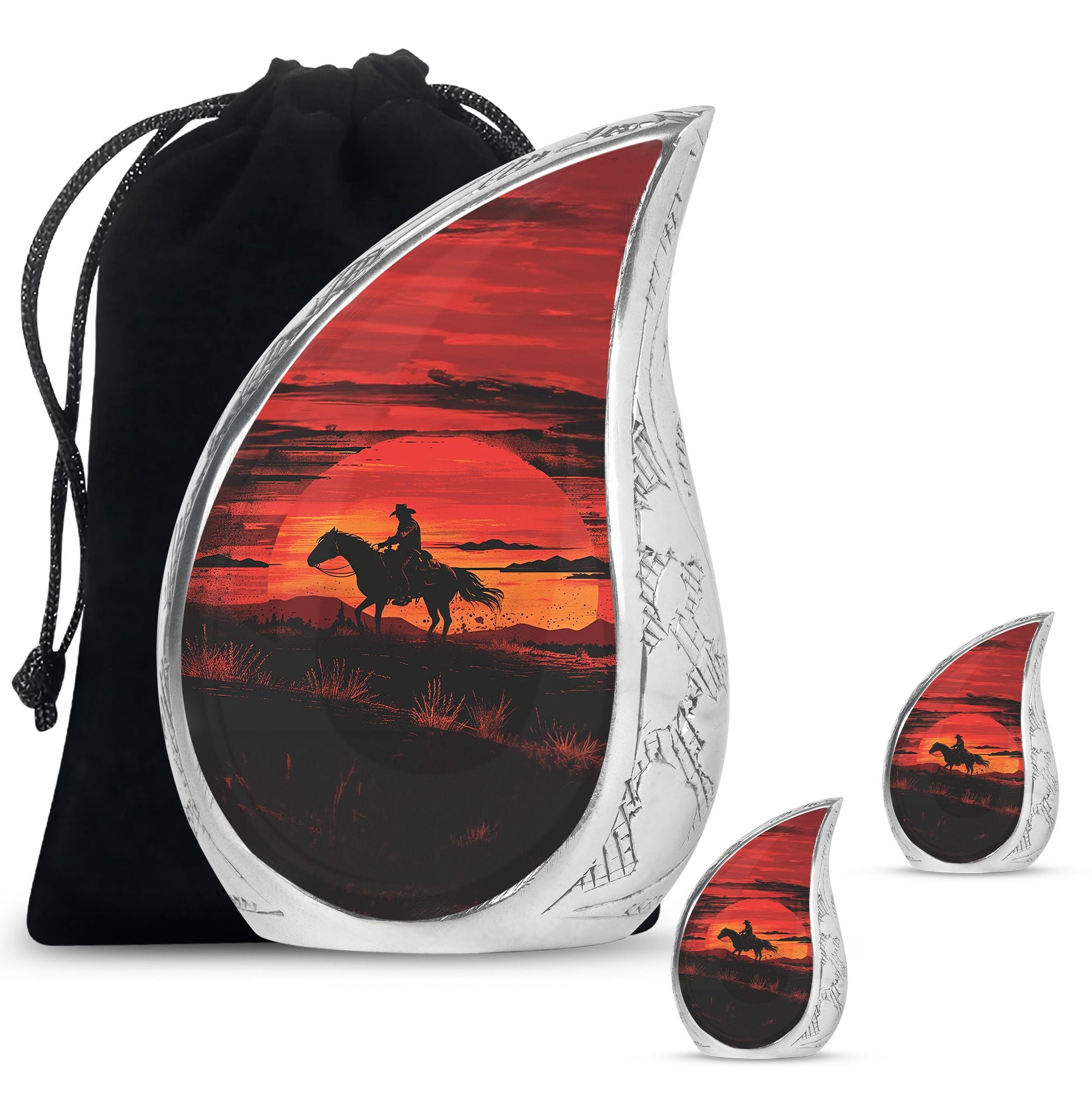 A life lived with courage, strength, and independence deserves a tribute that reflects those values. Our Cowboy cremation urns for ashes for man with a sunset keepsake combo is designed to honor cherished memories with dignity. Whether chosen as a large urn for ashes adult male, large urn for ashes for women, or a family memorial, this set provides both a full-size urn and a matching keepsake to share among loved ones.