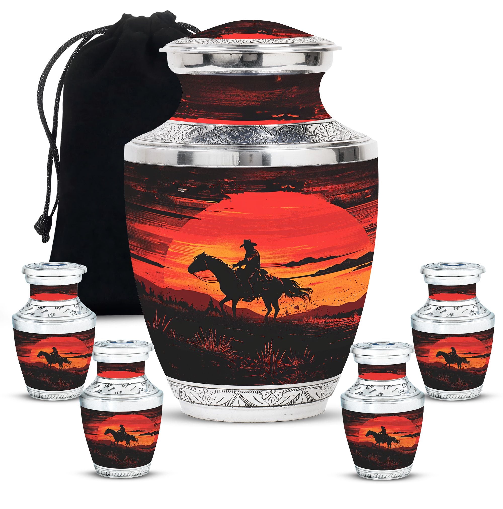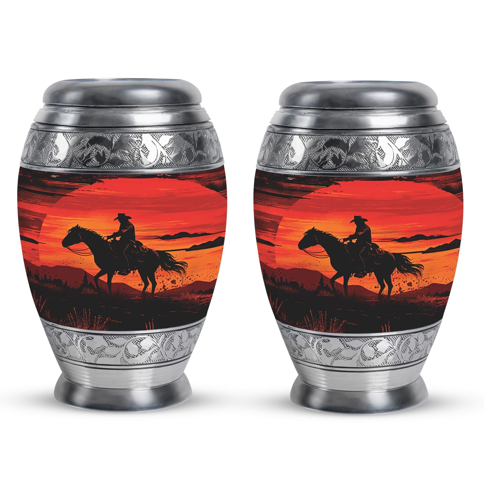 Handcrafted from durable aluminum, this urn set offers both strength and elegance. The rich sunset cowboy design symbolizes resilience, freedom, and love, making it a meaningful tribute for fathers, mothers, or any family member. The large cremation urn holds the full capacity of adult remains, while the smaller keepsake urn allows families to preserve a portion of ashes as a personal remembrance. With secure screw-top lids, both urns provide safety and peace of mind. Whether you are seeking large urns for human ashes adult female, urns for ashes adult male large, or simply a large human ashes urn with timeless design, this combo offers versatility and comfort.