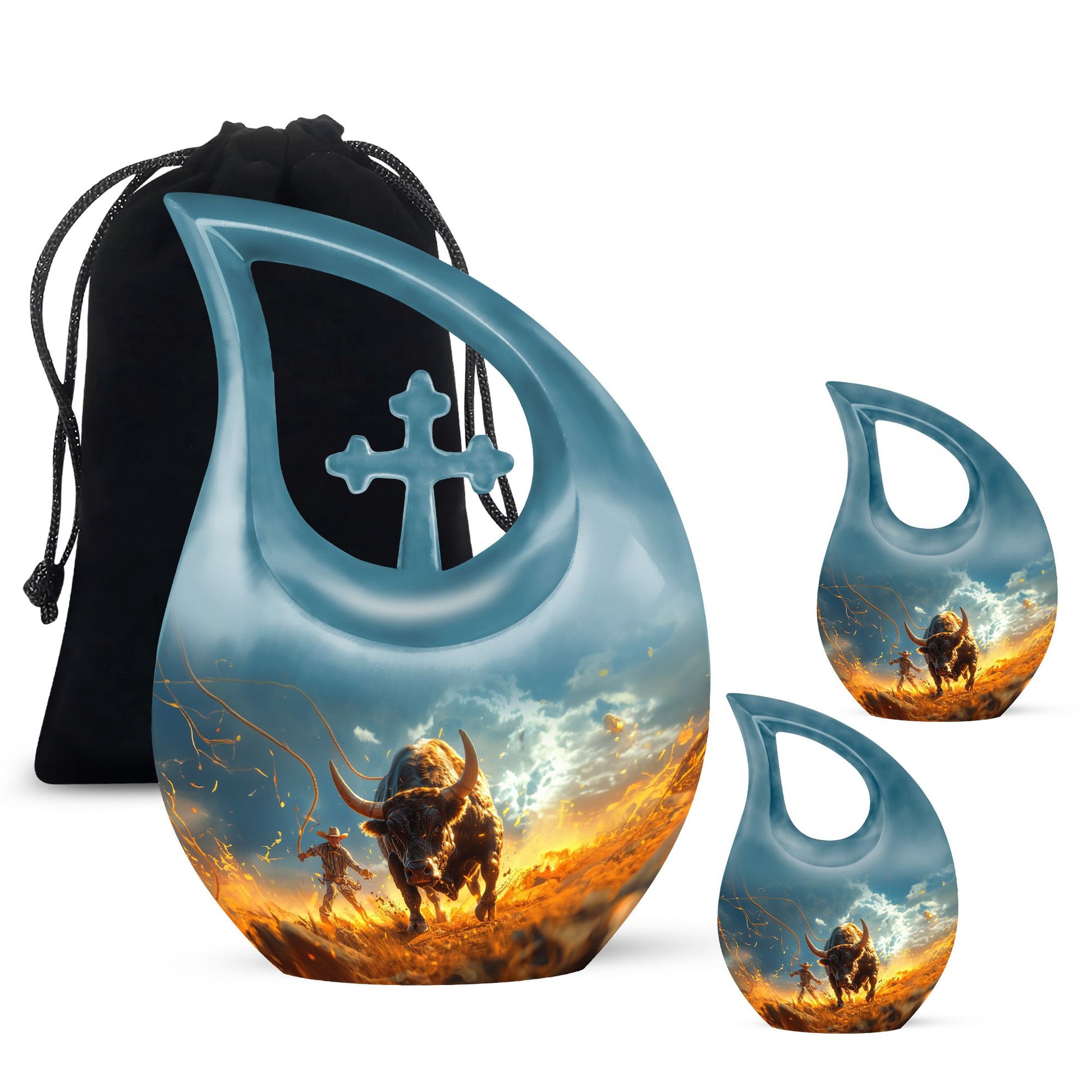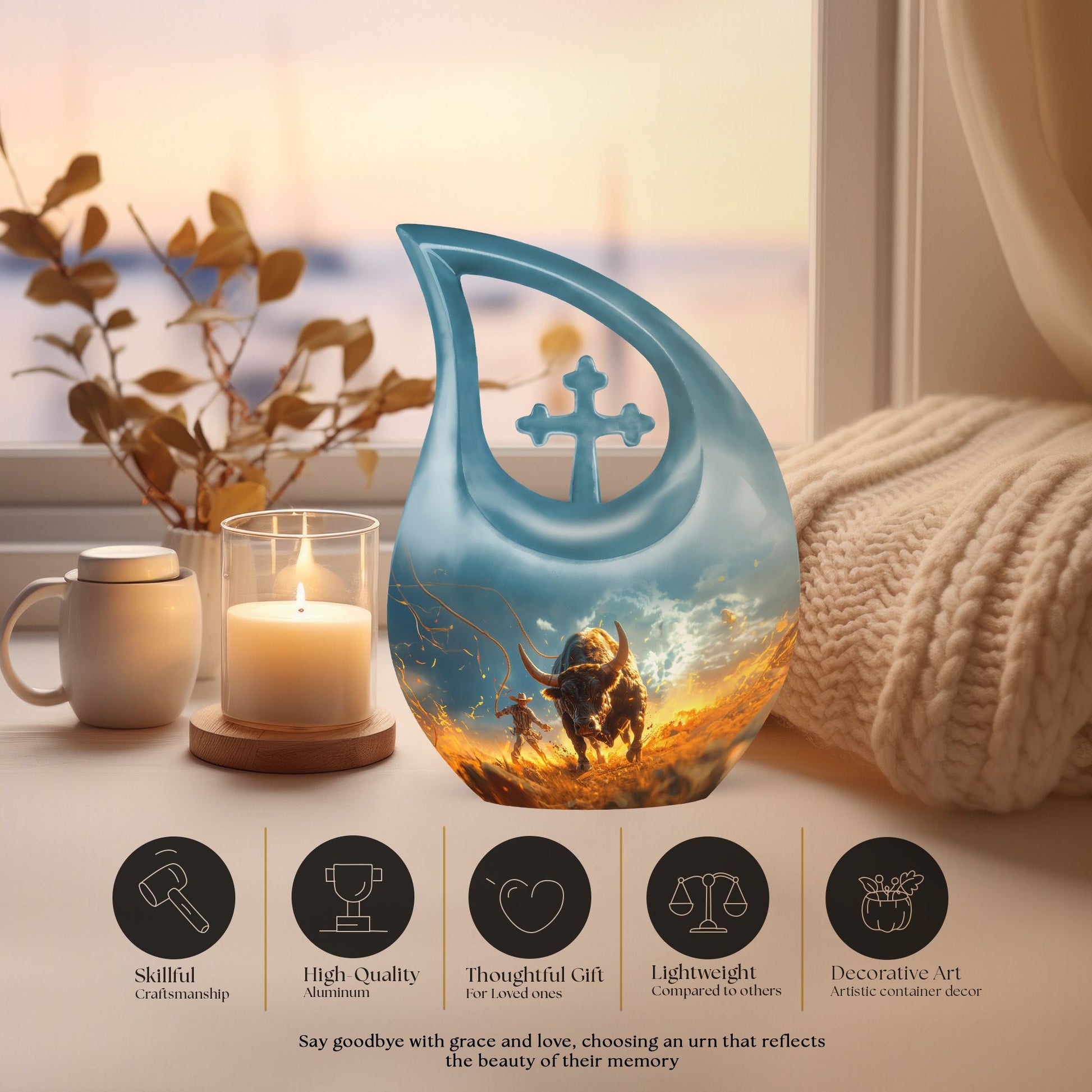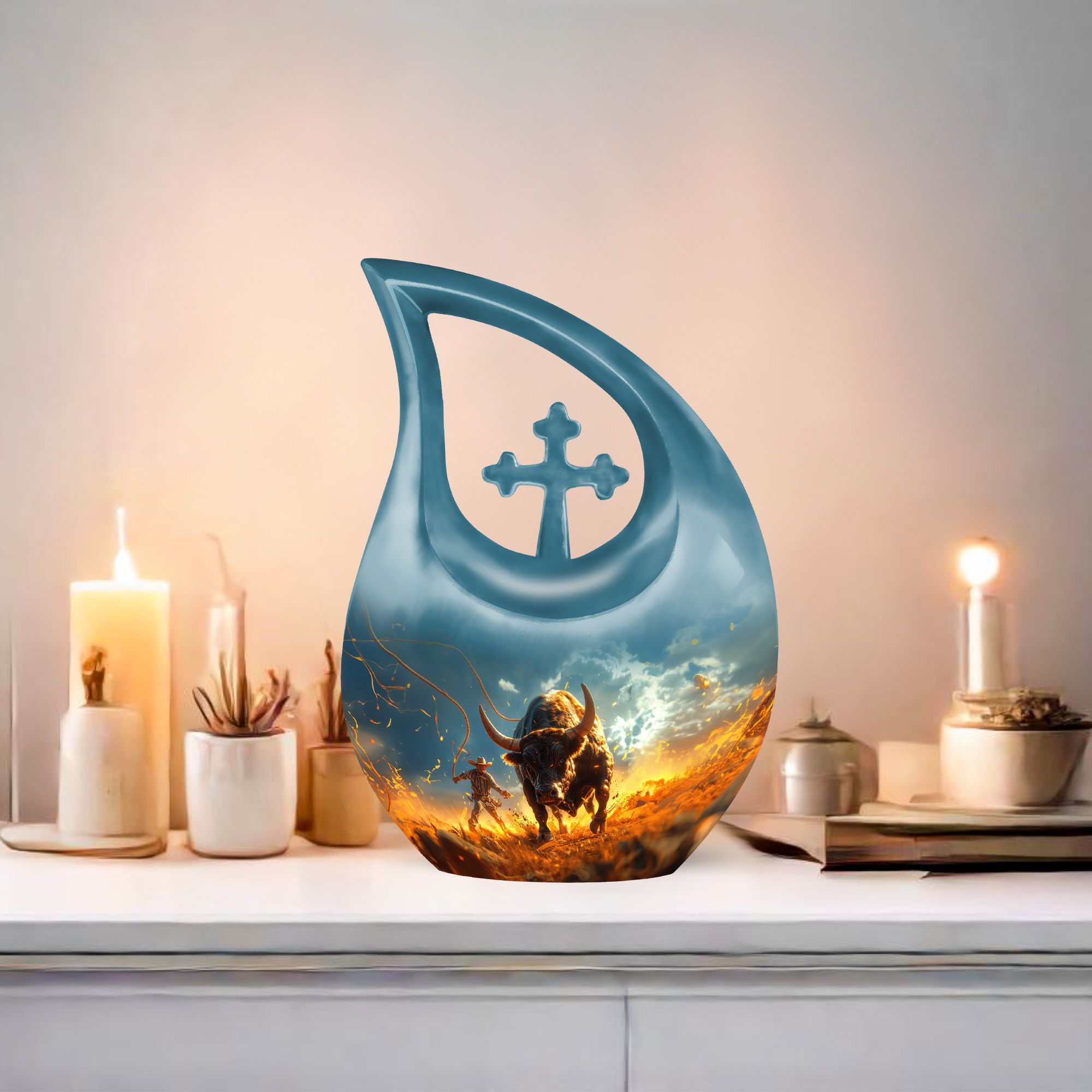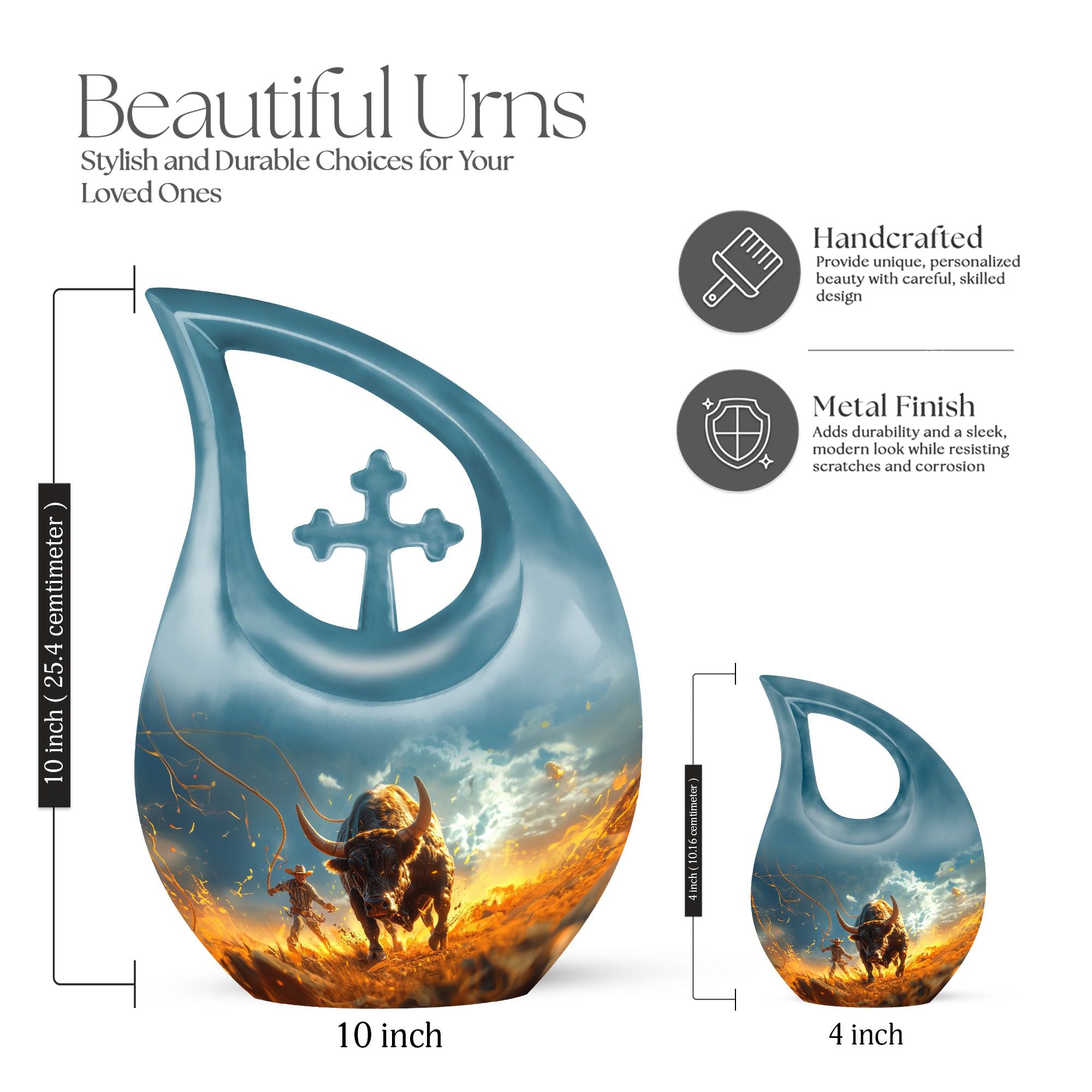 Expertly handcrafted from high-quality aluminum, this adult funeral urn features a captivating sky-blue finish with a detailed bull-riding design — a true representation of bravery and passion. Its smooth surface and secure screw-top lid ensure ashes remain safely preserved. The urn comes in both large and small options, allowing families to pair a mini keepsake funeral urn with a main funeral urn adult for shared remembrance.