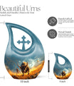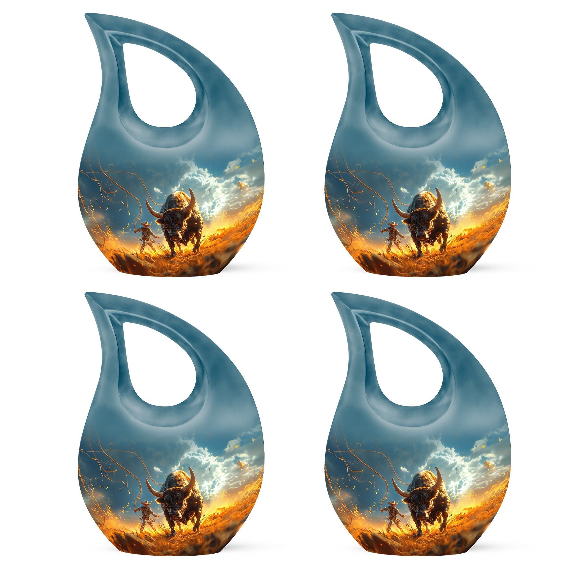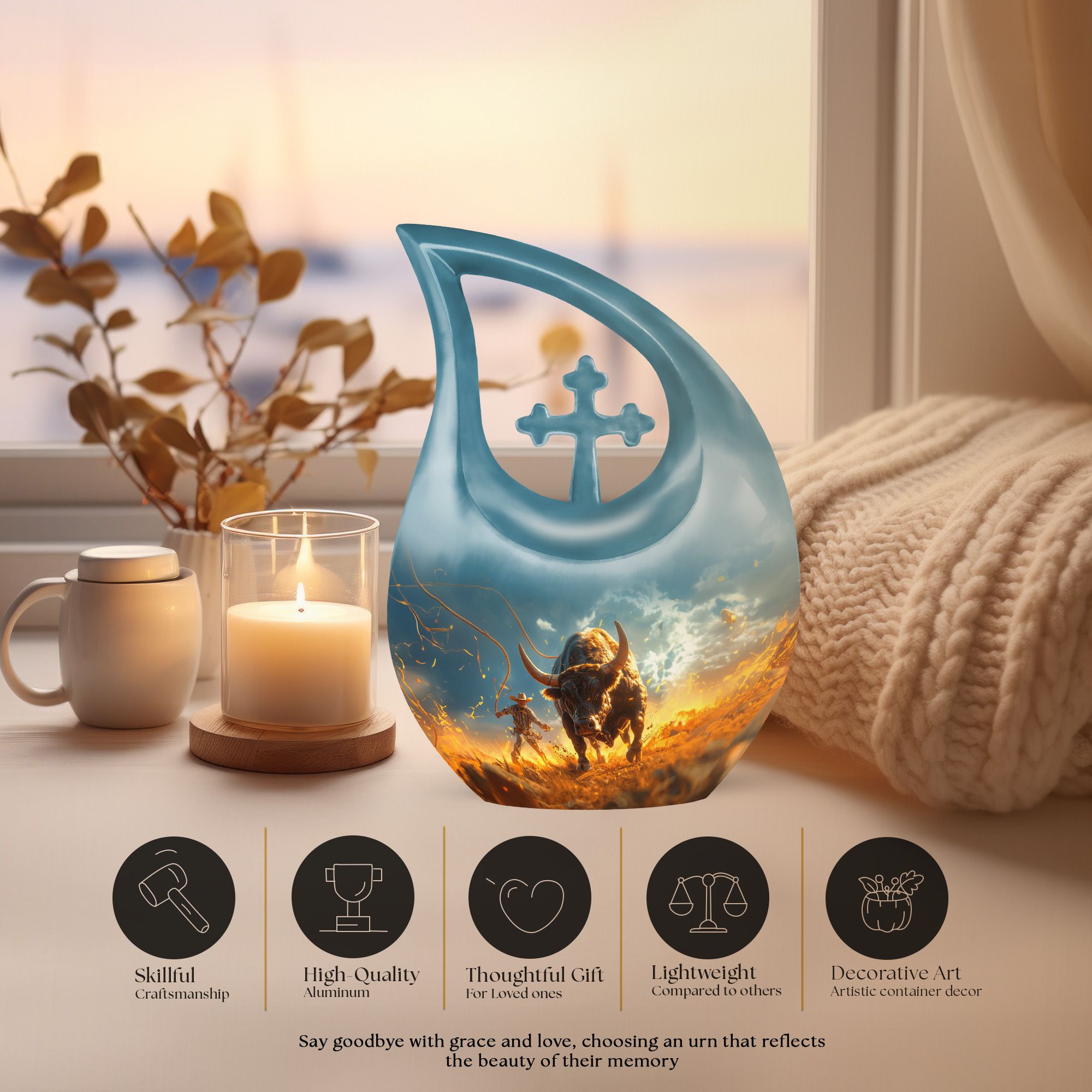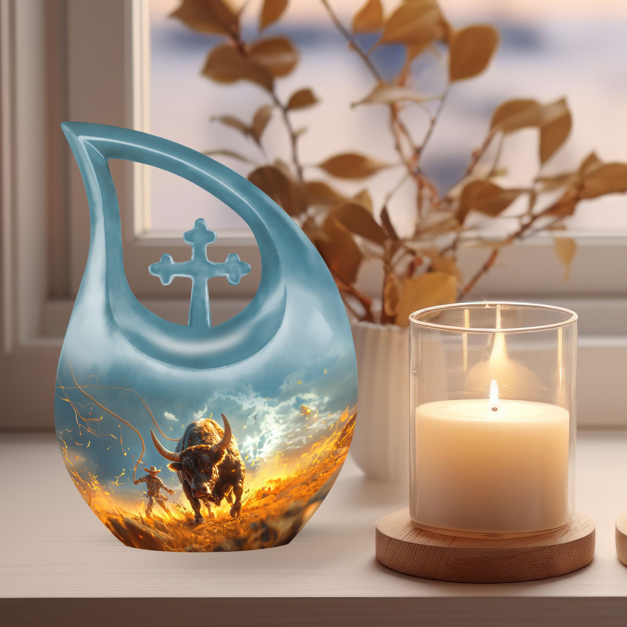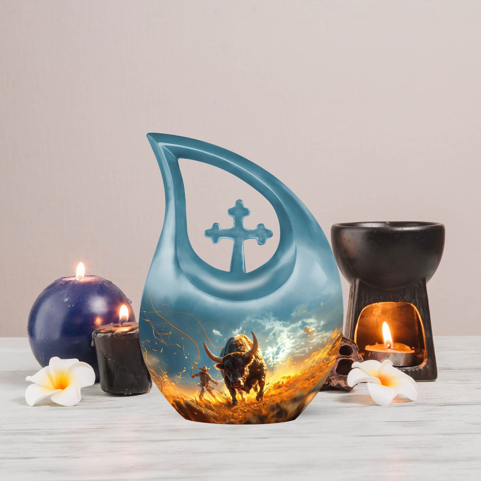 Expertly handcrafted from high-quality aluminum, this adult funeral urn features a captivating sky-blue finish with a detailed bull-riding design — a true representation of bravery and passion. Its smooth surface and secure screw-top lid ensure ashes remain safely preserved. The urn comes in both large and small options, allowing families to pair a mini keepsake funeral urn with a main funeral urn adult for shared remembrance.