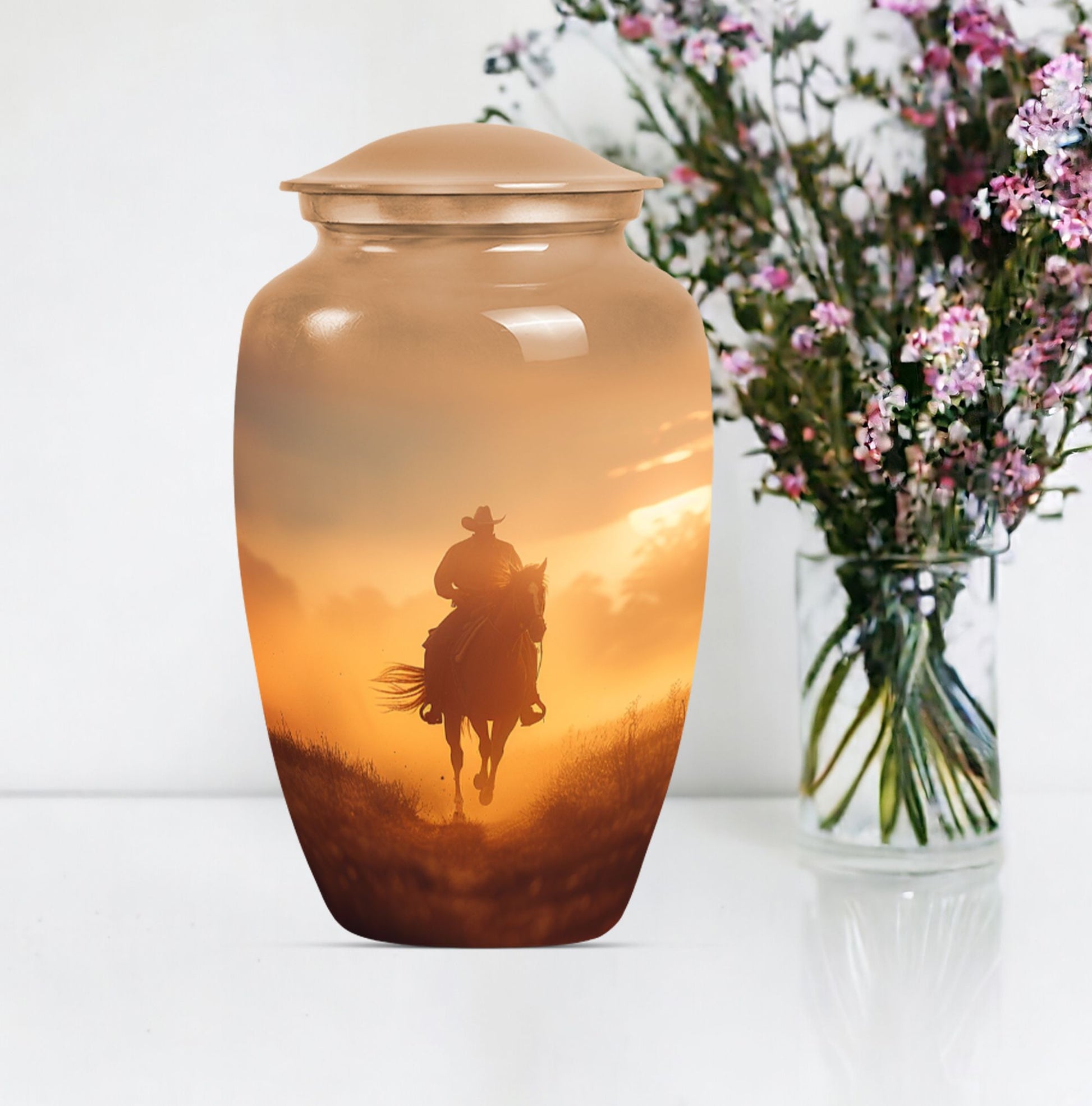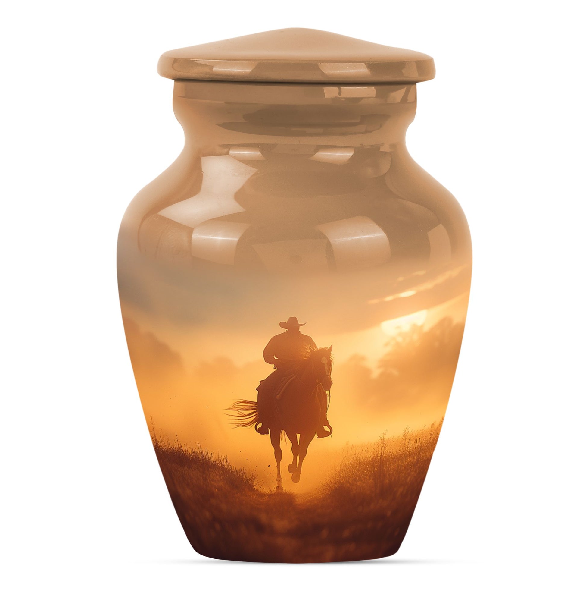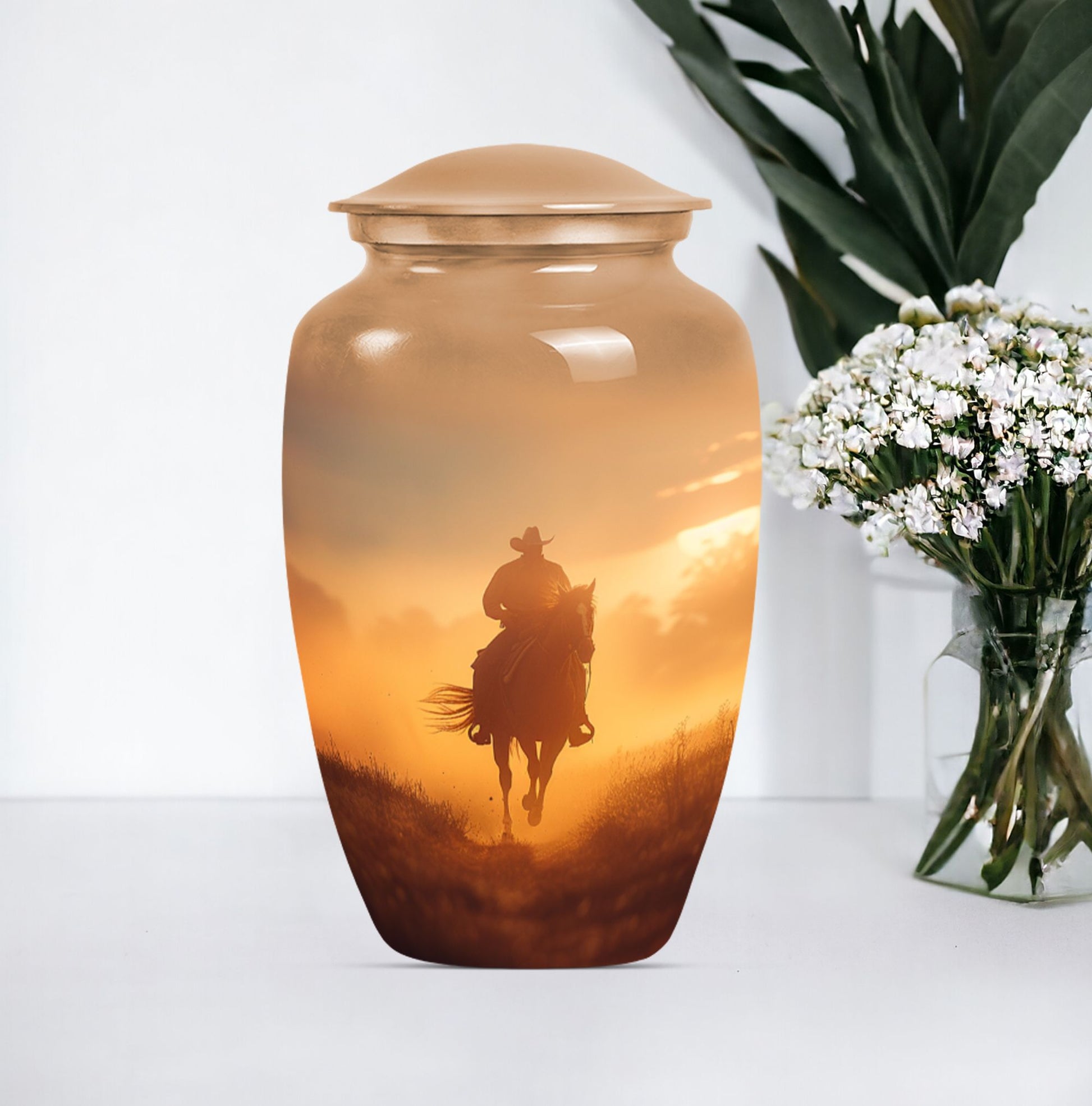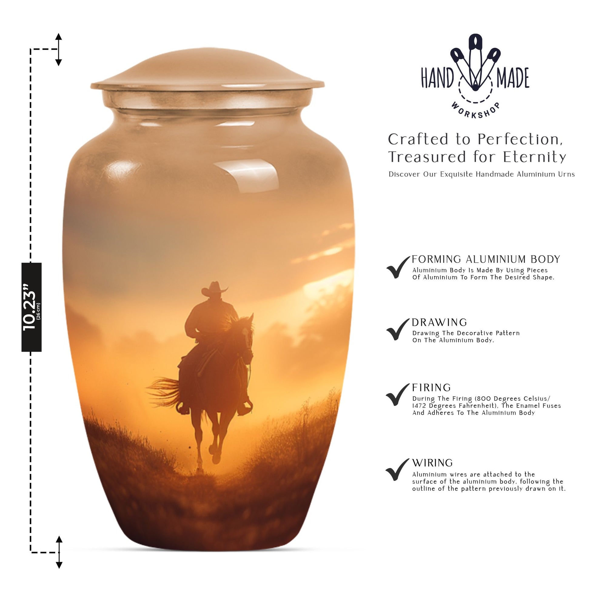 Honor the memory of your loved ones in a dignified and ceremonial way with our uniquely crafted 10-inch size Cowboy Urn. This memorial medium urn is made with durable aluminium, offering resilience along with elegance. Weighing 3.3 pounds, this classic Urn is engineered to a high standard, making it a lasting tribute to those who have passed. With a generous capacity of 200 cubic inches, it can comfortably hold the ashes of an adult. The urn features a simple, yet timeless butterfly theme appealing to the serene nature of remembrance. Additionally, for a more personalized experience, you can opt to engrave names on the urn. To safeguard your cherished memories, the urn comes with a velvet pouch making it ideal for containment of ashes. Often searched for as burial urns for human ashes adult or cremation urns, it functions beyond a storage unit; rather, it's a solemn dedication to the ones lost. Searchers of human ash urn adult ash woman, cremation urns for burial or cremation urn for dad will find this urn to be a perfect fit. Commemorate life and love with this beautifully designed Cowboy urn.
