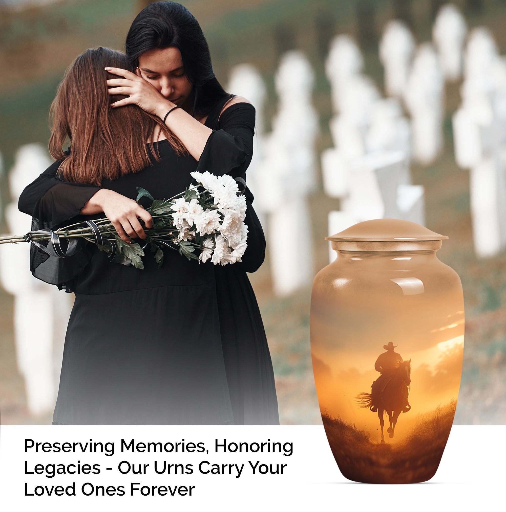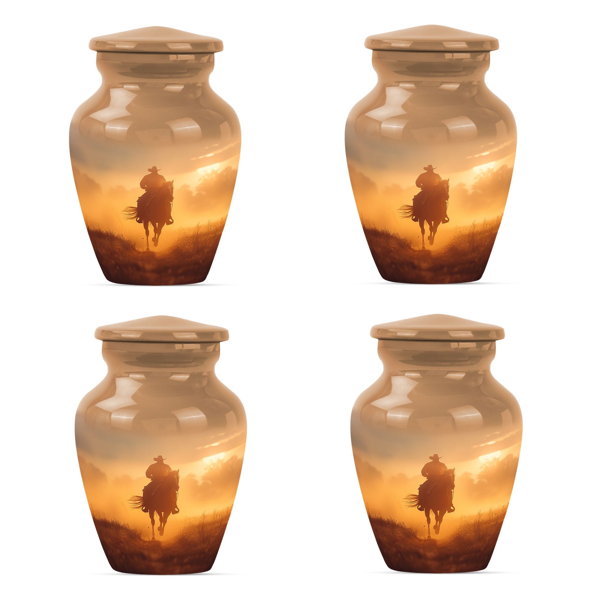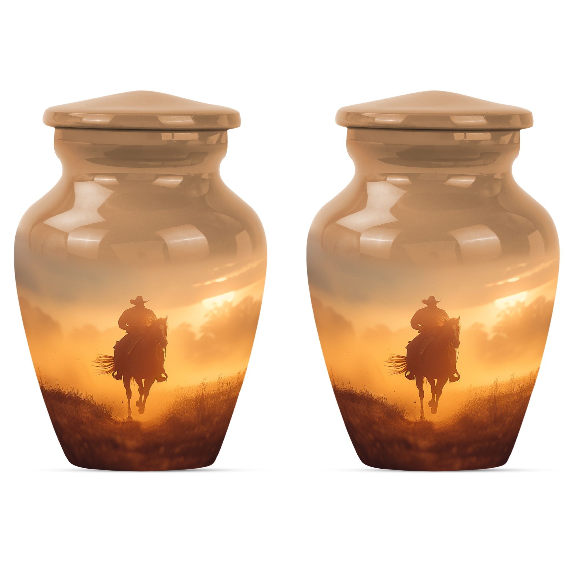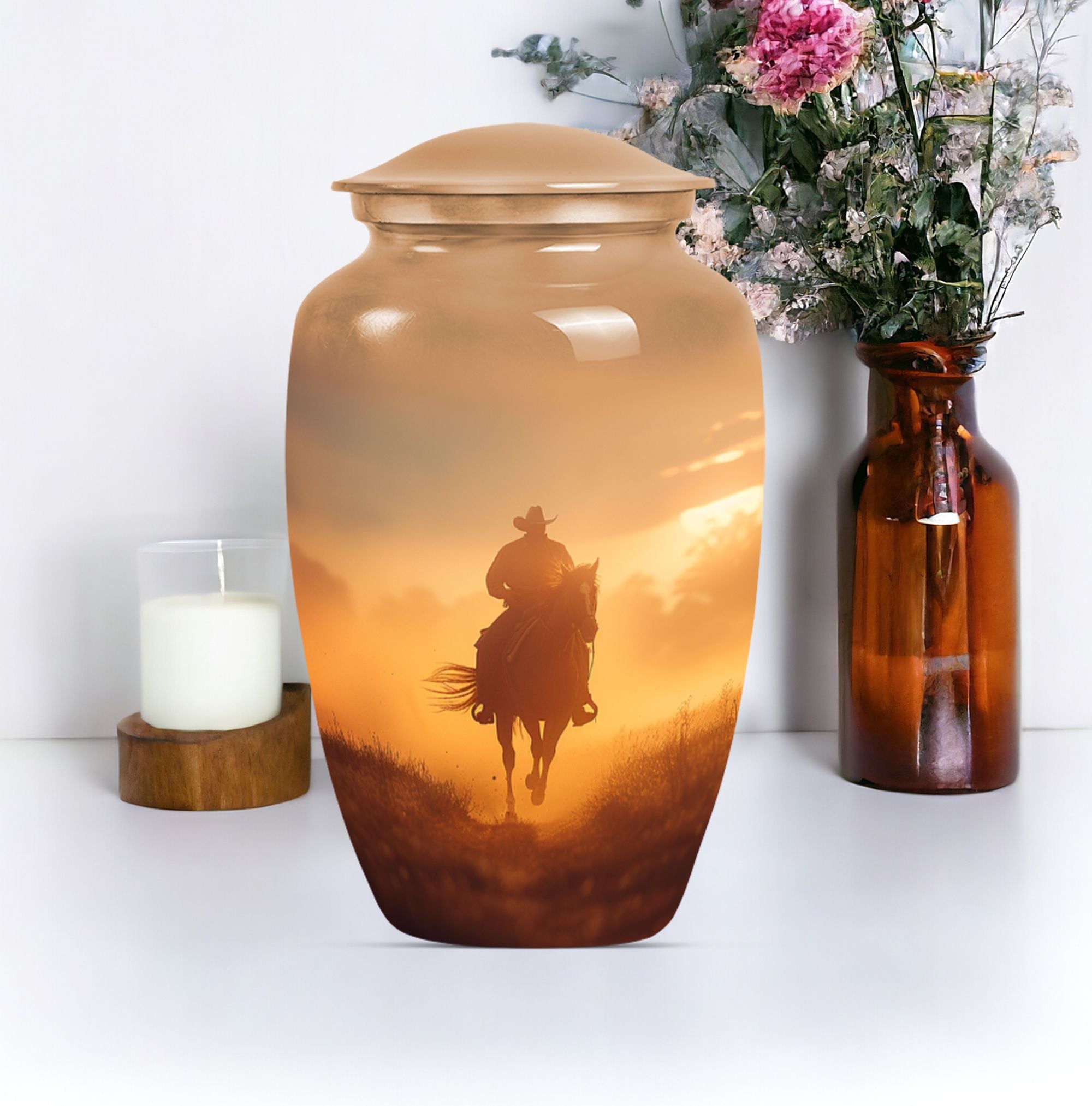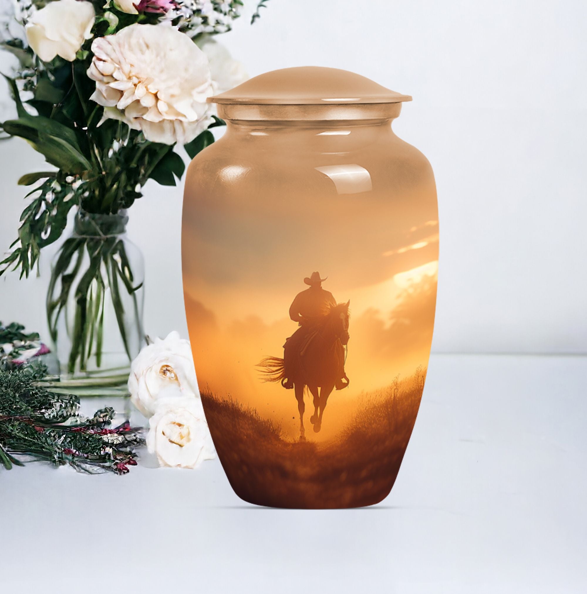 Honor the memory of your loved ones in a dignified and ceremonial way with our uniquely crafted 10-inch size Cowboy Urn. This memorial medium urn is made with durable aluminium, offering resilience along with elegance. Weighing 3.3 pounds, this classic Urn is engineered to a high standard, making it a lasting tribute to those who have passed. With a generous capacity of 200 cubic inches, it can comfortably hold the ashes of an adult. The urn features a simple, yet timeless butterfly theme appealing to the serene nature of remembrance. Additionally, for a more personalized experience, you can opt to engrave names on the urn. To safeguard your cherished memories, the urn comes with a velvet pouch making it ideal for containment of ashes. Often searched for as burial urns for human ashes adult or cremation urns, it functions beyond a storage unit; rather, it's a solemn dedication to the ones lost. Searchers of human ash urn adult ash woman, cremation urns for burial or cremation urn for dad will find this urn to be a perfect fit. Commemorate life and love with this beautifully designed Cowboy urn.