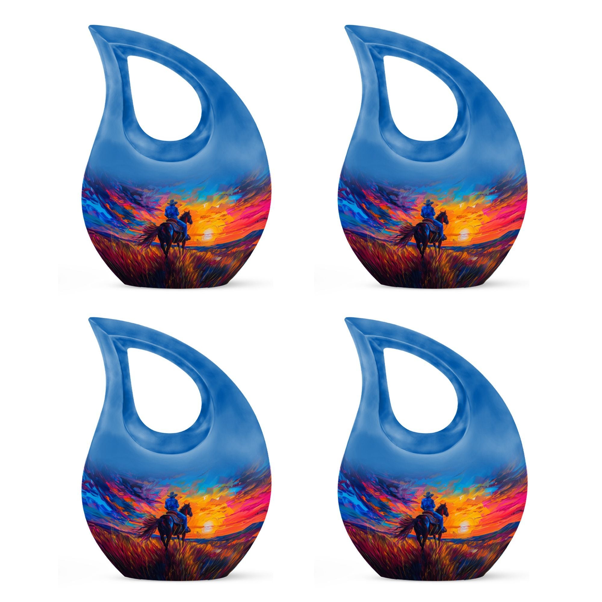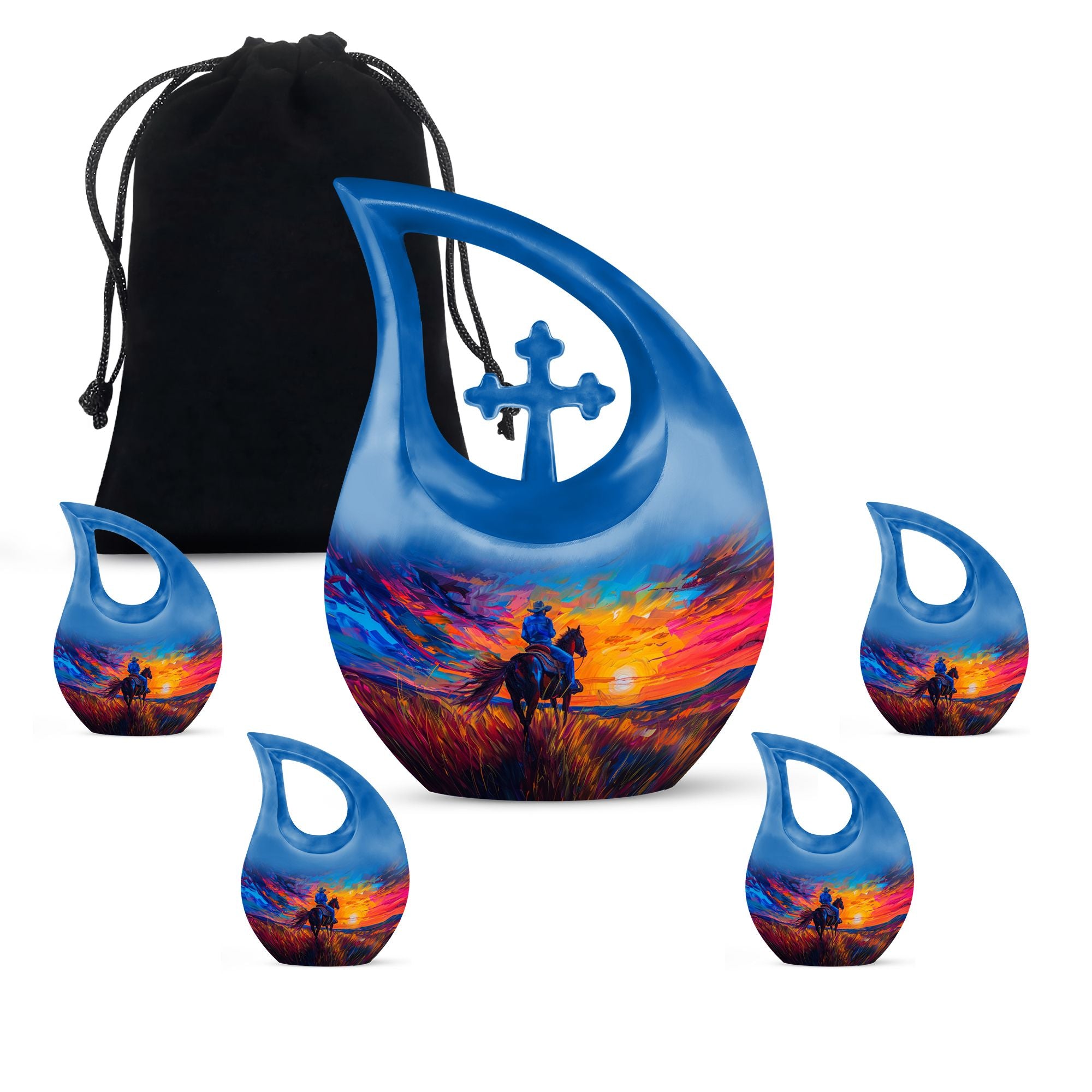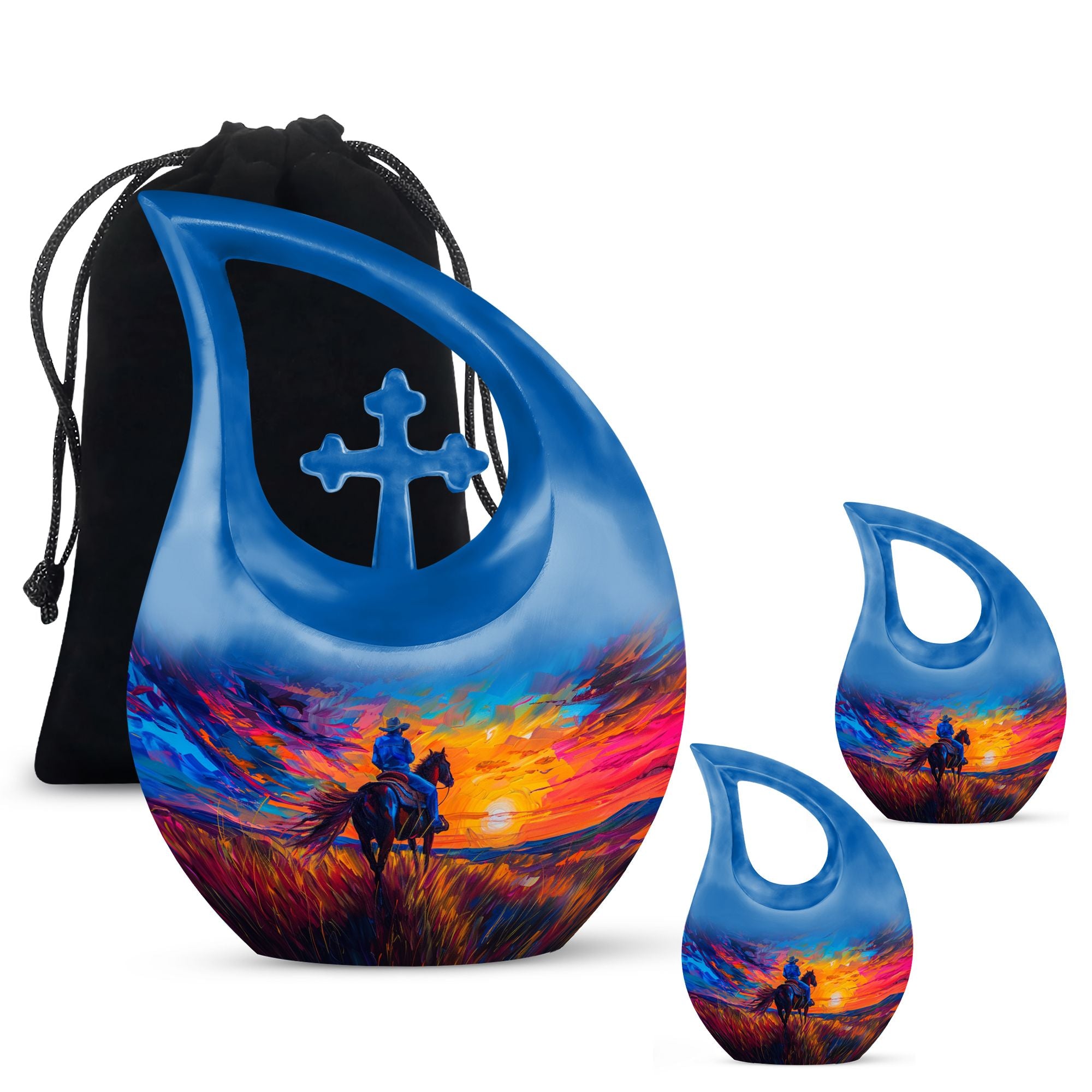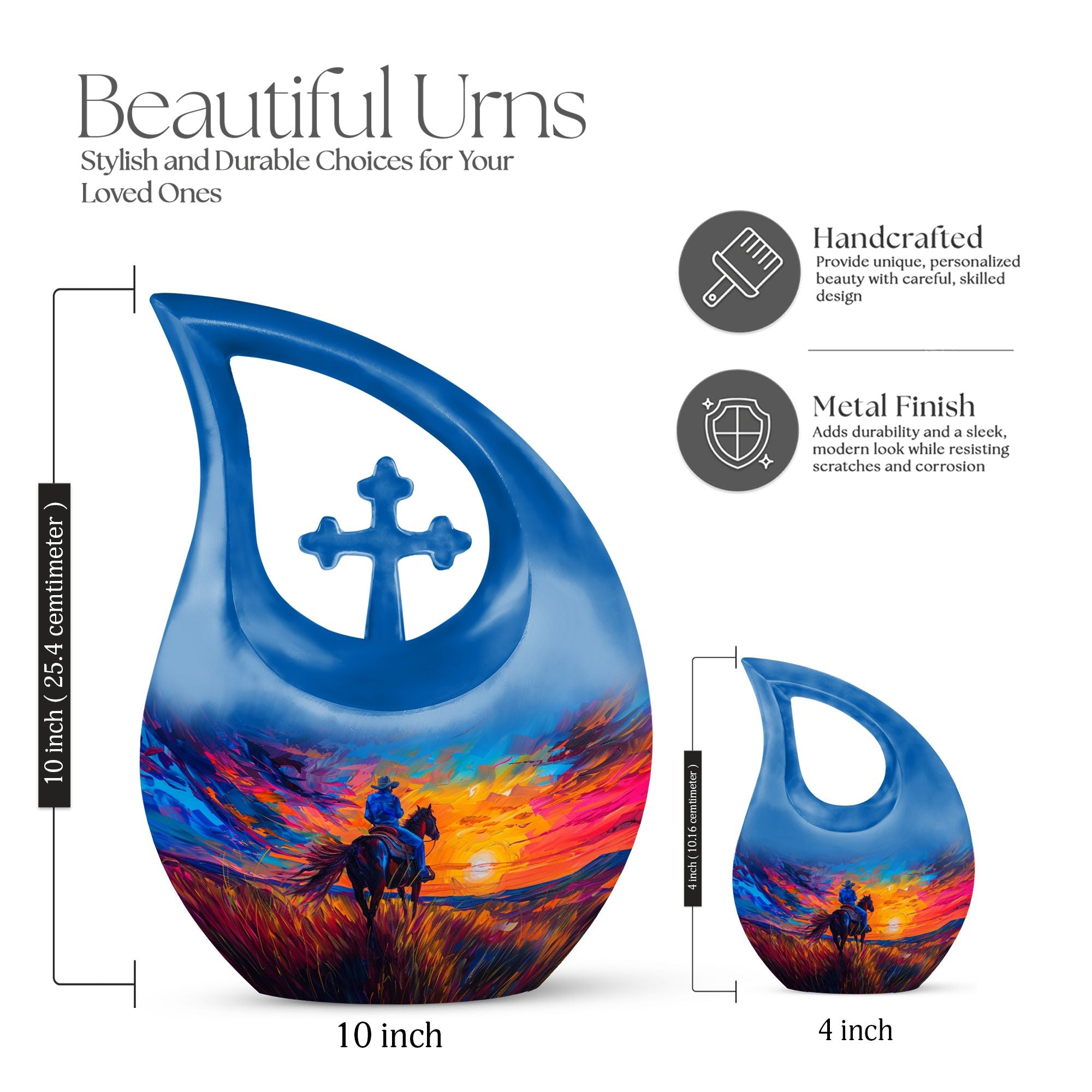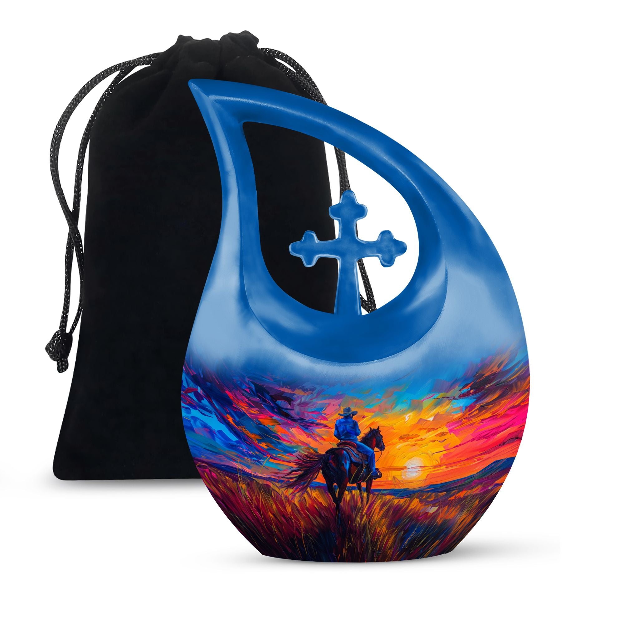 Crafted for reverence, our Cowboy Urn in the large size category sets an aura of dignity and respect to your loved ones. Created from robust aluminium, it stands 10 inches tall and can accommodate up to 200 cubic inches of ashes. Notably, the unit weighs 3.3 pounds, adding to its stability and integrity. This small urn for human ashes distinctively flaunts a 'Cross Drop' theme, a mark of resilience and faith that many find comforting in times of sorrow. The package comes complete with a velvet pouch, aptly designed for secure containment of ashes. Moreover, the urn can be personalized with engraved names, adding a touching tribute to the memory of the departed. Uniquely designed and highly functional, it resonates with searches related to 'memorial urns', 'biodegradable urn', 'purple urn', or 'keepsake urns for human ashes'. In all, our Cowboy Urn offers a ceremonial presence that honors cherished memories, a fitting centerpiece for remembrance.