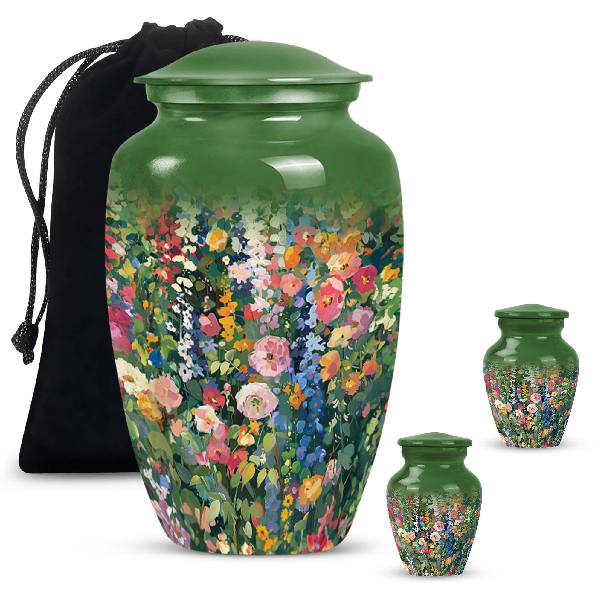 Honor the memory of your lost dear ones with this FLOWERS Urn—a dignified and heart-felt way to preserve the ashes of your loved ones. This 10-inch tall memorial burial urn, prominently featuring an elegant flowers theme, confers a serene and restful ambiance to any space. Crafted from premium quality aluminium, this large urn guarantees longevity and durability. It stands 10 inches in height and is sized to hold 200 cubic inches. Adding an extra layer of refinement, each cremation urn for humans comes bundled with a velvet pouch—for gracefully containing the ashes. What sets this funeral urn apart is the option for customization. Personalize it with engraved names to epitomize and eternalize the relationship with the departed soul. Its classic shape and tastefully-rendered flowers motif make it one of the most exquisite funeral urns for adult ashes men likely to be found. This funeral ash urn truly represents a touching final tribute to your cherished one.