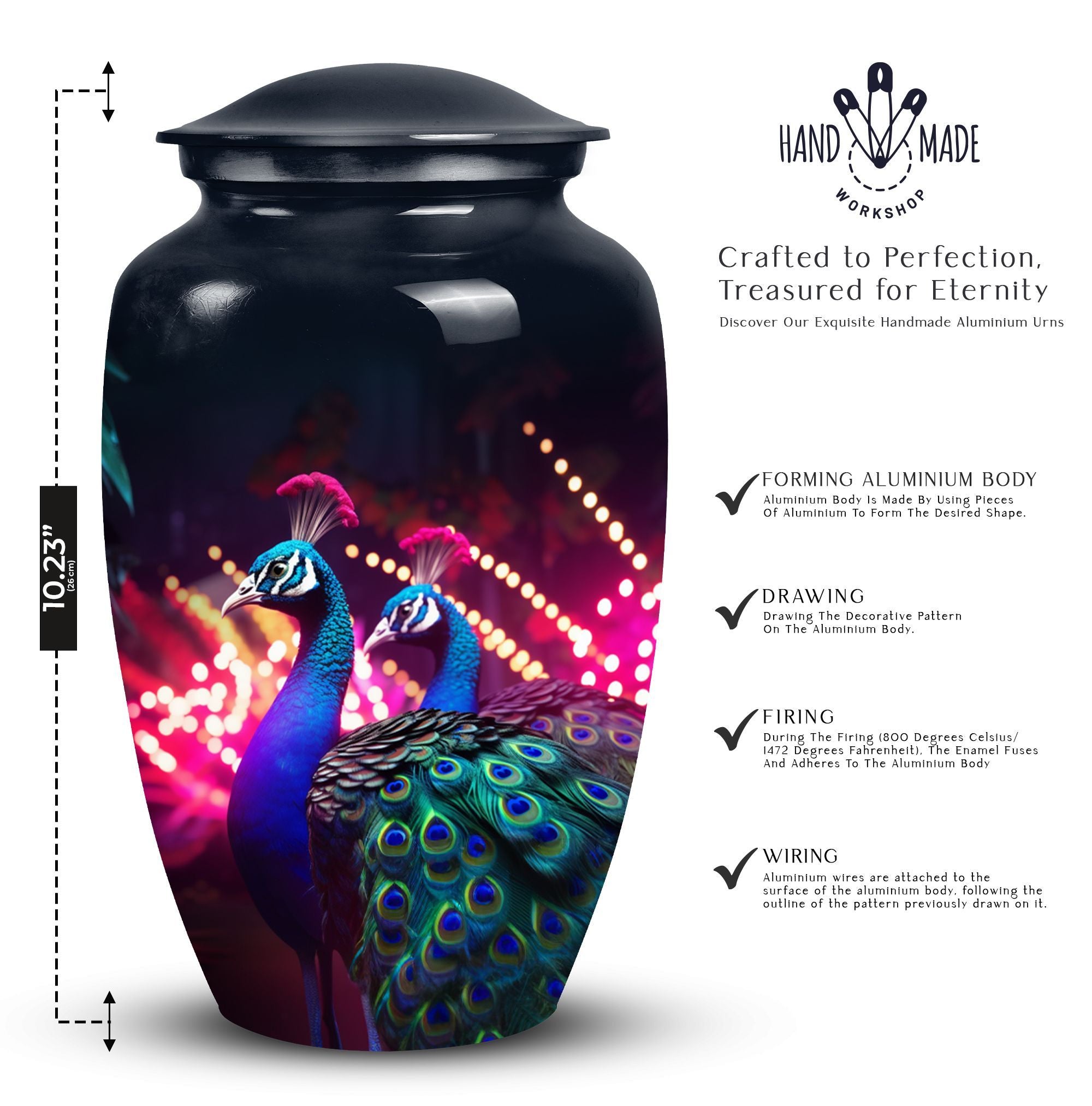 Presenting our Classic 3 inch Peacock Cremation Urn, a truly heartfelt token of remembrance for your loved one. Our urn stands at 10 inches, carefully crafted from superior aluminium for long-term durability. We recognize the significance this bears in holding a very special person's memory, thus it offers a generous capacity of 200 cubic inches. While the urn radiates with the sophistication of the usual 'Classic Urn' style, its uniqueness sets it apart as an ideal pick for those seeking 'Unique Urns for Dad' or 'Urns for Ashes for Mom'. On receipt, you'll find your memorial urn well protected in a plush velvet pouch, intended for the safekeeping of the ashes. For that extra touch of sentiment, we offer customization so that you can personalize your urn with engraved names. At a weight of 3.3 pounds, this large urn reinforces its quality while being manageable to handle. Whether you're conveying a 'sorry for your loss' message or searching for 'Metal Urns for Human Ashes', consider this item as more than just a decorative urn for human ashes—it's a relished memorial tribute.