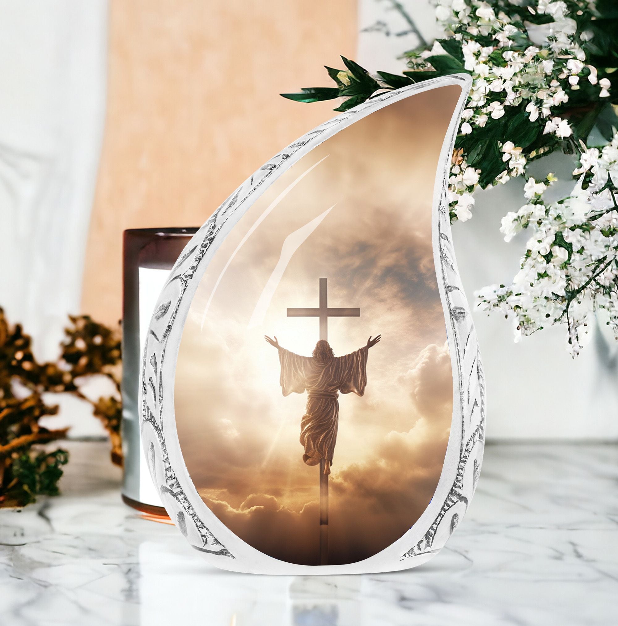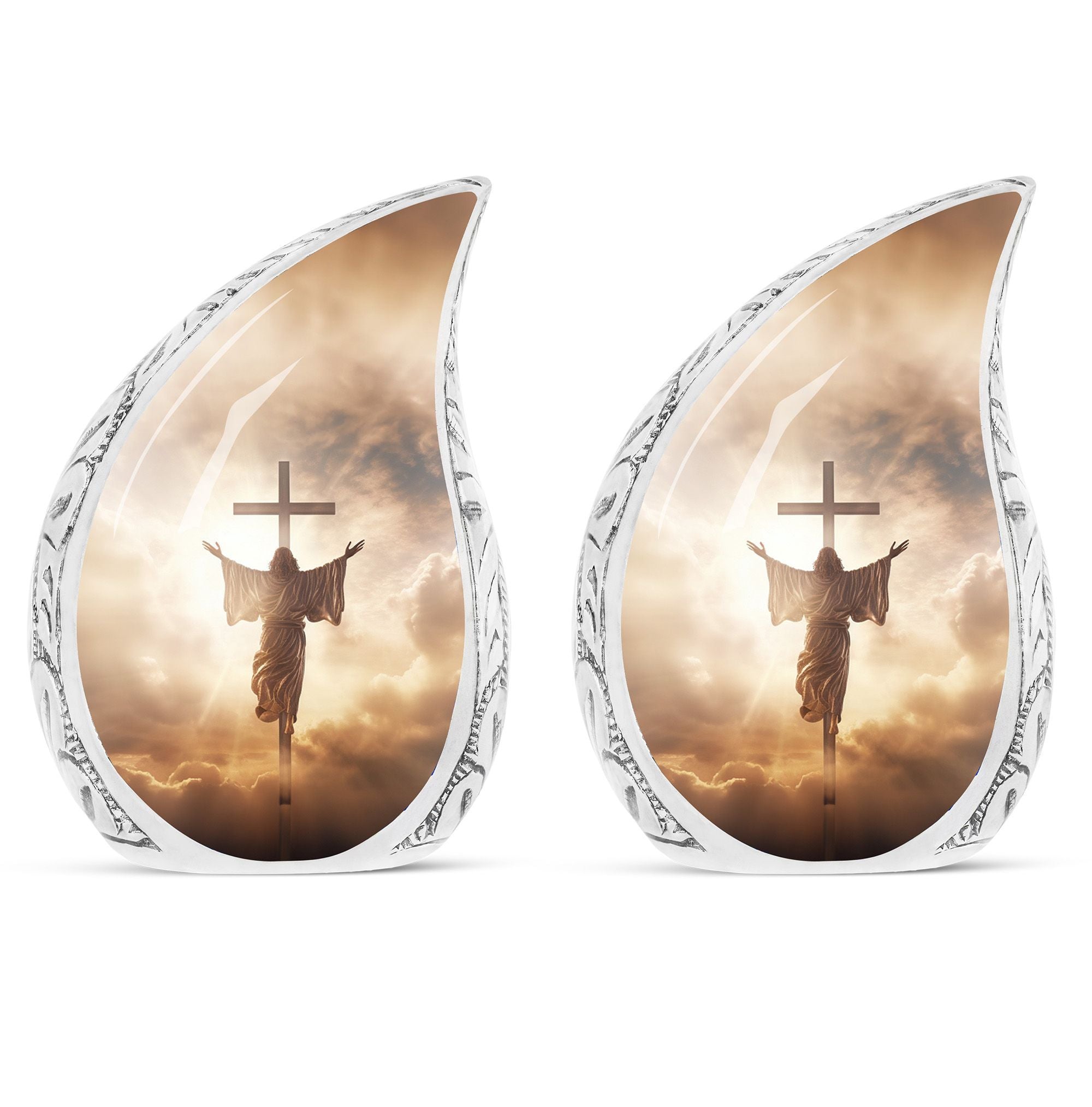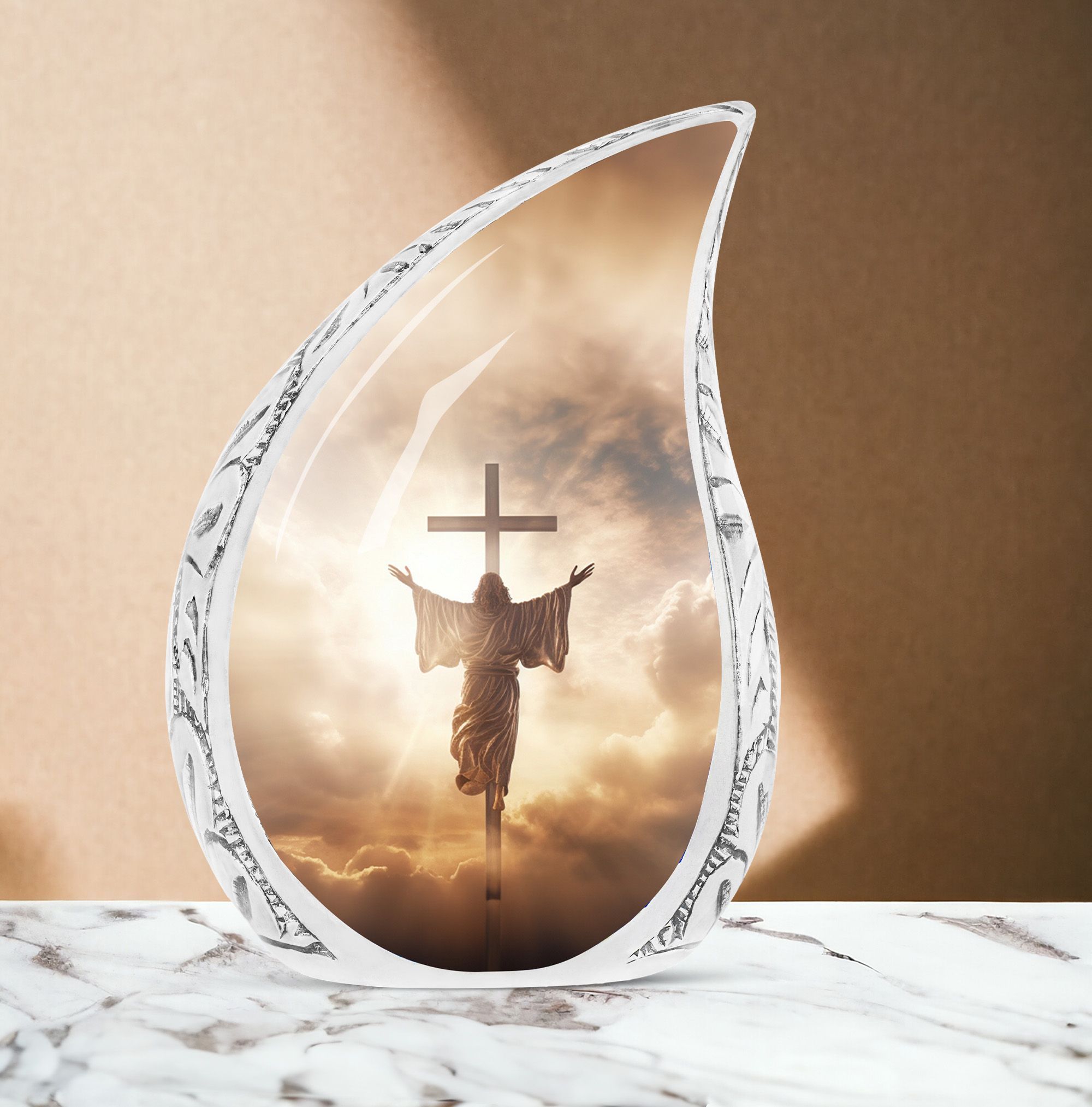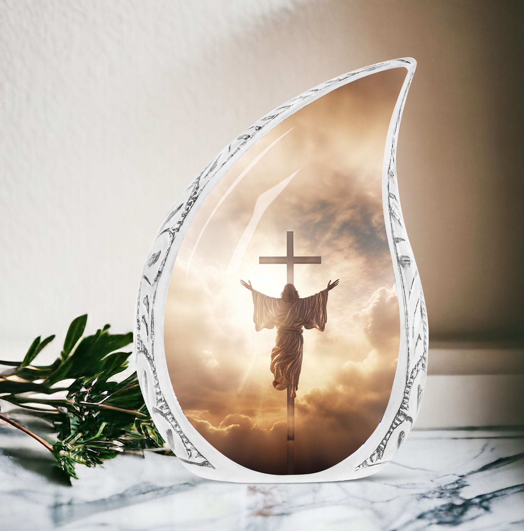 Savor the immortal remembrance of a loved one with our meticulously crafted Jesus Christ cross Urn. Sized at 3 inches, this beautifully designed cremation urn is made from sturdy aluminium ensuring long-lasting memory-keeping. Weighing a modest 3.3 pounds with a height of 10 inches, it has the capacity to securely hold up to 200 cubic inches of ashes. What's more, personalization options are available, allowing you to engrave names on the urn for a more personal and intimate touch. It also comes with a luxurious velvet pouch, providing a dignified containment for the ashes. This large urn for human cremation ashes intertwines sanctity with modernity, creating a divine blend for this standout memorial ceremony supply. Embrace the culture of love, honour, and remembrance with our commemorative masterpiece.