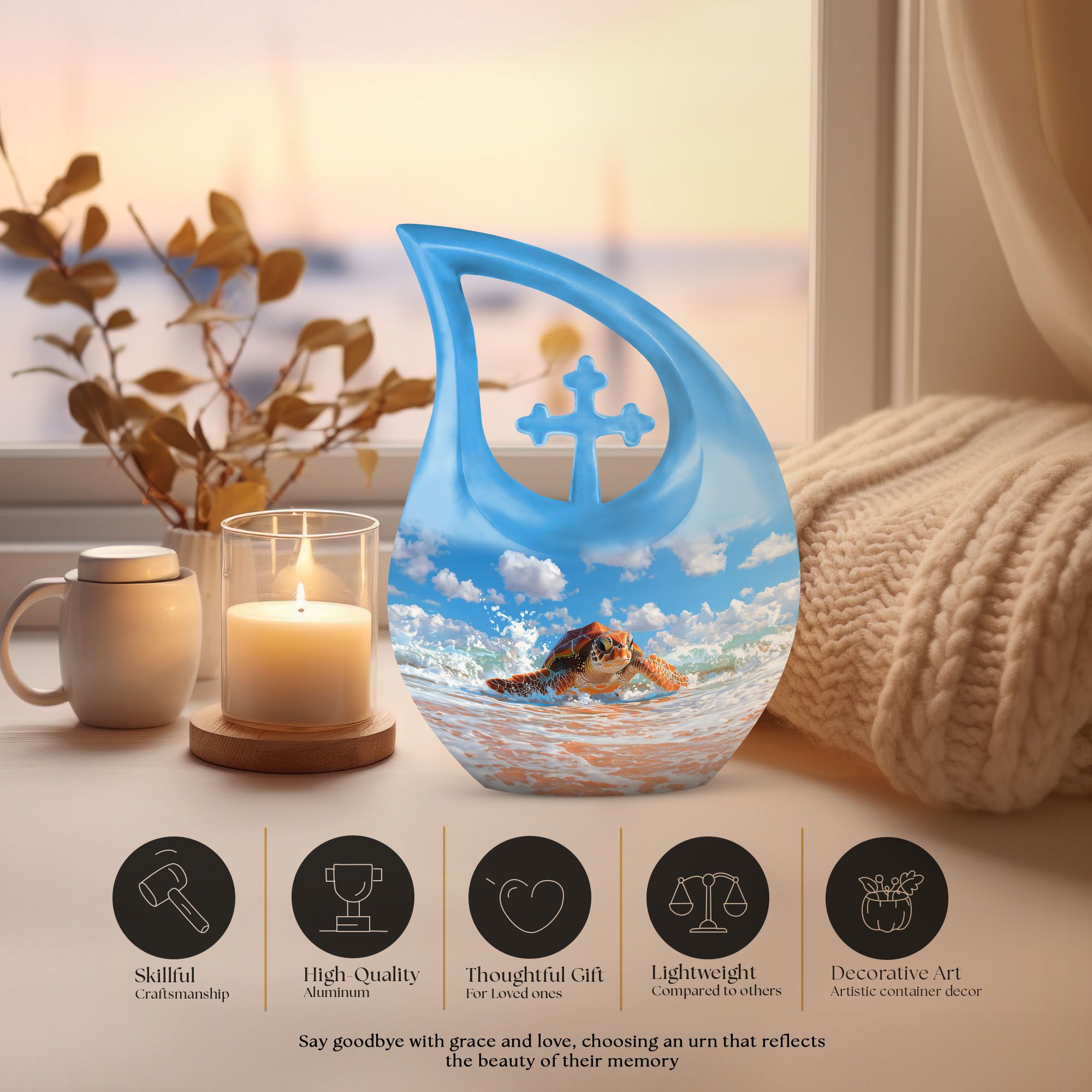 Made from premium aluminium, this adult cremation urn features a calming turtle design inspired by the ocean, representing harmony and timeless remembrance. With its secure screw-top lid, ashes are safely preserved, offering peace of mind for families seeking a lasting memorial. Whether chosen as a funeral urn ashes or as a display memorial ashes keepsake, this piece provides comfort and beauty.