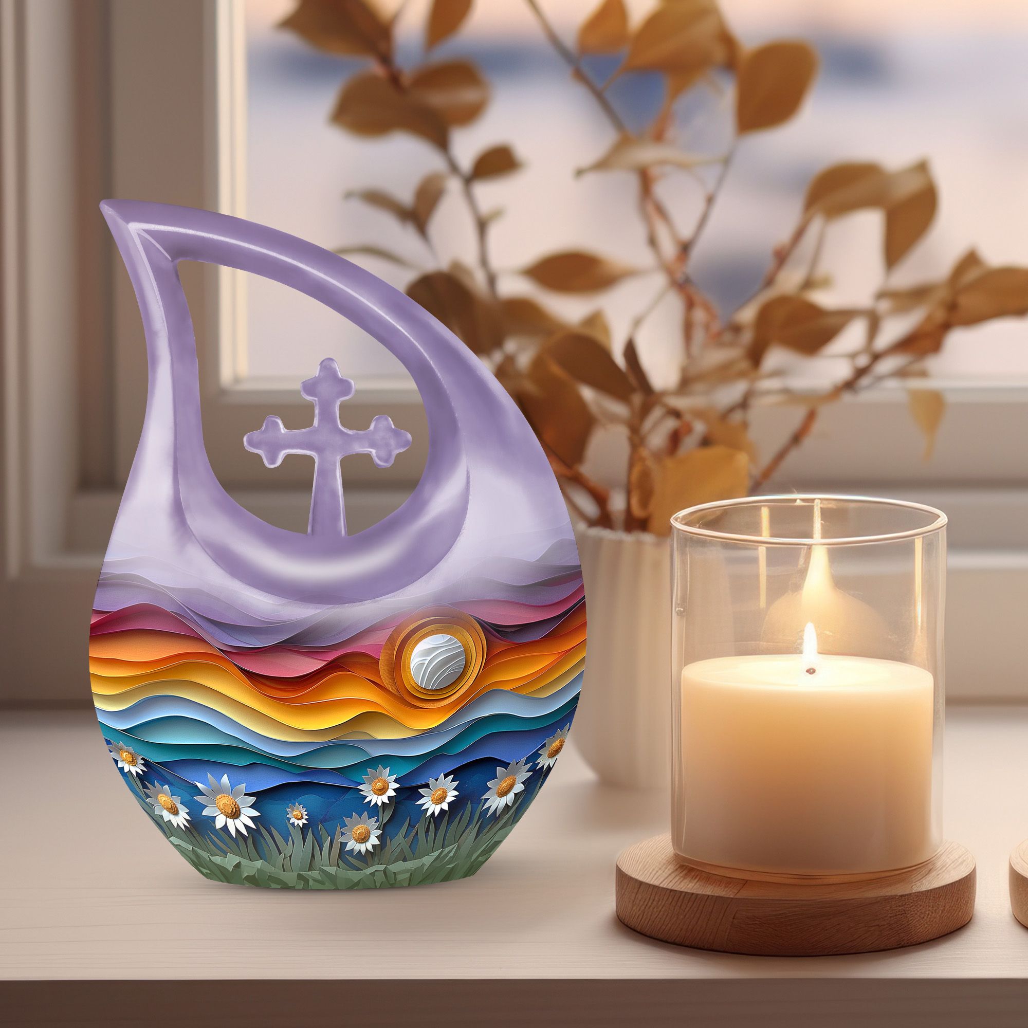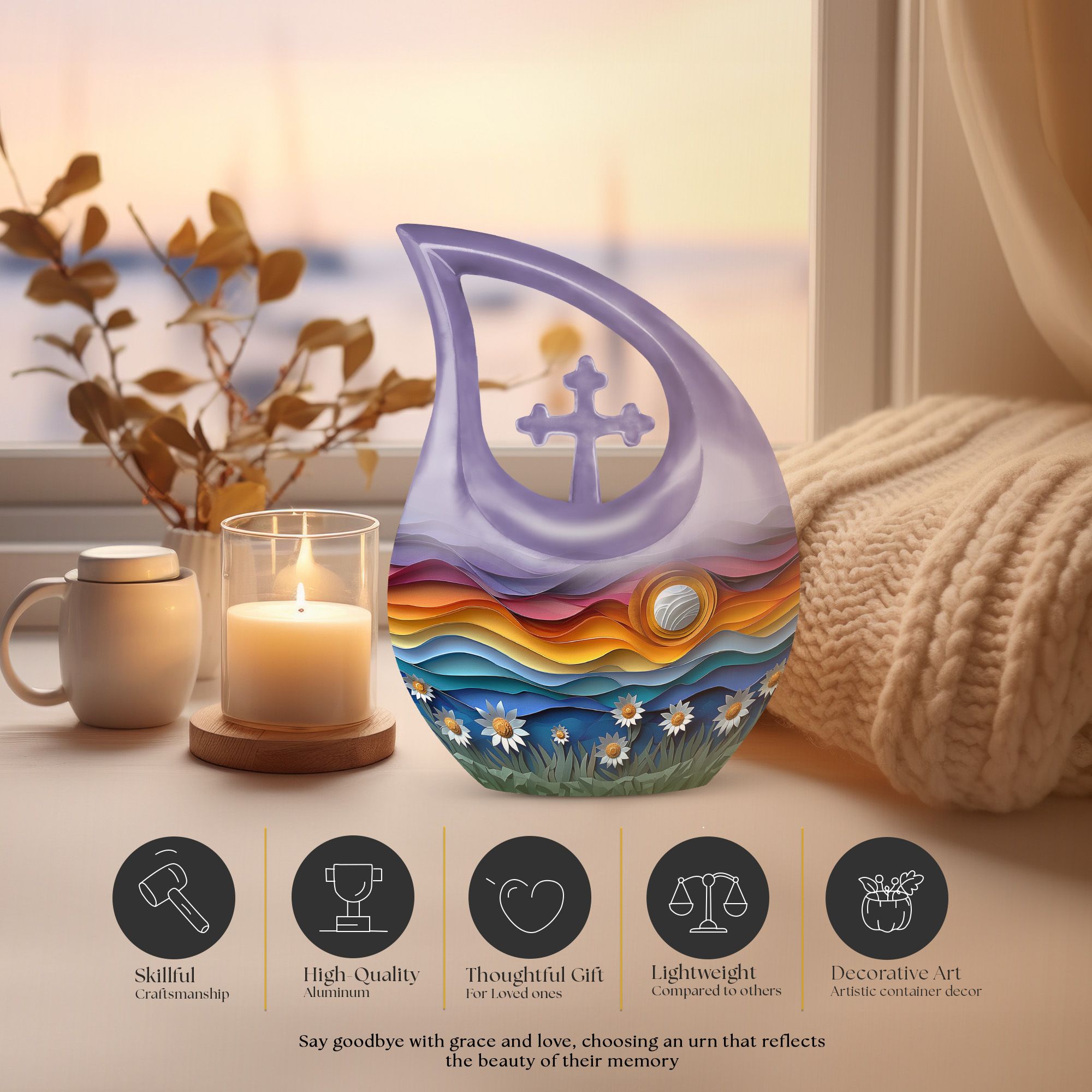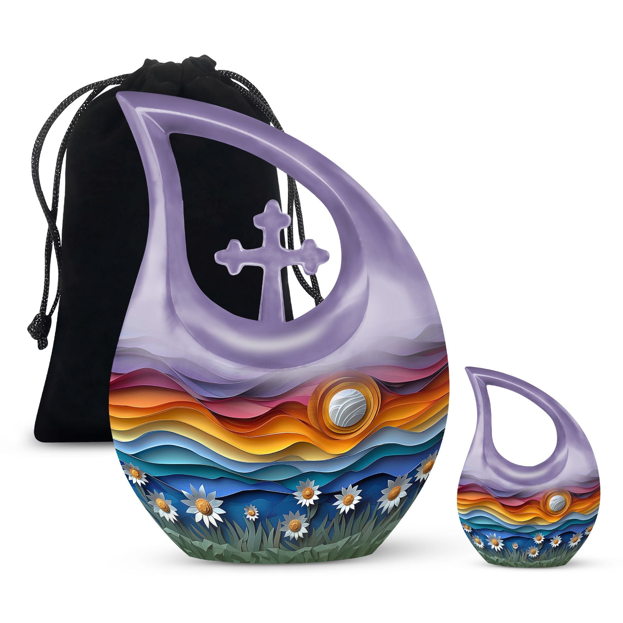 Featuring a 'Cross Drop' theme from 'A Symphony In' series, this aluminium-made best cremation urn will lend the grace and solace you seek in painful times. Sized at 10 inches, it offers an interior space of 200 cubic inches, allowing a significant volume of ashes to be held. The urn weighs a solid but manageable 3.3 pounds, and its dimensions fit perfectly into any typical memorial space. Its large size ensures it stands out without being overwhelming. For an added personal touch, you can engrave names onto the urn. A unique touch is the velvet pouch it comes with for the containment of ashes, adding a further layer of respect and care to this crucial memorial element. Often sought after in memorial urns, medium urns for human ashes, or special urns for ashes categories, this product navigates the delicate balance of sorrow and love perfectly.