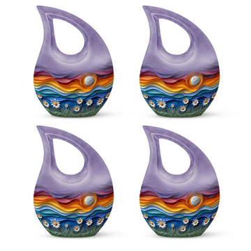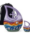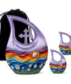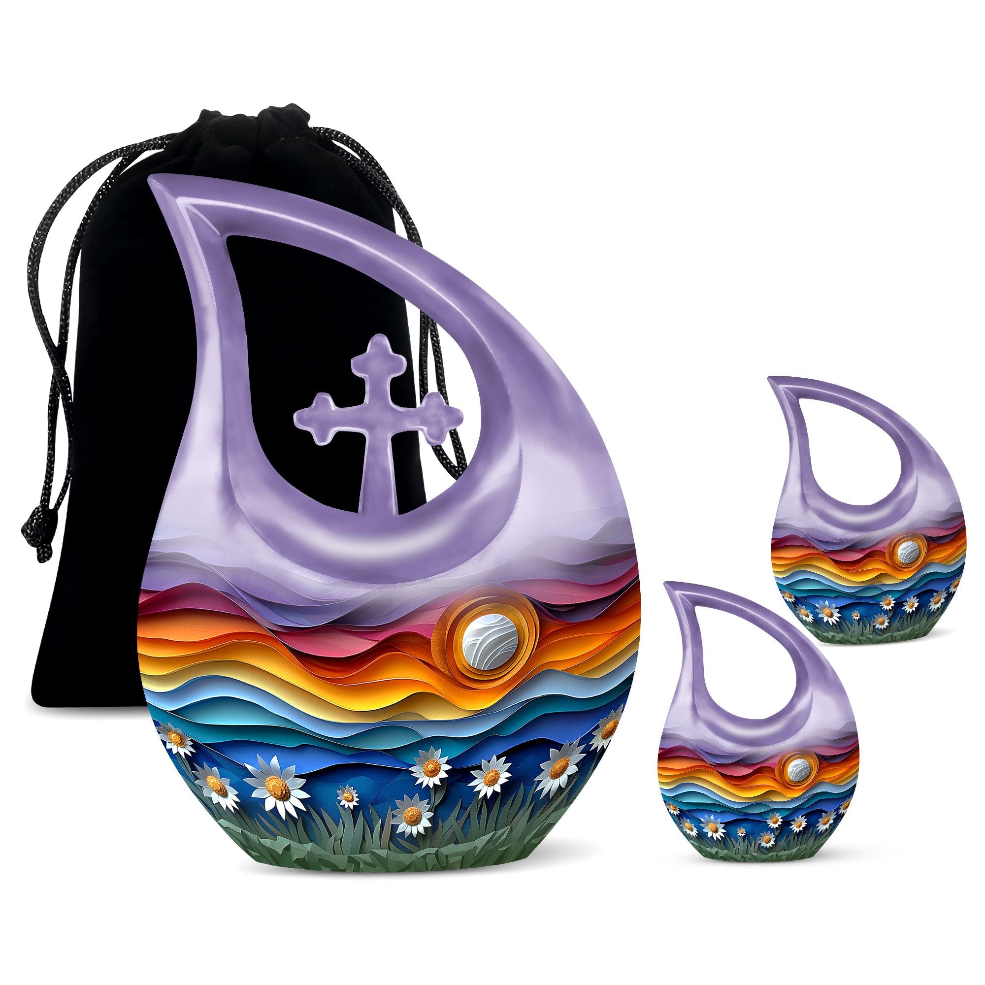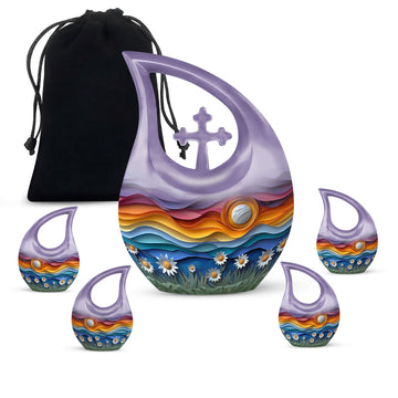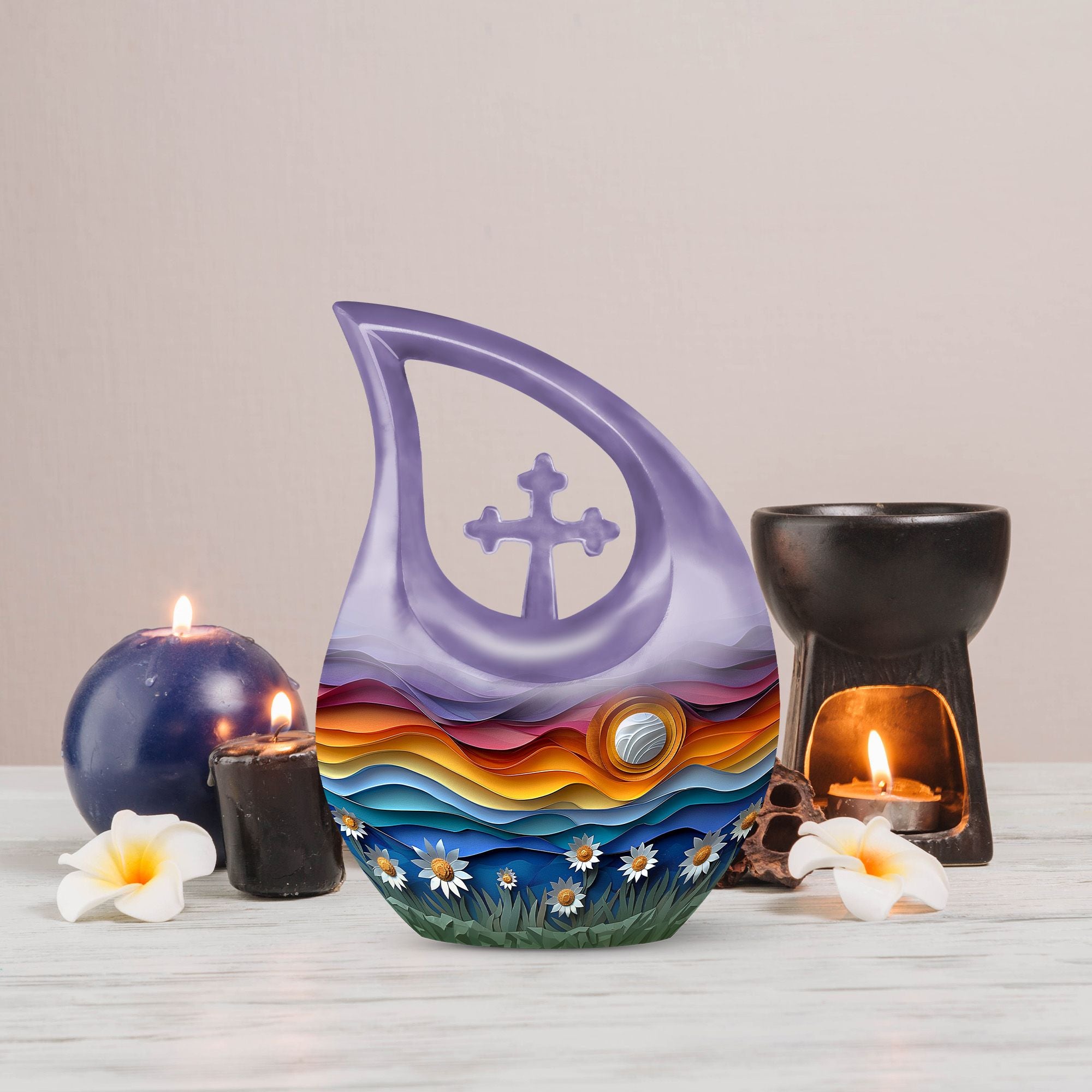 Featuring a 'Cross Drop' theme from 'A Symphony In' series, this aluminium-made best cremation urn will lend the grace and solace you seek in painful times. Sized at 10 inches, it offers an interior space of 200 cubic inches, allowing a significant volume of ashes to be held. The urn weighs a solid but manageable 3.3 pounds, and its dimensions fit perfectly into any typical memorial space. Its large size ensures it stands out without being overwhelming. For an added personal touch, you can engrave names onto the urn. A unique touch is the velvet pouch it comes with for the containment of ashes, adding a further layer of respect and care to this crucial memorial element. Often sought after in memorial urns, medium urns for human ashes, or special urns for ashes categories, this product navigates the delicate balance of sorrow and love perfectly.