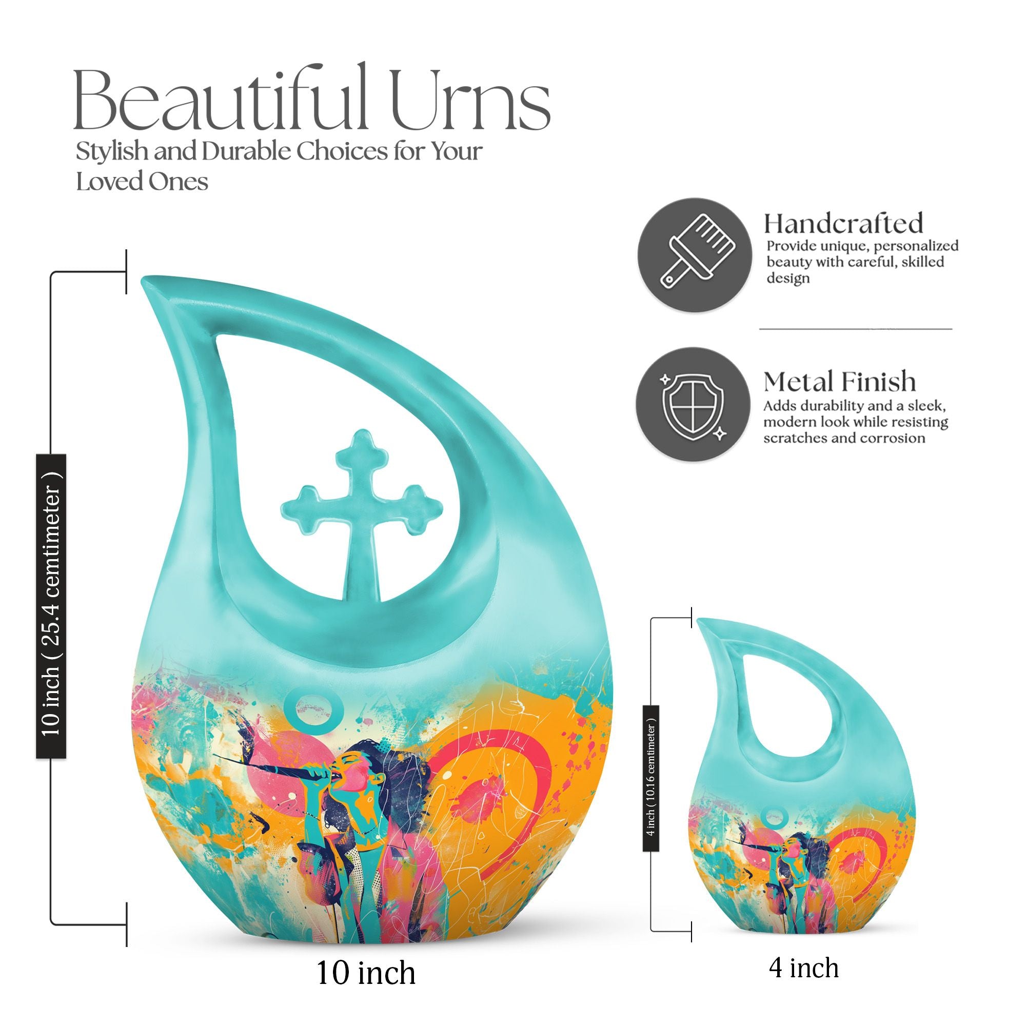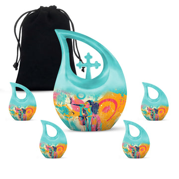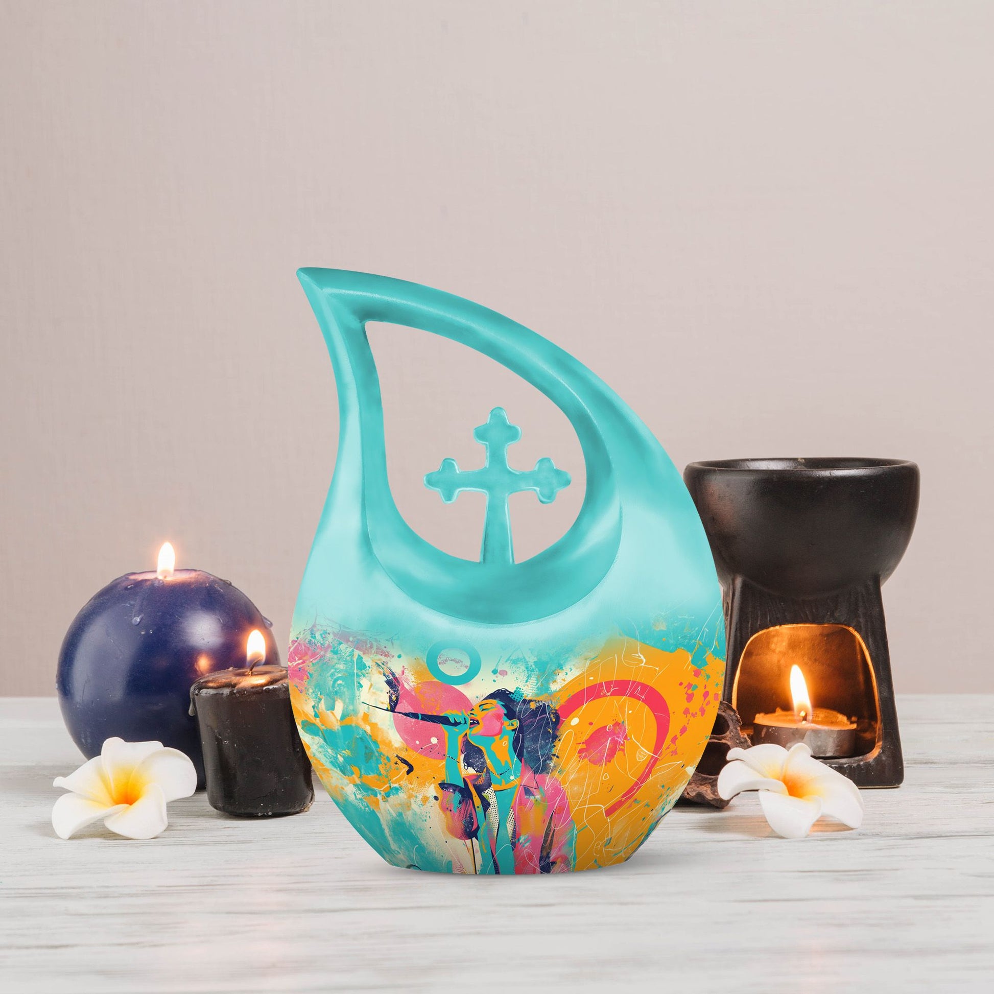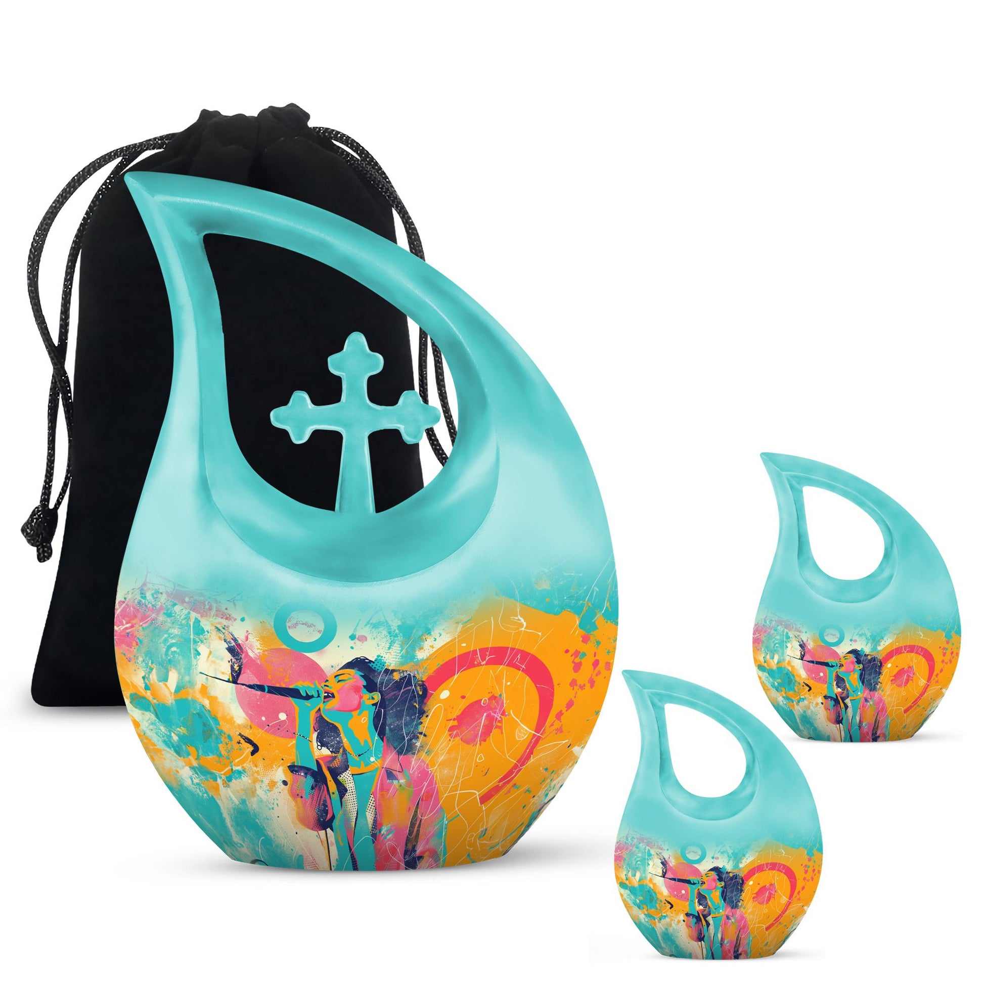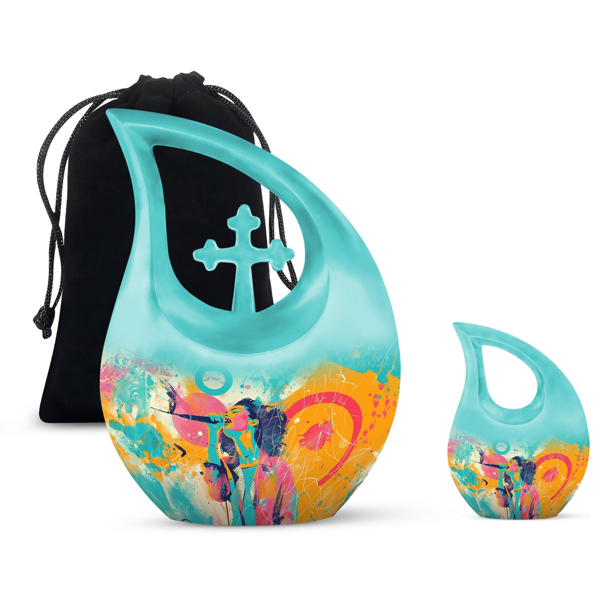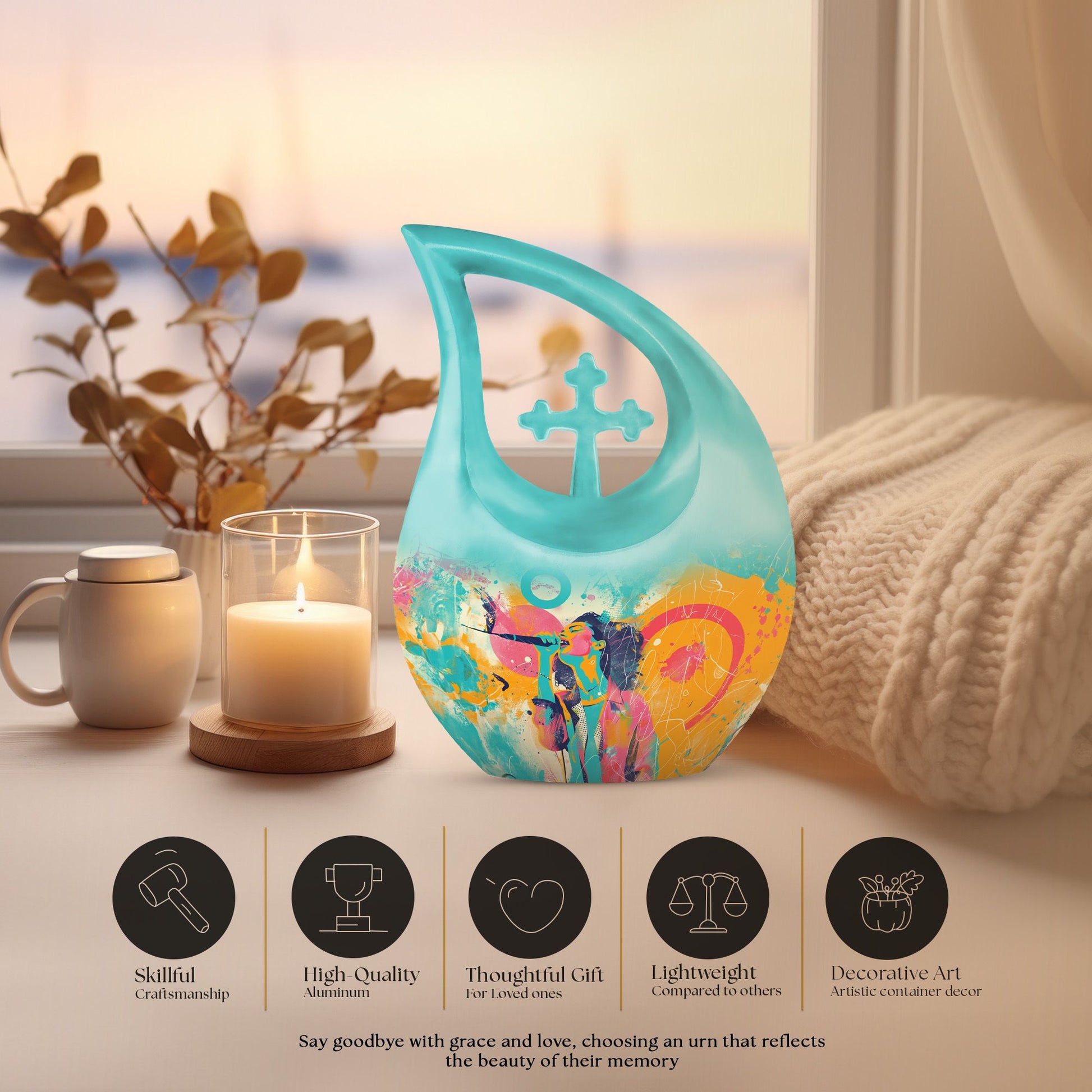 Our Abstract Sonic Colors Urn is a beautifully crafted large urn that brings a unique, modern appeal to memorialization. This top-rated custom cremation urn is sized at 10 inches, featuring an inspiring Cross-Drop theme that conveys hope, peace, and love. The urn is constructed from robust, high-quality aluminium ensuring it can steadfastly hold up to 200 cubic inches of precious ashes. Weighing 3.3 pounds and standing 10 inches in height, it offers substantial capacity suitable for ashes of 2 adults. To make it even more special, we offer personalized engraving for you to inscribe beloved names, crafting a truly one-of-a-kind memorial. The urn comes complete with a soft velvet pouch for secure containment of ashes. Using the keywords 'Abstract Sonic Colors Urn', 'Custom Engraved Urns', or 'Ashes Holder' will help you instantly locate this popular piece. Enhance your memorial ceremony with this unique, resonant urn that impeccably pays tribute to your loved ones.