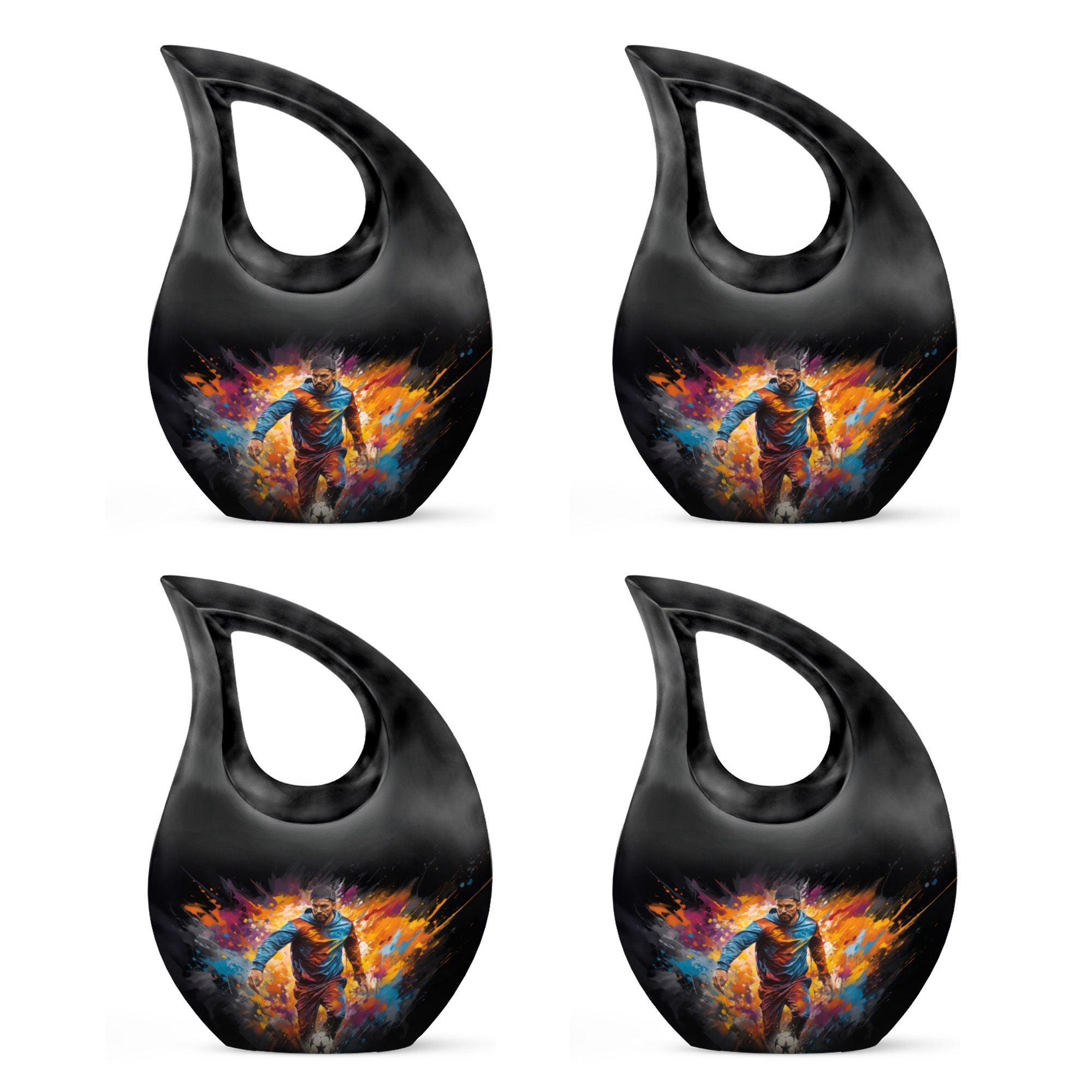 Honor your cherished ones with this uniquely designed Cross Drop Football Urn. As a part of our ceremony supplies selection, it's an ideal selection for adults and seniors who value spirituality and sports. Crafted from robust and resilient aluminium, this distinguished urn measures 10 inches in height and weighs 3.3 pounds. Suitable as both companion urns for adults and box urns for human ashes, this large urn boasts a substantial capacity of 200 cubic inches. The theme embodies a deep love for football, delicately intertwining the memory of your dearly departed with the spirit of the beautiful game. Each urn comes with a soft velvet pouch, making this not merely a receptacle for ashes, but also an intimate keepsake. For an added touch, personalize with engraved names, fostering a stronger connection between you and your lost one. Explore further in our range of biodegradable cremation urns and keepsakes for ashes for a man. Making it a touching tribute, our memorial urn brings comfort when it's needed the most.