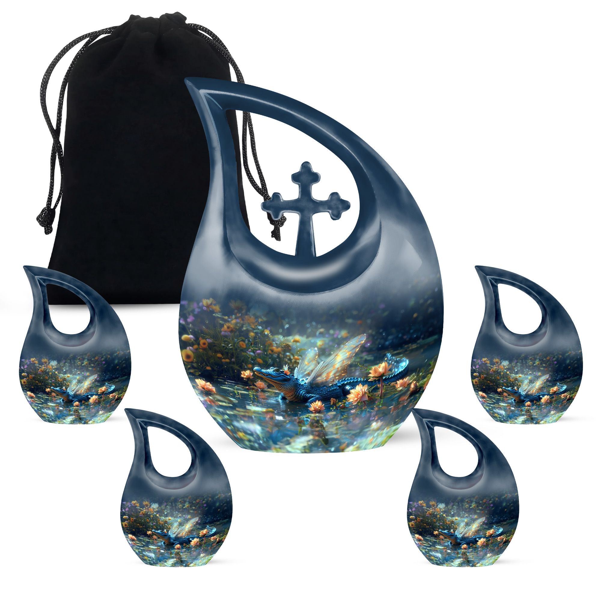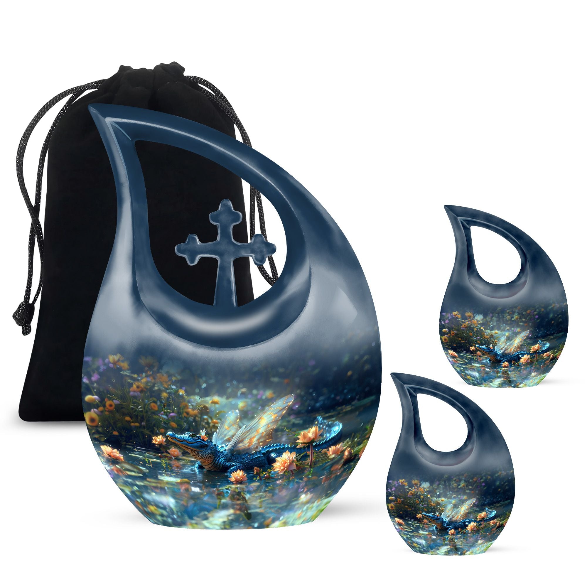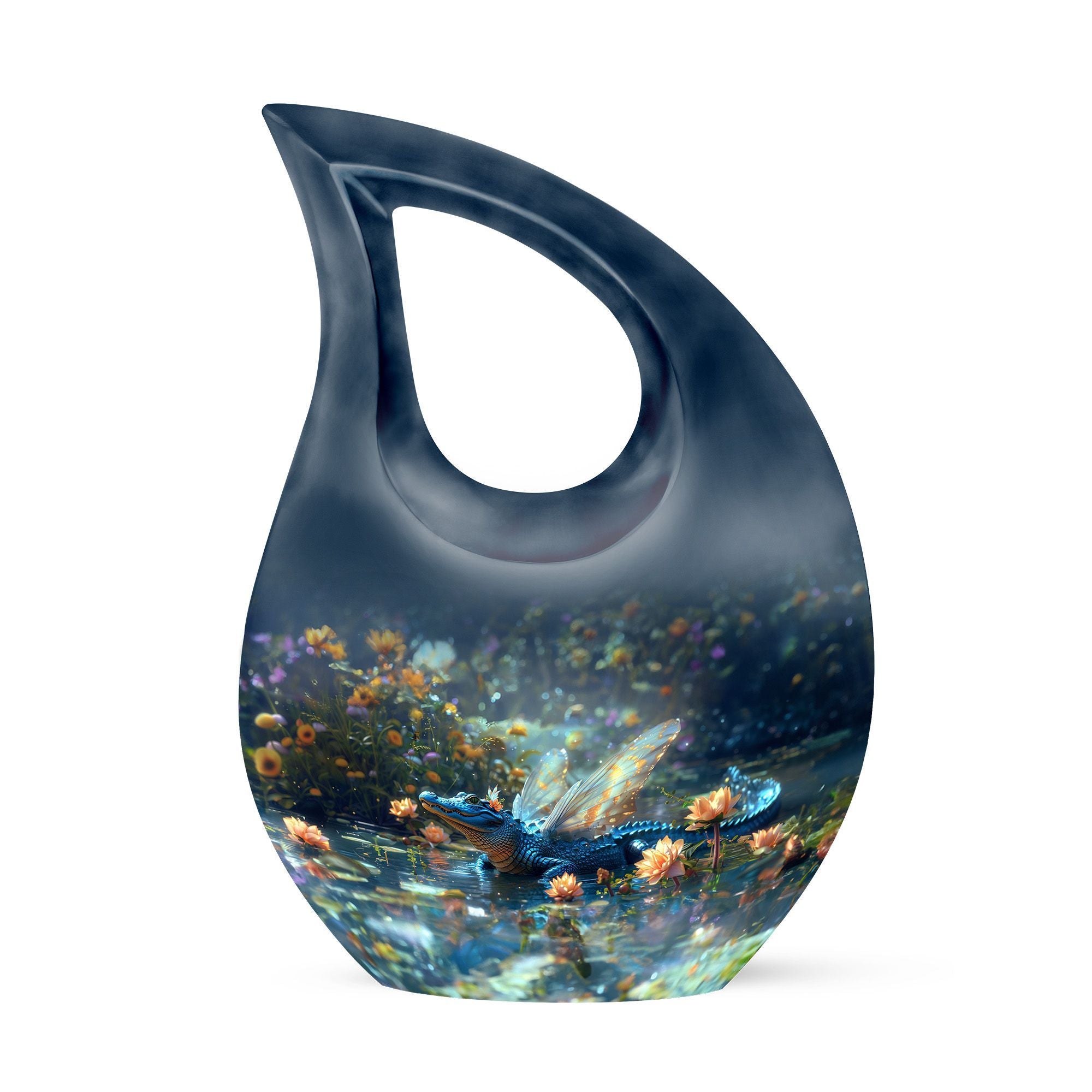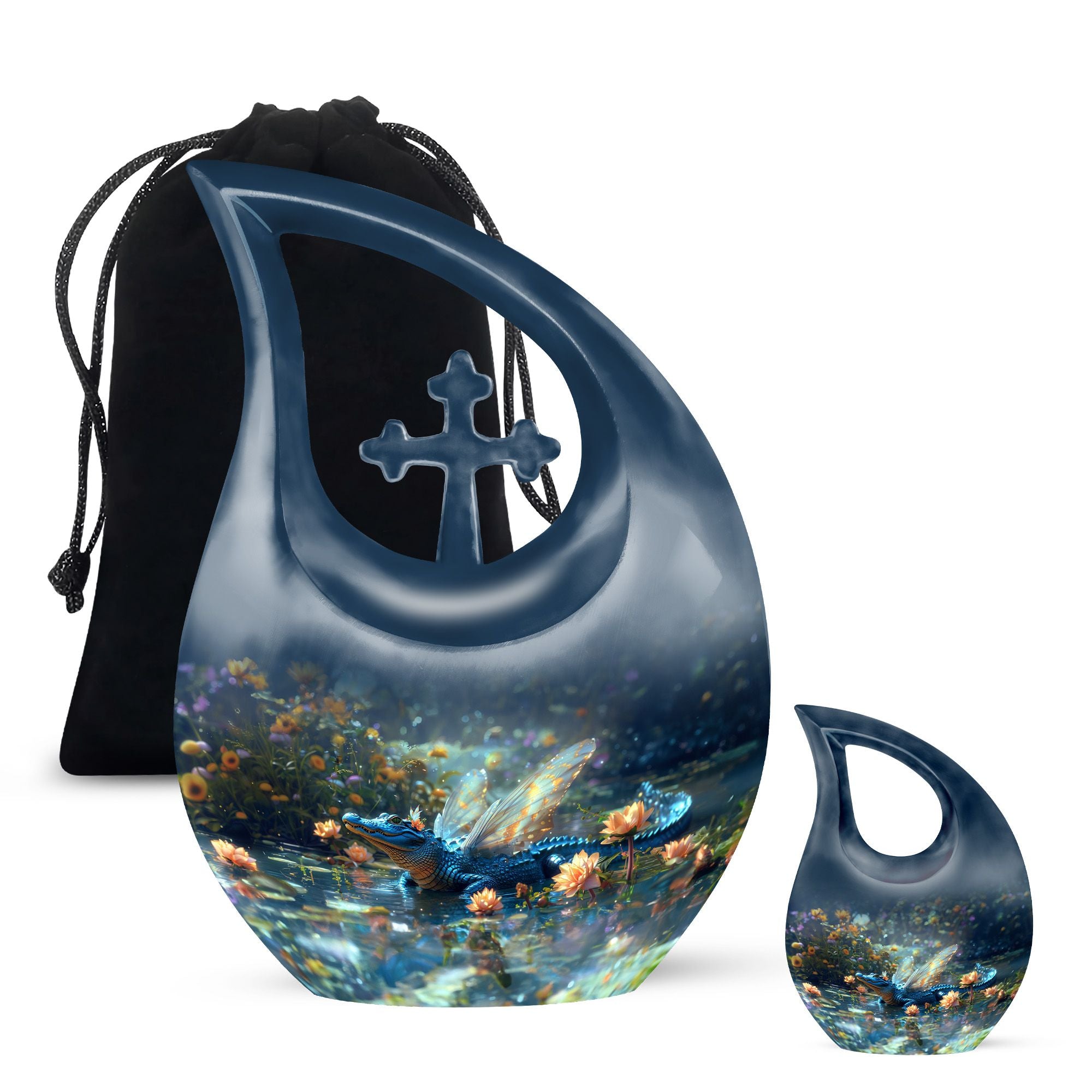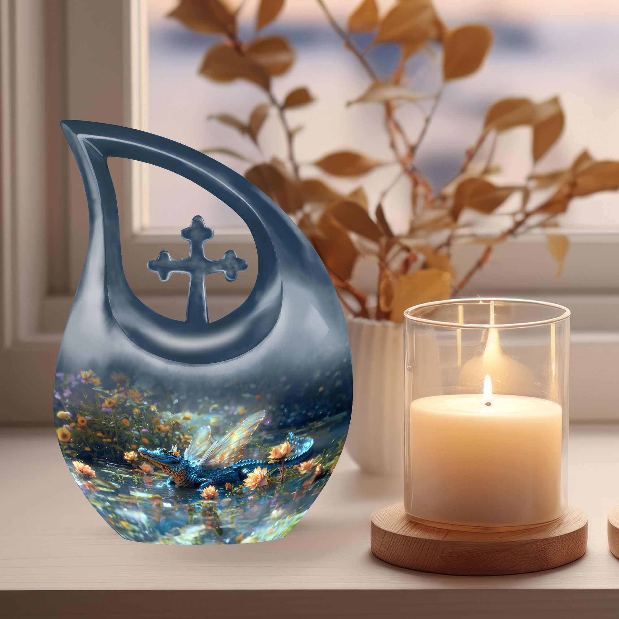 Experience a unique and elegant way to commemorate your loved one with this Alaigator Urn. This 10-inch, full size urn for human ashes stands out with its majestic Alaigator theme and striking Cross Drop design. Each piece is crafted meticulously in Aluminium, ensuring unmatched durability and beauty that last a lifetime. With a weight of 3.3 pounds, it possesses a generous capacity of 200 cubic inches, making it suitable for use as a burial urn. One noteworthy feature is the option for personalization; you can choose to engrave names to add a touch of sentimentality and honor the memory of the departed. Each urn comes packed in a velvet pouch designed for secure containment of ashes, adding an extra layer of protection to your precious memorial. This custom Mom Urn redefines traditional memorial urns and small keepsake urns with its uncommon elegance. Cherish the memory of your loved ones in the most unique and beautiful way with this versatile urn, popularly chosen amongst unusual urns for ashes.