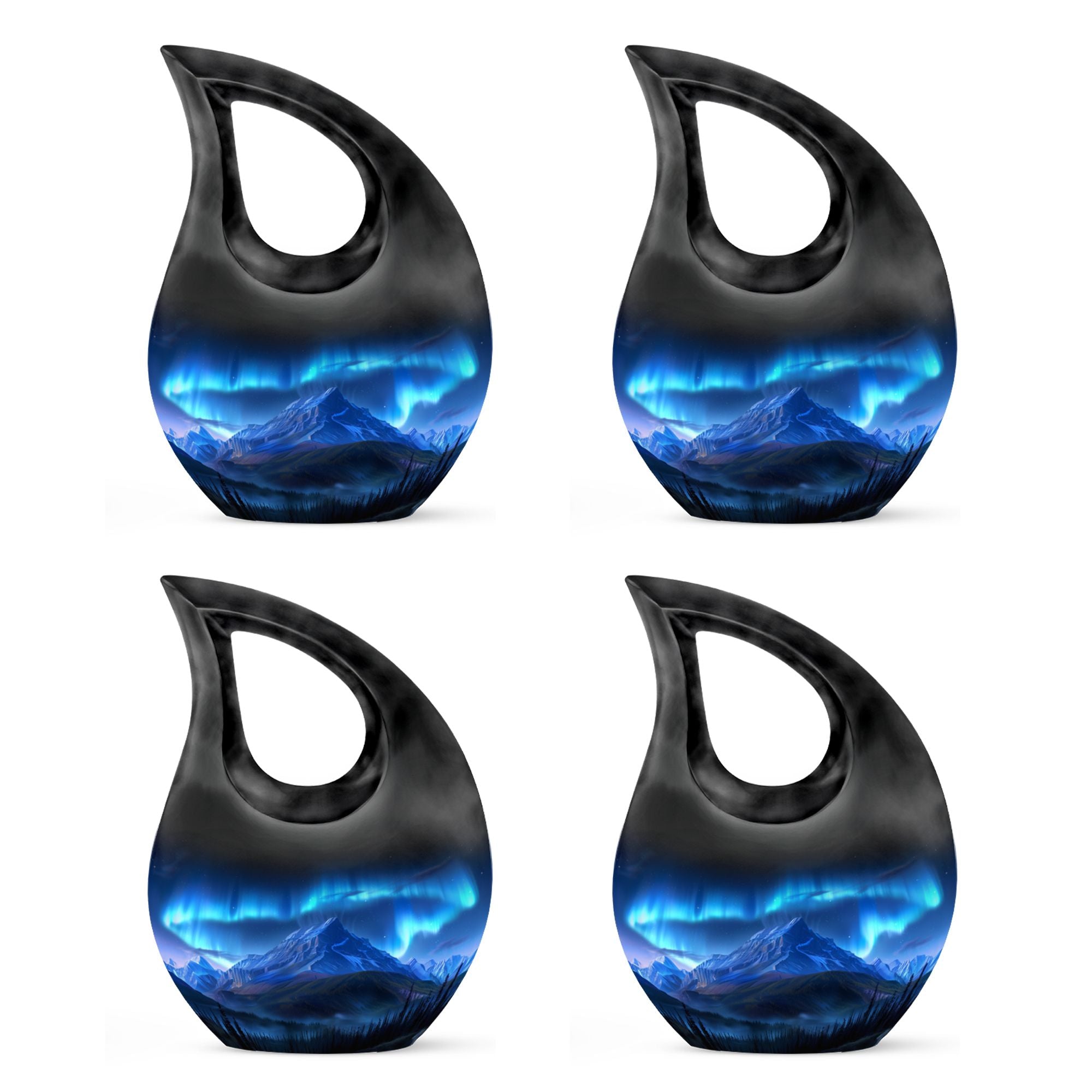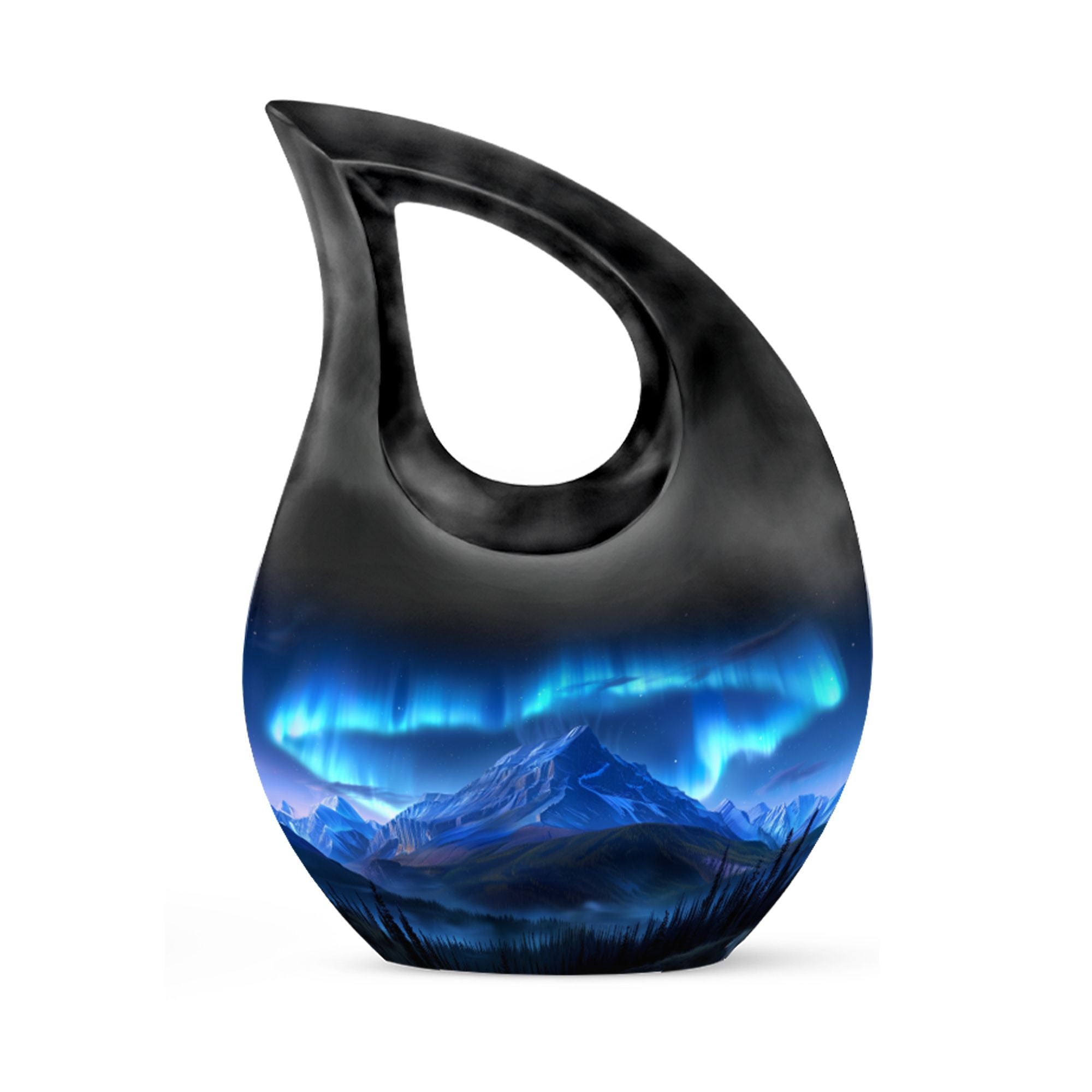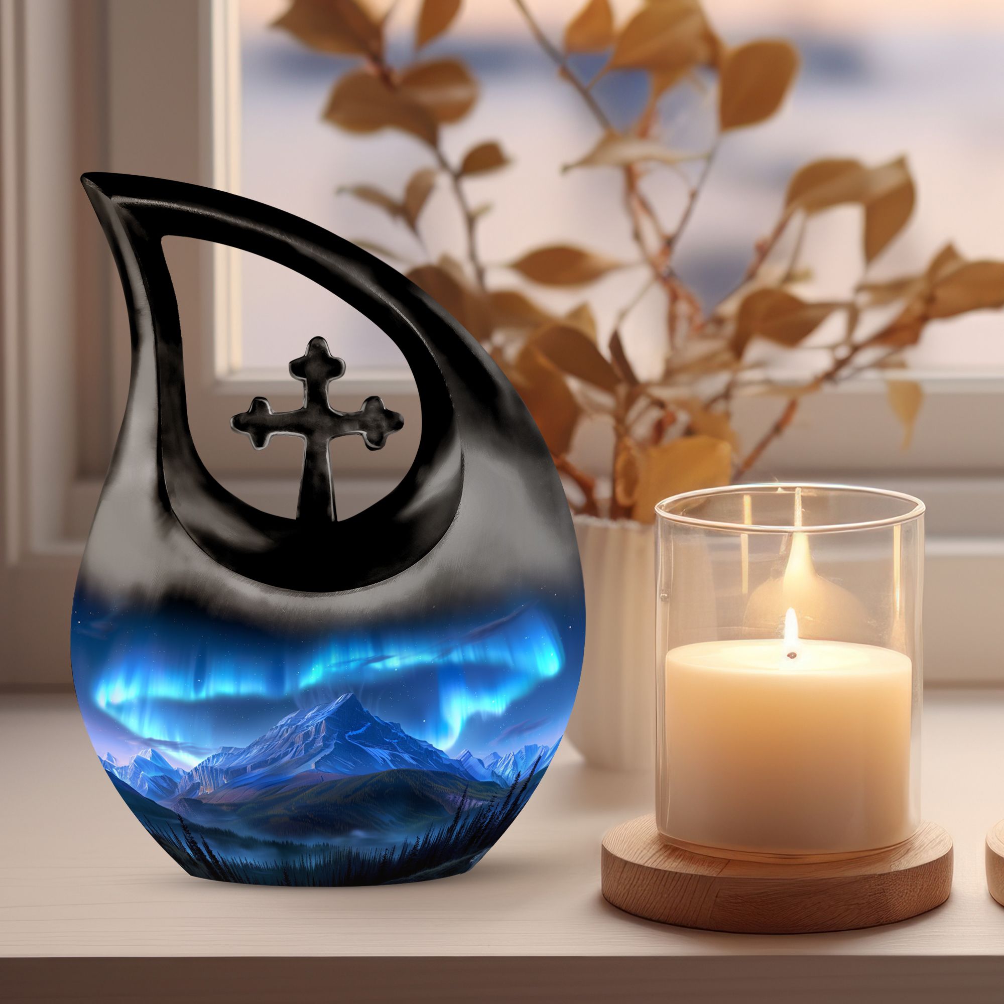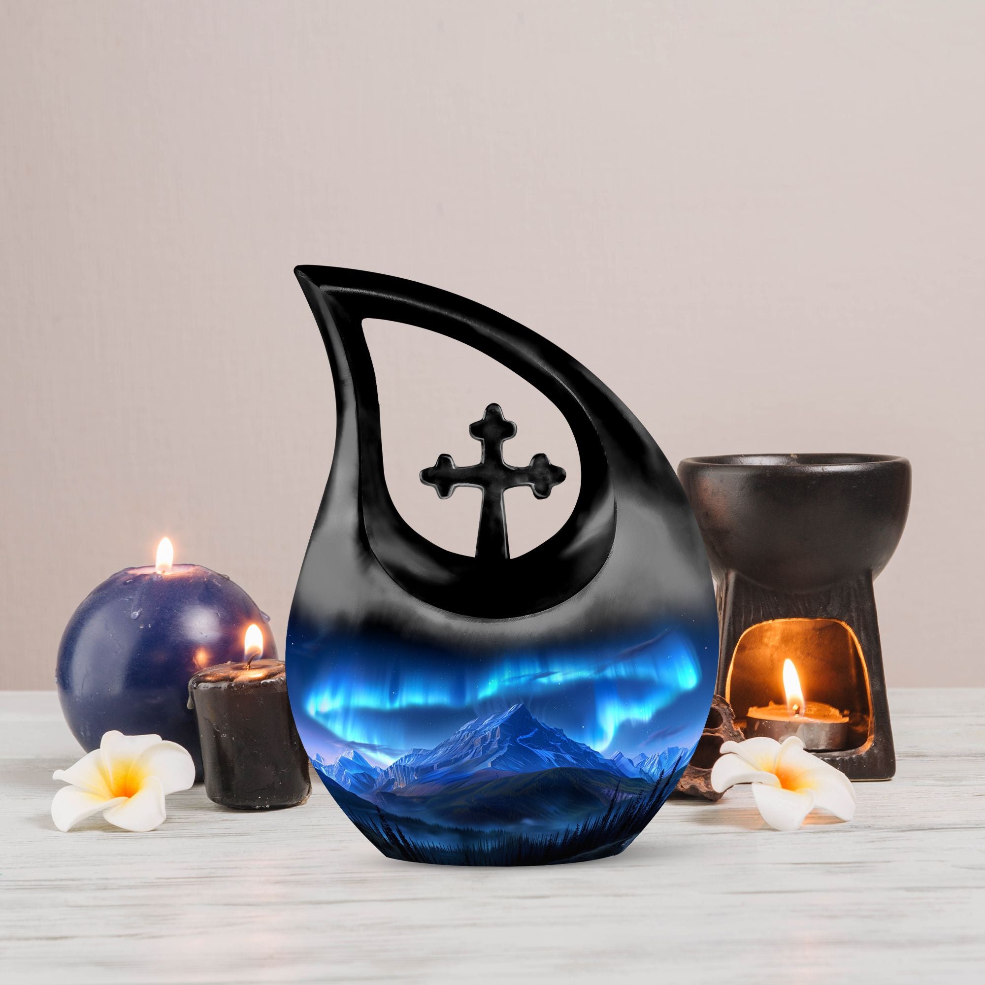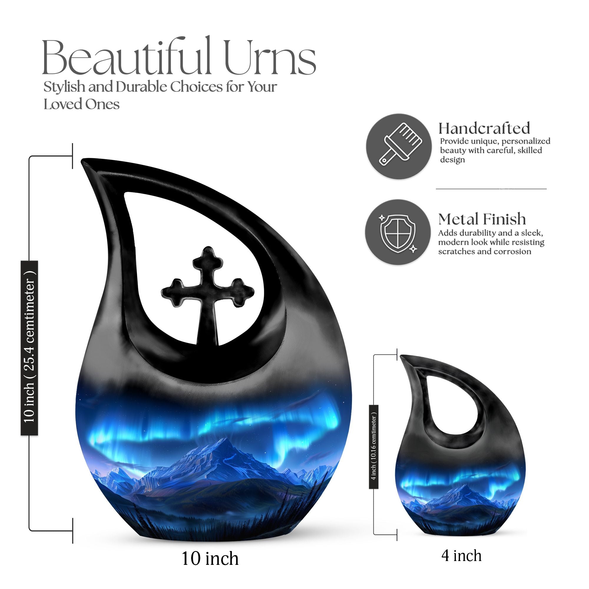Discover your unique commemoration with our Arora Borealis Urn. This 10-inch urn, shadowcast in sturdy aluminium, fuses tradition with unmatched artistry. Its captivating cross drop motif echoes sentiments of solace and remembrance. At 3.3 pounds, this majestic memento secures up to 200 cubic inches of precious memories - an ideal pick amongst large urns. Its customization feature exemplifies this dedication by allowing the engraving of names, making it one of the most meaningful customized urns for ashes for adults. Safeguarded in an accompanying velvet pouch, it assures the delicate containment of ashes, reflecting the profundity of your love. A representative cremation monument, this urn resonates with your need for unique urns for dad or anyone dearly missed. Make your peace with this memorial urn for human ashes, a poignant reminder of the afterglow of a cherished life.