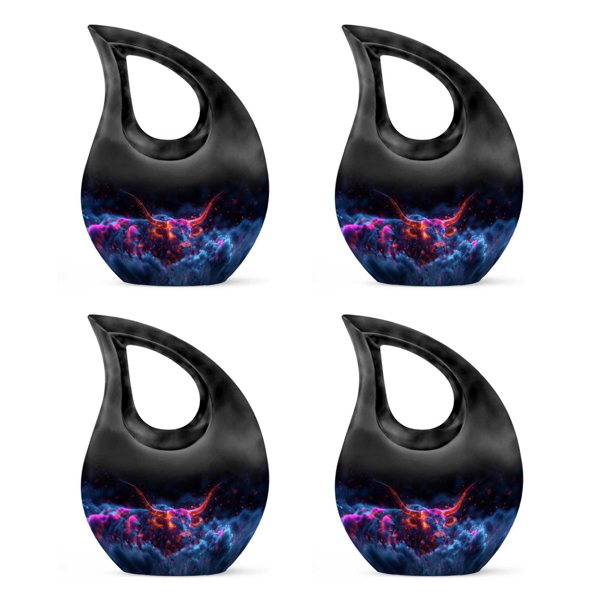 Cherish your loved ones with the Astral Bull Mirage Urn. Standing tall at a towering 10 inches, this high quality, large, aluminum urn weighs a sturdy 3.3 pounds and can accommodate up to 200 cubic inches of ashes. A crystallization of symbolism and quality, the Astral Bull Mirage Urn boasts an elaborate 'Cross Drop' detail, an icon of hope and spiritual upliftment. The urn comes with a plush velvet pouch, providing an intimate sanctuary for the ashes of your departed. Personalize this piece by engraving the names of your loved ones, etching into memory their earthly existence. Given its size, it can serve as companion urns for human ashes, acting as a comforting presence during your grief journey. Keywords to note include Affordable Urns, Cool Urns, large urns, and Memorial Urns For Human Ashes. As you tread the path of remembrance, let the Astral Bull Mirage urn guide your way.