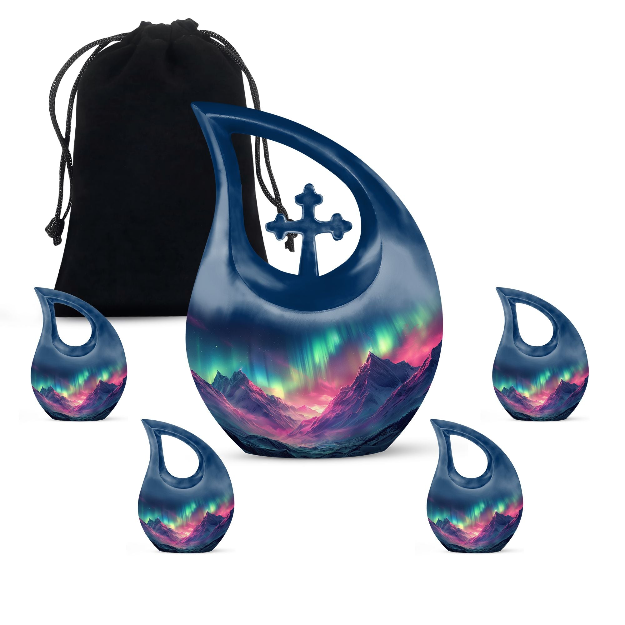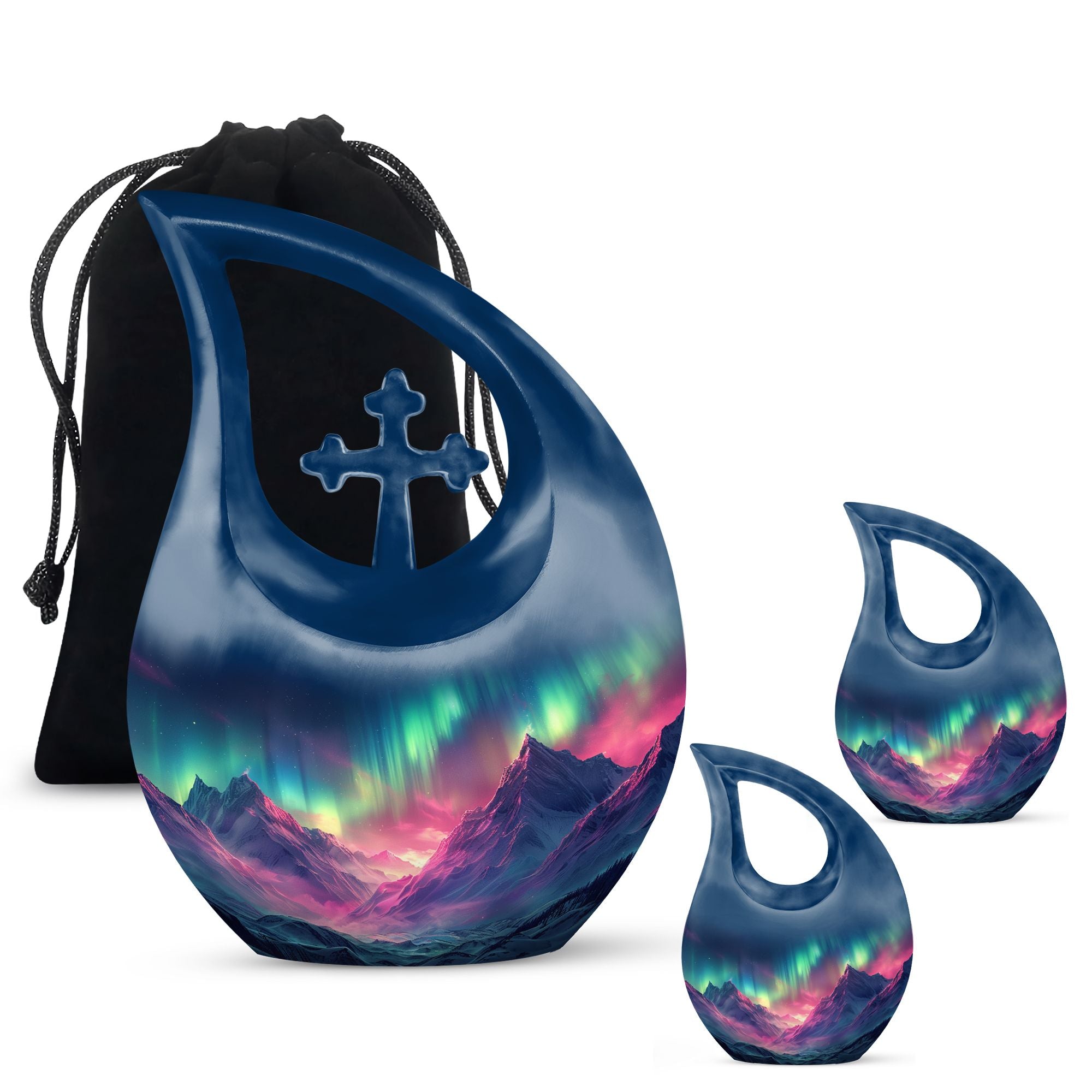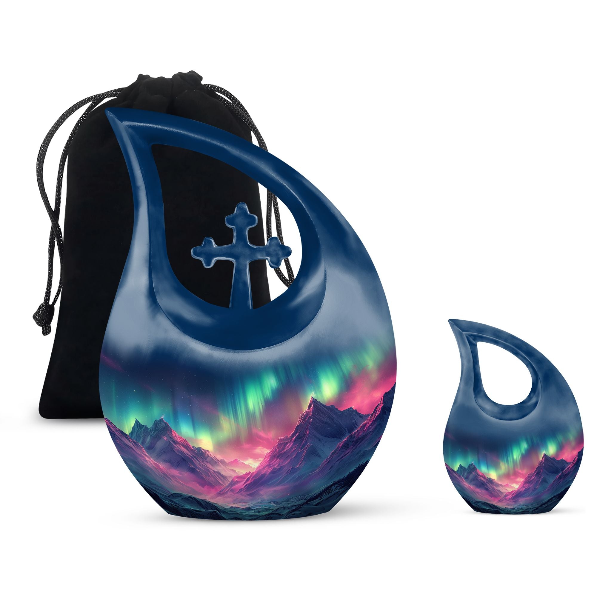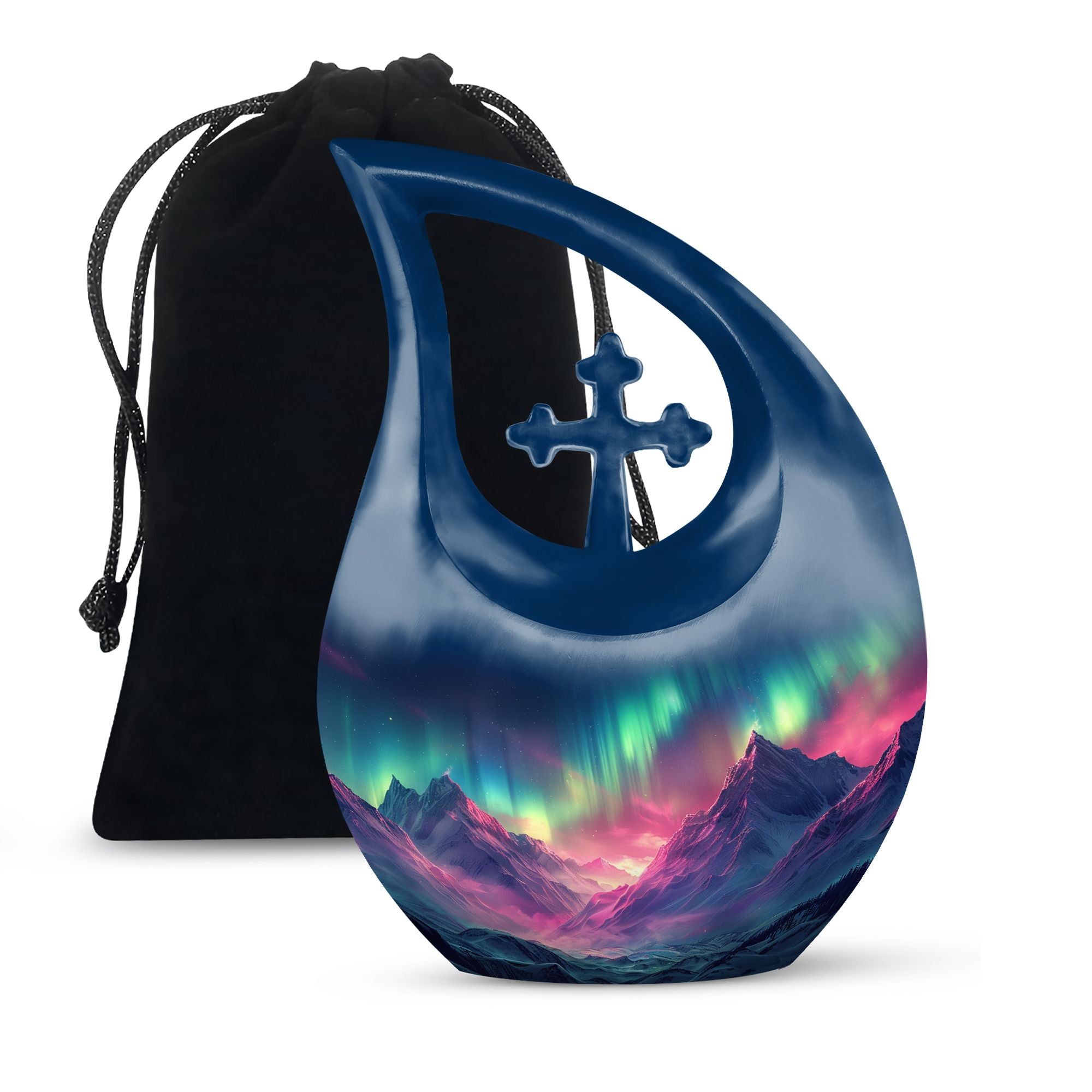 Immortalize the memory of your loved ones with the Arora Borealis Urn, a captivating and sublime choice from our collection of Personalized Urns For Ashes. Exquisitely crafted from sturdy aluminium, this large urn stands at 10 inches in height, weighing 3.3 pounds, and a size capable of holding up to 200 cubic inches of ashes. Its dramatic Cross Drop pattern distinctively reflects your tribute, echoing unique serenity. Inside the package, you'll find a velvety pouch to securely contain the ashes. We offer customization – make this memorial urn even more special by personalizing it with engraved names. Explore more options from our range, including Garden Urns For Ashes, Affordable Urns, Cremation Boxes, and Medium Urns. Thoughtful, encompassing, reverent – a respectful tribute to the departed.