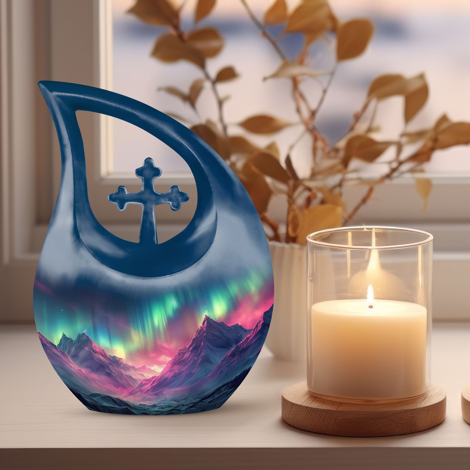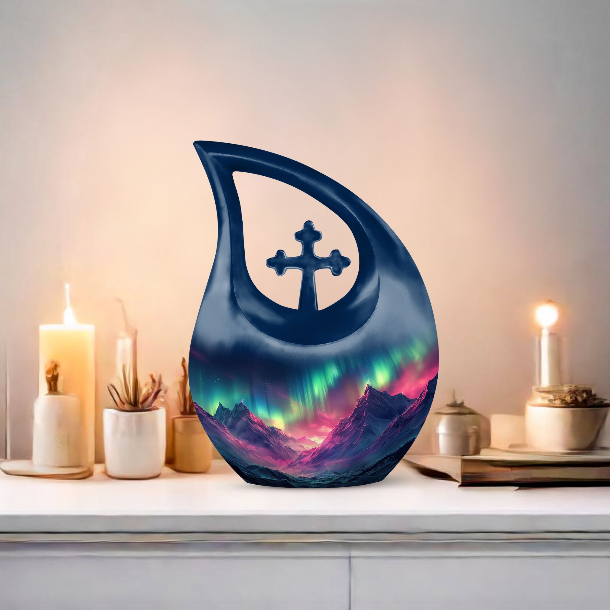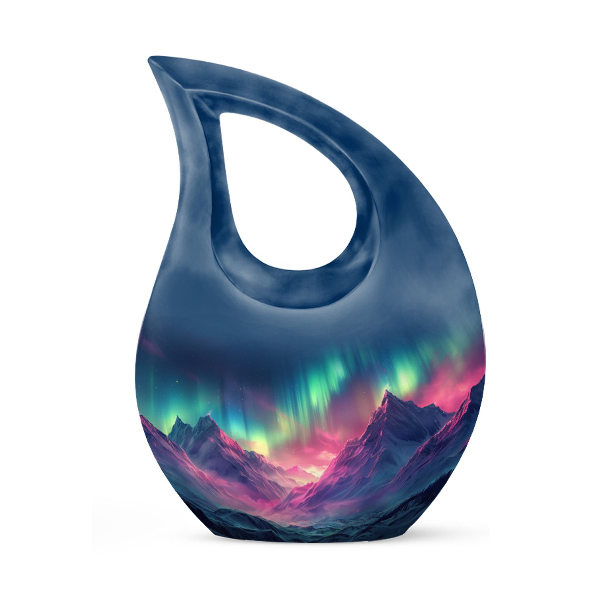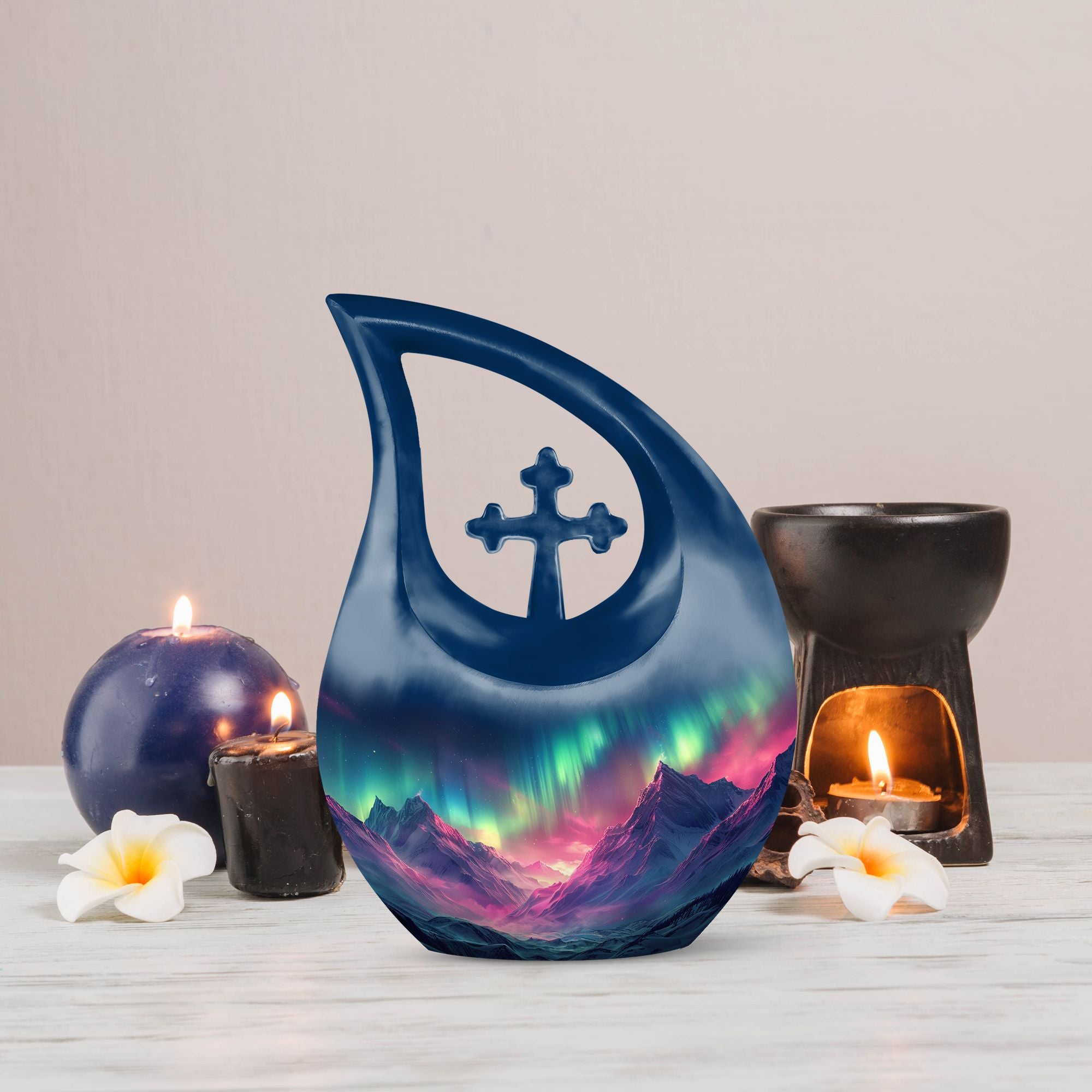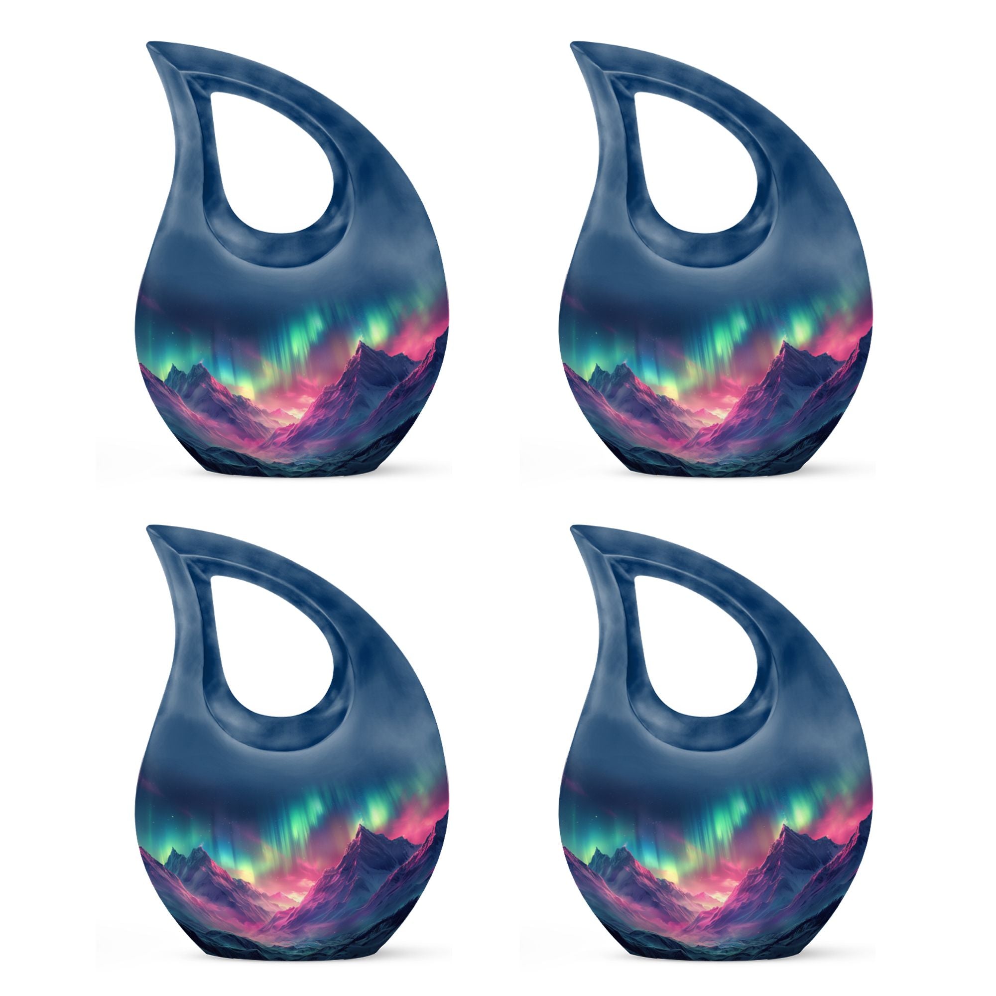 Immortalize the memory of your loved ones with the Arora Borealis Urn, a captivating and sublime choice from our collection of Personalized Urns For Ashes. Exquisitely crafted from sturdy aluminium, this large urn stands at 10 inches in height, weighing 3.3 pounds, and a size capable of holding up to 200 cubic inches of ashes. Its dramatic Cross Drop pattern distinctively reflects your tribute, echoing unique serenity. Inside the package, you'll find a velvety pouch to securely contain the ashes. We offer customization – make this memorial urn even more special by personalizing it with engraved names. Explore more options from our range, including Garden Urns For Ashes, Affordable Urns, Cremation Boxes, and Medium Urns. Thoughtful, encompassing, reverent – a respectful tribute to the departed.