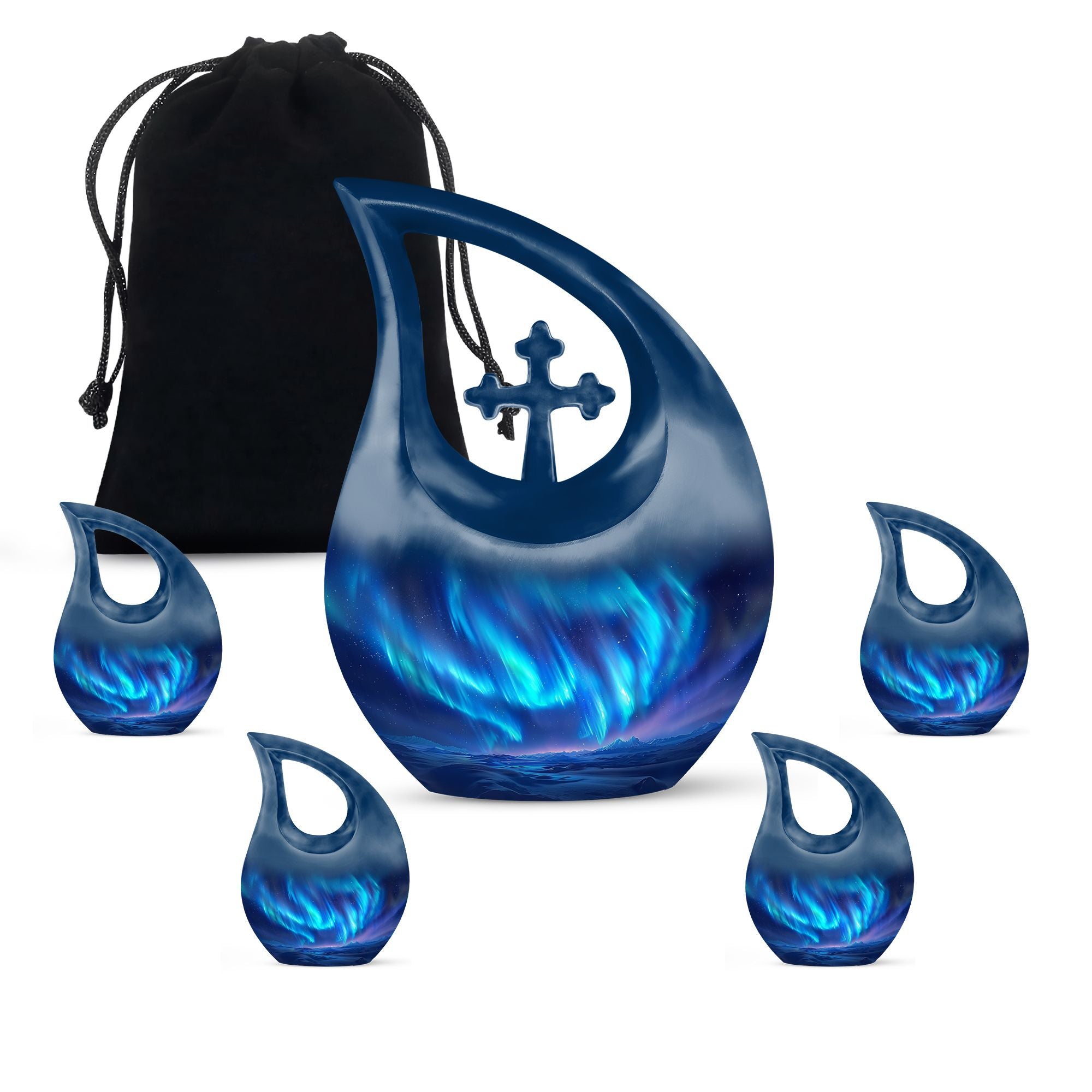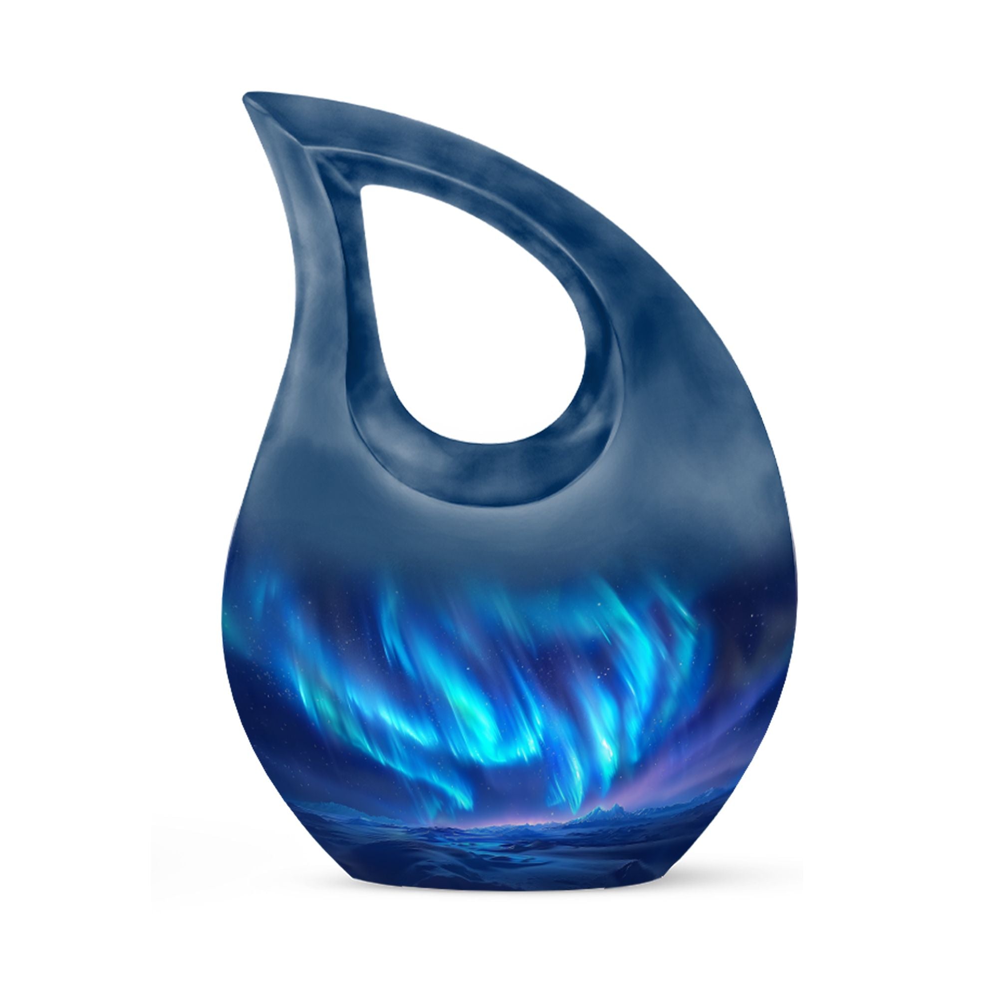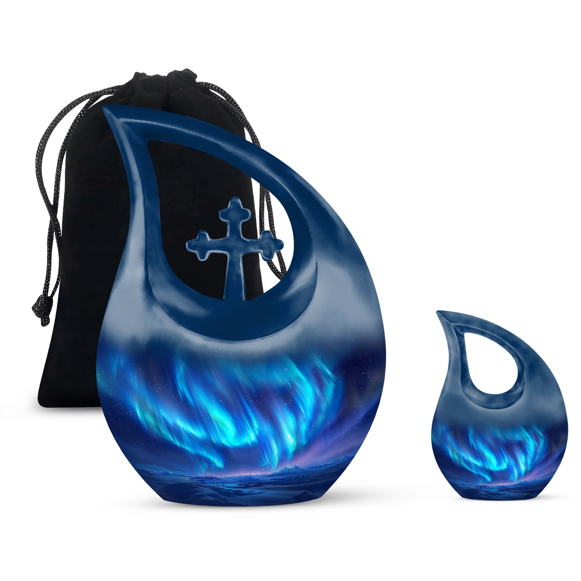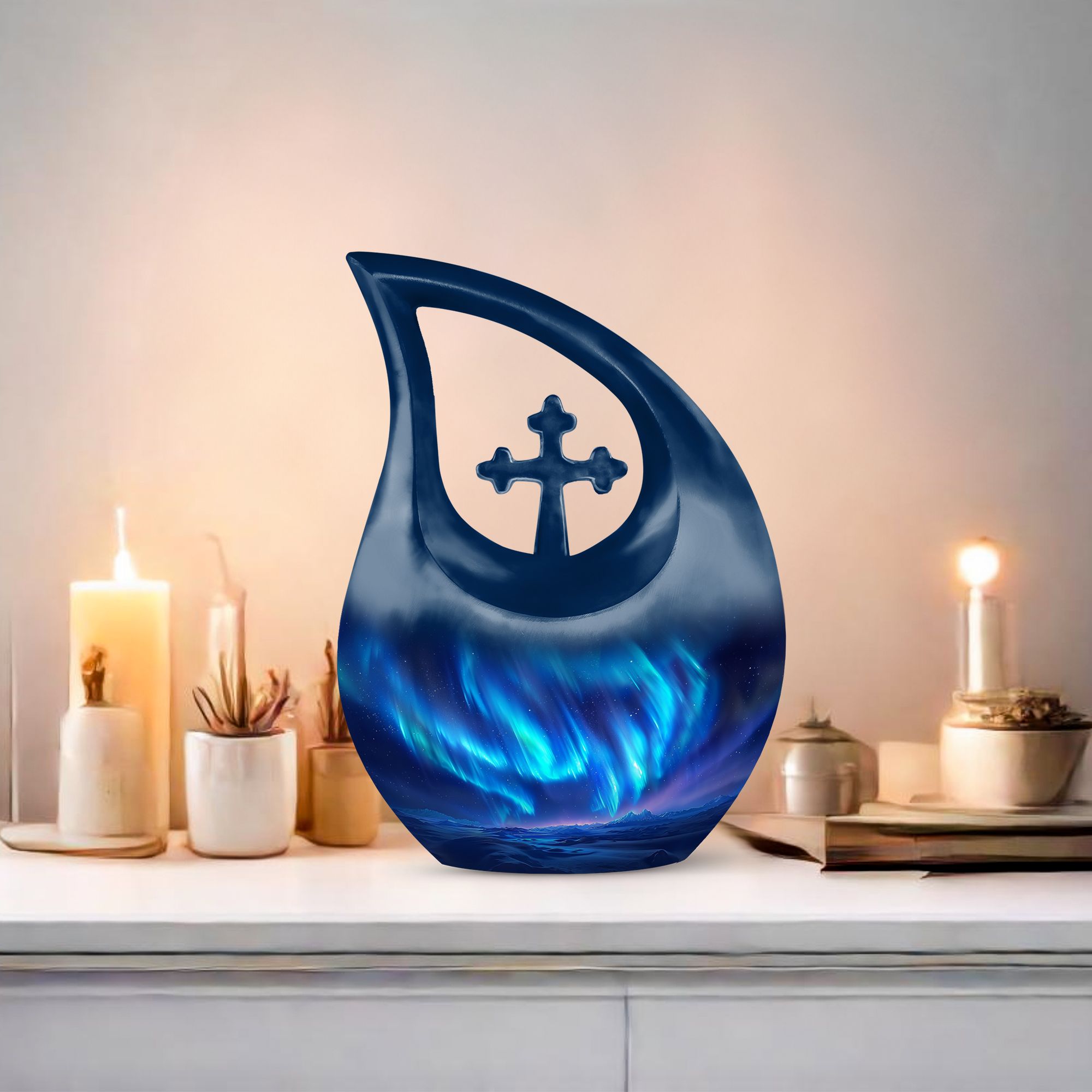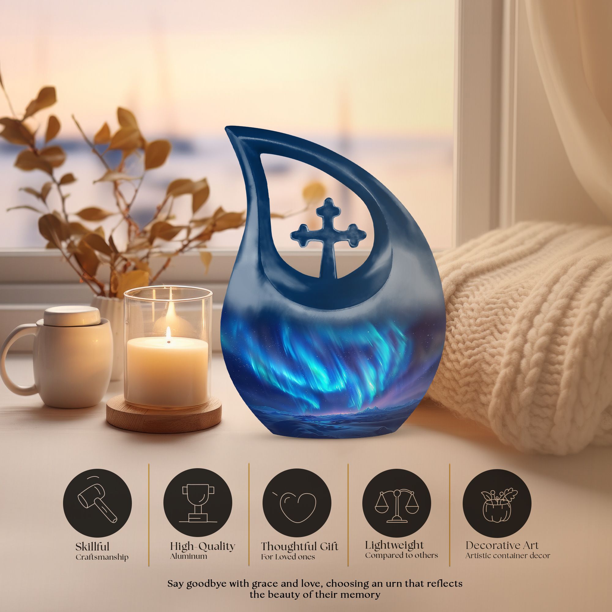 Experience the serenity and comfort with this magnificent Aurora Borealis Urn. An ideal choice among memorial urns, this Large Urn has an exclusive 'Cross Drop' Theme. Handcrafted with the finest aluminium, this urn measures 10 inches in height and weighs simply 3.3 pounds. It's Extra Large Urn size has a capacity of 200 cubic inches, ensuring ample space for containment of ashes, safely enveloped in a complementary velvet pouch. Add a personal touch by engraving names, making it custom made urns for ashes. Echoing hues of Aurora Borealis, this distinct metal cremation urn assures an honorable way to remember your departed loved ones. This masterpiece is exclusively available for those searching for high-quality ashes urns for sale that blend beauty, durability, and functionality differentiating it from quotidian memorials.