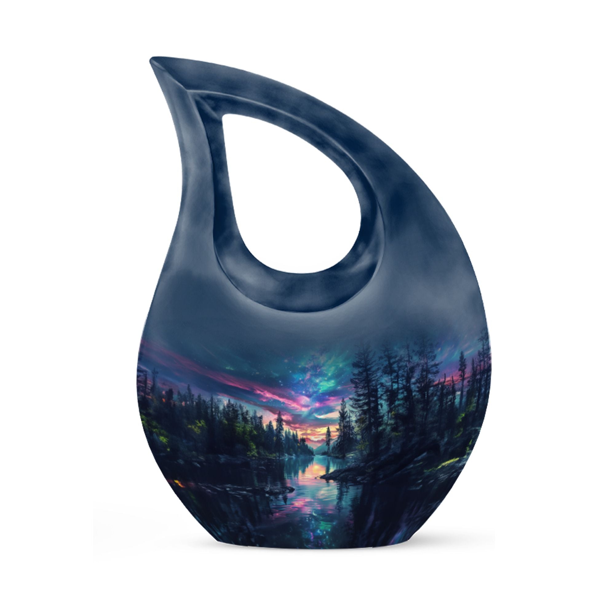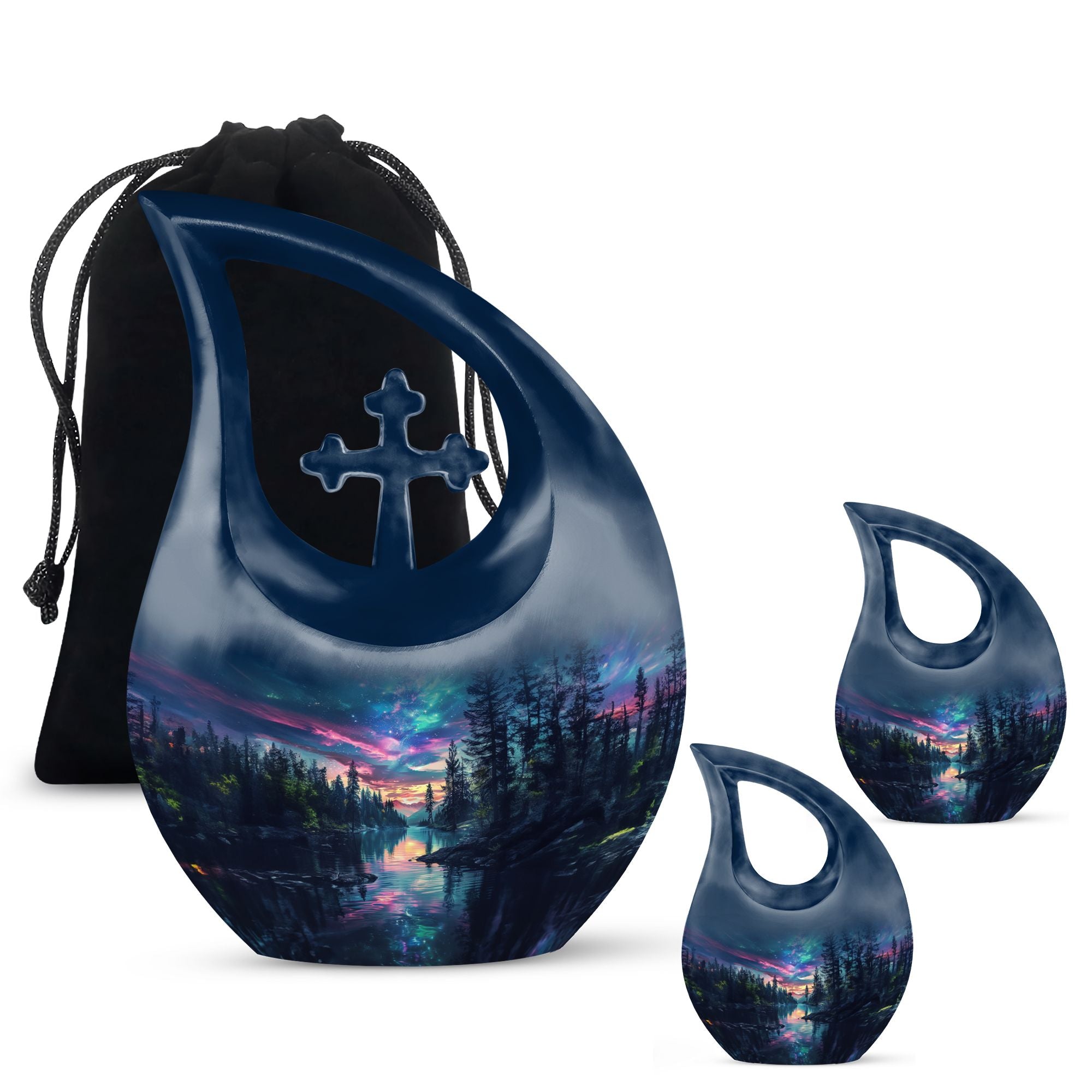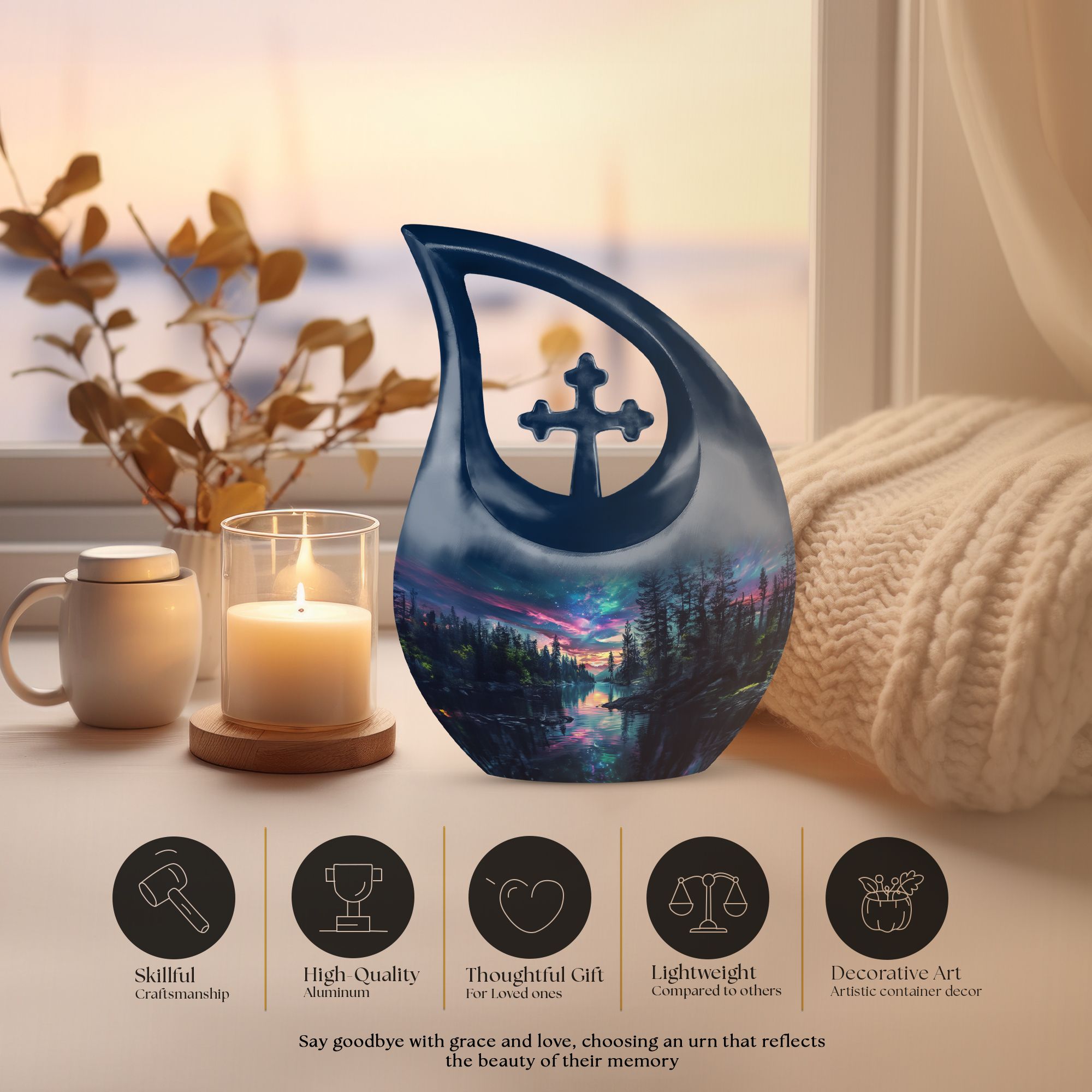 Immerse in the tranquil beauty of the Arora Borealis with this unique, Cross Drop designed urn. Crafted for adults, this 10-inch Large Urn provides a dignified and respectful method of memorializing your loved ones. Crafted from sturdy Aluminium, the urn weighs a substantial 3.3 pounds, reflecting its solid quality and unyielding strength. The urn has a generous capacity of 200 cubic inches, ensuring ample space for ashes. A special customization option allows you to personalize it with engraved names — a poignant touch to keep your departed loved one eternally close. For easy and secure containment of ashes, a velvet pouch is provided. Use this urn as an exceptional tribute to honor a remarkable life. Perfect for those searching for 'Urn For Ashes For Adults', 'memorial urns', 'Affordable Cremation Urns', or 'Small Urns For Ashes', this urn combines affordability with magnificence, exuding serenity and reverence.