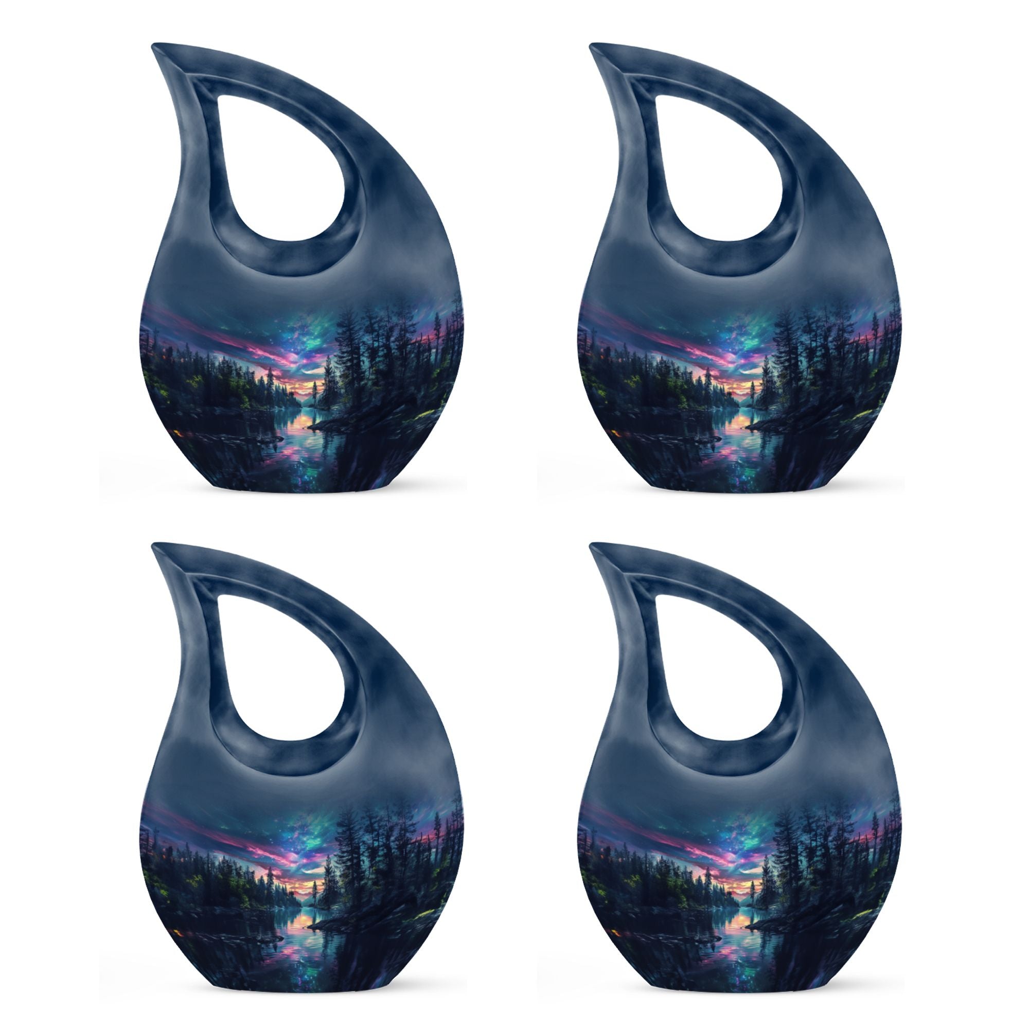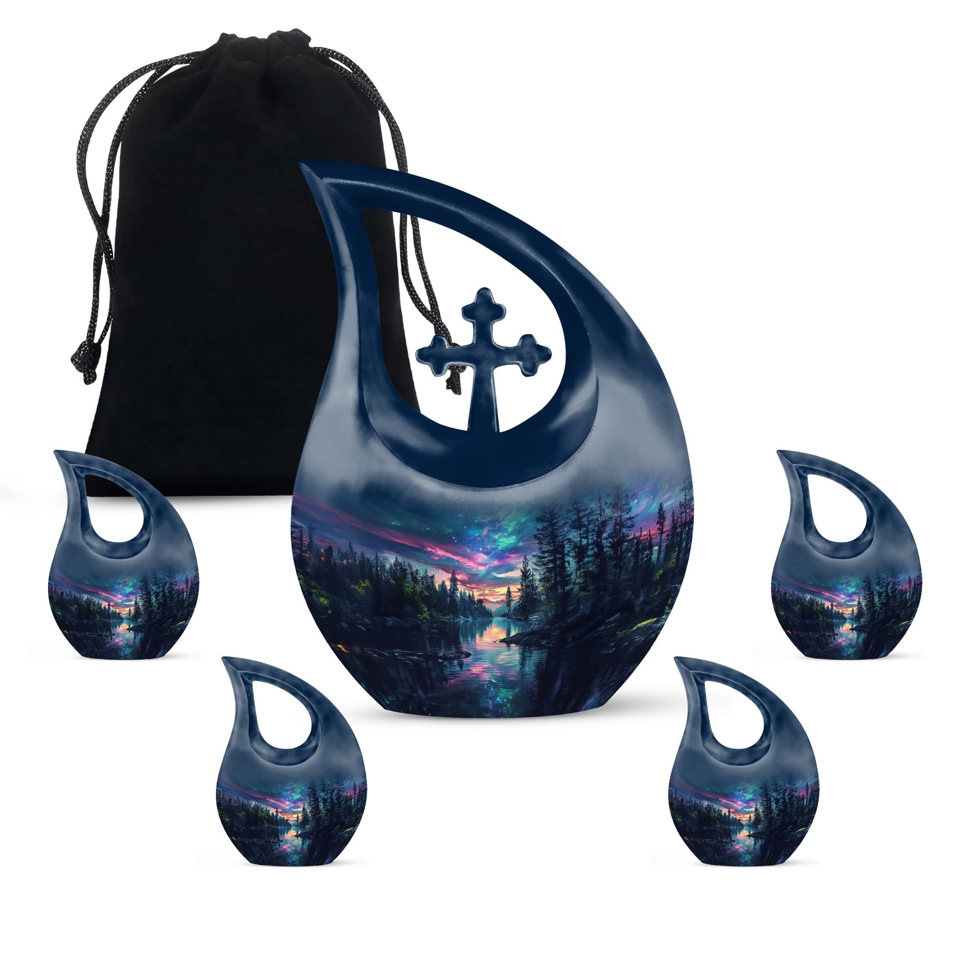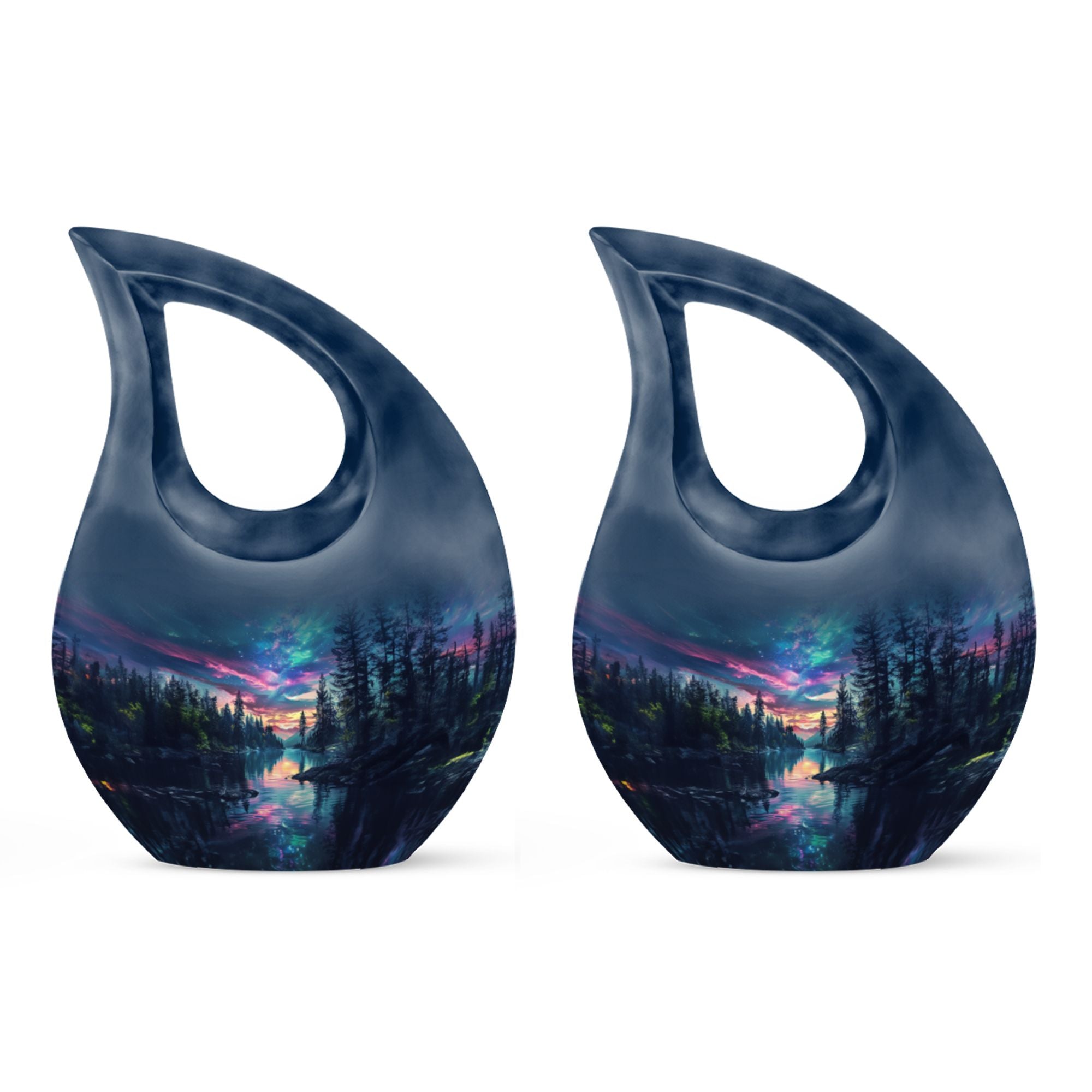 Immerse in the tranquil beauty of the Arora Borealis with this unique, Cross Drop designed urn. Crafted for adults, this 10-inch Large Urn provides a dignified and respectful method of memorializing your loved ones. Crafted from sturdy Aluminium, the urn weighs a substantial 3.3 pounds, reflecting its solid quality and unyielding strength. The urn has a generous capacity of 200 cubic inches, ensuring ample space for ashes. A special customization option allows you to personalize it with engraved names — a poignant touch to keep your departed loved one eternally close. For easy and secure containment of ashes, a velvet pouch is provided. Use this urn as an exceptional tribute to honor a remarkable life. Perfect for those searching for 'Urn For Ashes For Adults', 'memorial urns', 'Affordable Cremation Urns', or 'Small Urns For Ashes', this urn combines affordability with magnificence, exuding serenity and reverence.