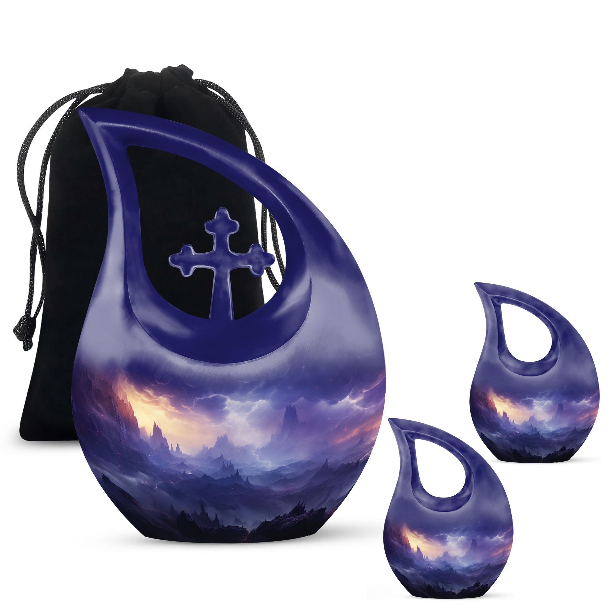 Commemorate your dearly departed with our elegantly designed Aurora Urn, a large-scale receptacle for preserving the dignity of your loved ones. Crafted from high-quality aluminium, this 10-inch urn is not only solid and lasting but also has an appealing 'Cross Drop' theme resonating with the sanctity of life and passage. Purposefully created to hold approximately 200 cubic inches of ashes, it weighs a substantial 3.3 pounds, ensuring stability and a respectful presence in your memorial space. The urn comes with a premium velvet pouch for respectful containment and safekeeping. But that's not all. Our Aurora Urn also offers a personalized touch with the option to engrave names, truly making it a unique token of remembrance. This urn is ideal for those seeking 'Double Urns for Human Ashes', or 'Urns for Women's Ashes'. Also perfect as a 'Cremation Box for Ashes' or a 'Medium Sized Urn for Human Ashes', it stands as a poignant tribute to your past loved ones.