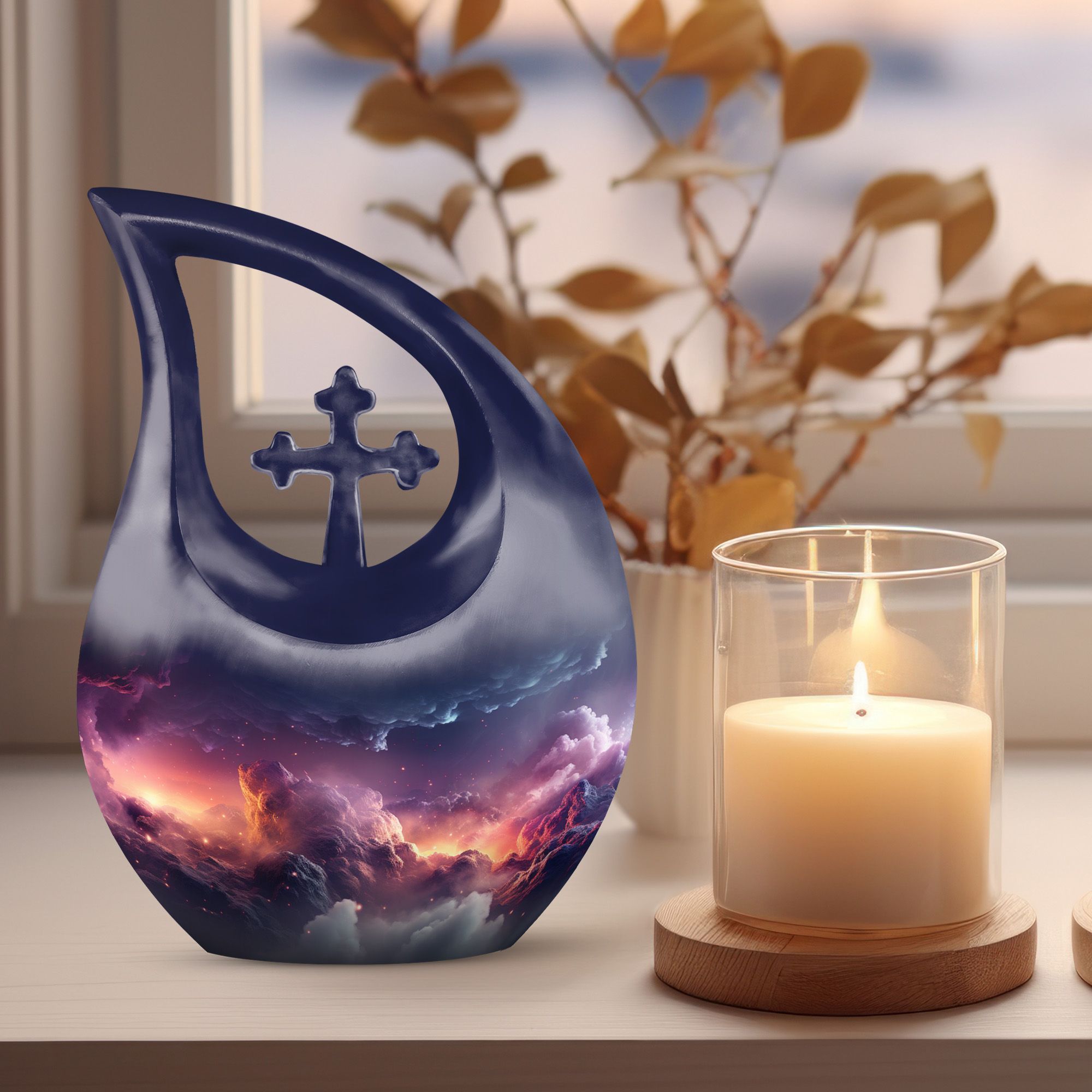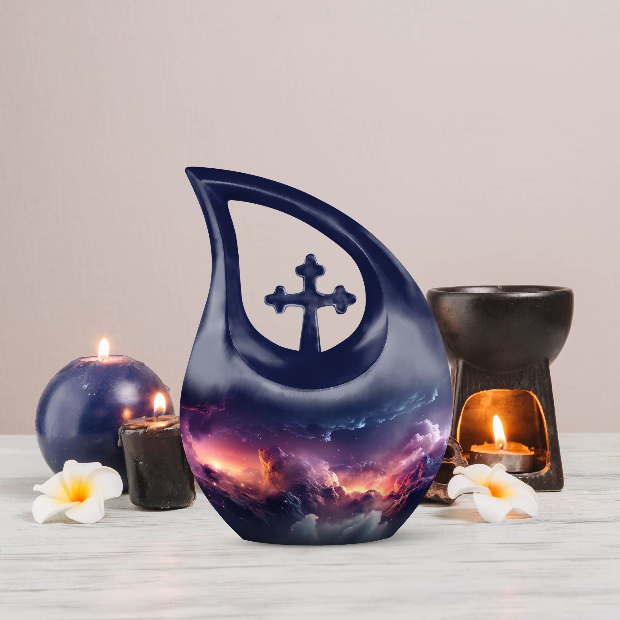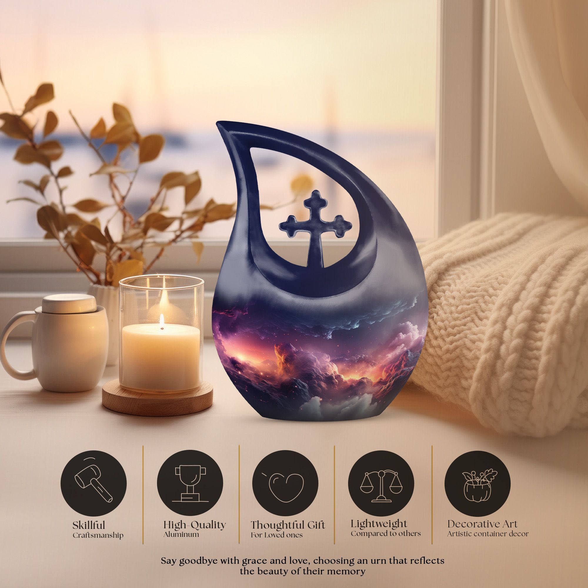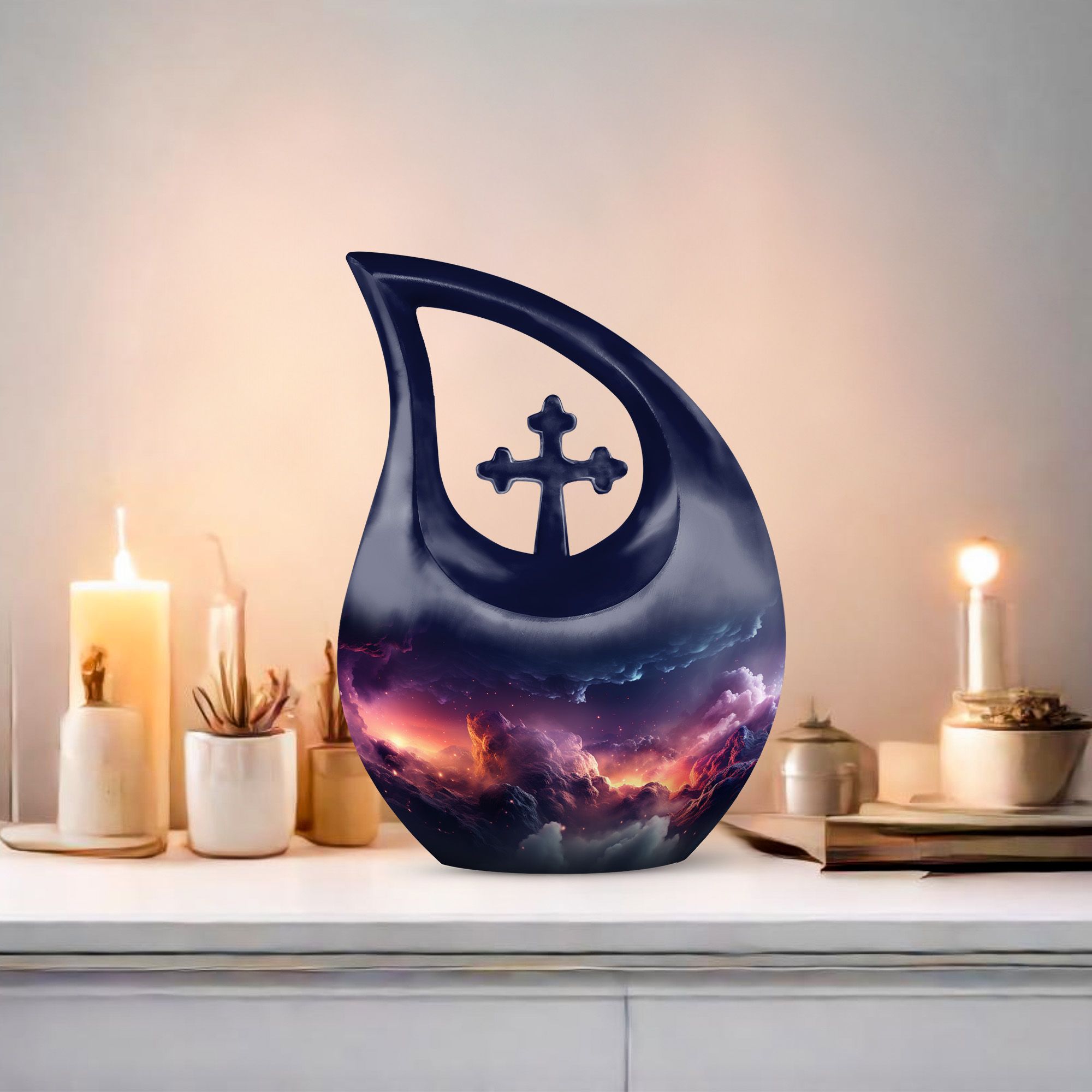 Cherish and commemorate your loved ones with the 'Aurora Urn'. Known for its 'Cross Drop' design, these tasteful keepsake cremation urns are a blend of high-quality craftsmanship and enduring elegance. Sized at 10 Inches with a weight of 3.3 pounds, the urn is built substantial and strong. The capacity of these large urns is 200 cubic inches, making it suitable to hold a considerable amount of ashes with dignity. The aluminium material enhances durability while balancing a solemn beauty. Your purchase also includes a velvet pouch, ensuring careful containment of the ashes. Personalize these cremation urns for human ashes through an engraving option, lending a personal touch to celebrate the unique life of your loved one. So, while looking for memorial urns, your search ends here with our 'Aurora Urn'. Ideal for those wanting cremation boxes or custom urns that stand out, settling on these expensive urns ensures ultimate satisfaction.