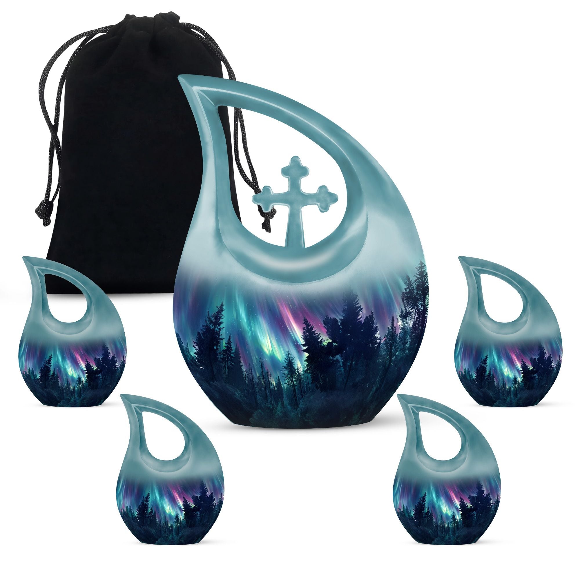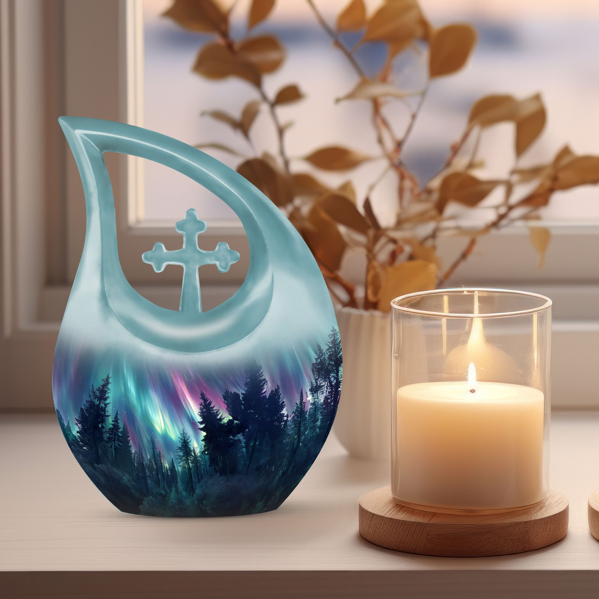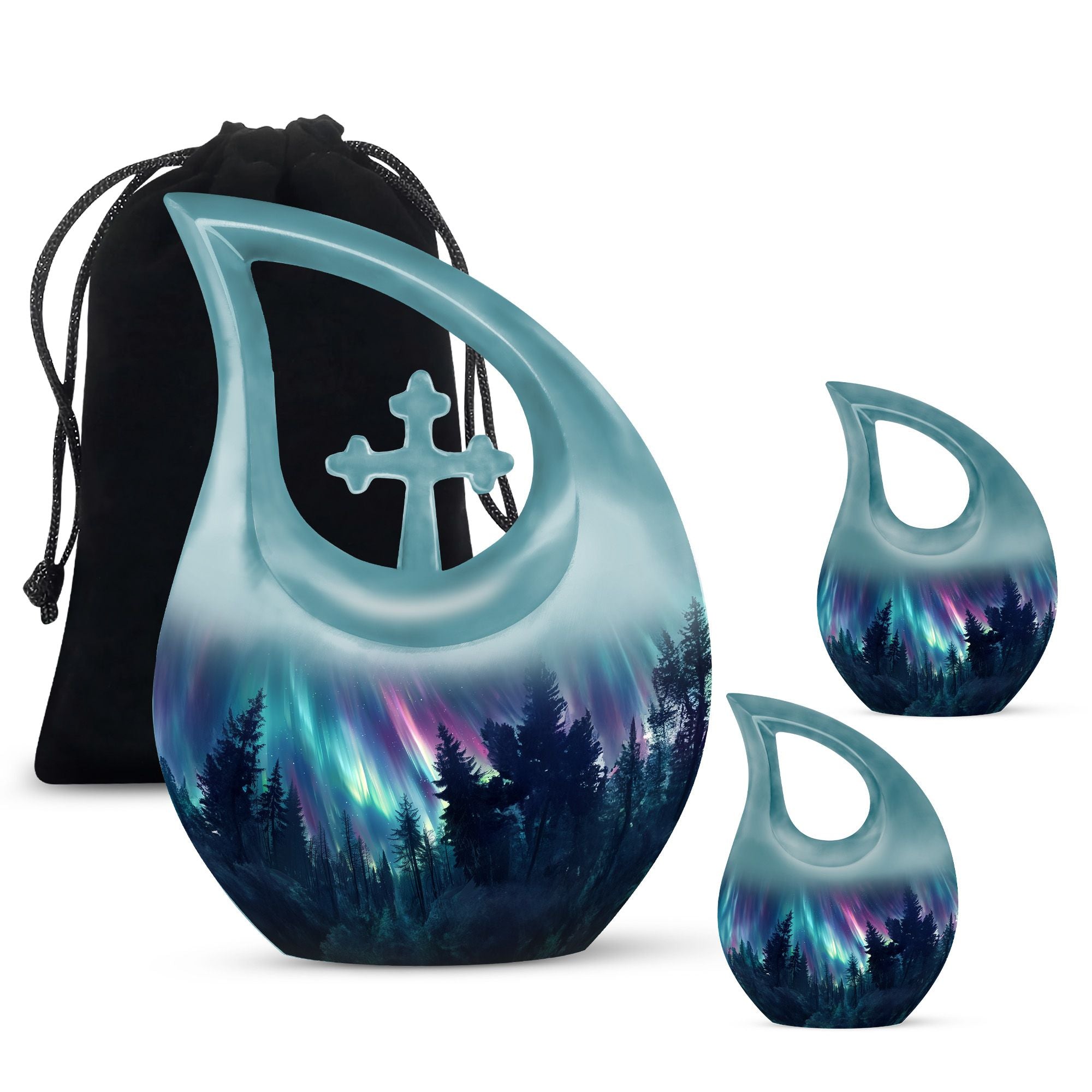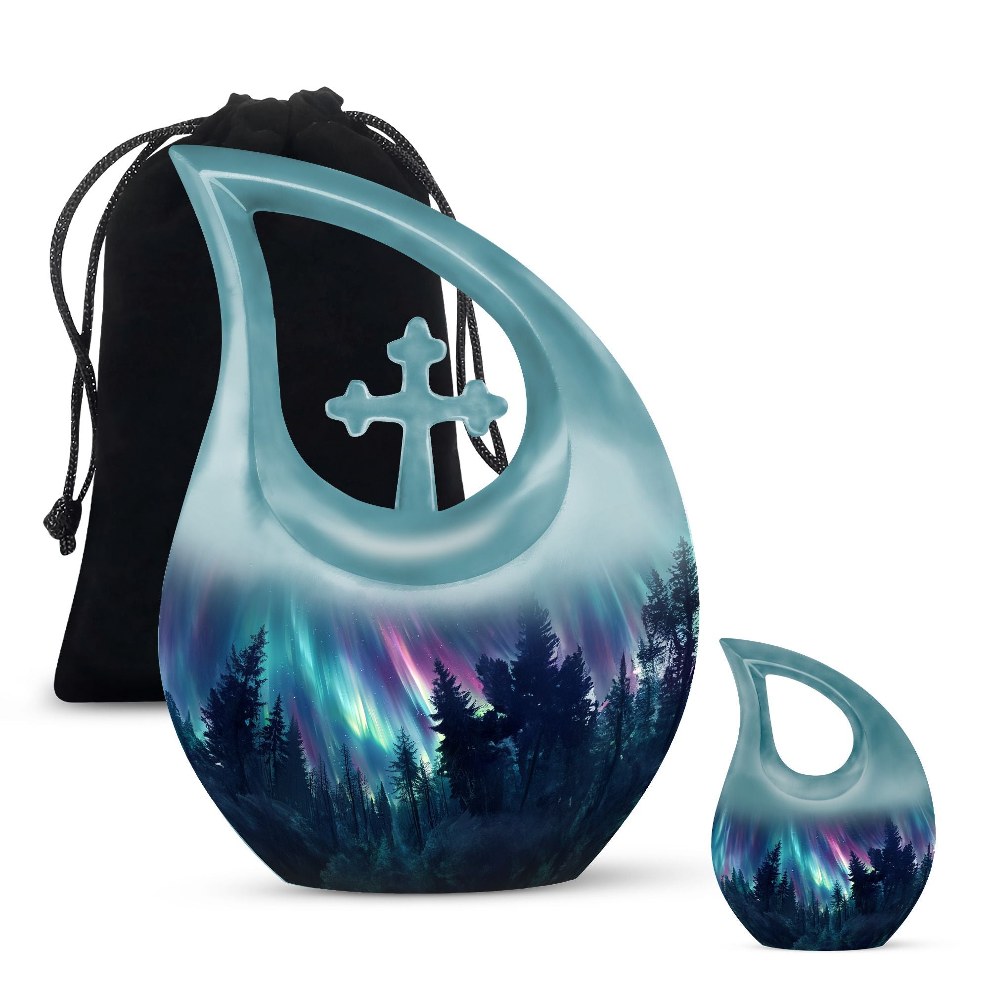 As a beacon of peace and tranquility, the Aurora Urn bridges time-honored tradition with a touch of modernity. This magnificent 10-inch artifact, aptly described as a contemporary zenith in memorial urns, weighs a comfortable 3.3 pounds. Crafted with meticulous precision from robust aluminium, it strikes a careful balance between longevity and elegance. The Cross Drop theme befits an urn designed to serve as an eternal abode. With a generous capacity of 200 cubic inches, it spaciously accommodates ashes of your beloved, making it an ideal choice among large urns. A complimentary velvet pouch ushers in a graceful method of containment, reinforcing the aura of respect and dignity these modern urns for ashes emanate. As a sublime personal touch, the urn welcomes you to etch engraved names, creating an intimate space for remembrance. Perfectly suited for commemorating angels, mothers, and other dear departed, it shines as a stellar example among burial and remembrance urns for ashes.