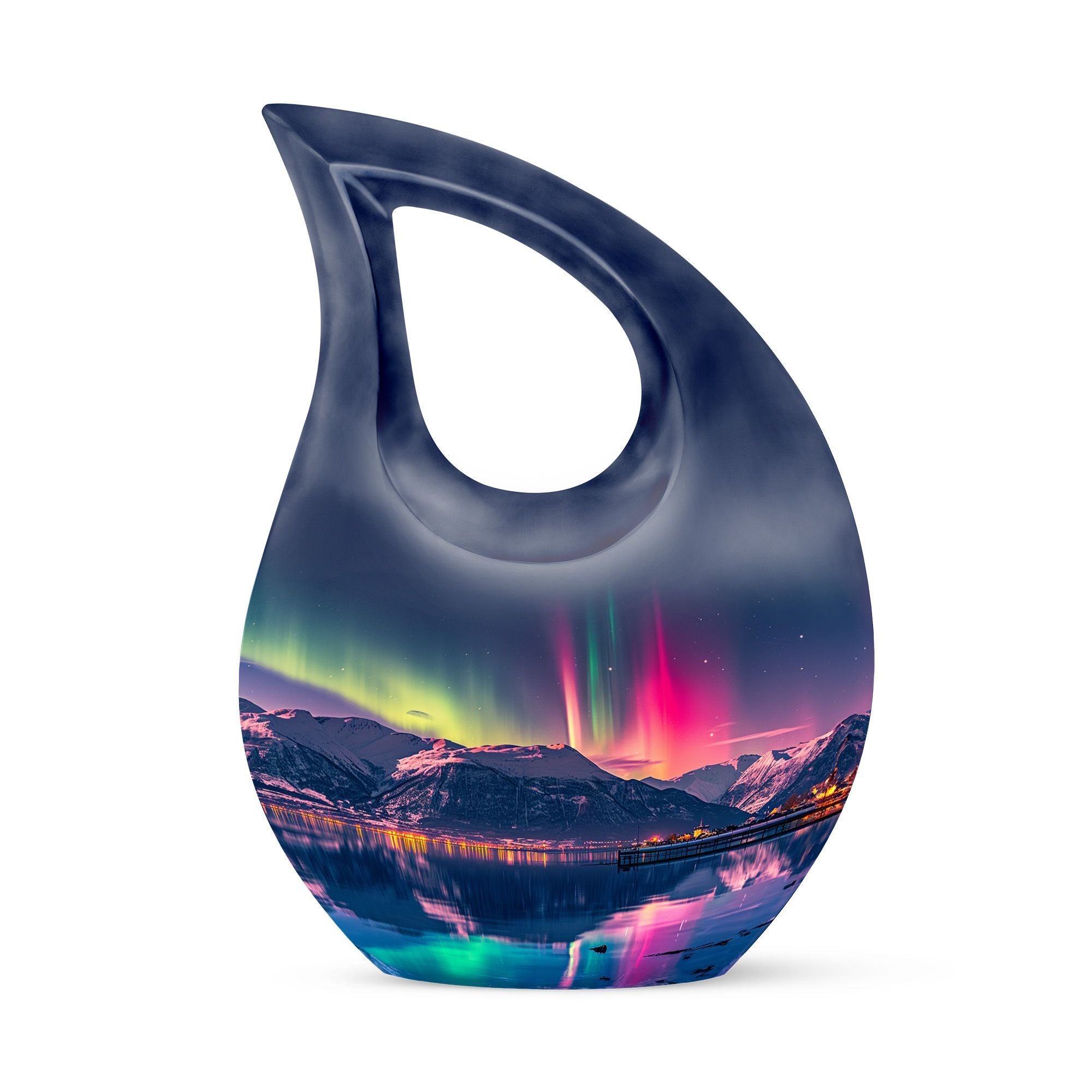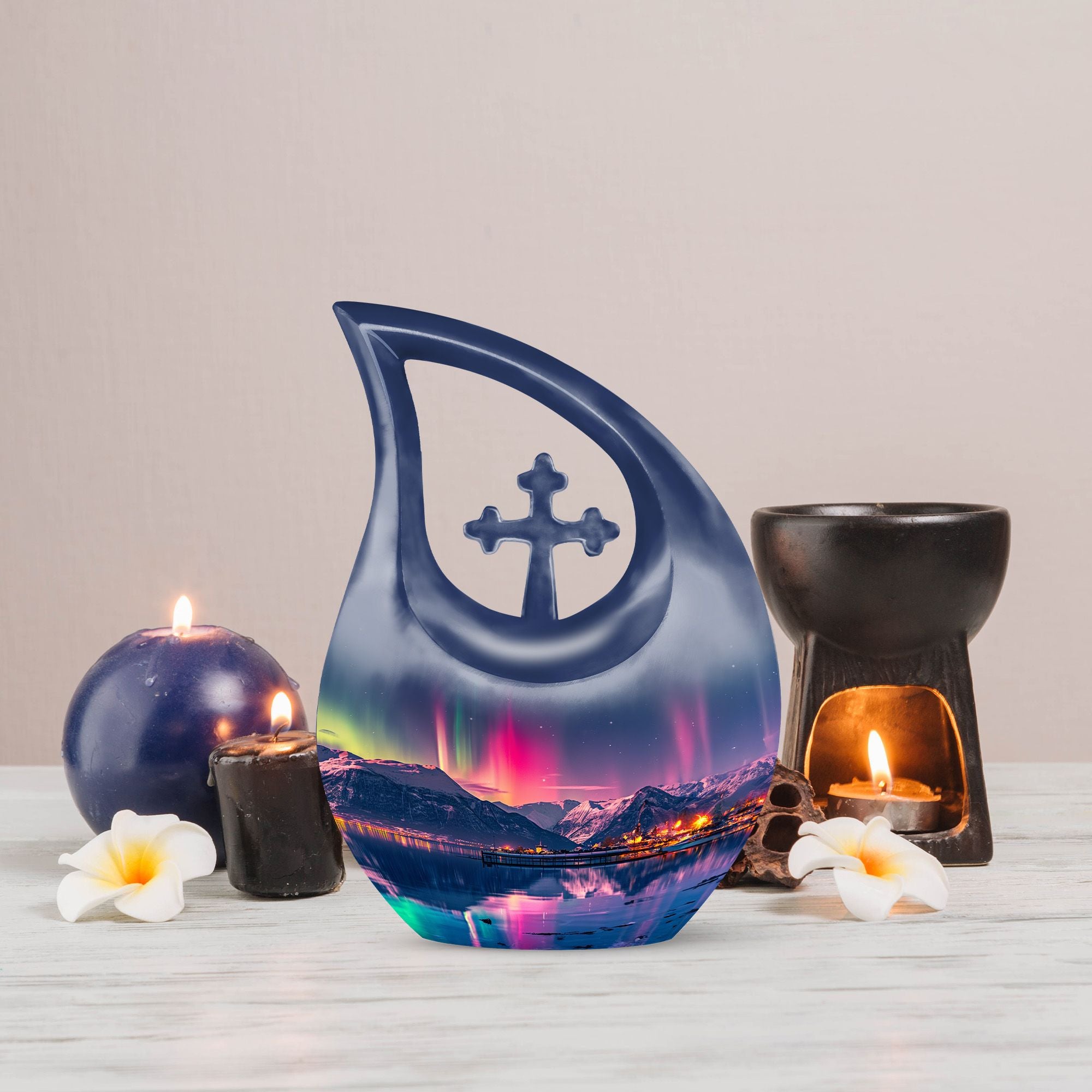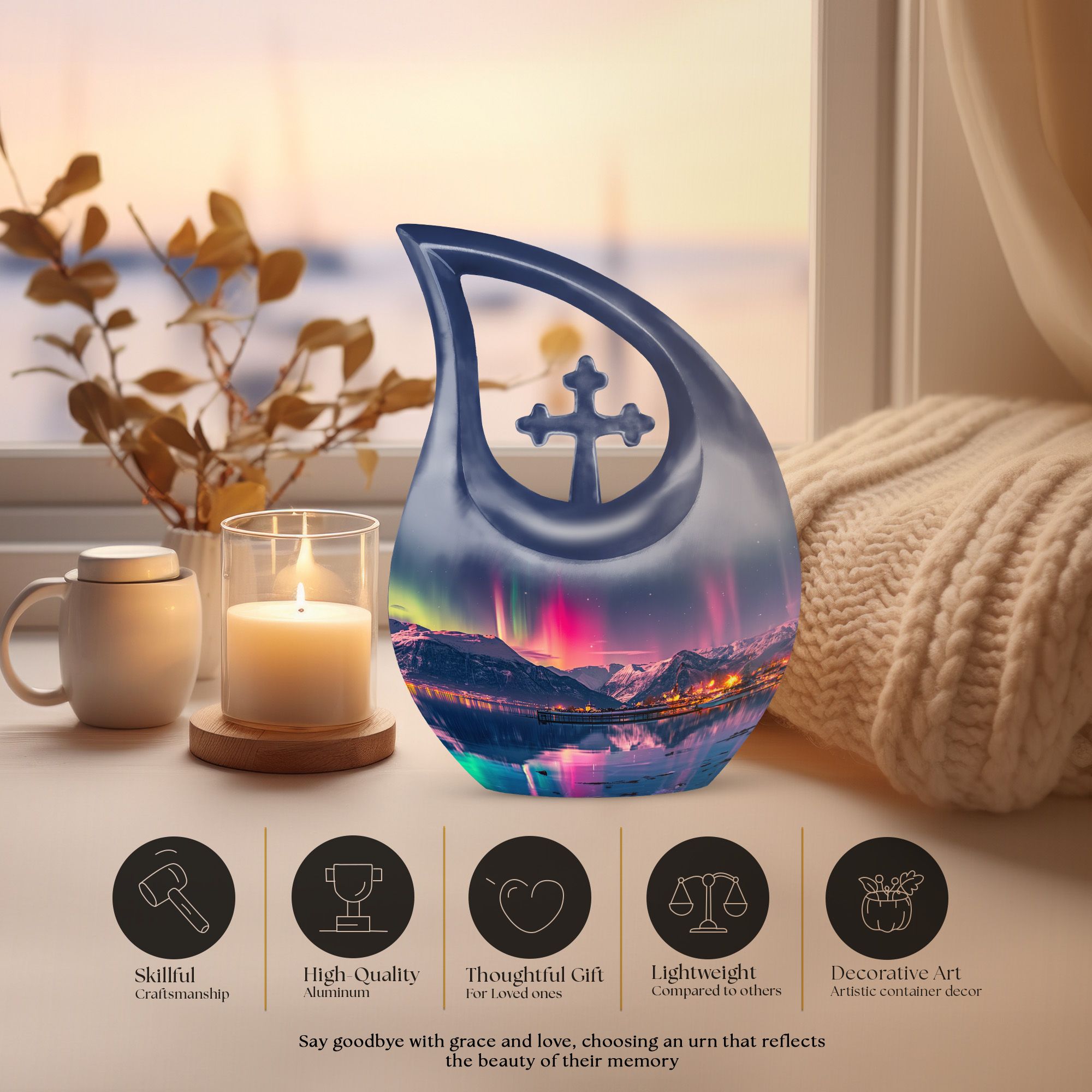 Immerse in a gentle remembrance of your loved ones with our 'Aurora Urn', a symbol of beauty and tranquillity. This meticulously crafted, 10-inch Aluminium urn provides a comforting reminder of the joyous life lived. It carries a weight of 3.3 pounds and has a generous capacity of 200 cubic inches. The 'Cross Drop' urn design provides a unique homage to your beloved one. Add a profound touch of connection with the option to personalize, enabling you to engrave names on it. The package also includes a velvet pouch for discreet containment of the ashes. Large, sublime, and affordable, these urns are more than a container - a token of love for cremated remains. Warm outdoor remembrance or intimate indoor memorial, this urn leaves an enduring, personal touch. For those searching 'memorial urns' or 'cremation urns for human ashes', 'Aurora Urn' brings a serene sense of closure.