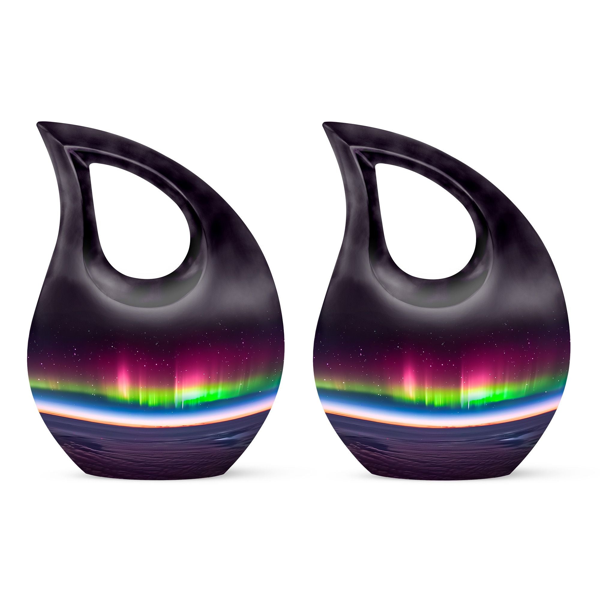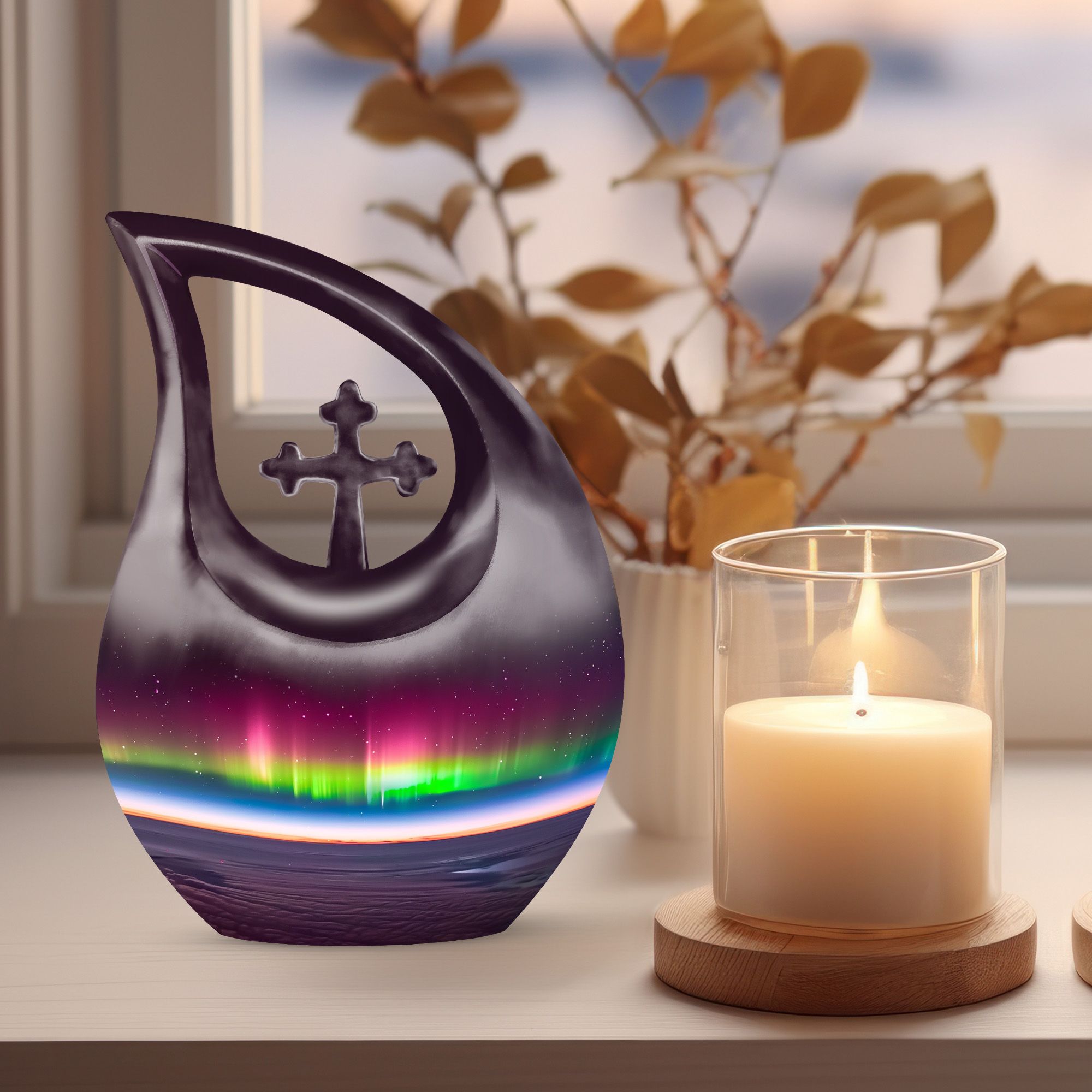 The Aurora Urn is a fitting tribute for your beloved ones, bridging the gap between aesthetics and emotional consolation. With its 10-inch stature, it's crafted to comfortably hold 200 cubic inches of ashes. Forged from robust aluminium, the urn balances durability with an elegant 'Cross Drop' theme representing an unwavering faith. This Large Urn, purposely made for the containment of human ashes, is exceptional in terms of capacity, ensuring the entirety of mortal residue gets a dignified enclosure. With each urn, an accompanying velvet pouch gracefully secures the ashes, subtly enhancing the sanctity of cherished memories. The ability to personalize with engraved names adds a unique touch to this memorial urn, making it a distinct emblem of remembrance. Consider this urn, not just as a simple ashes container, but as a priceless vessel of love, respect, and remembrance. Uncommonly beautiful, the Aurora Urn is more than just an inexpensive urn for mom; it's a testament to an everlasting bond.