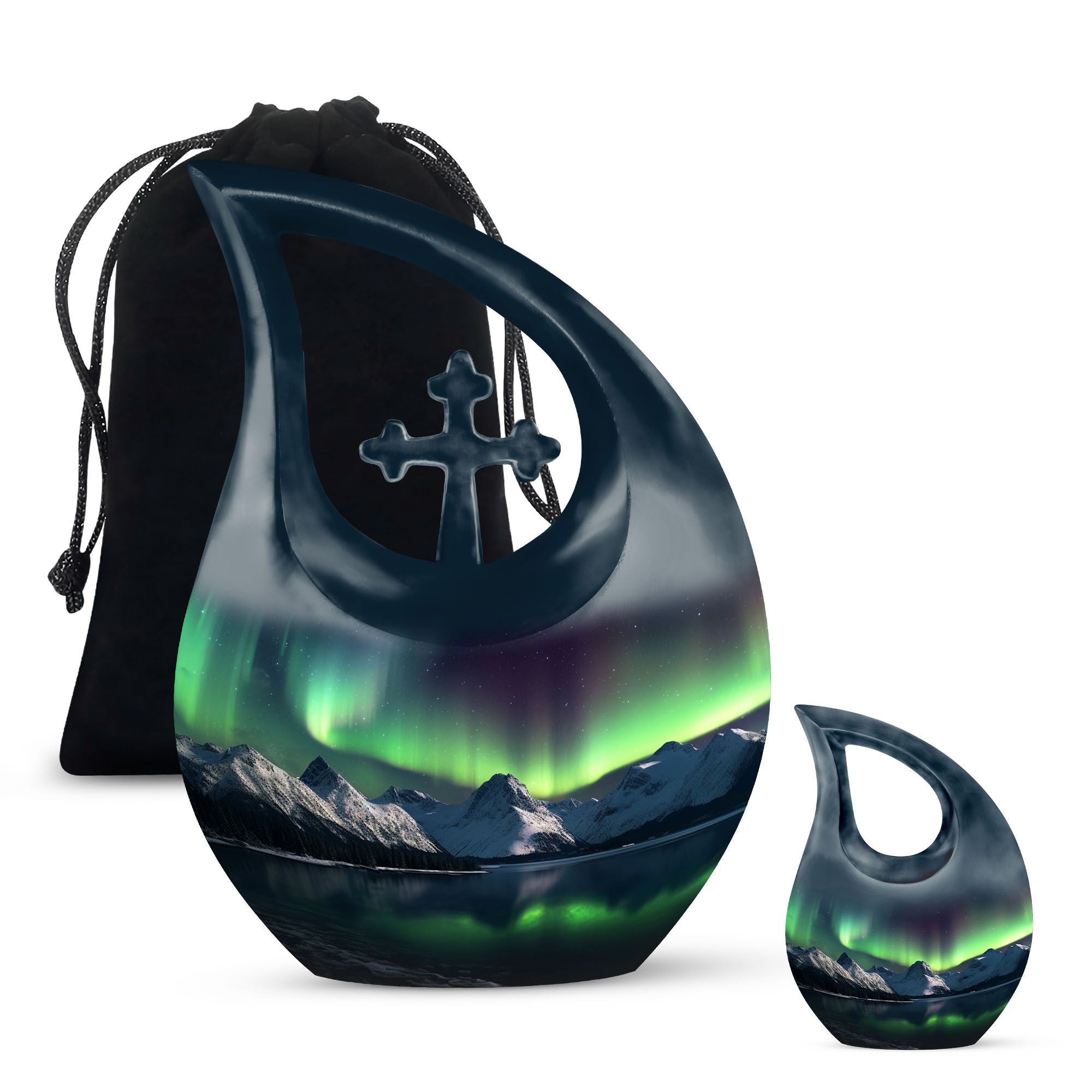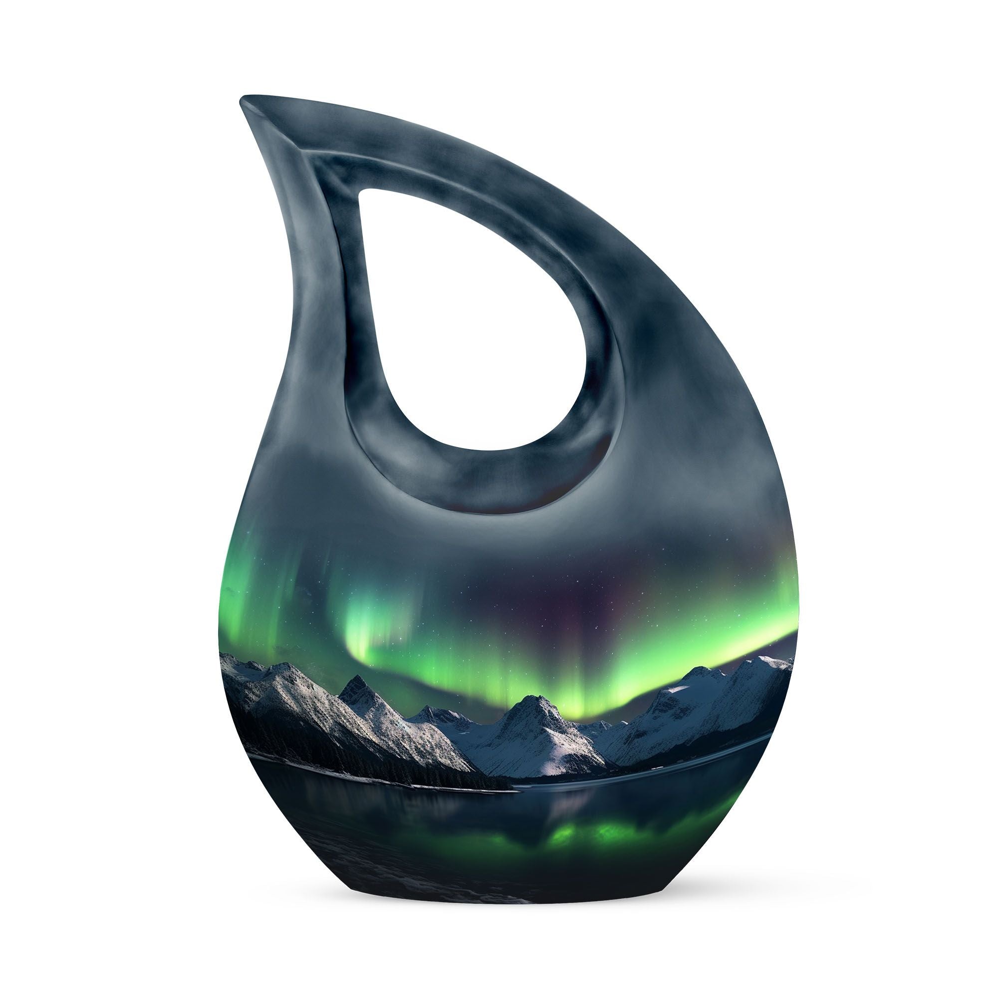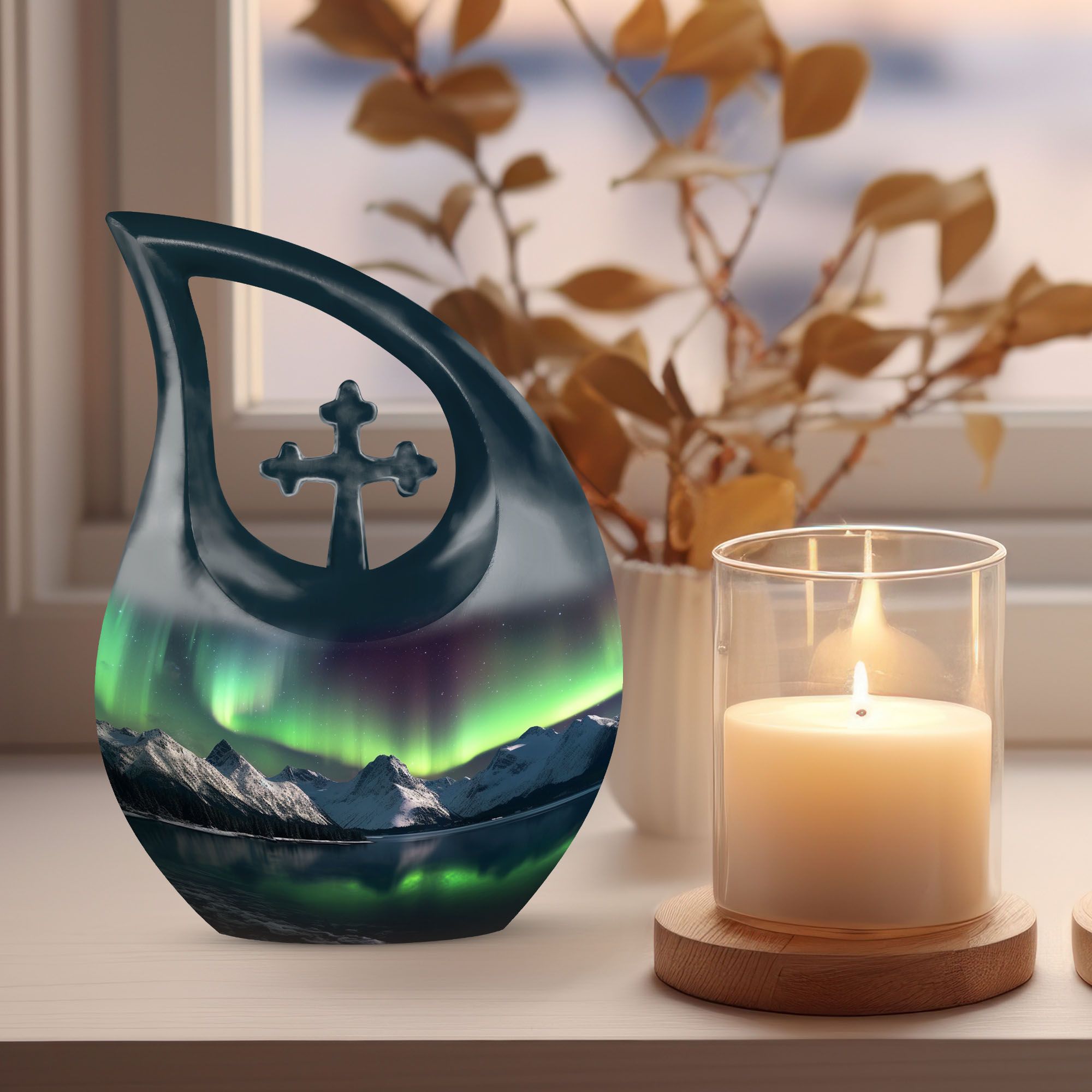 The Aurora Borealis Funeral Urn for Mother reflects the beauty of a soul forever remembered beneath the tranquil glow of the northern lights. Designed with compassion and care, this funeral urn for women serves as a graceful tribute to a beloved mother, wife, or friend. Its snowy mountain design and ethereal colors symbolize peace, love, and the eternal bond that continues to shine through cherished memories.
