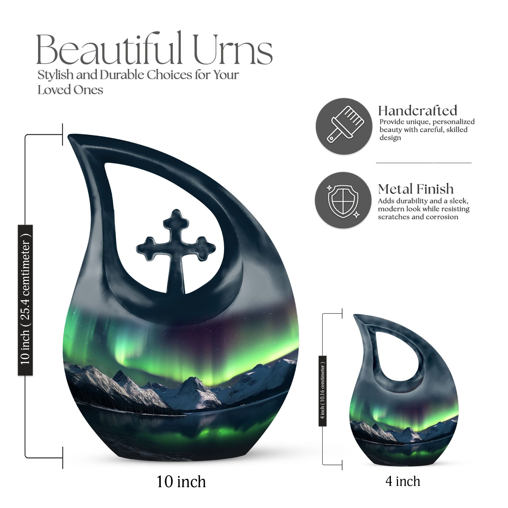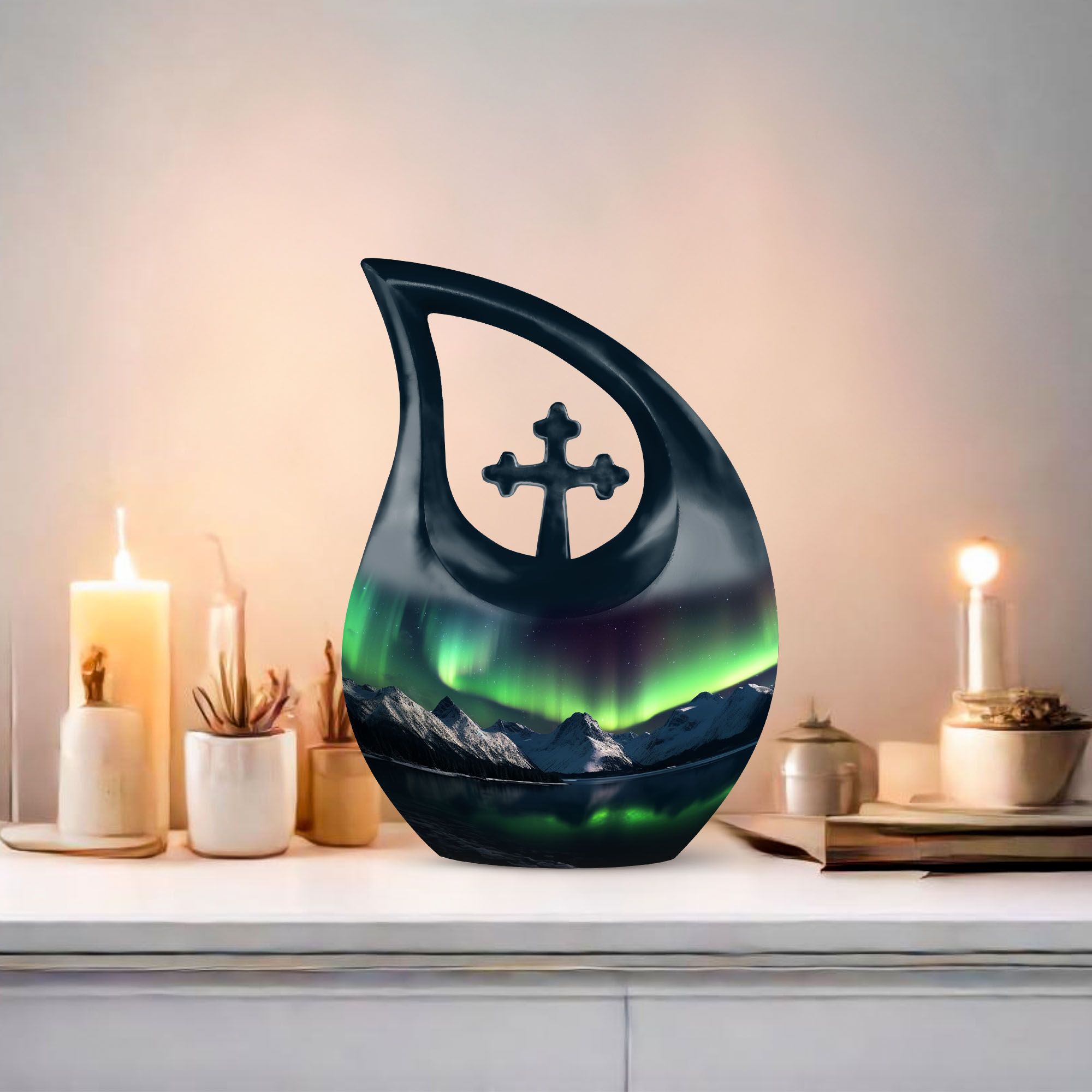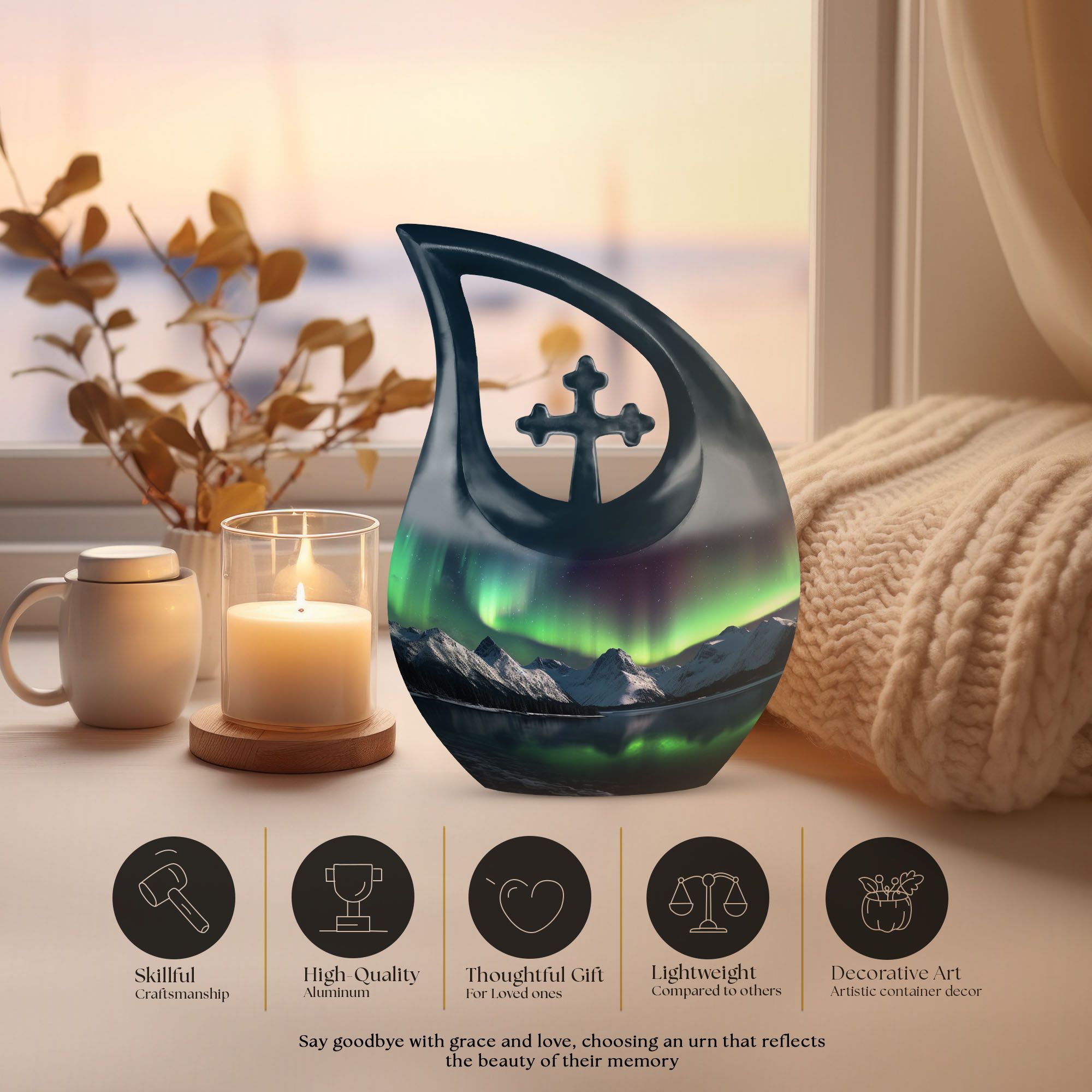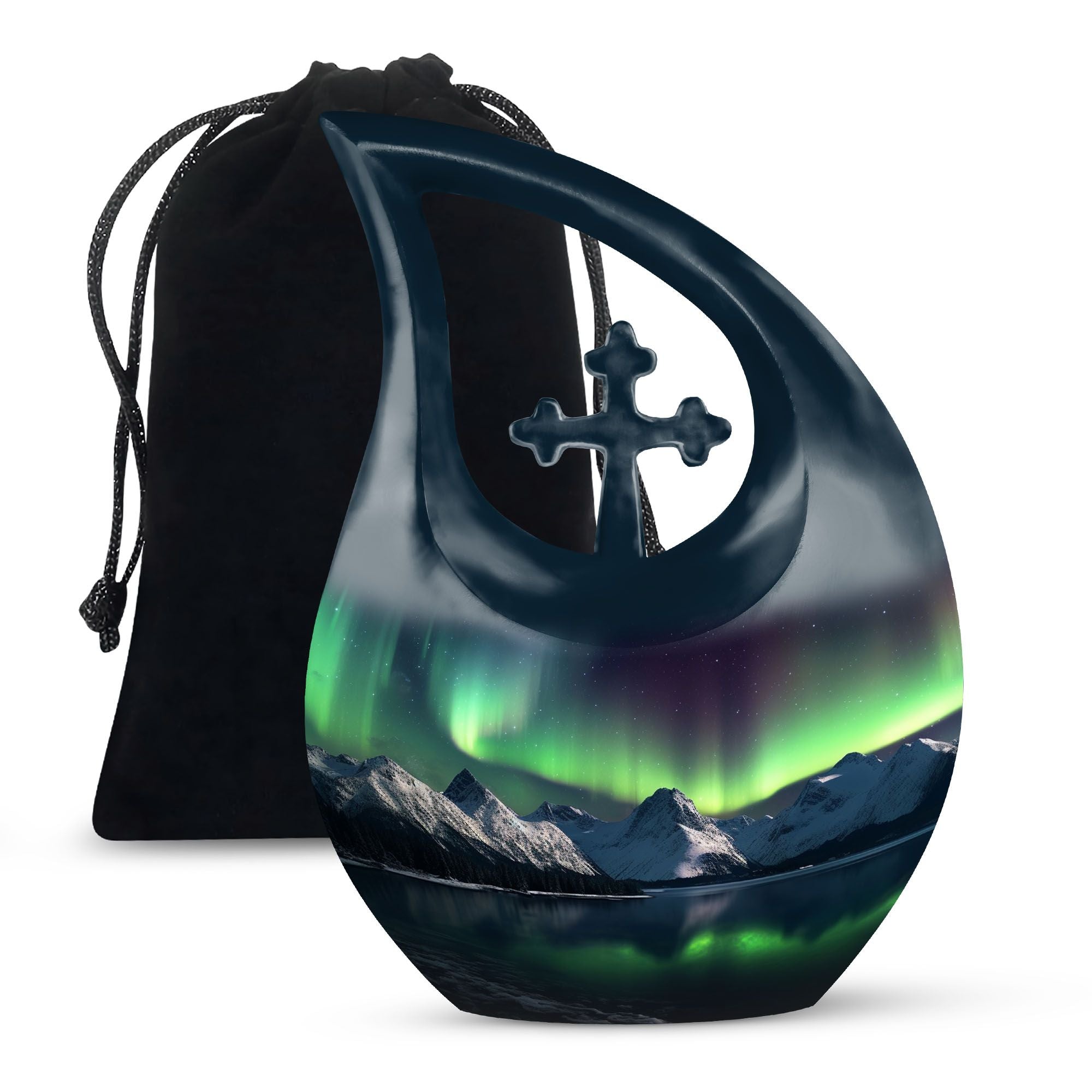 The Aurora Borealis Funeral Urn for Mother reflects the beauty of a soul forever remembered beneath the tranquil glow of the northern lights. Designed with compassion and care, this funeral urn for women serves as a graceful tribute to a beloved mother, wife, or friend. Its snowy mountain design and ethereal colors symbolize peace, love, and the eternal bond that continues to shine through cherished memories.
