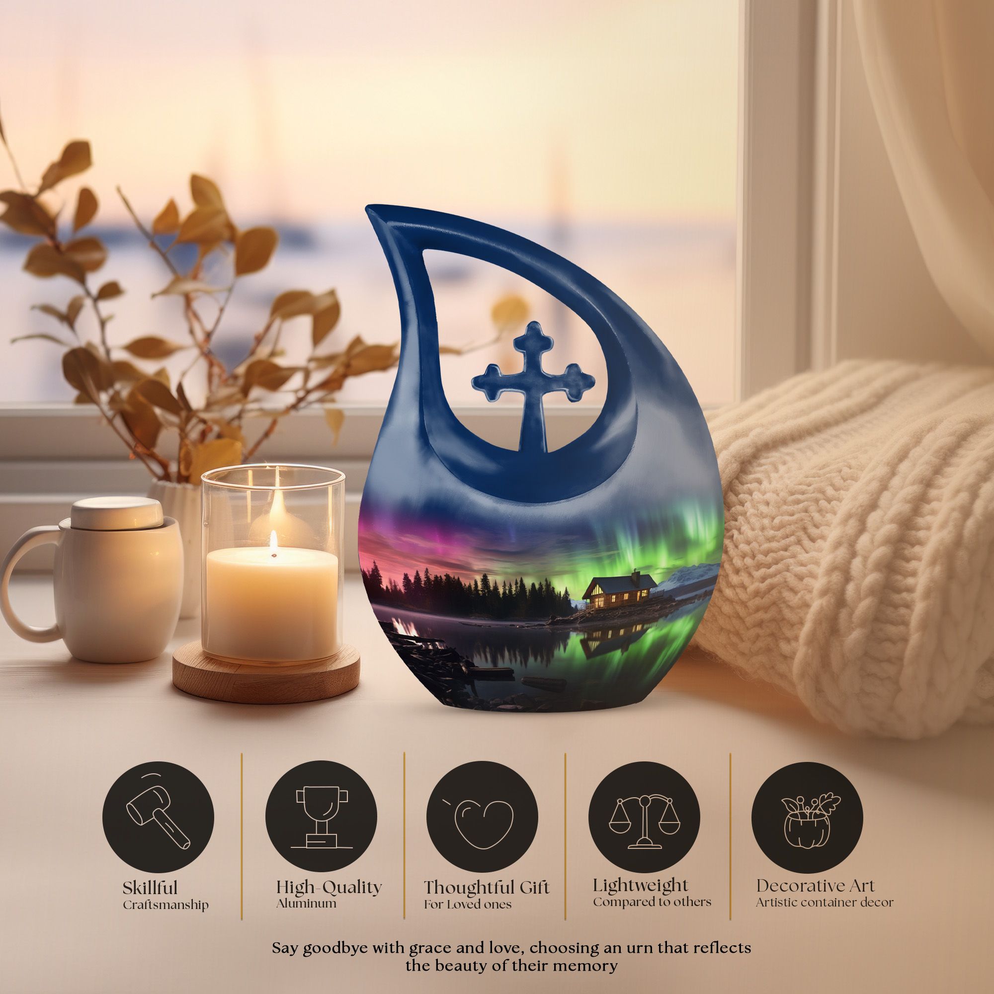 Crafted from durable aluminum, this 10 inch urn features shimmering aurora hues dancing across a serene landscape, symbolizing peace, guidance, and enduring love. Its secure screw-top lid ensures long-lasting protection, making it suitable as a funeral urn, a funeral adult urn, or a classic funeral urn ashes display. This design also supports needs for cremation urns large & small combo sets or small funeral urns for shared remembrance. Families looking for funeral urns for human ashes small or funeral cremation options will appreciate the versatility and elegant appearance of this celestial memorial.