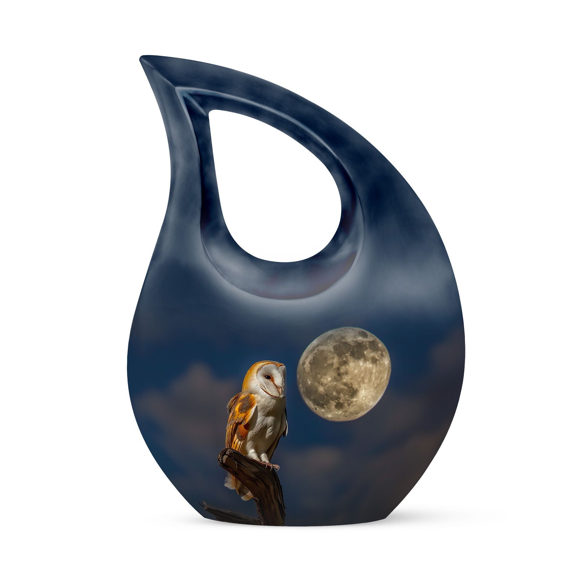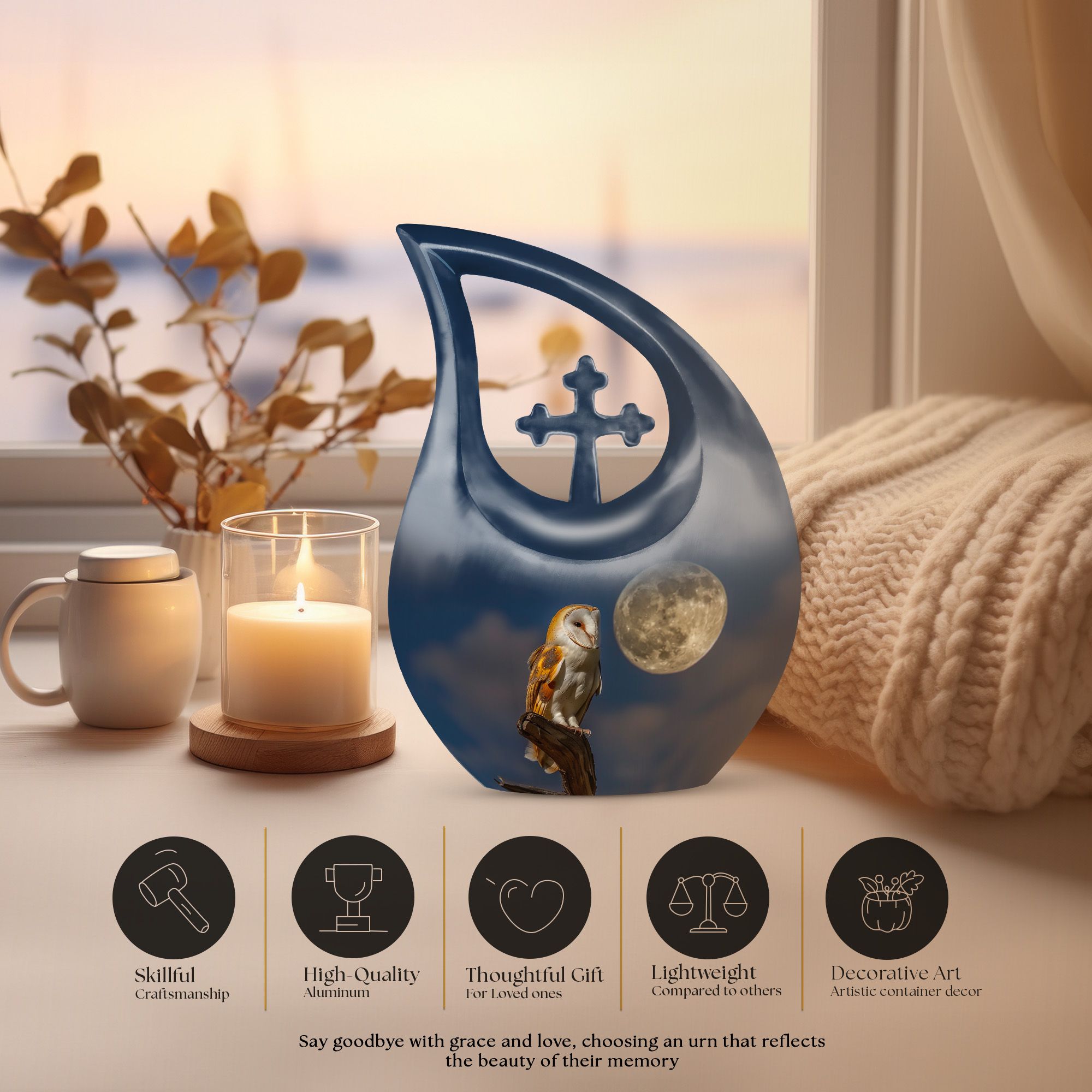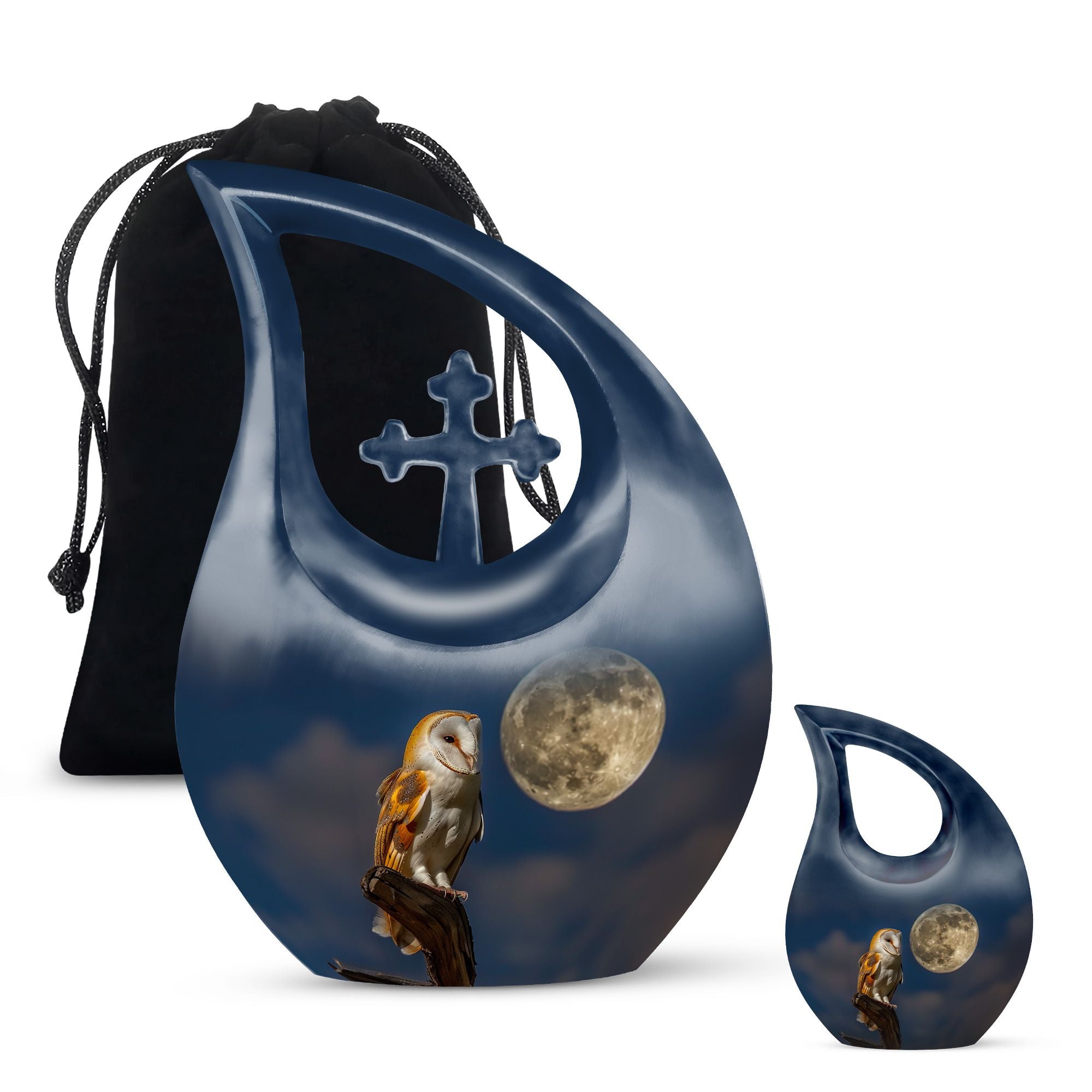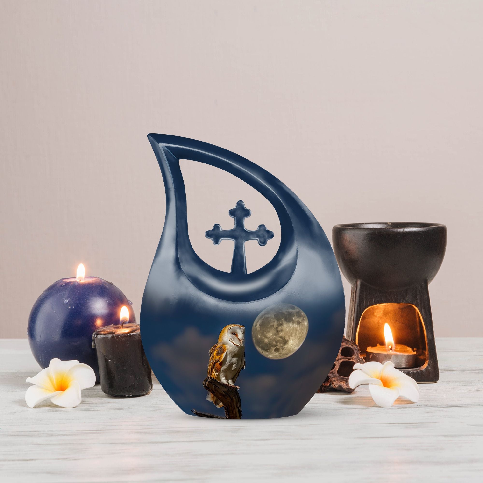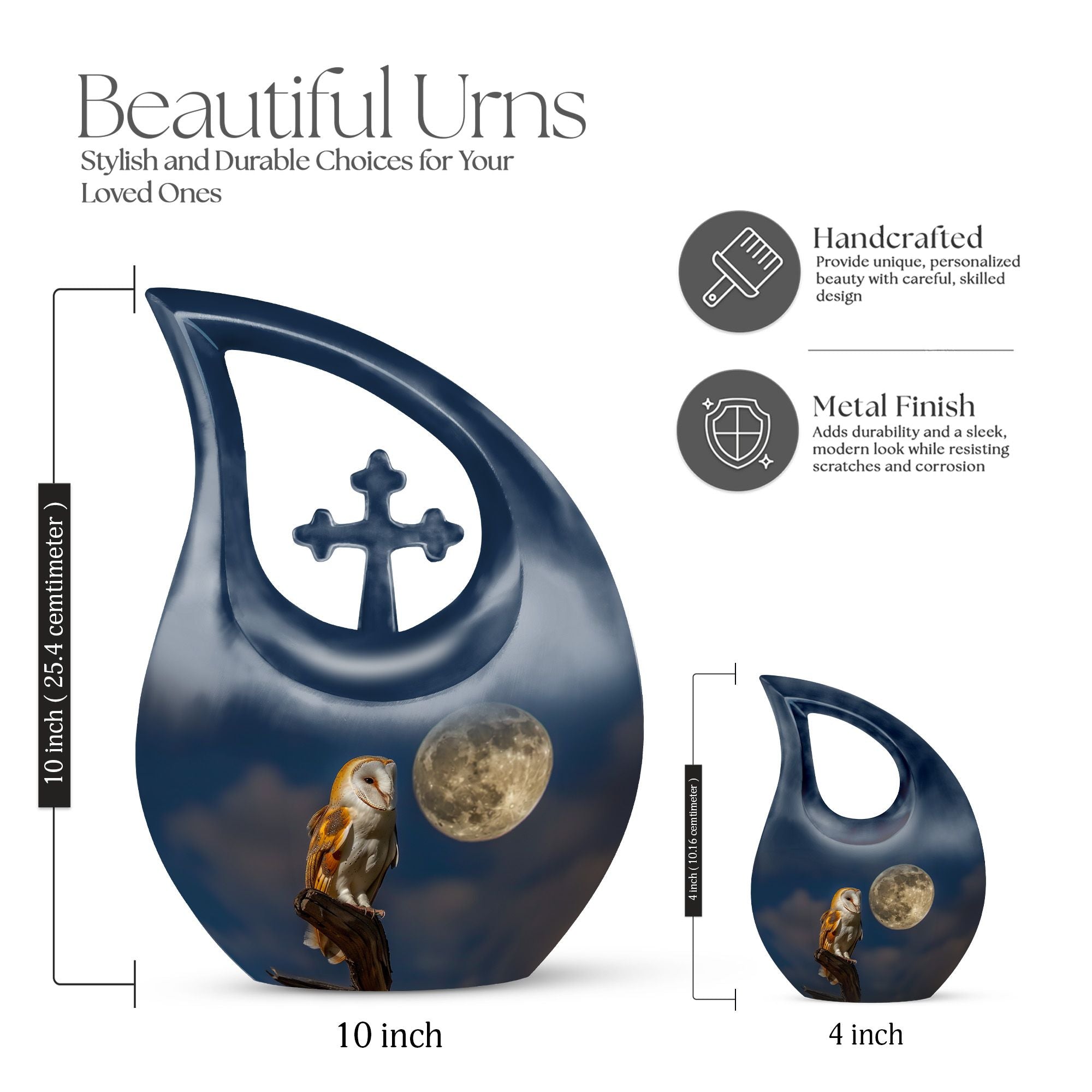 Experience meaning and comfort during memorial ceremonies with our Barn Owl Urn. Crafted from high-quality Aluminium, this Large Urn stands 10 inches tall and is designed to hold up to 200 cubic inches, making it an ideal cremation box for adults. Our Barn Owl theme lends a unique and soothing touch to the grief process. The urn's weight of 3.3 pounds attests to its sturdy construction, ensuring the safety and security of your cherished one's ashes. As a treasured touch, this urn comes equipped with a velvet pouch for containment of ashes, continuously preserving the dignity. One distinguishing feature is the capacity for customization. Personalize your urn with engraved names, making this not just an urn but a beloved memorial to remember and honour. Search 'Unique Urns For Dad' or 'Companion Urns For Adults' for more in our variety of 'memorial urns'. Kindly note design specifications exclude 'Cross Drop'.
