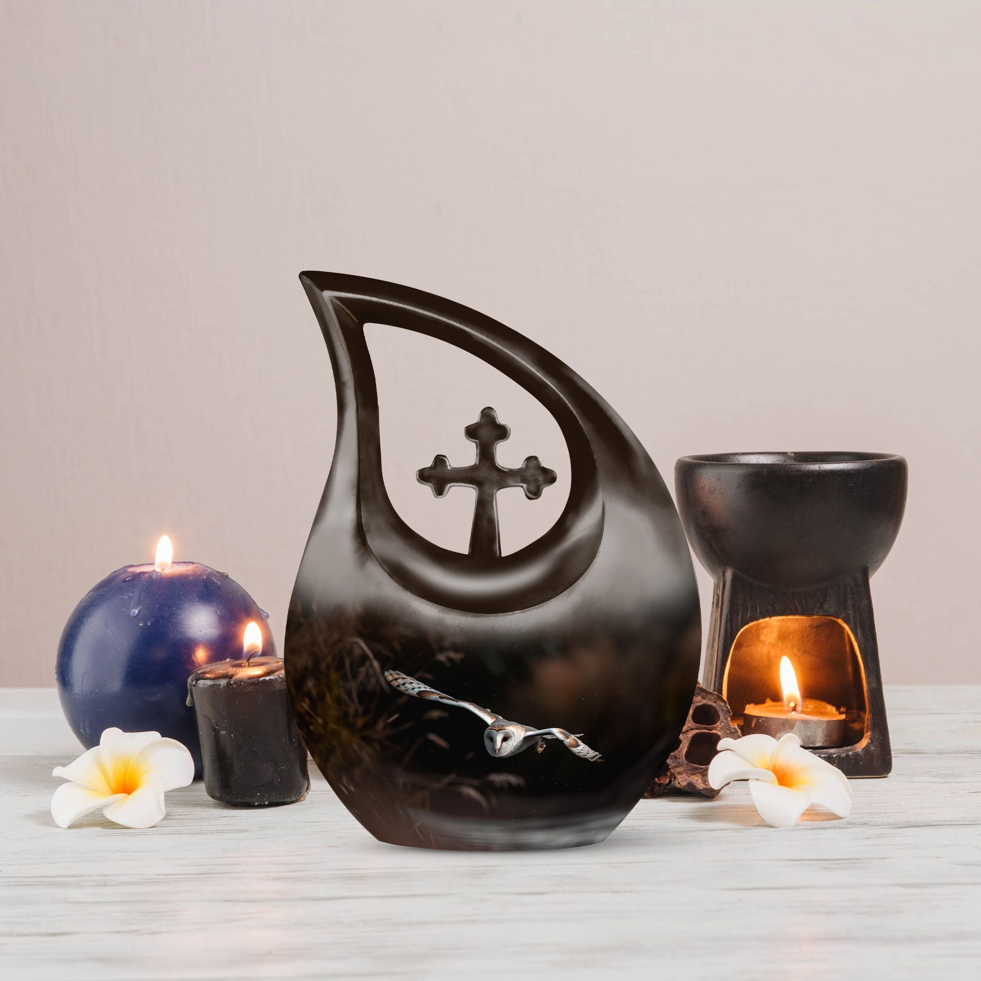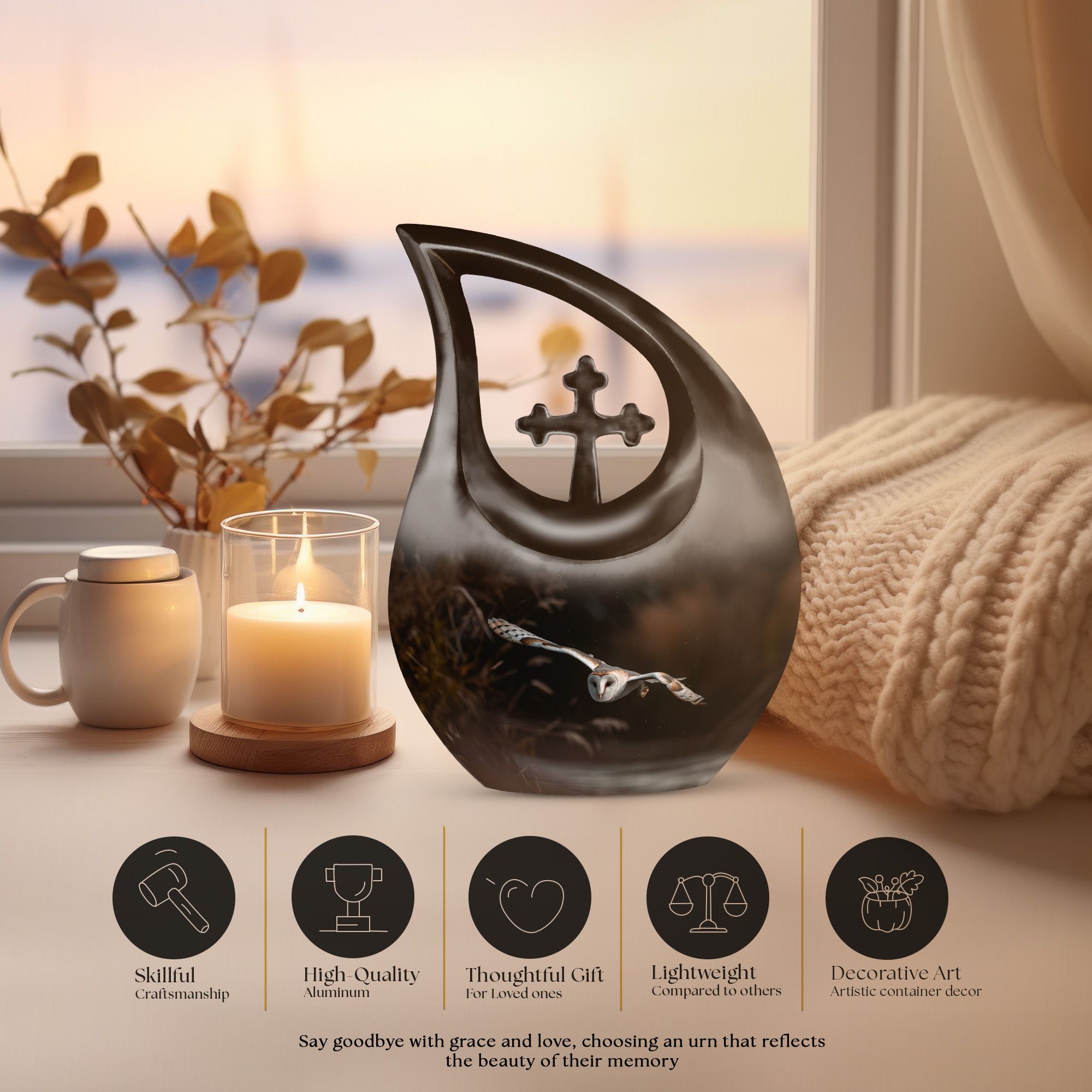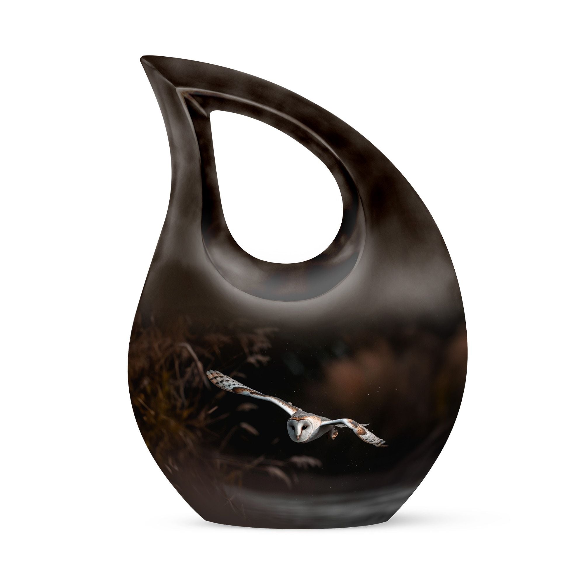 Our Barn Owl Urn, a remarkable symbol of eternity and wisdom, manifests a unique motion of nature in memorial urns. Handcrafted with attention to detail, this exquisite Large Urn with a capacity of 200 cubic inches caters to ceremonial purposes. It exhibits an eye-catching Cross Drop theme, enhancing its presentation. The Urn, being 10 inches in height, weighs at a solid 3.3 pounds, an illustration of its outstanding quality. Made from high-grade Aluminium, it promises longevity and ease of maintenance. Each piece is accompanied by a velvet pouch for containment of ashes, offering a dignified and discreet way of preserving the remains. Furthermore, our urns for ashes can be personalized with engraved names, providing a unique touch. Ideal as a cherished Urn For Dad, our product channels the emotional connection into a tangible entity. Besides, our Custom Cremation Urns are an apt choice either as Large Urns For Ashes or even as a Small Urn. This urn truly complements the solemnity of remembrance and reflects both, strength and serenity.