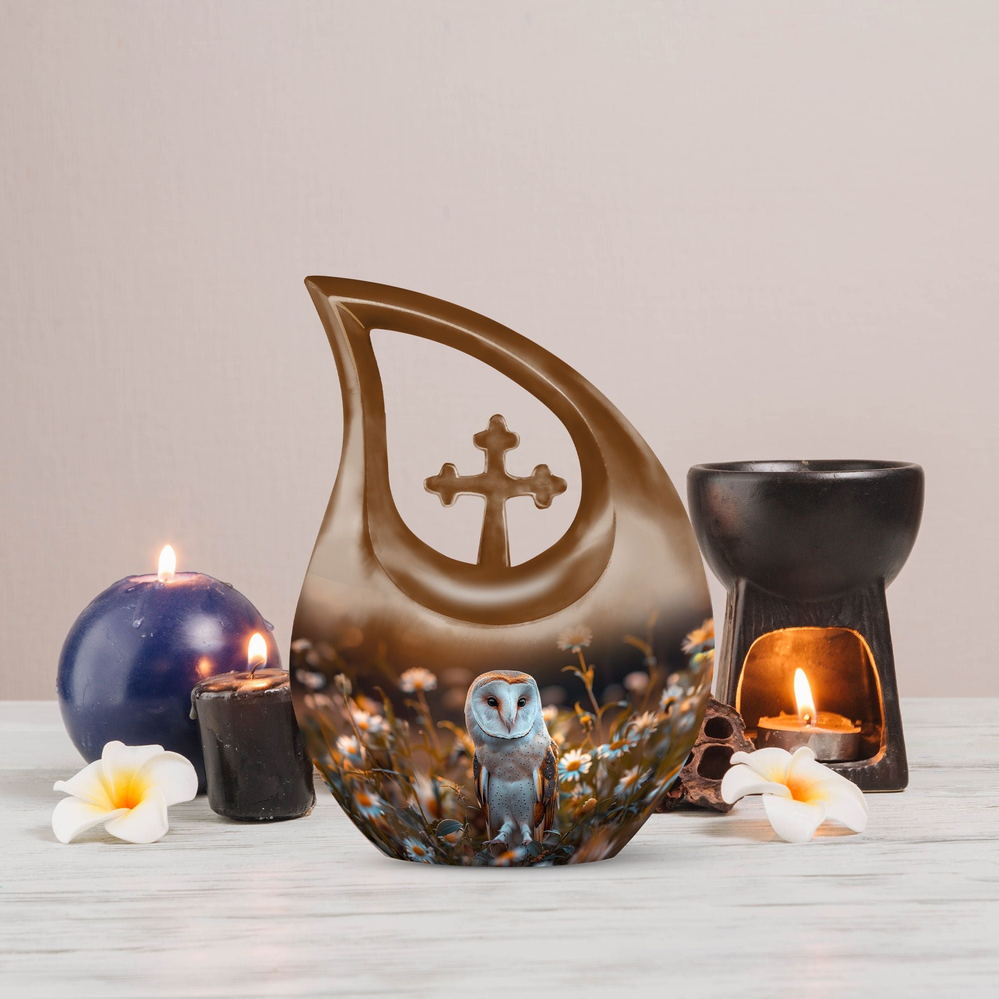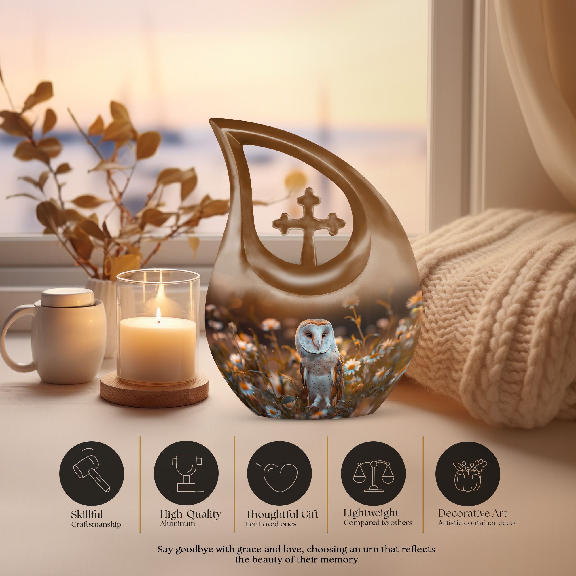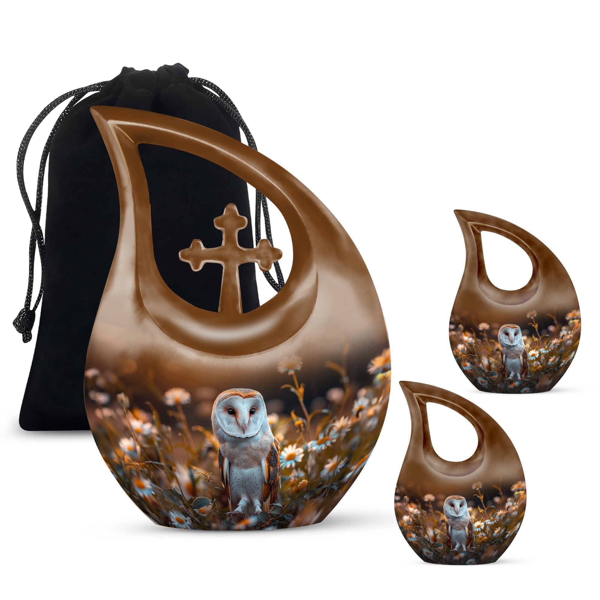 Cherish your loved one's memory with this magnificent Barn Owl Urn. Crafted from high-quality aluminium, this urn weighs a sturdy 3.3 pounds and stands 10 inches tall - the perfect size for memorial displays. Its unique Cross Drop theme provides an exquisite tribute to the departed, certainly making it one of a kind. This urn's generous 200-cubic inch capacity can accommodate the ashes of an adult, making it an optimal choice for Cremation Boxes For Adults, Cremation Containers, Large Urns For Ashes, and Funeral Urns For Adults. For an added touch of remembrance, you can also personalize this urn with engraved names. It also includes a soft velvet pouch, for dignified containment of ashes. So if you have been seeking unique urns for dad or any dear deceased, this barn owl urn is an ideal choice and resonates with warmth and love. Let this precious memorial urn serve as a symbol for eternal peace.