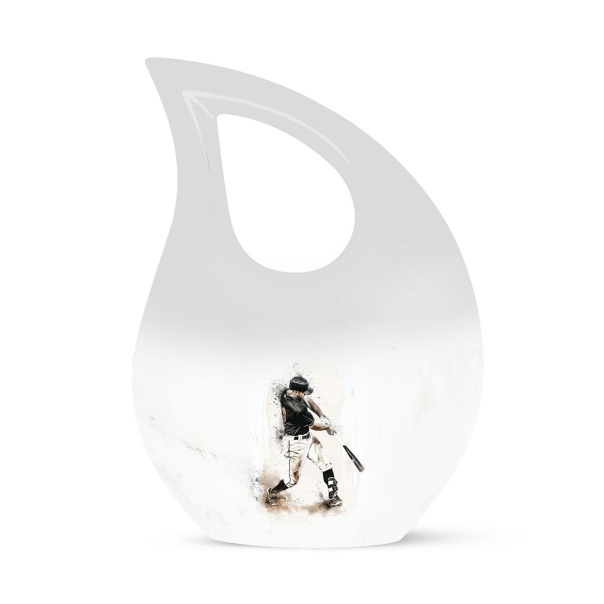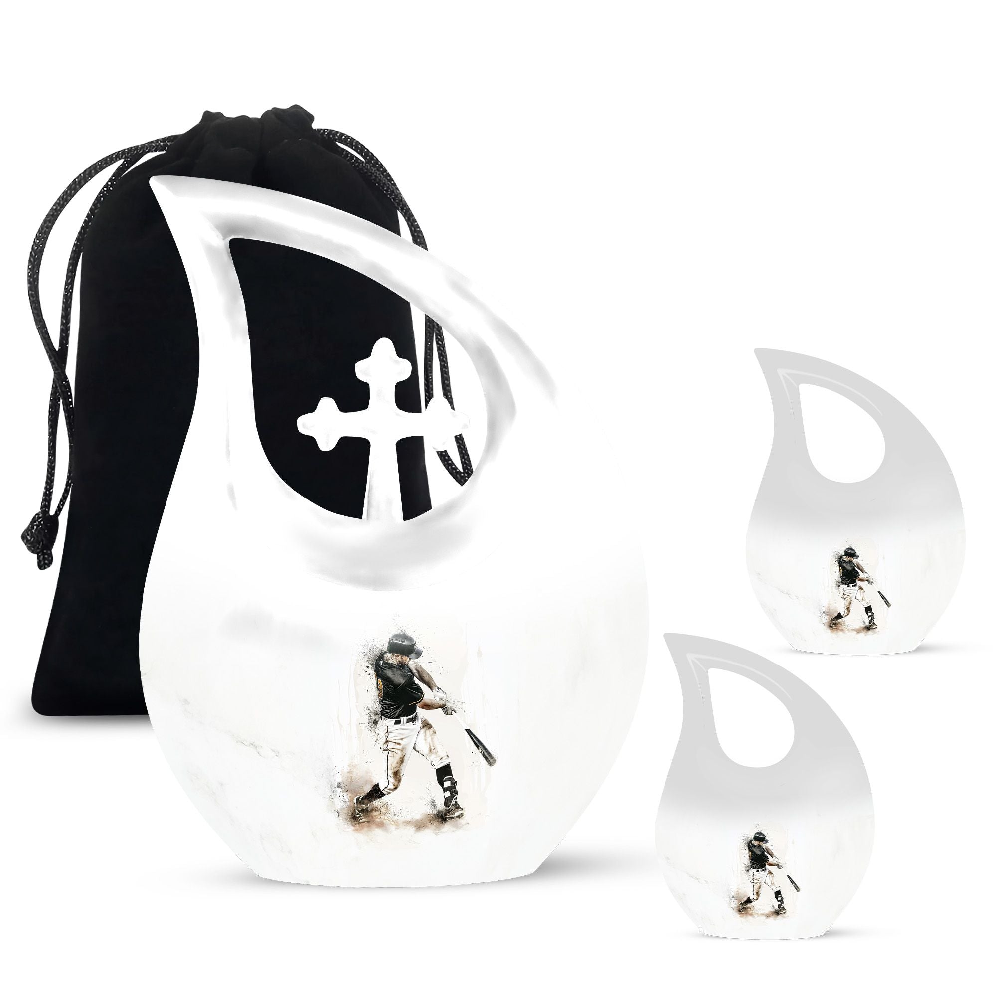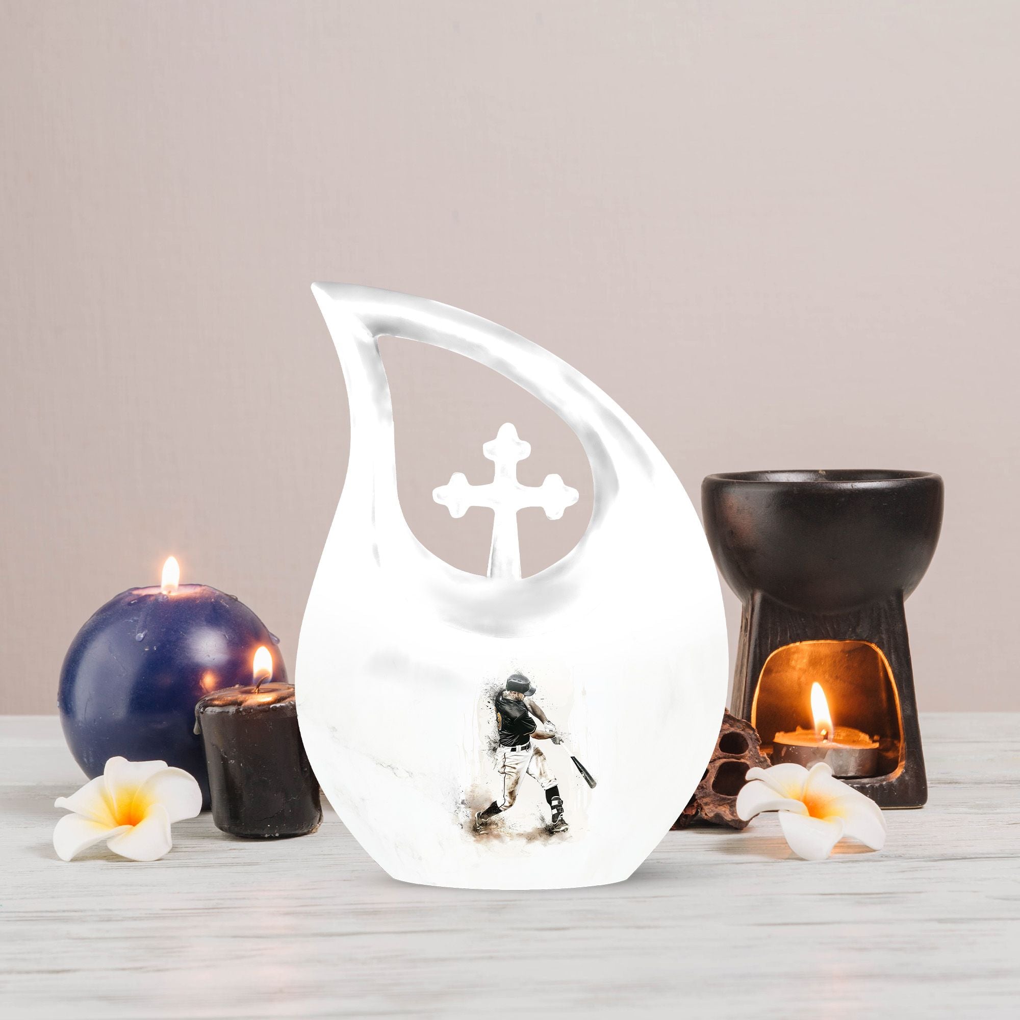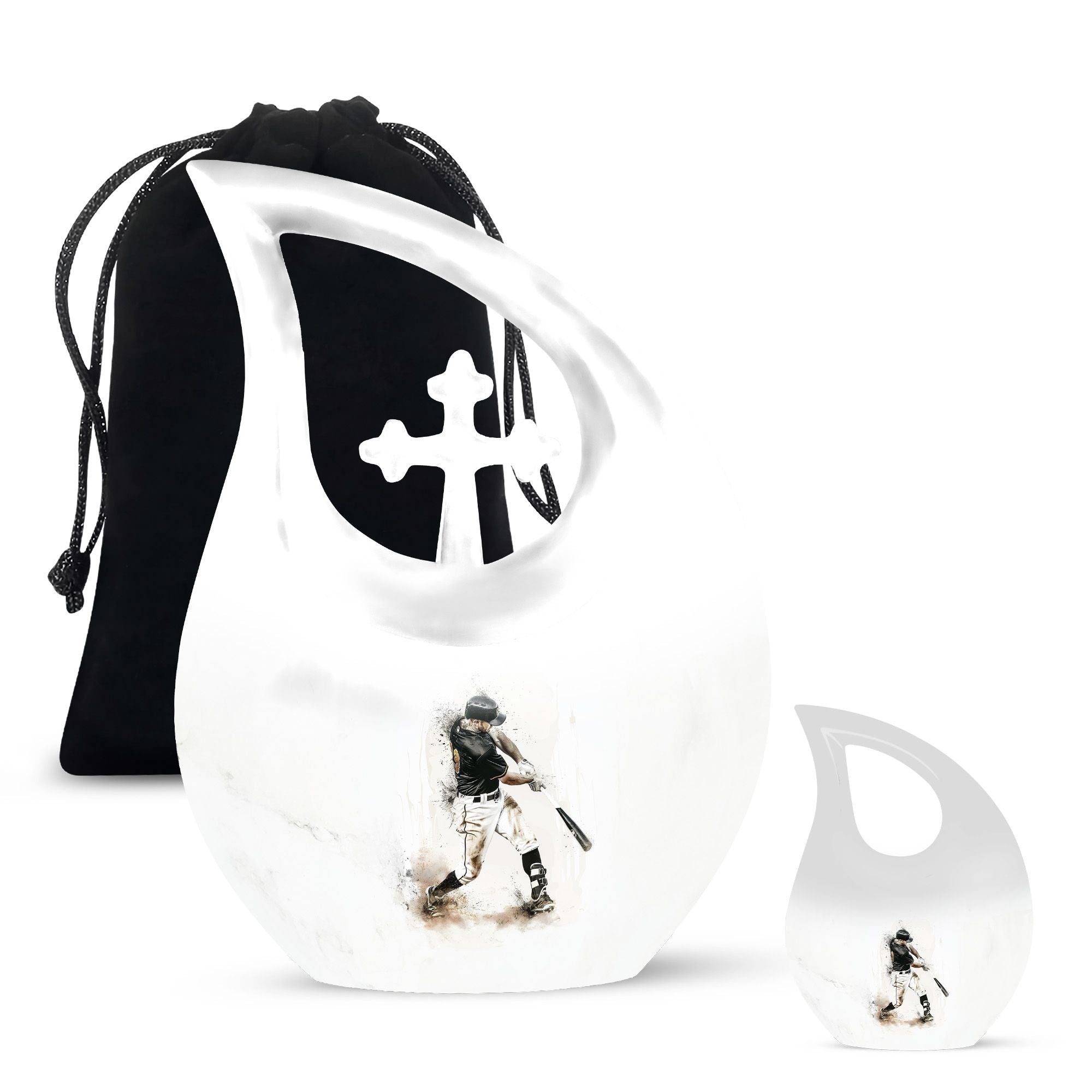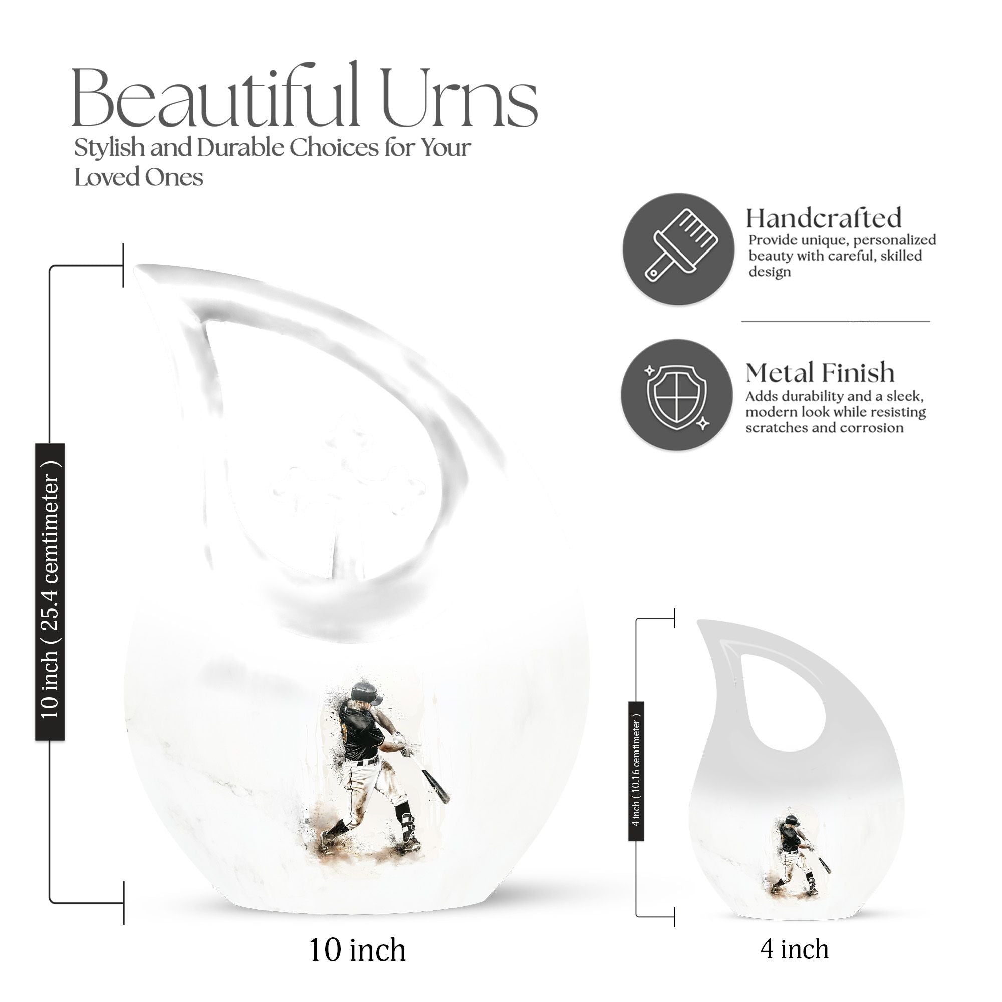 Say farewell to your loved one with dignity and respect using our Medium Size Baseball Urn. This standout memorial piece carries the unique theme of baseball, resonating with the sport enthusiasts and creating a heartfelt tribute to the departed. Crafted from superior-quality aluminium, this urn weighs 3.3 pounds, offering excellent stability and longevity. At 10 inches in height with a 200 cubic inch capacity, this large urn has the space to securely hold the remains. The standout 'Cross Drop' URN DESIGN not only enhances the overall appearance but also brings in a spiritual touch to the final resting place of your dear one. Our package not only includes this exquisite urn but also a velvet pouch for containment and storage of ashes. Looking for a personal touch? We offer customization! You can personalize with engraved names, adding to the intimacy of the tribute. Our Baseball Urn is more than just a medium size urn; it is a personalized keepsake for ashes for a man that stands as a symbol of their loved life. Collectively, our customized urns for adults offer a truly fitting memorial for your loved one.